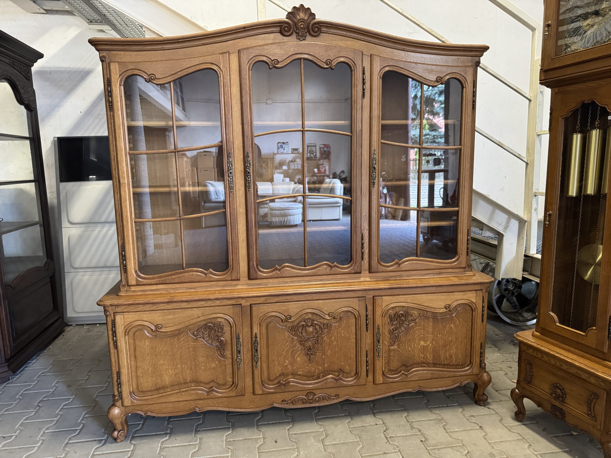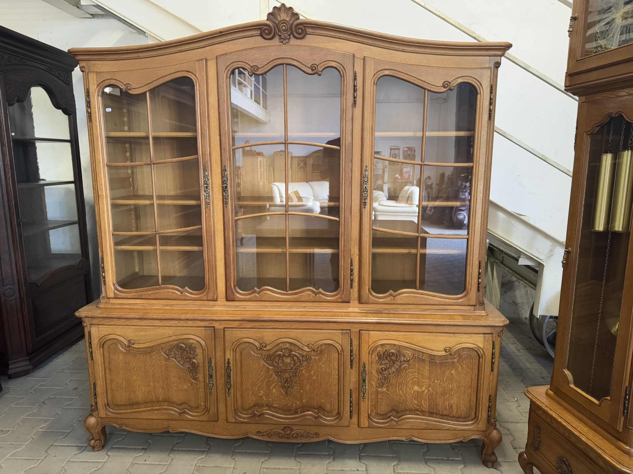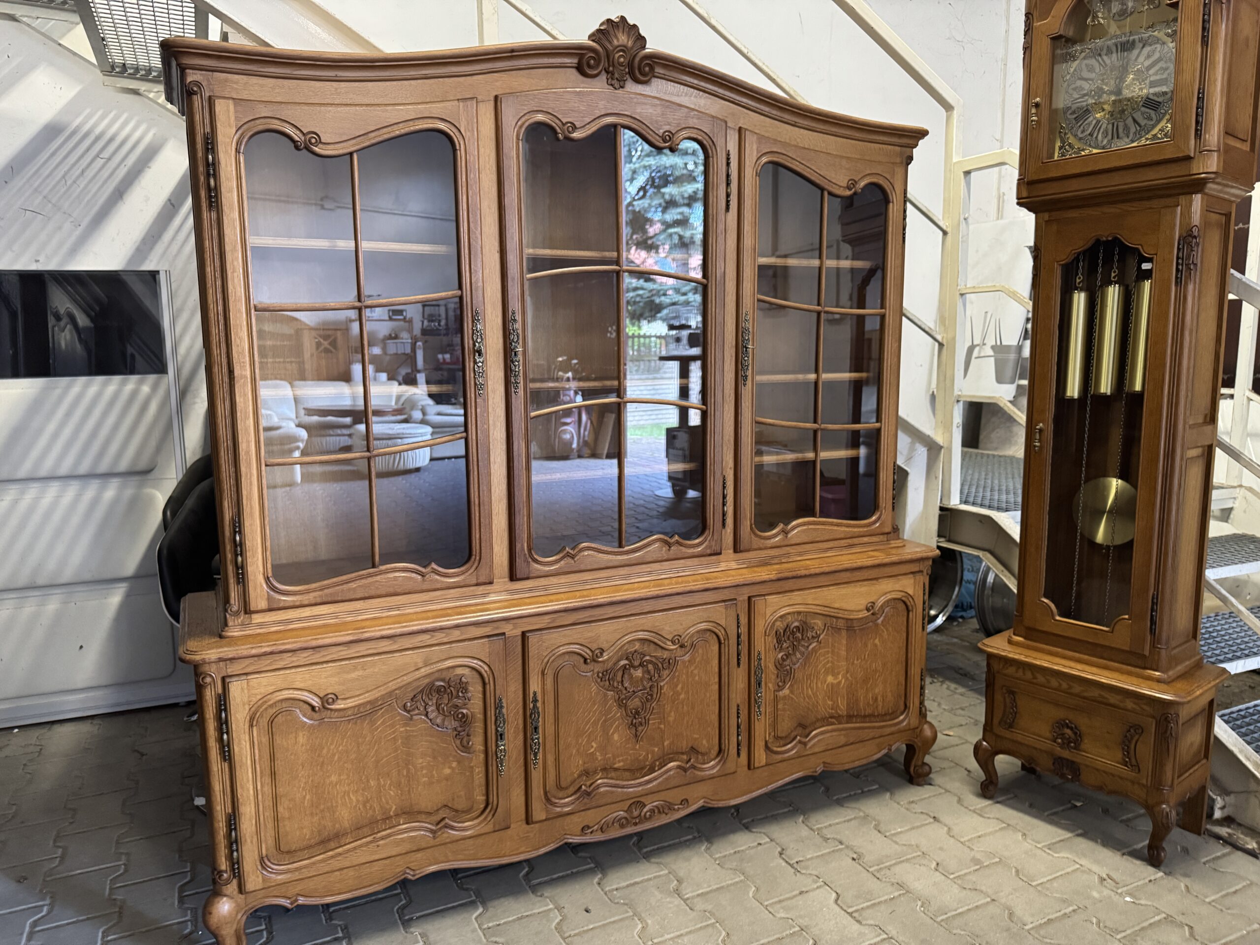 Piękne ozdobne rzeźbienia oraz oryginalne mosiężne okucia szczegółowo wyróżniają mebel.
