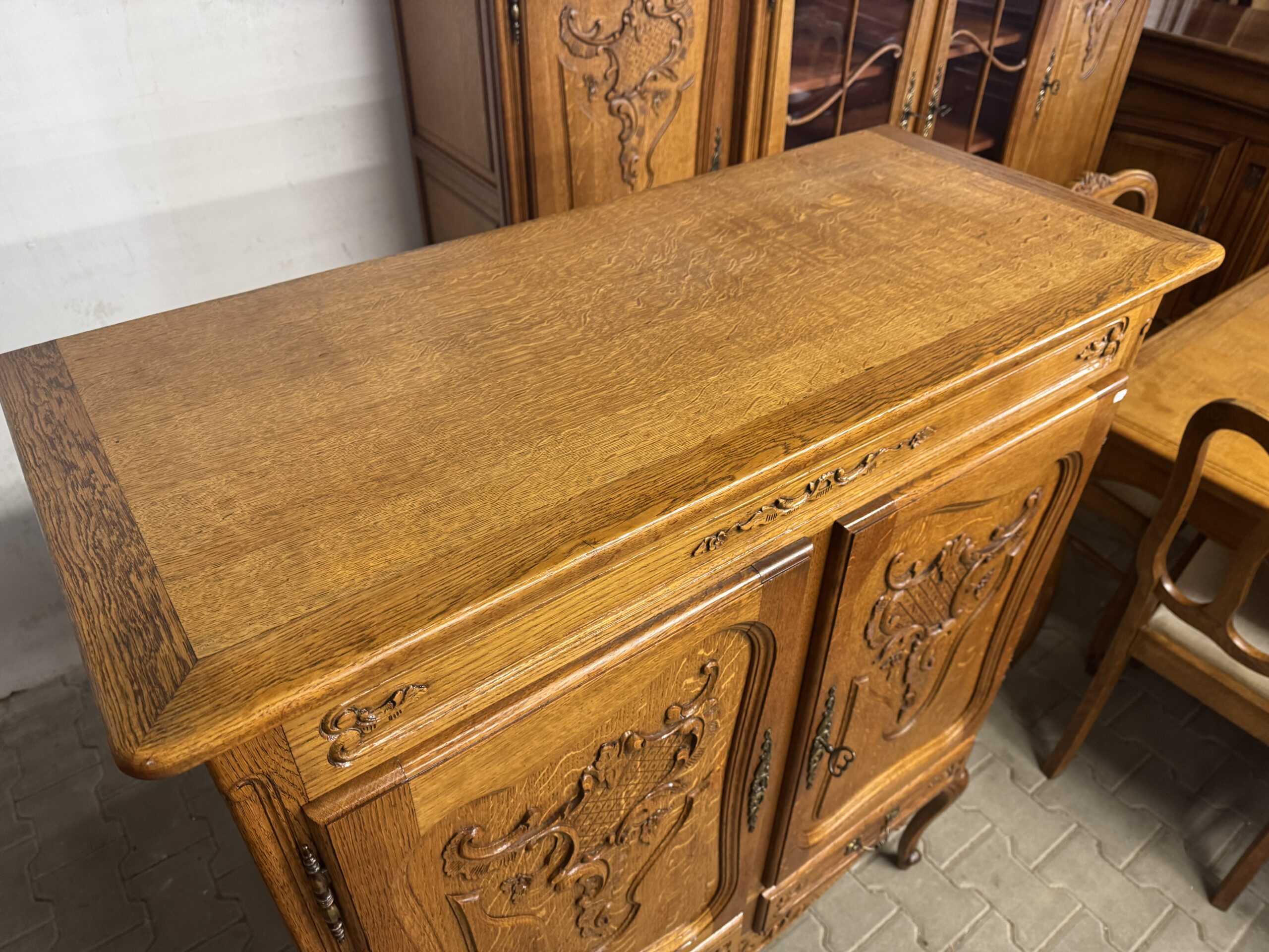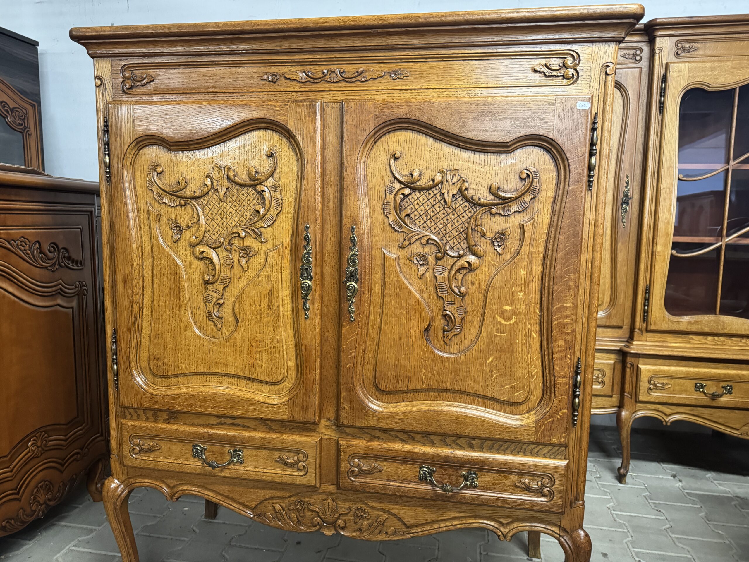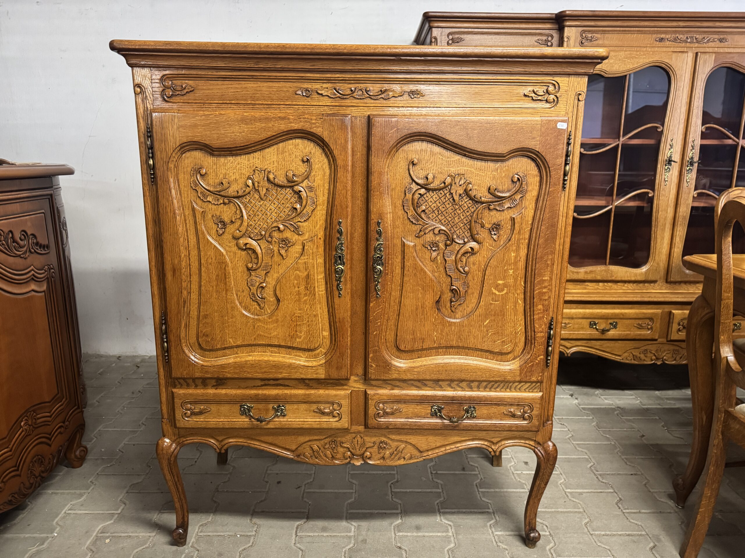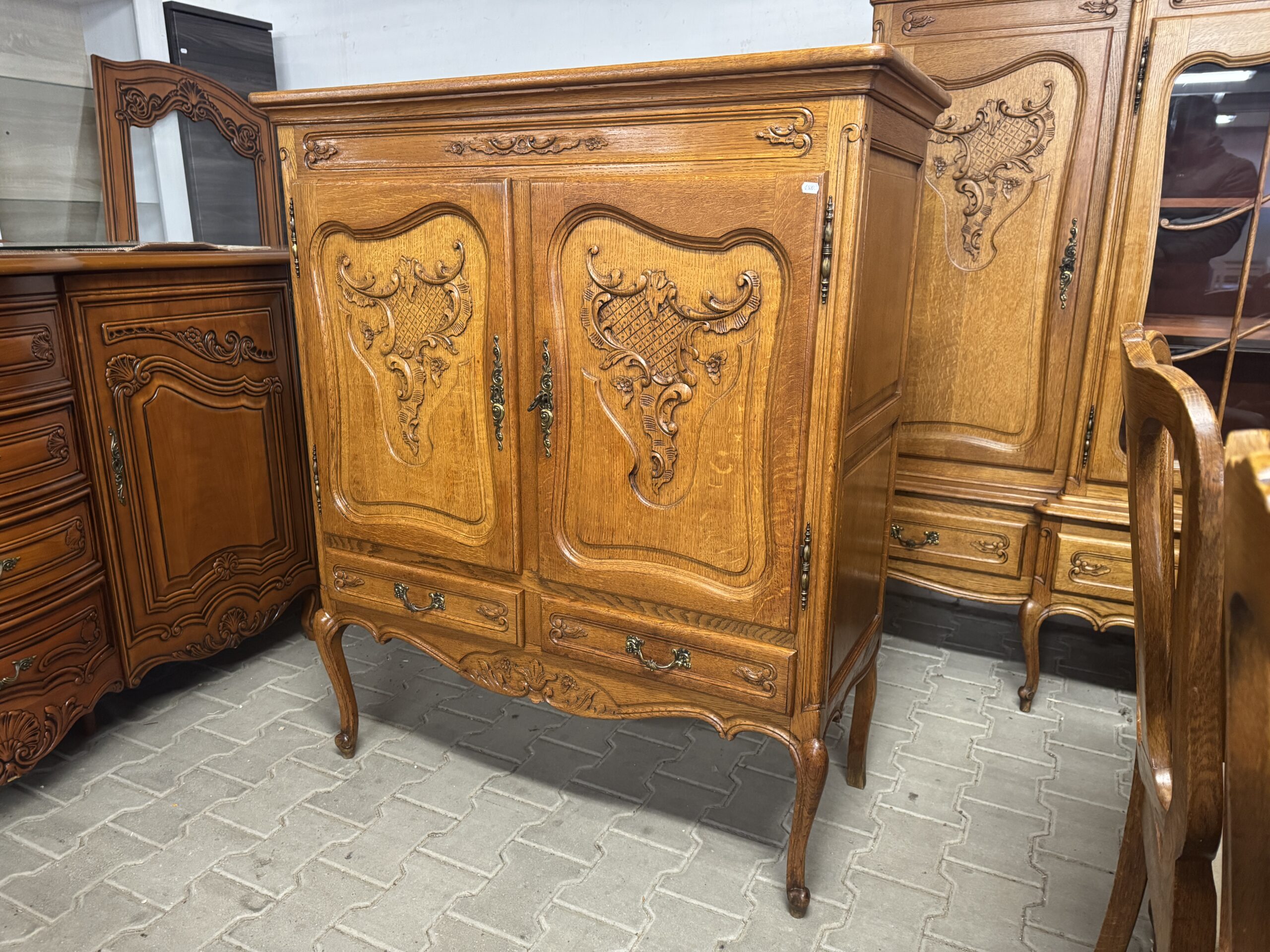 Oryginalne mosiężne okucia oraz ręcznie robione ozdobne rzeźbienia tworzą wyjątkowy wystrój mebla.