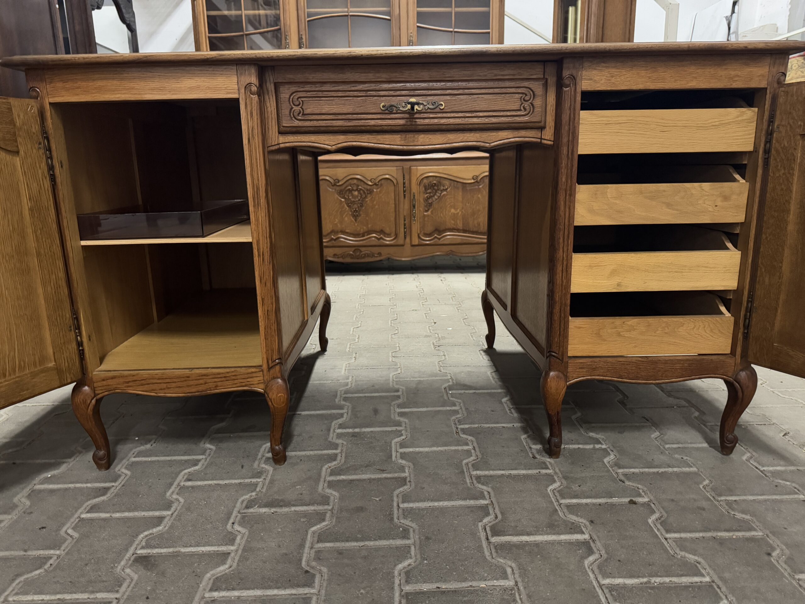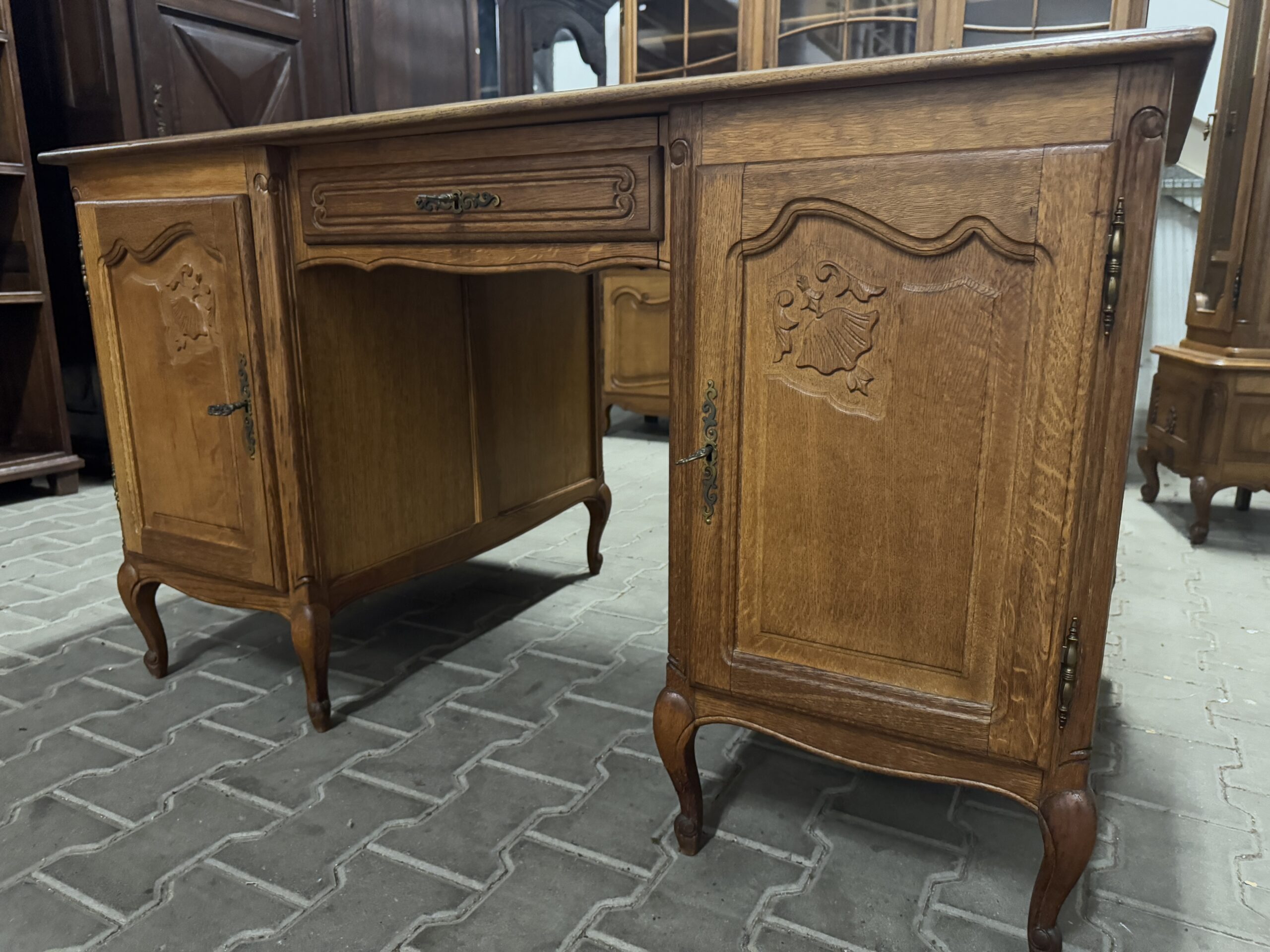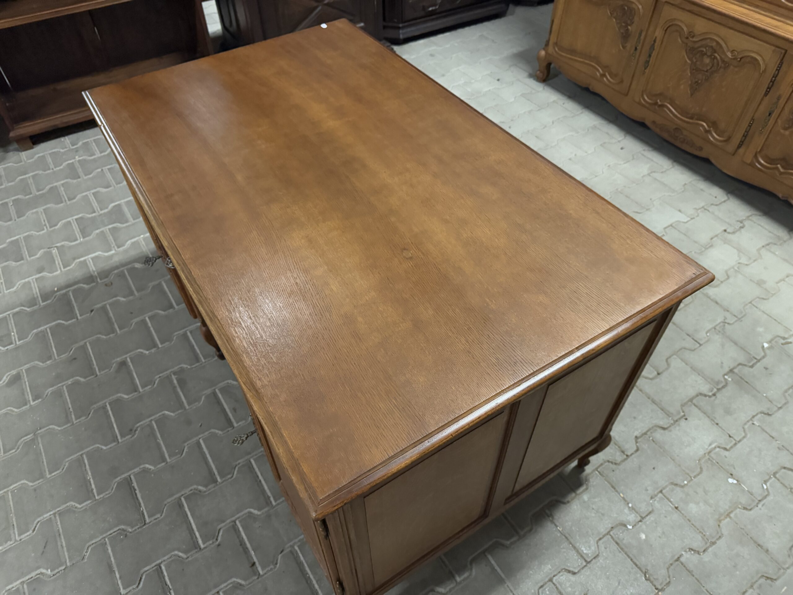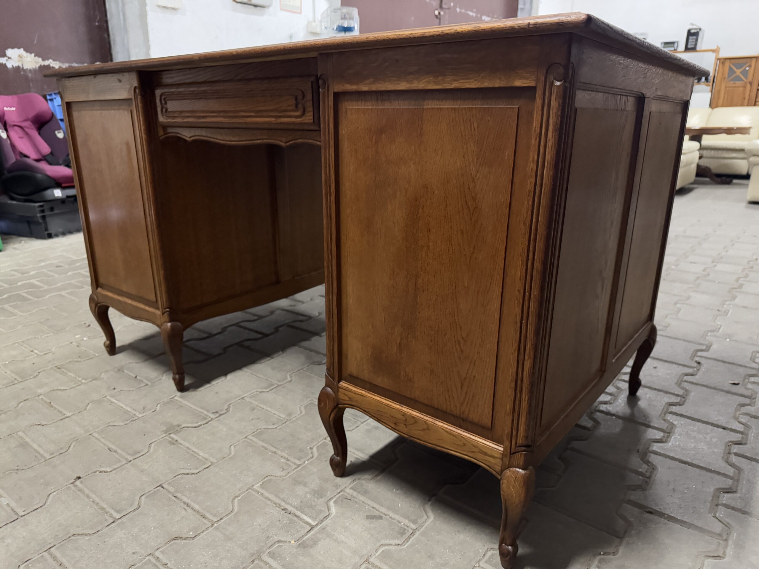 Biurko wyposażone w szufladę w środkowej części, zamykane półki po lewej stronie oraz zamykane szuflady po prawej stronie.
