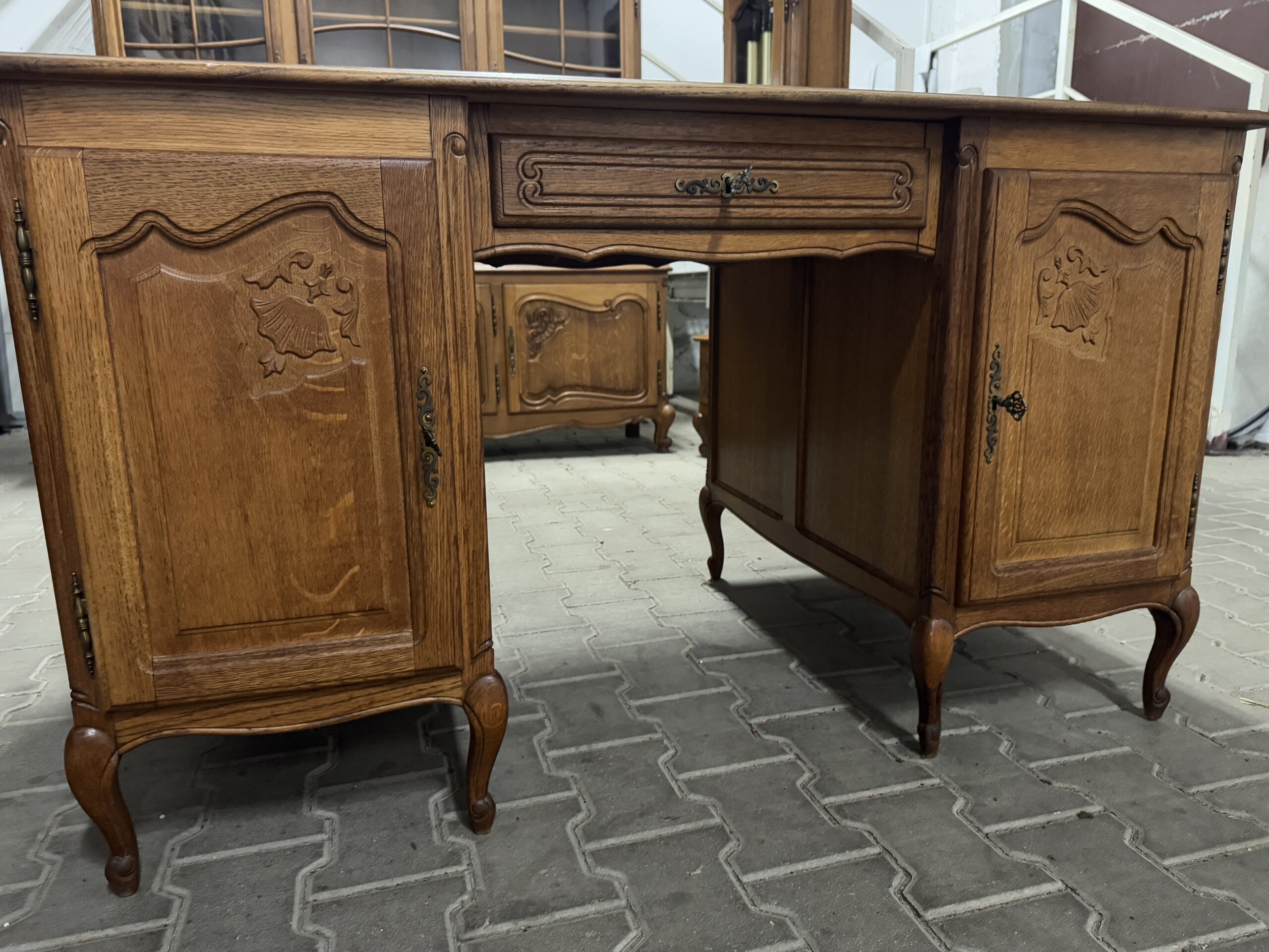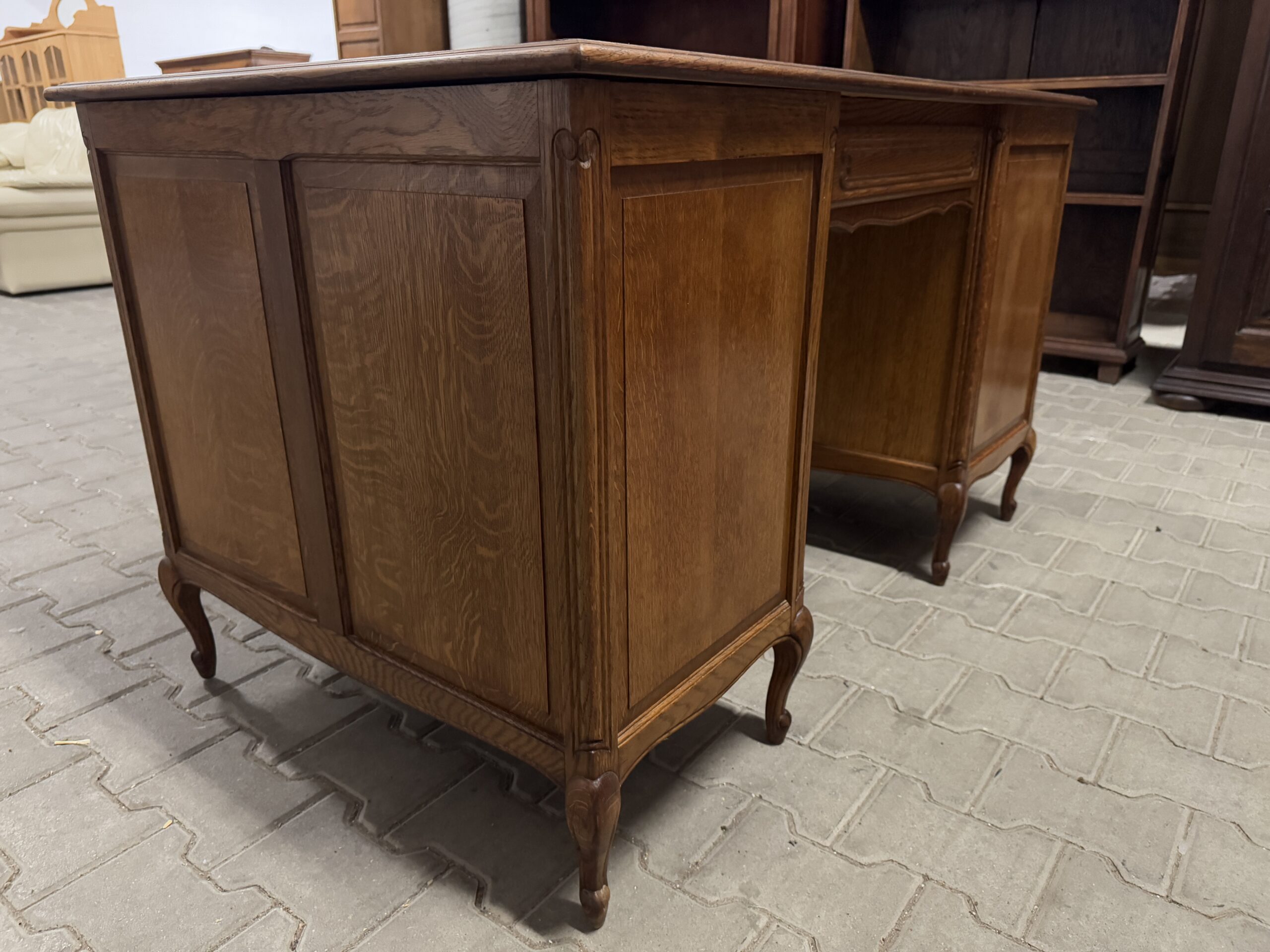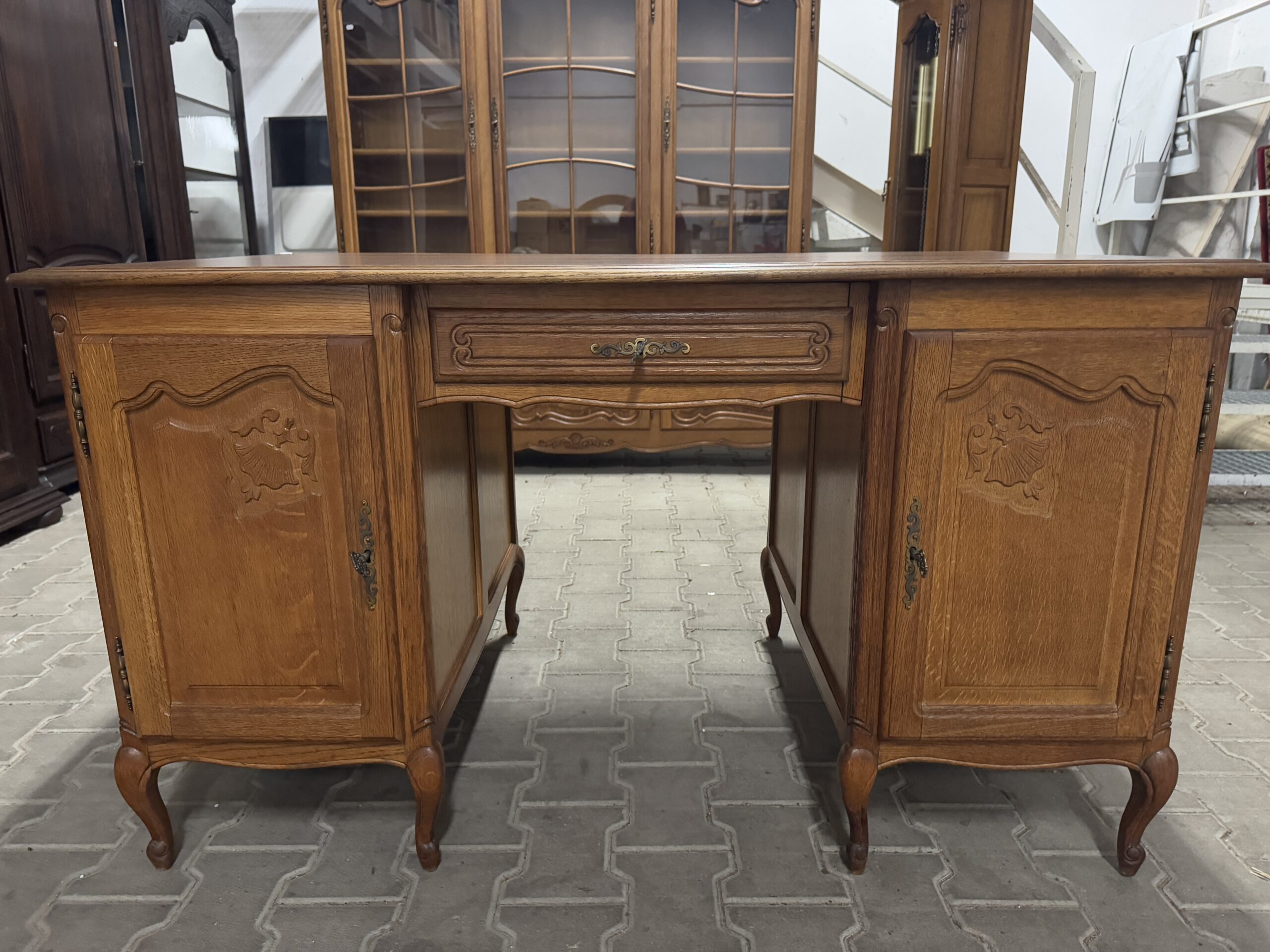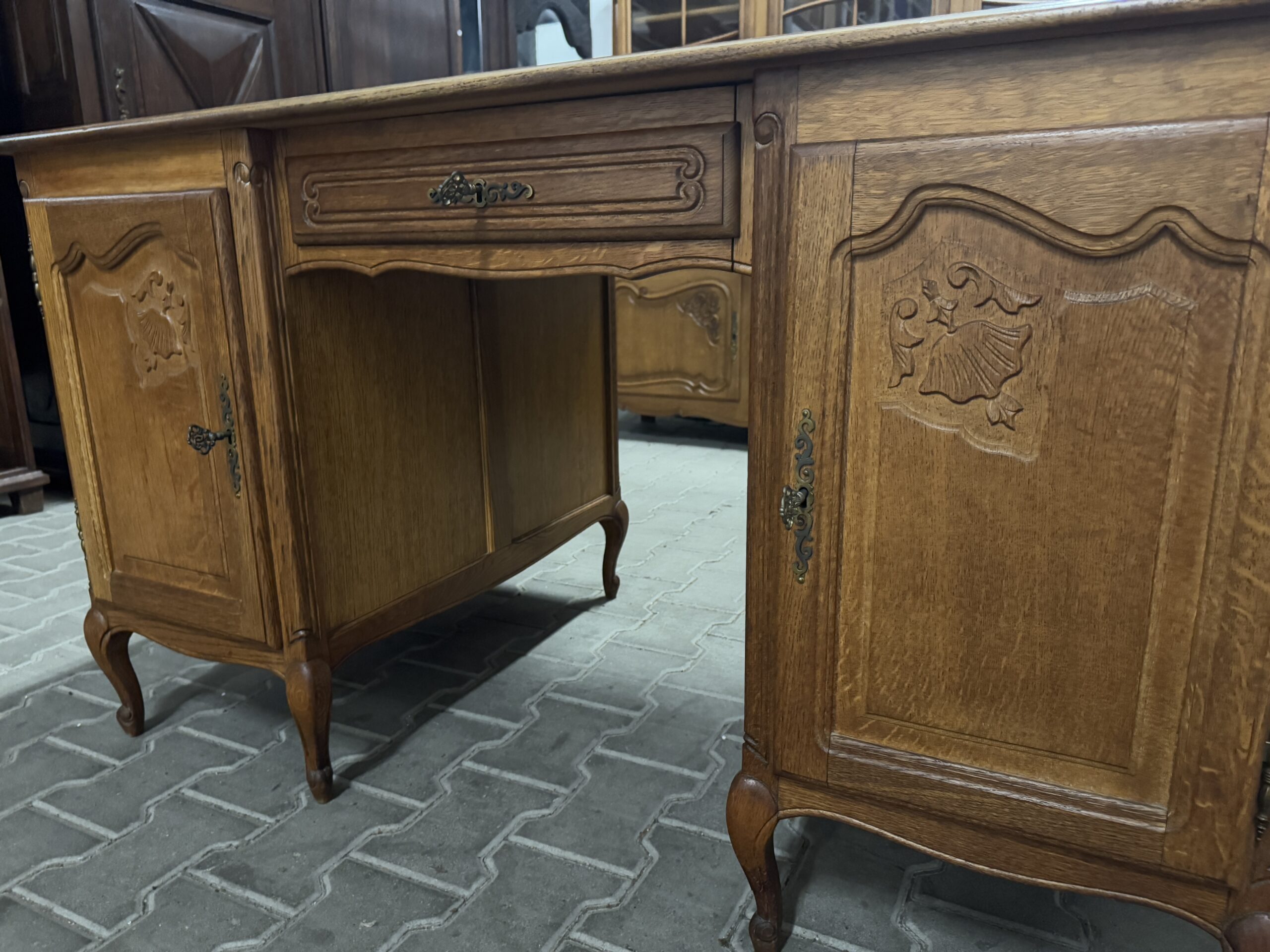 Biurko wyposażone w szufladę w środkowej części, zamykane półki po lewej stronie oraz zamykane szuflady po prawej stronie.