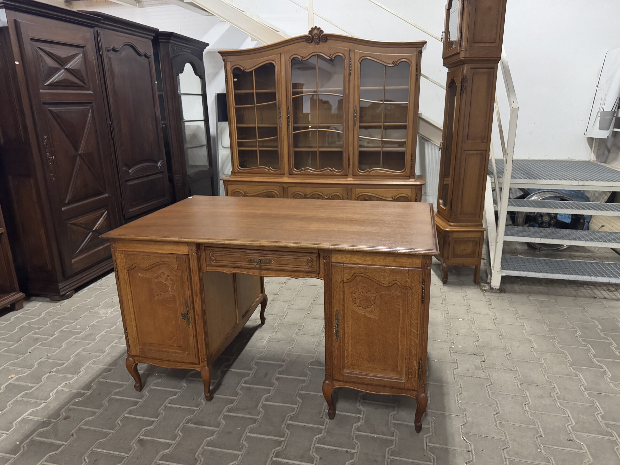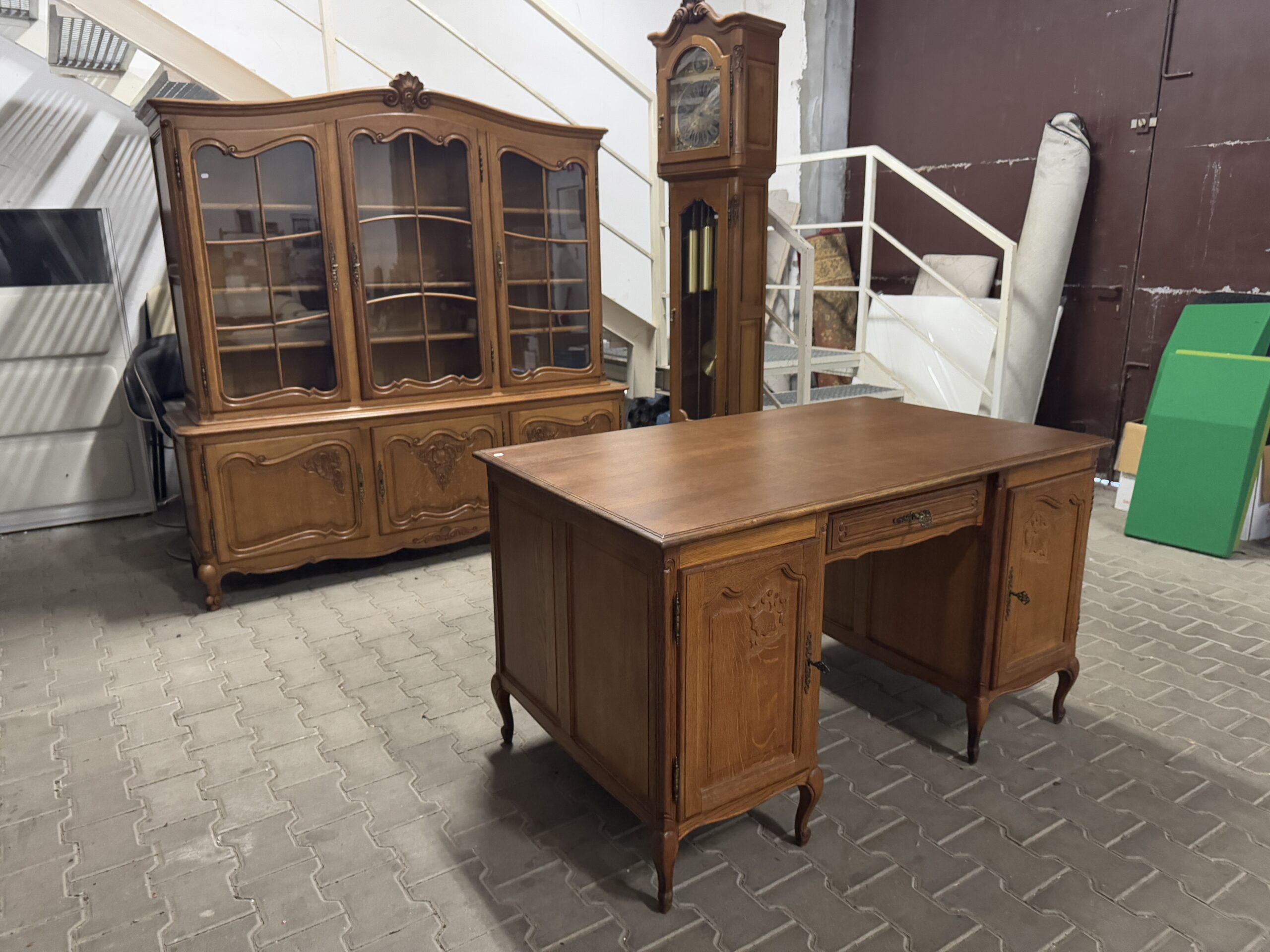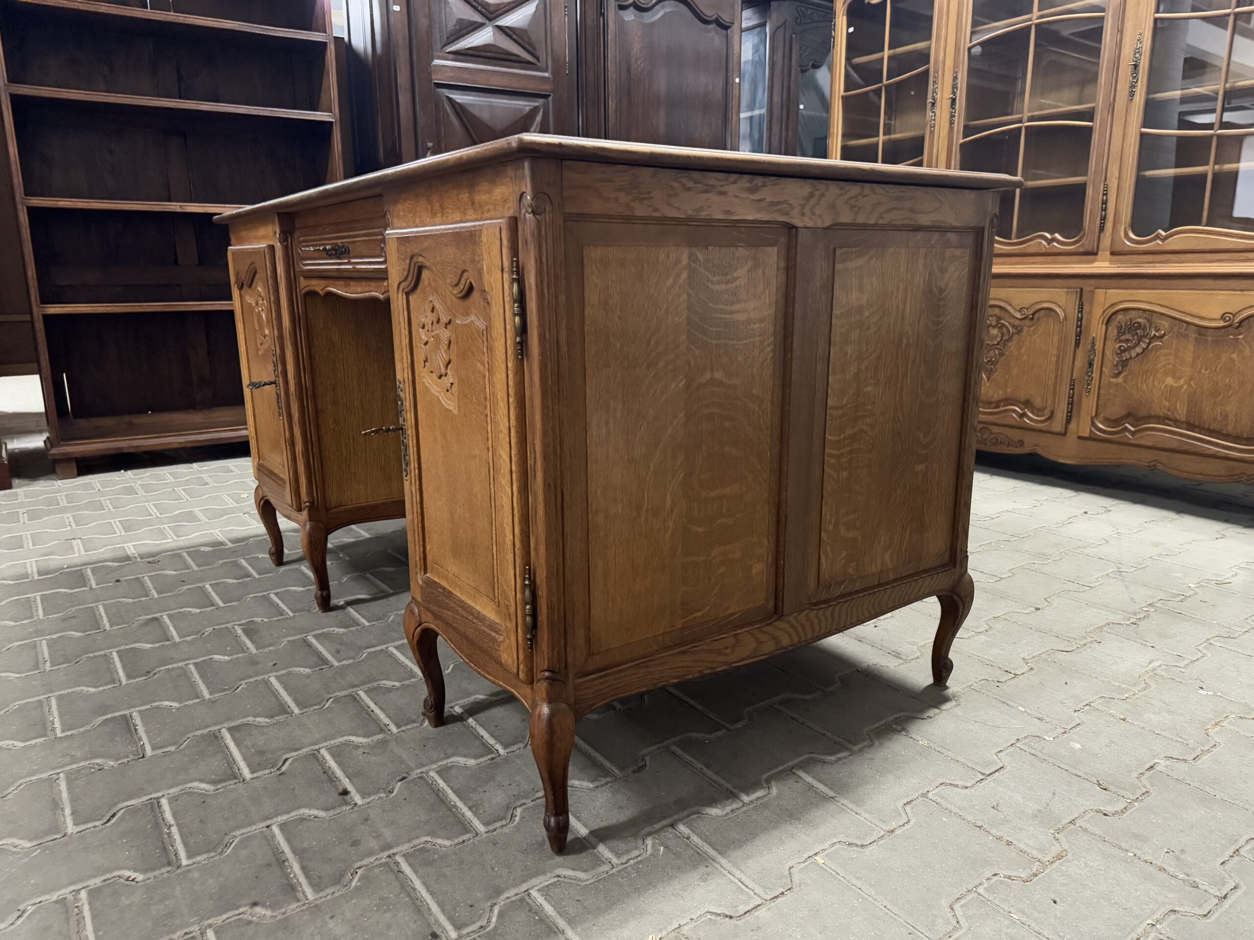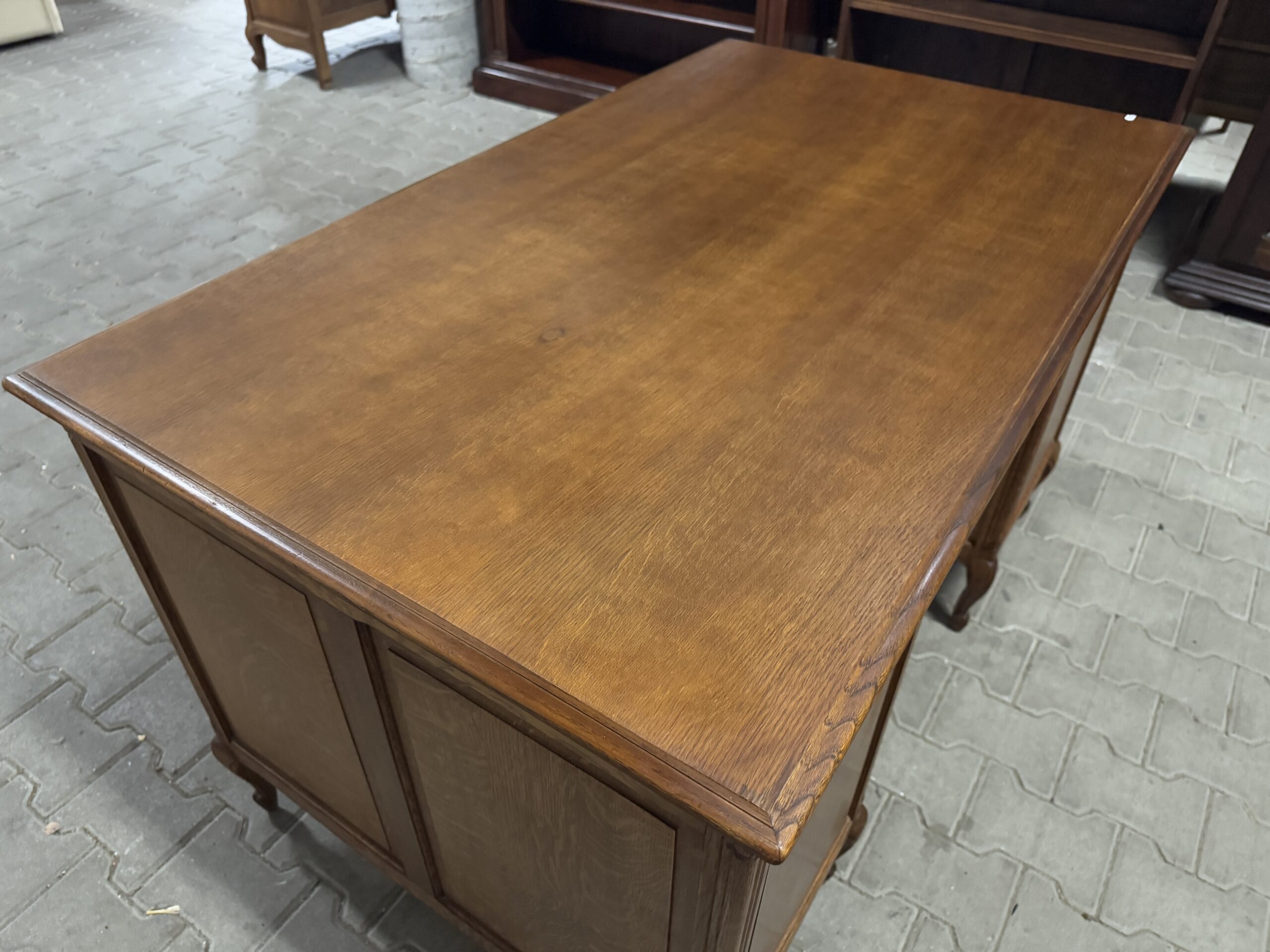 Biurko wyposażone w szufladę w środkowej części, zamykane półki po lewej stronie oraz zamykane szuflady po prawej stronie.