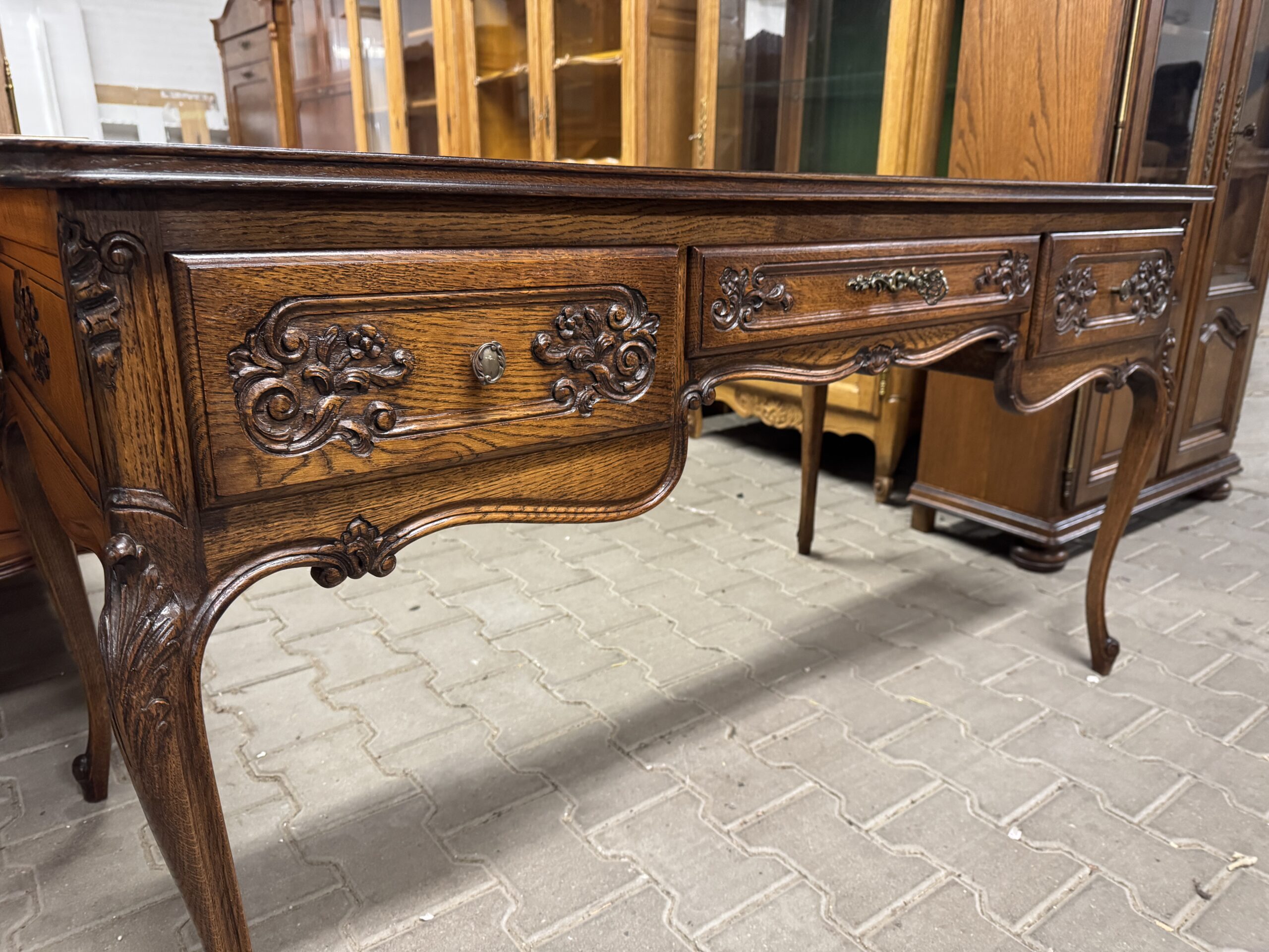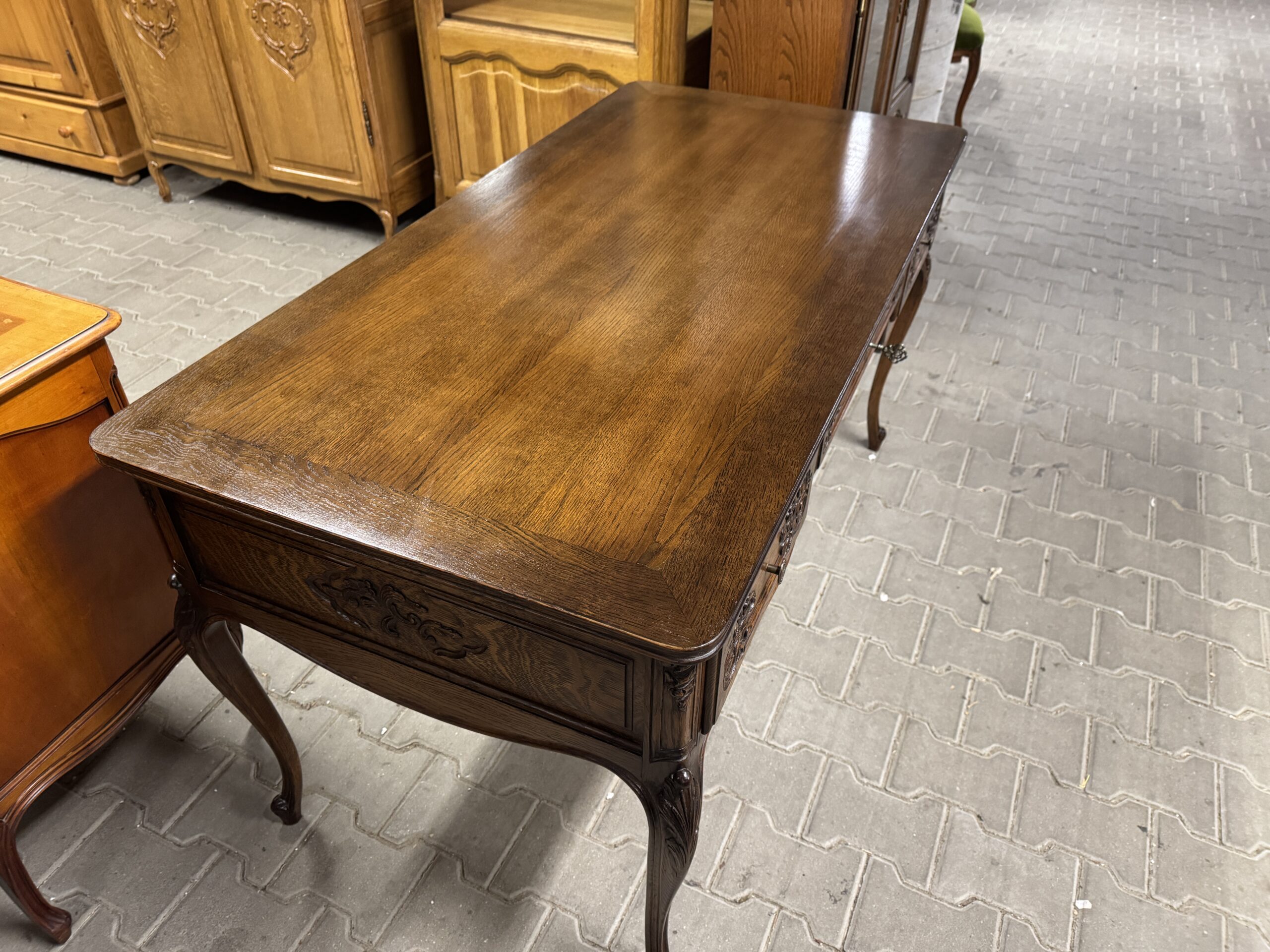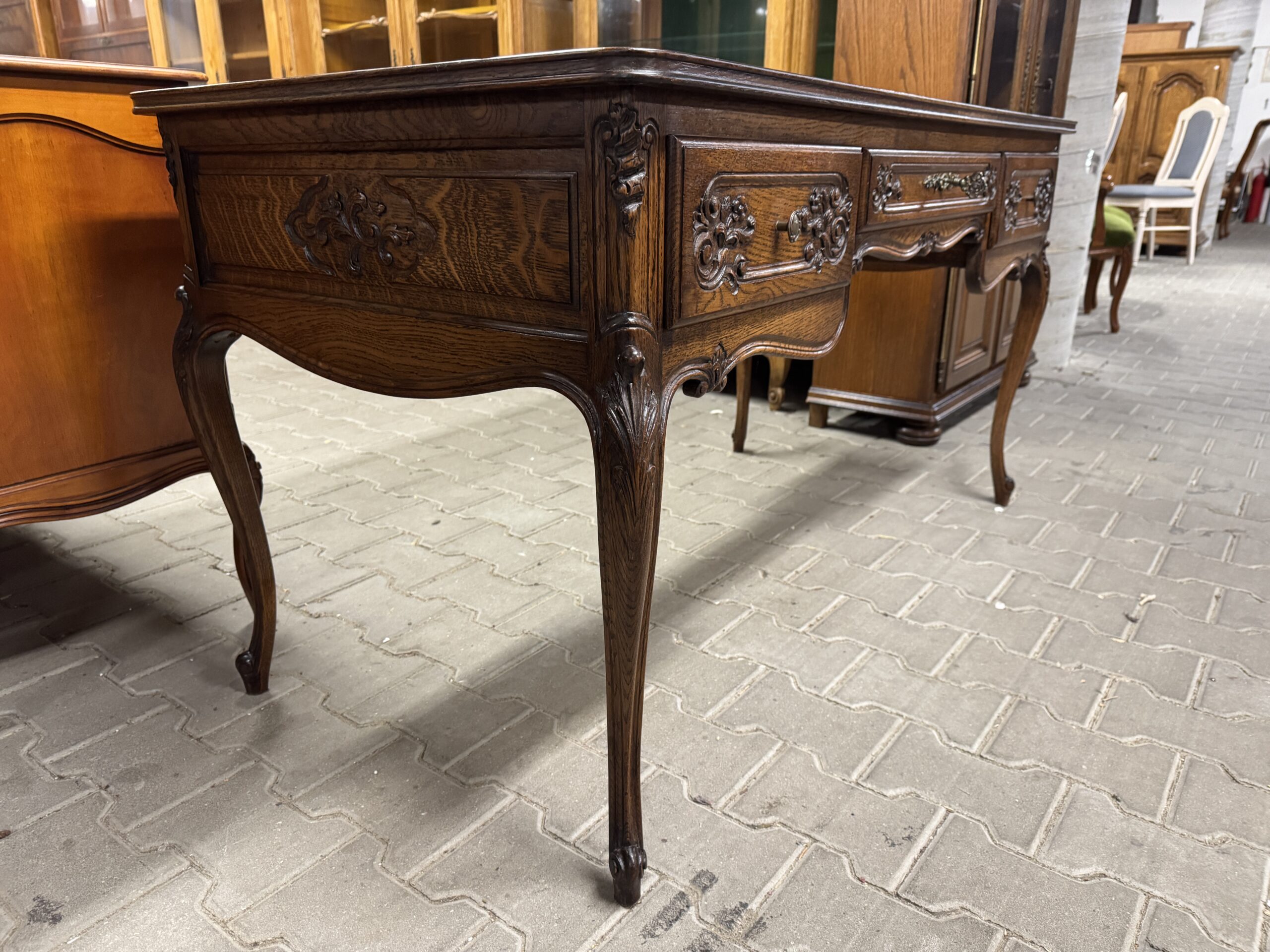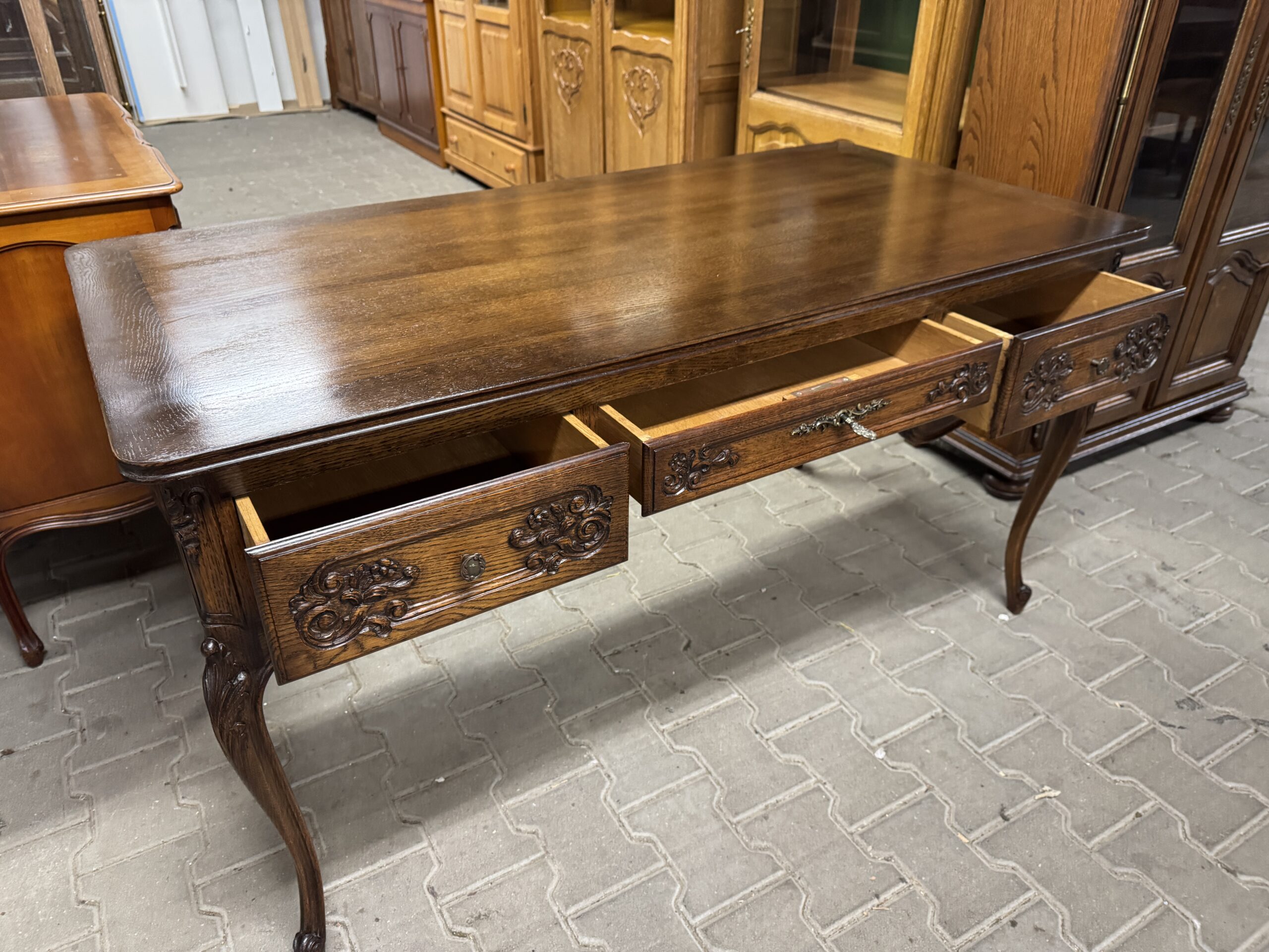 Biurko wykonane z drewna dębowego w ciemnym kolorze.
