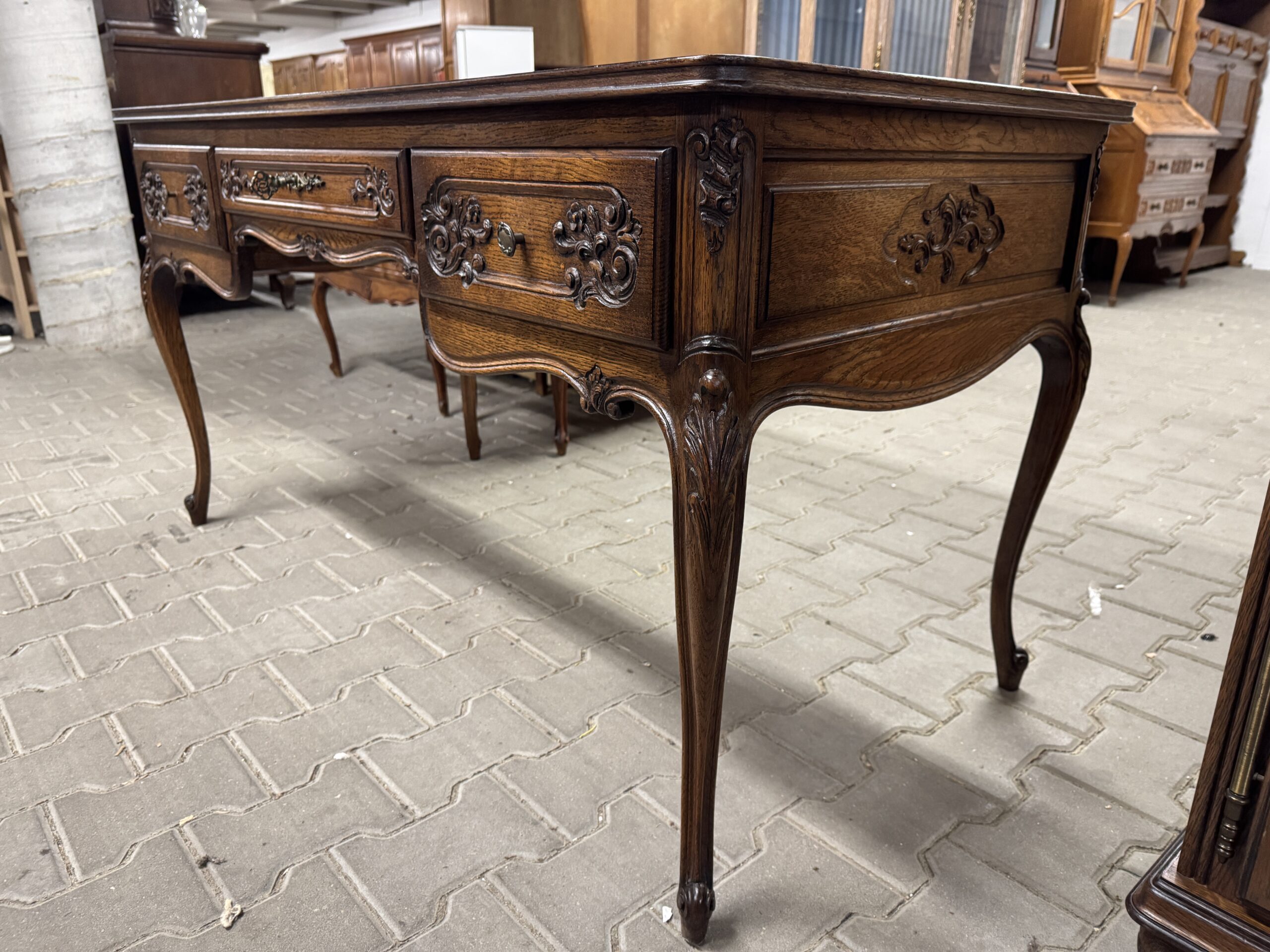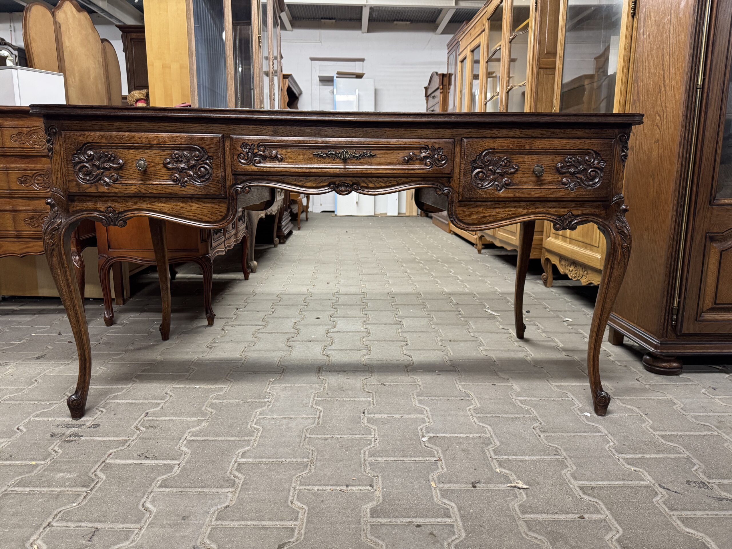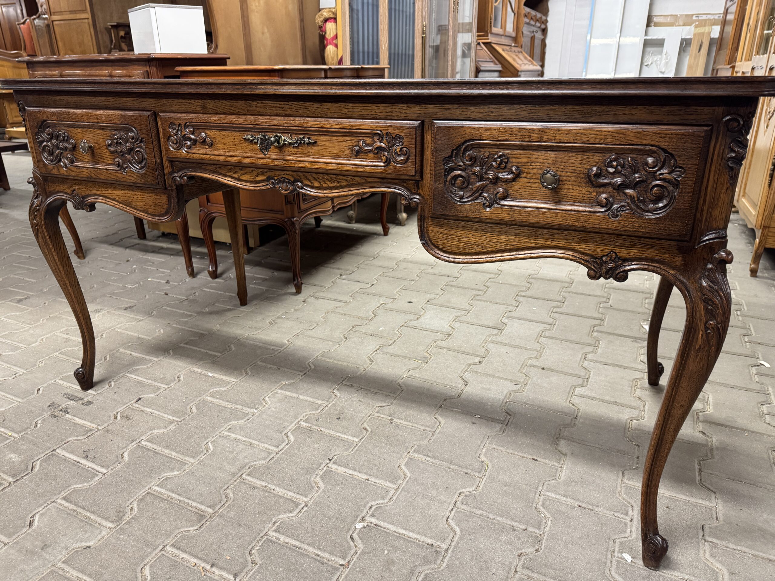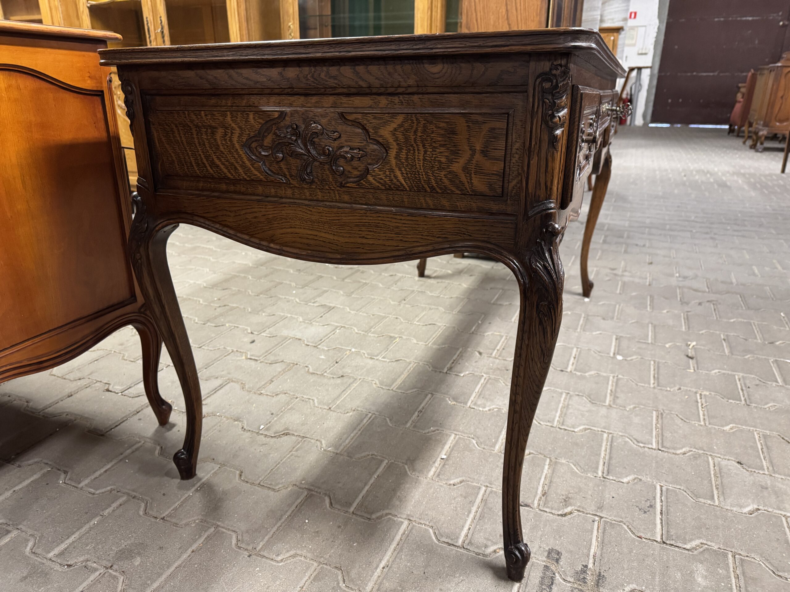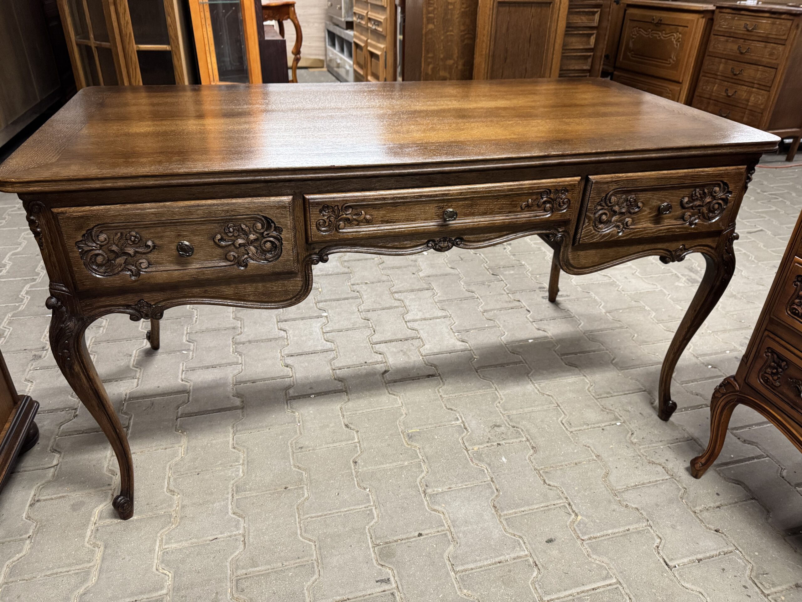 Biurko wykonane z drewna dębowego w ciemnym kolorze.