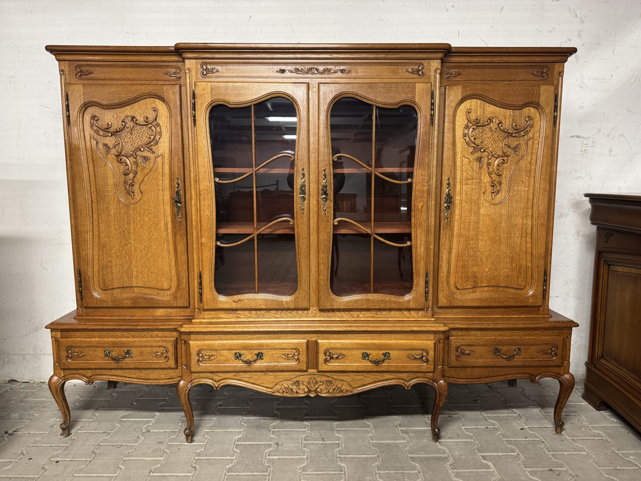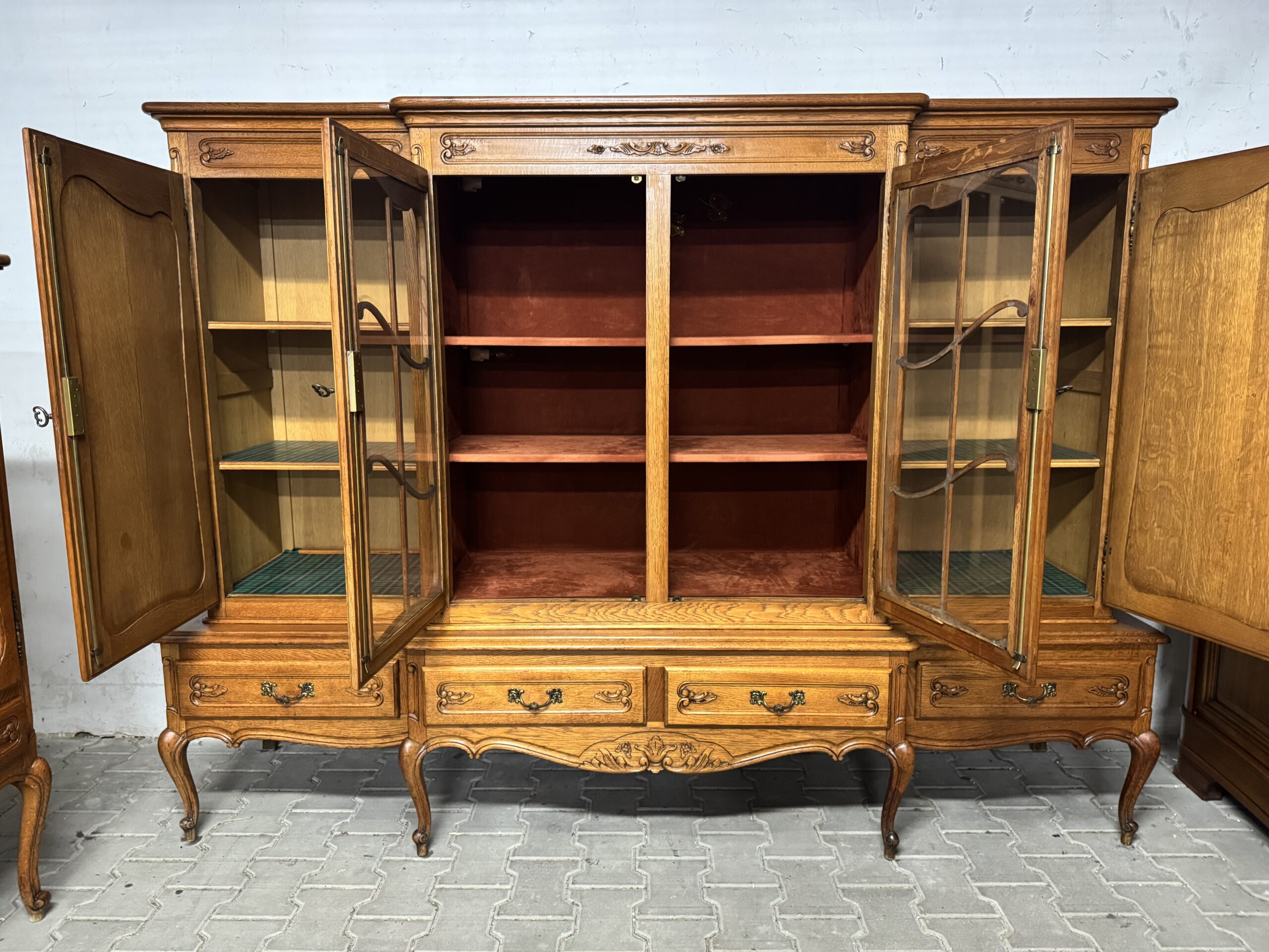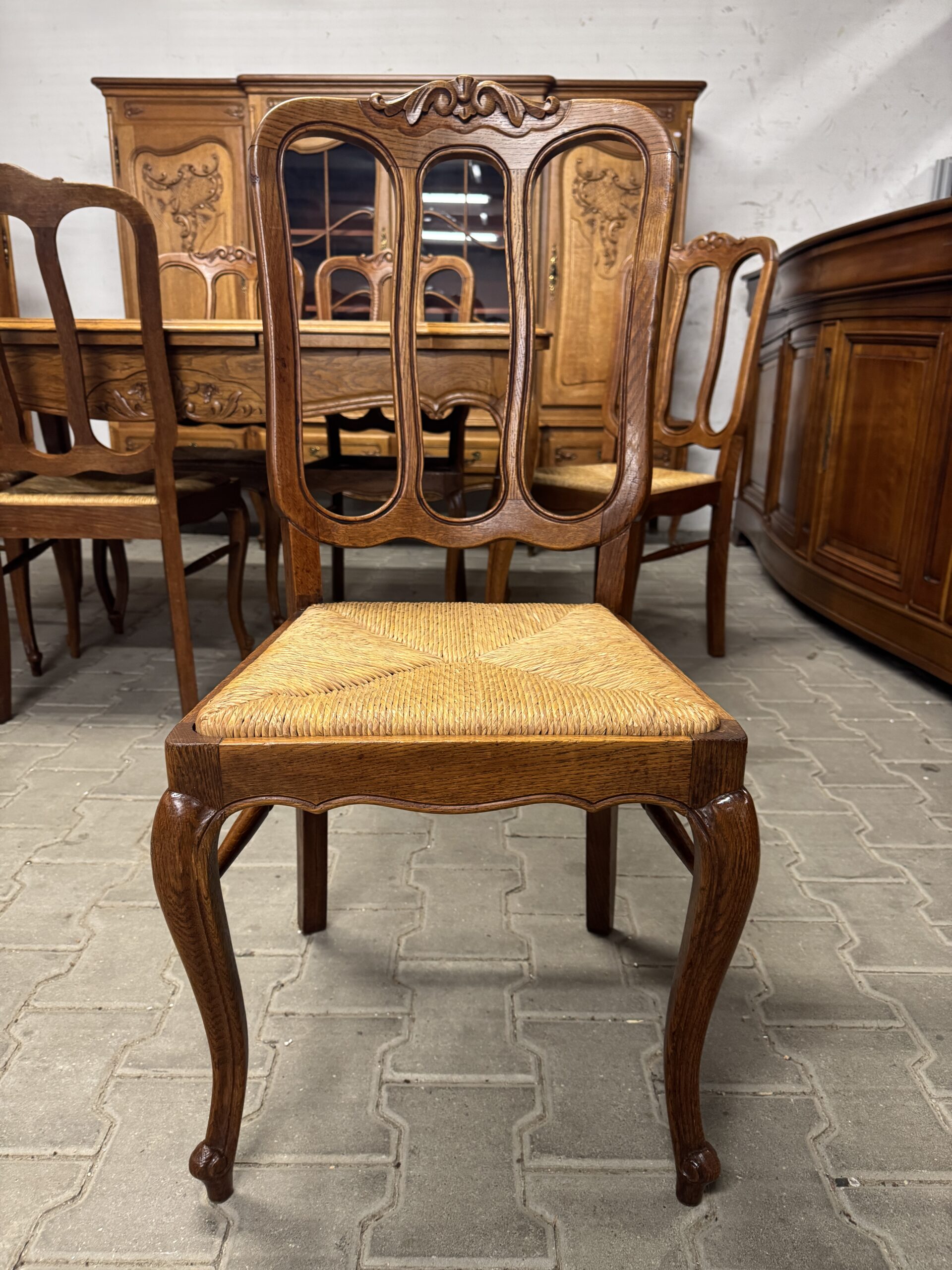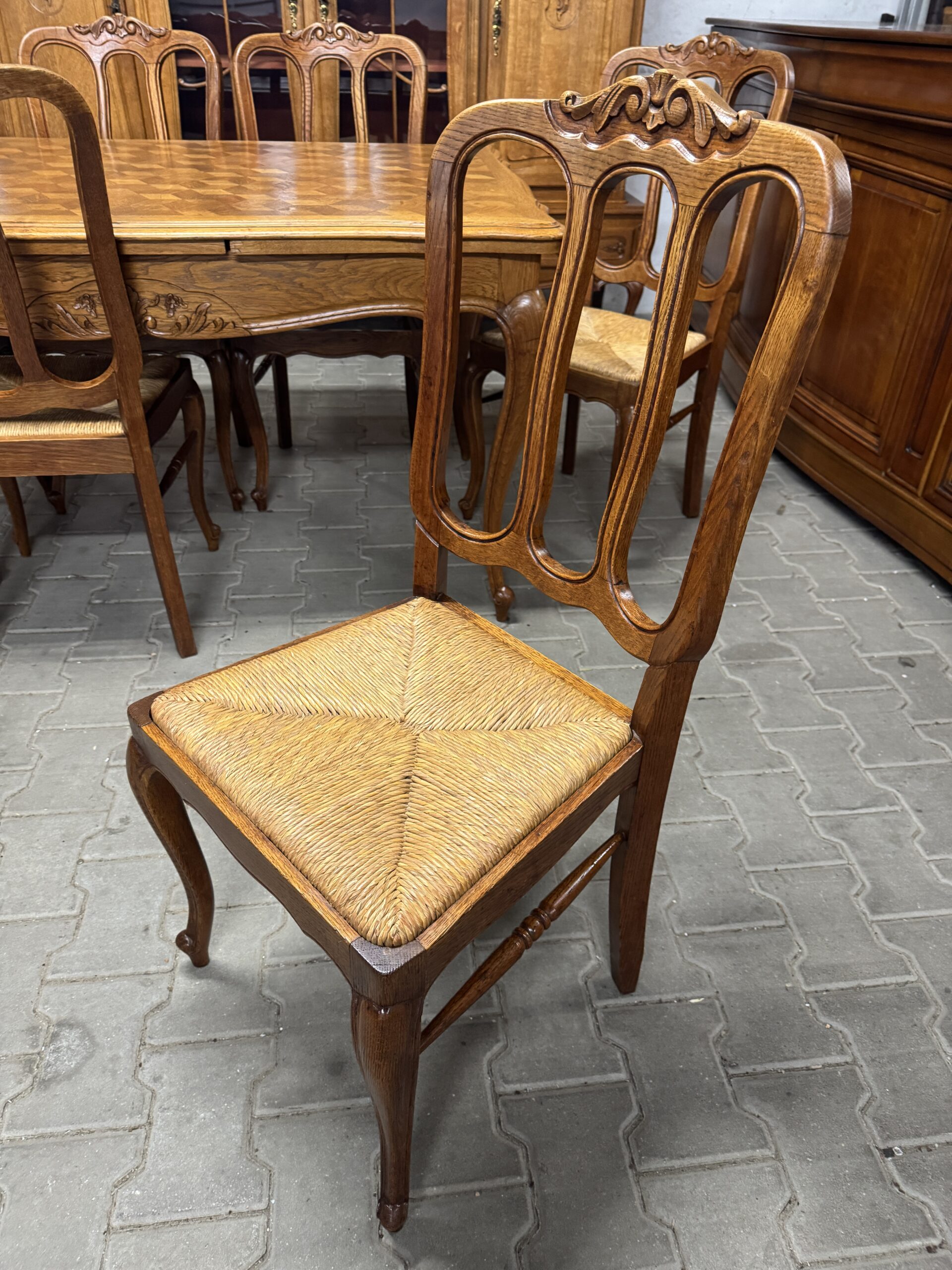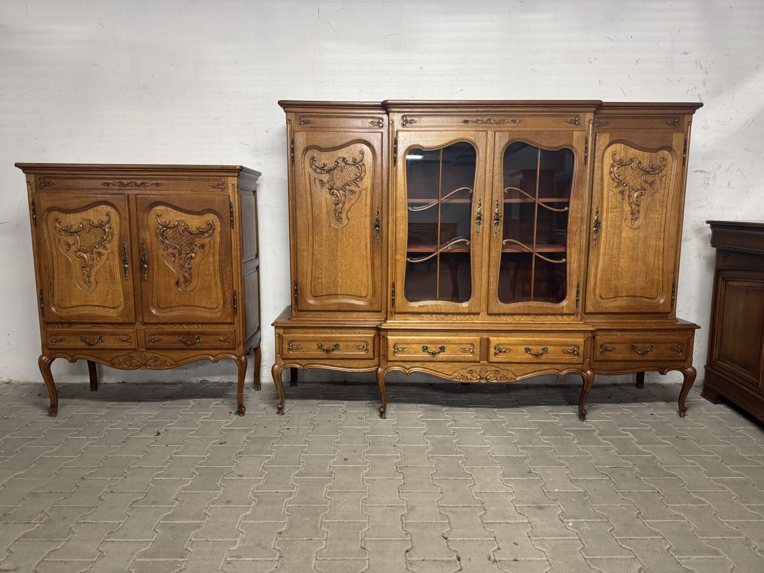 Stylowy drewniany zestaw mebli do jadalni Ludwik: witryna, bufet, rozkładany stół i sześć krzeseł.