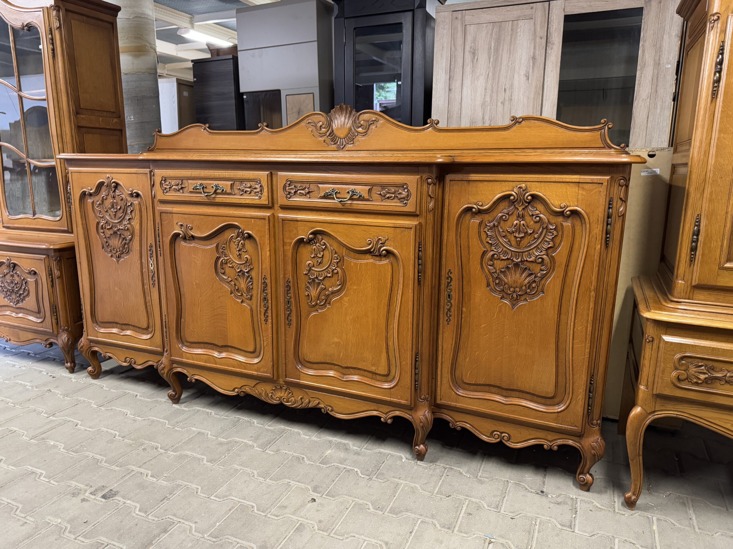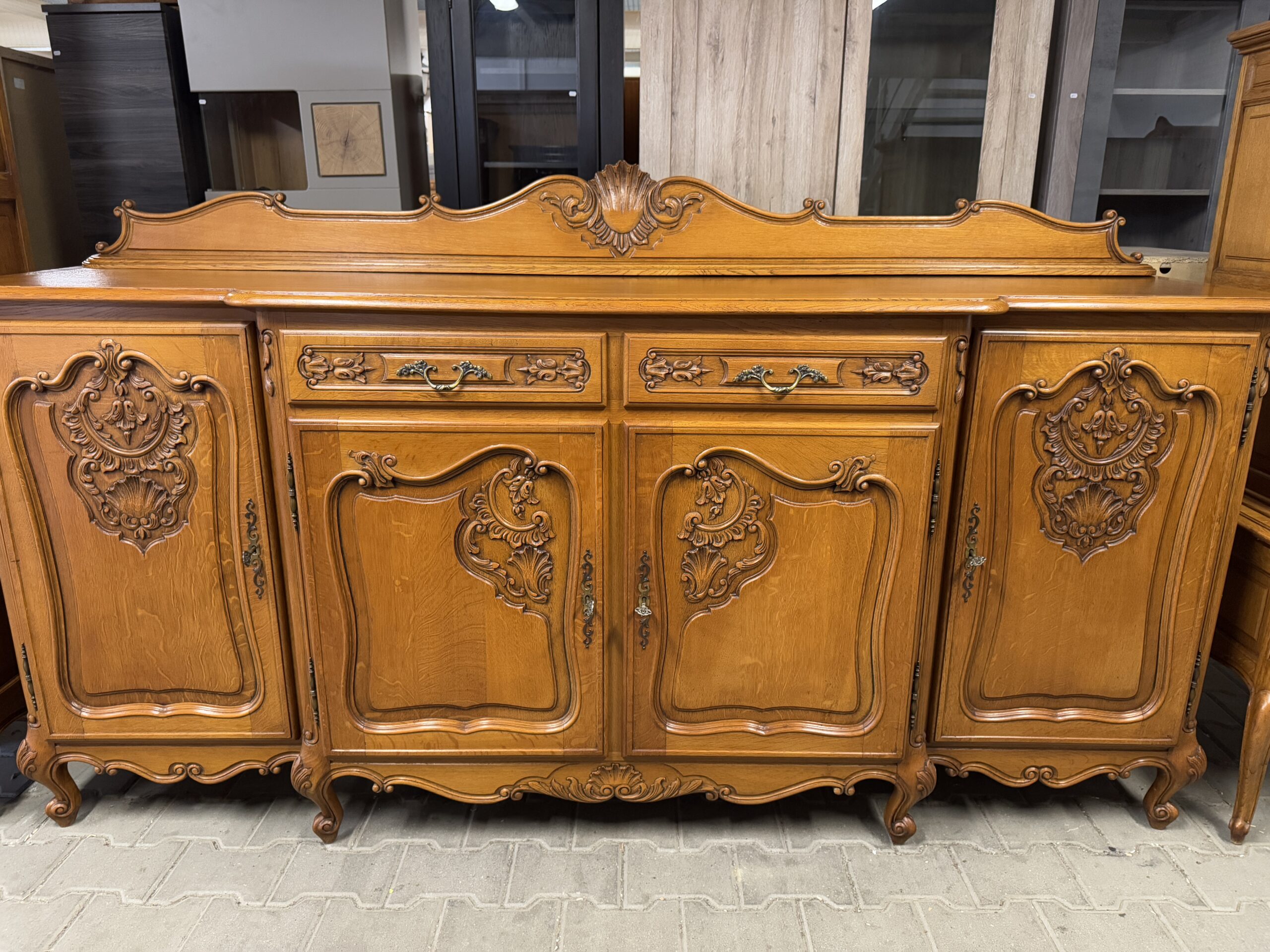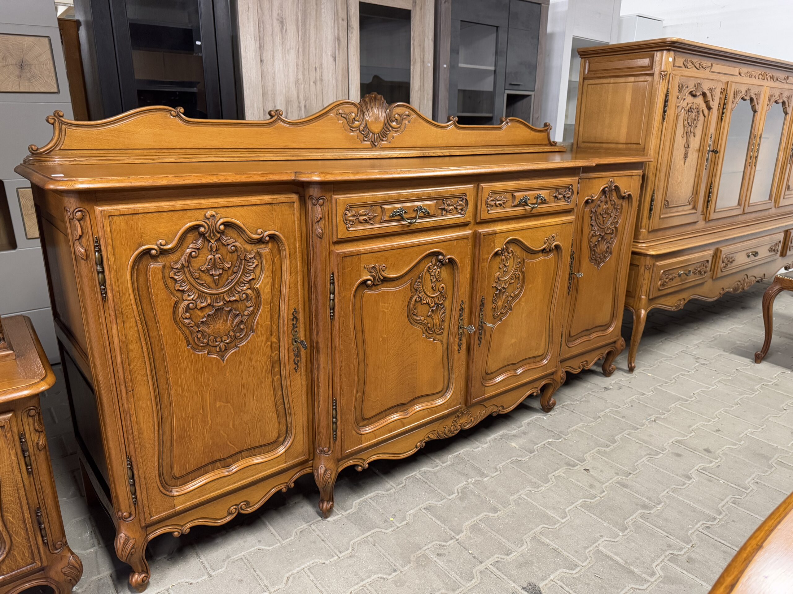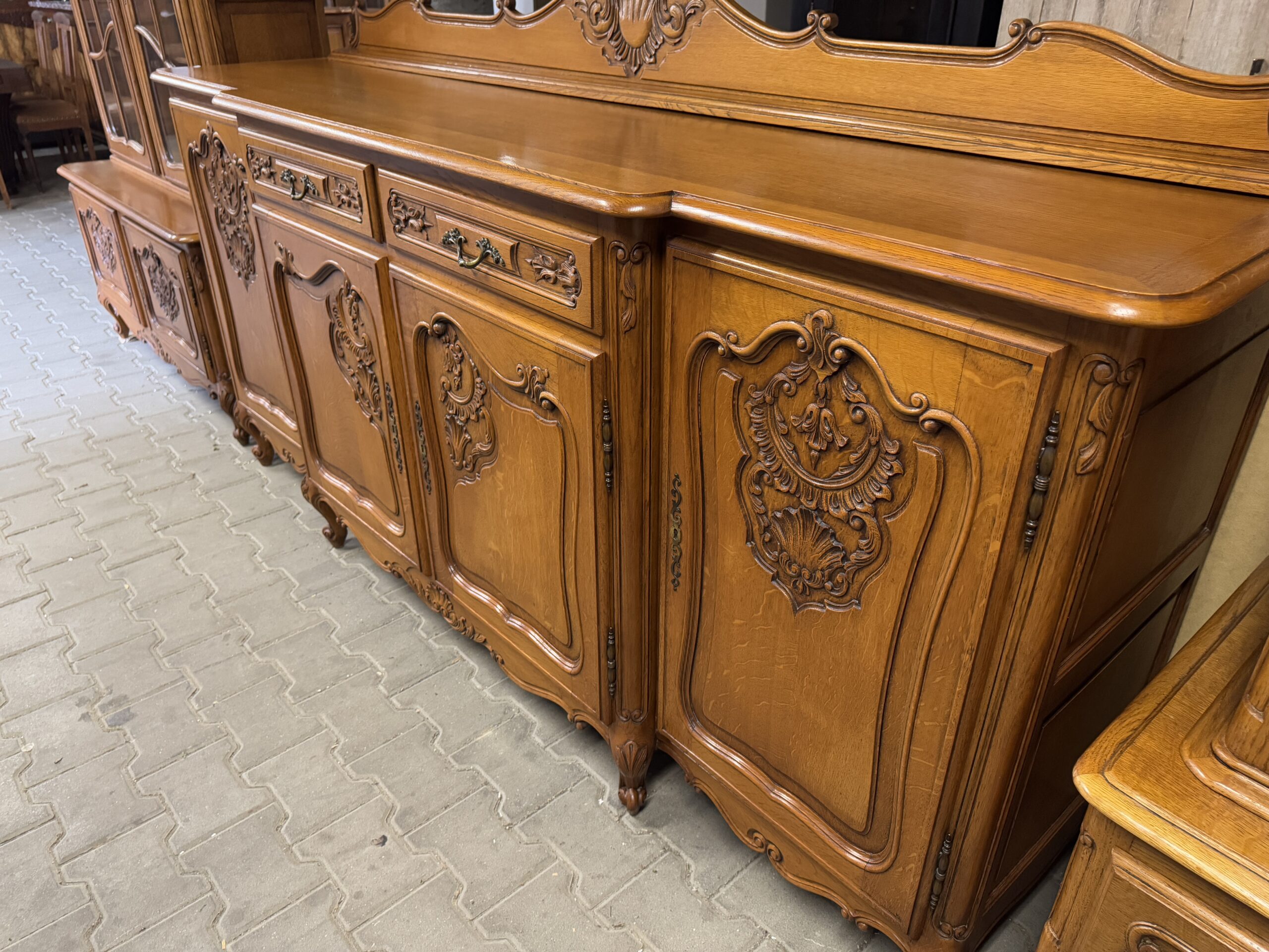 Ręcznie robione oryginalne rzeźbienia oraz mosiężne okucia tworzą wyjątkowy wystrój kompletu.
