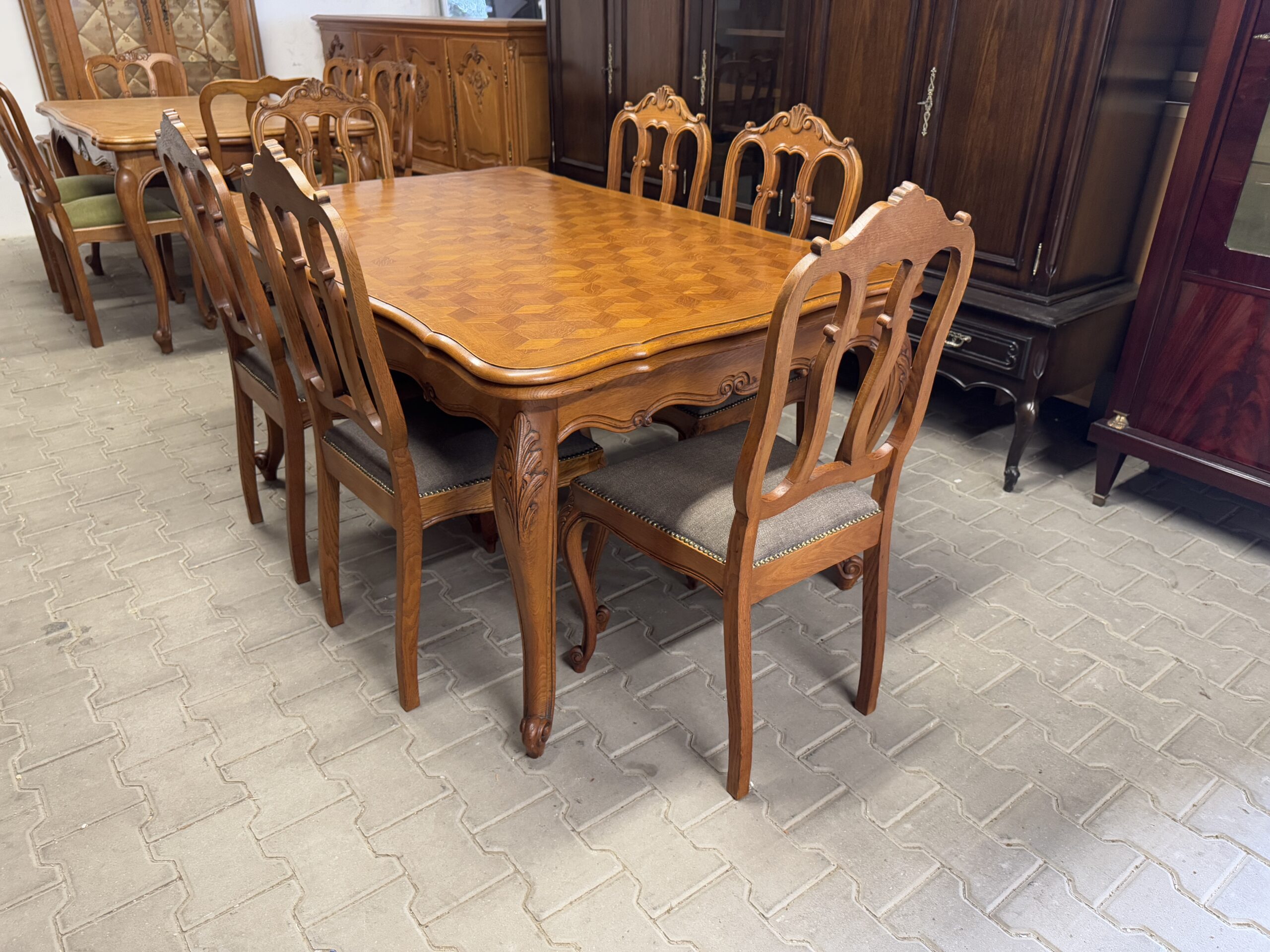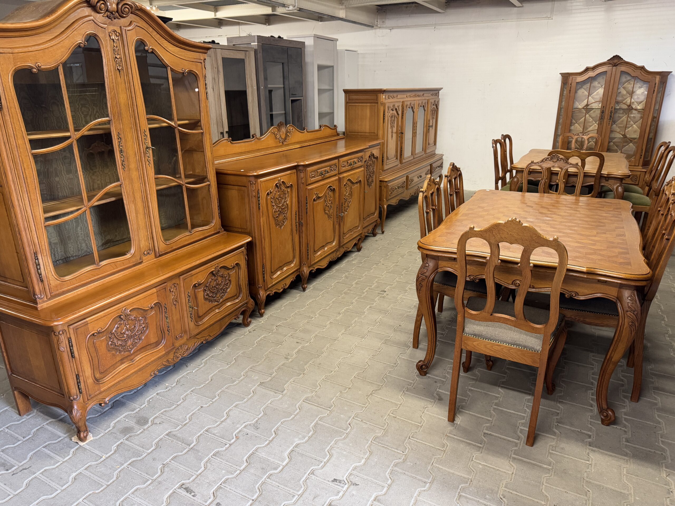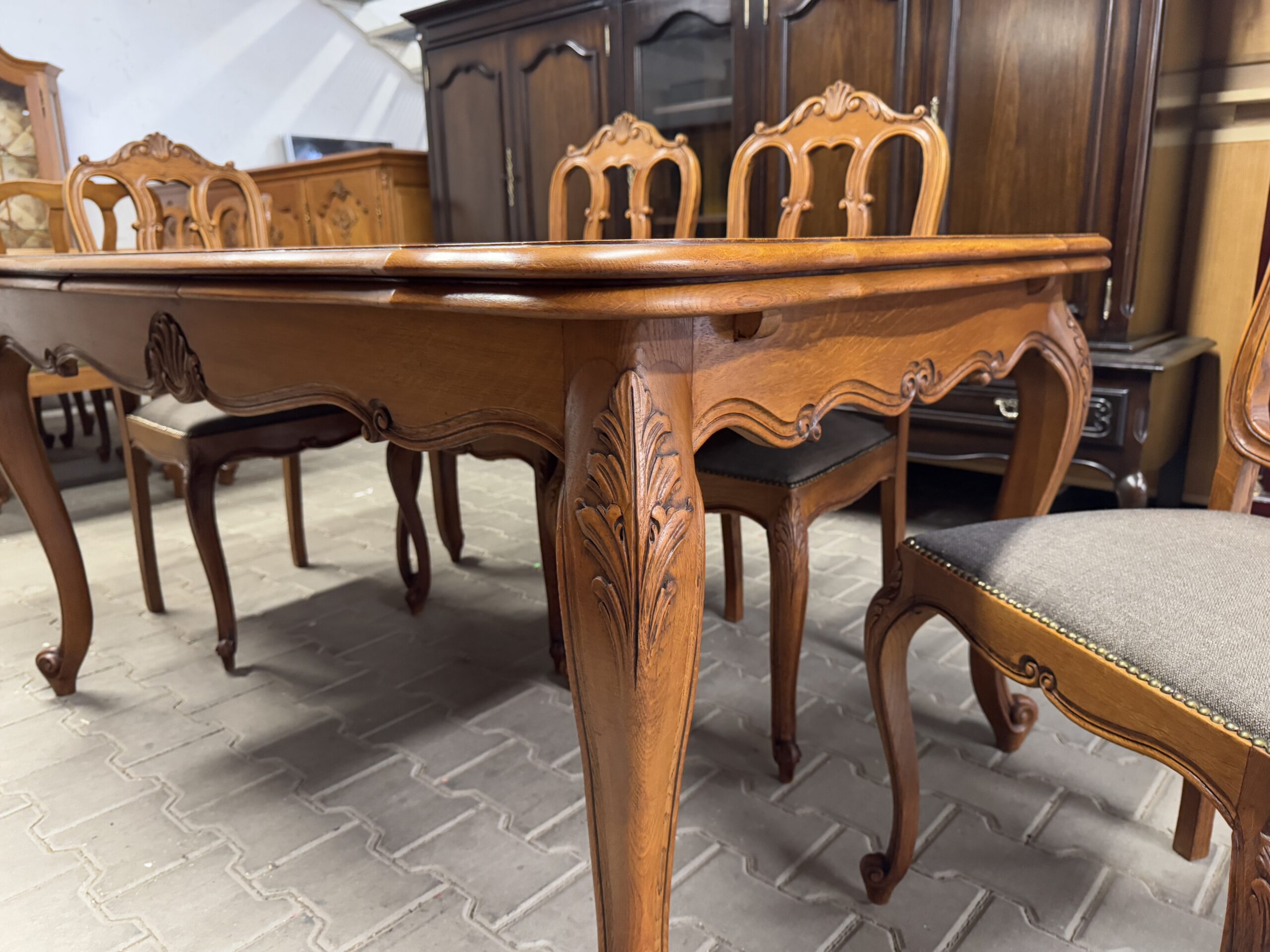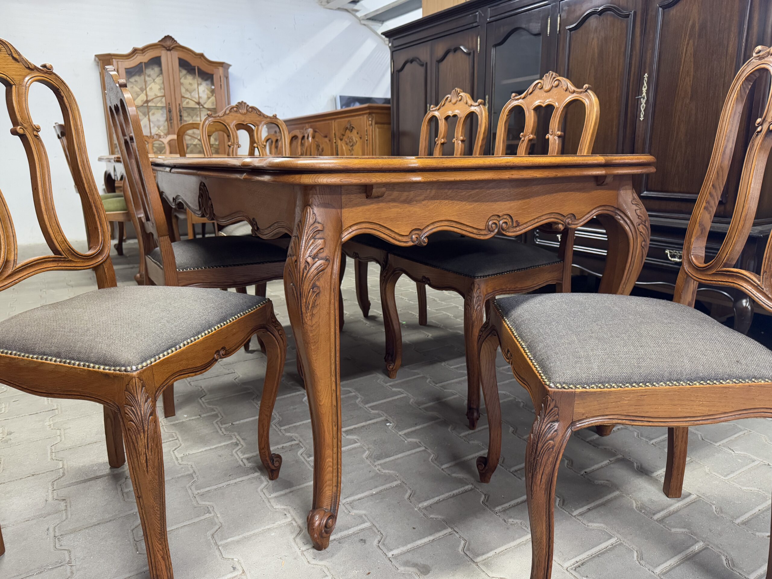 Cudowny komplet mebli do jadalni: komoda, witryna, rozkładany stół i sześć krzeseł.