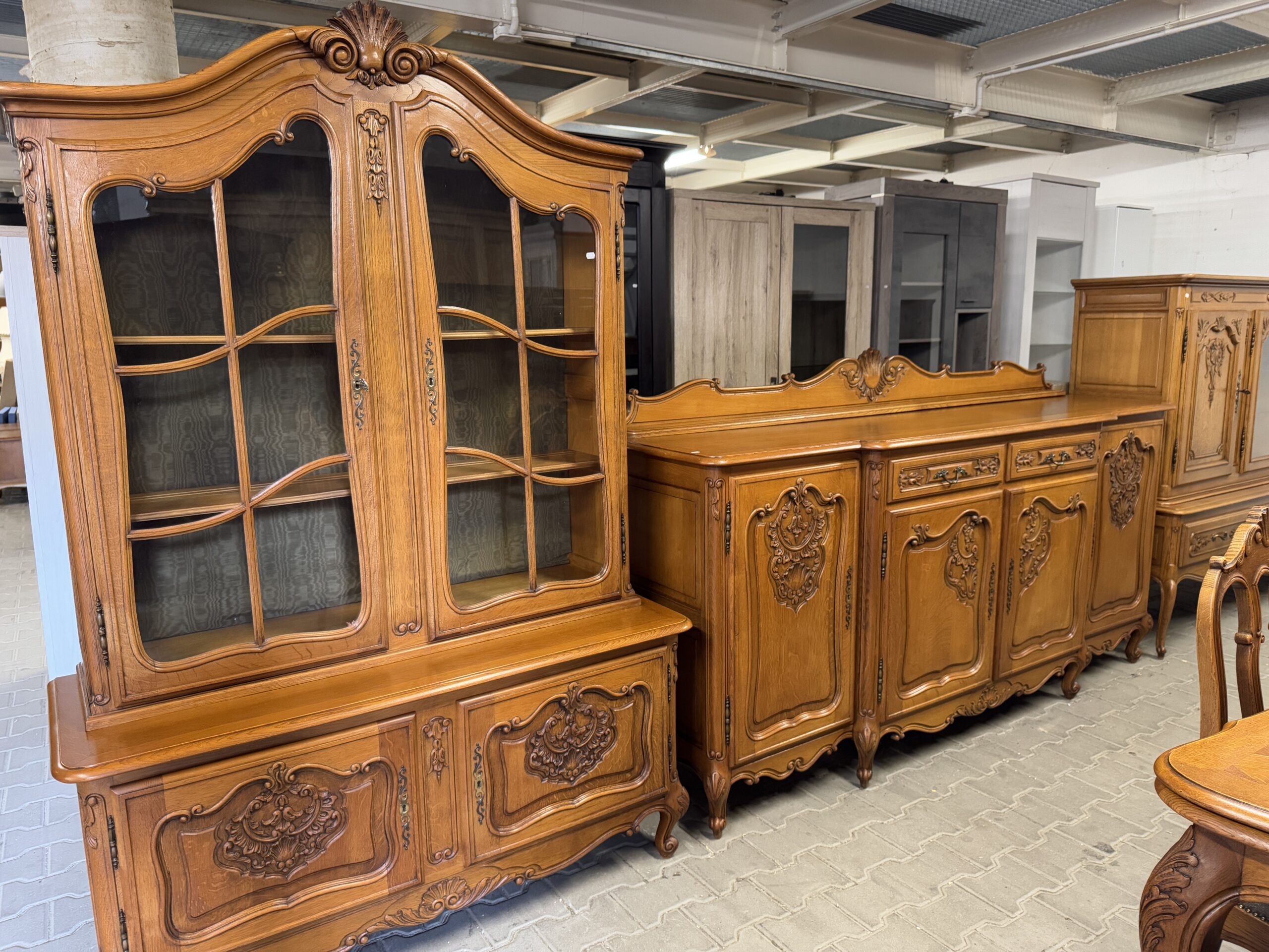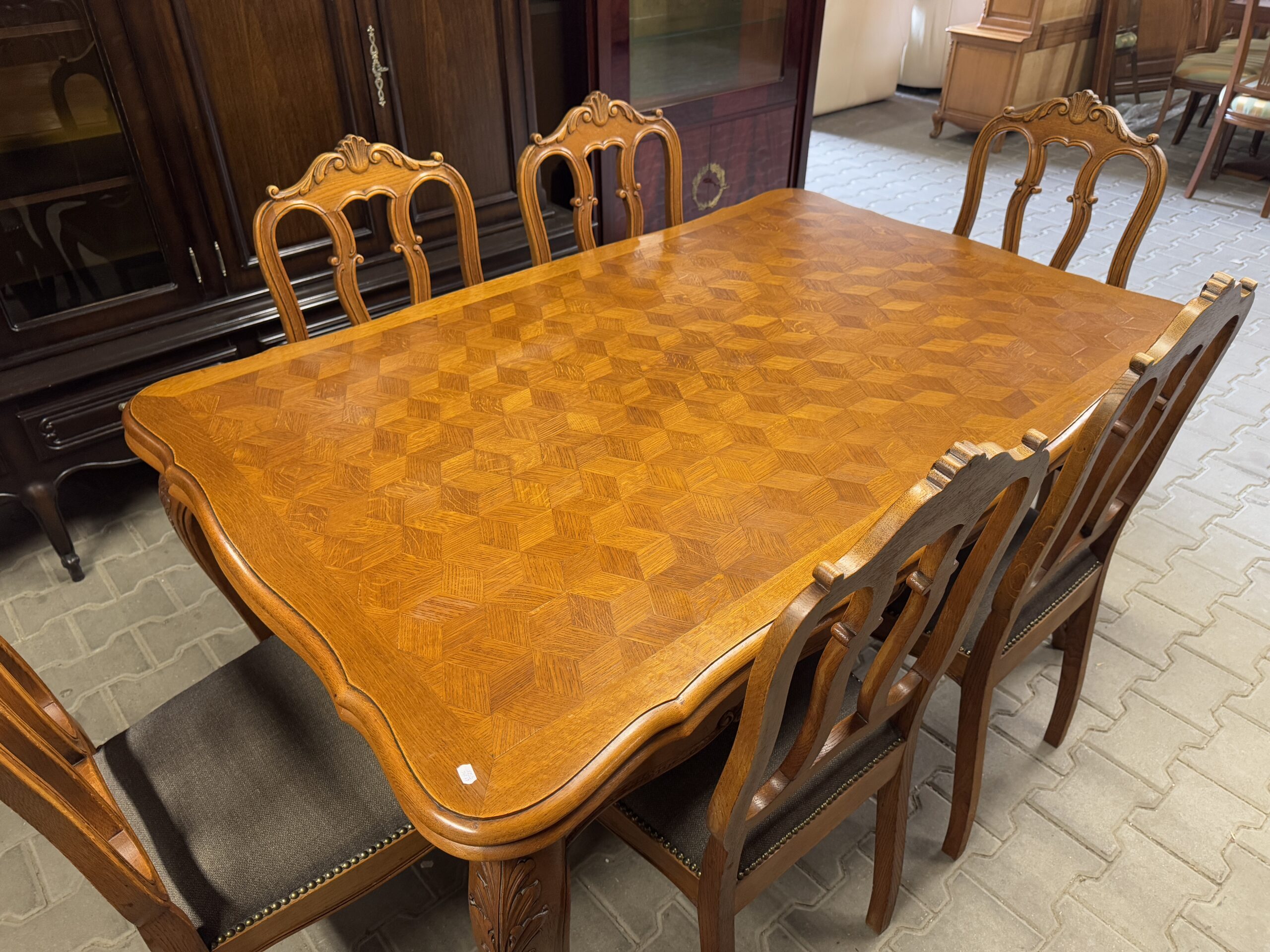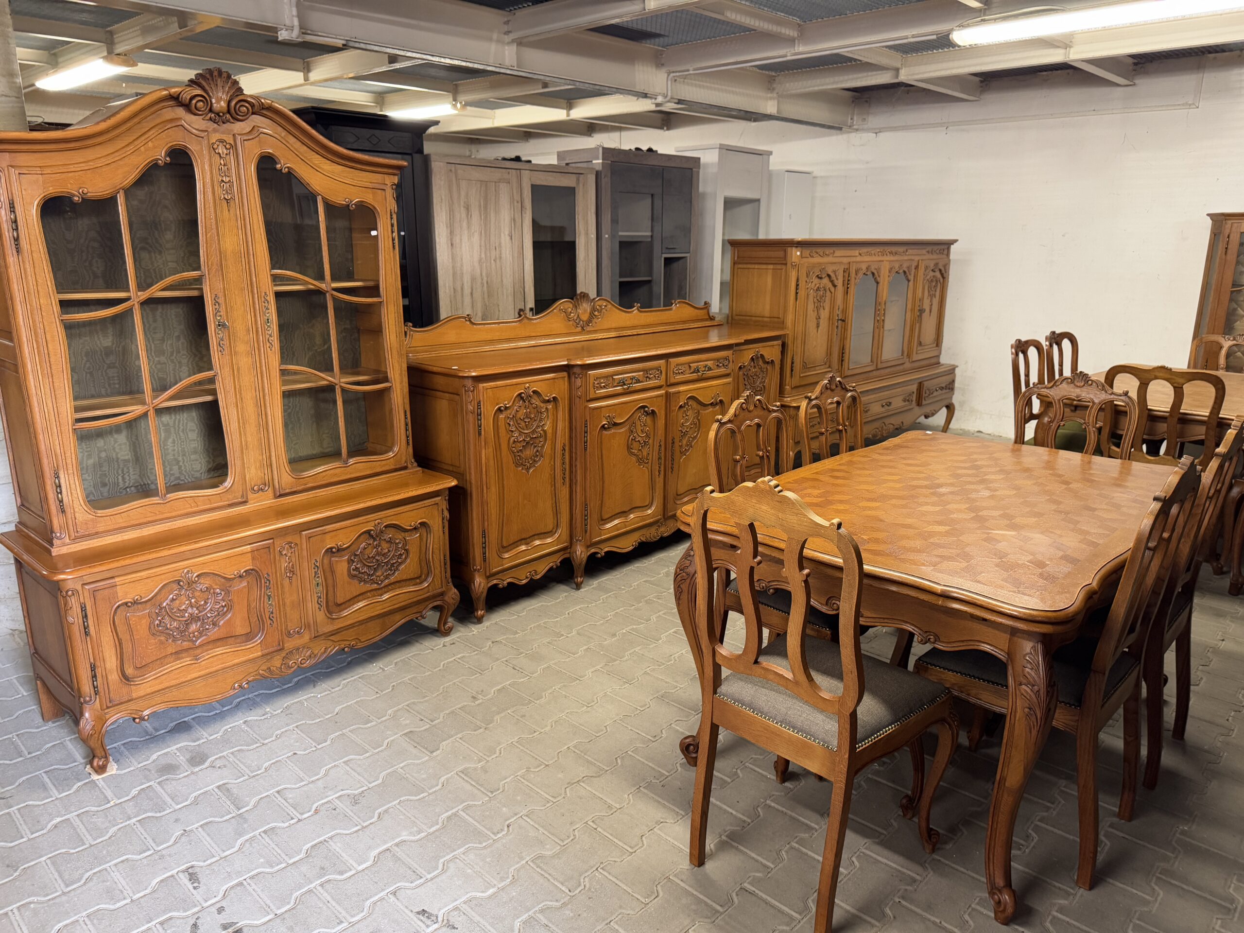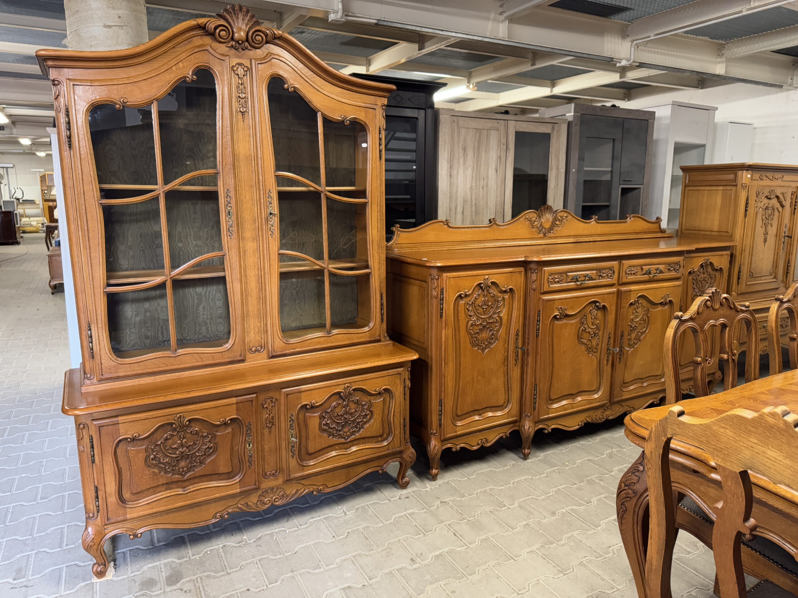 Cudowny komplet mebli do jadalni: komoda, witryna, rozkładany stół i sześć krzeseł.