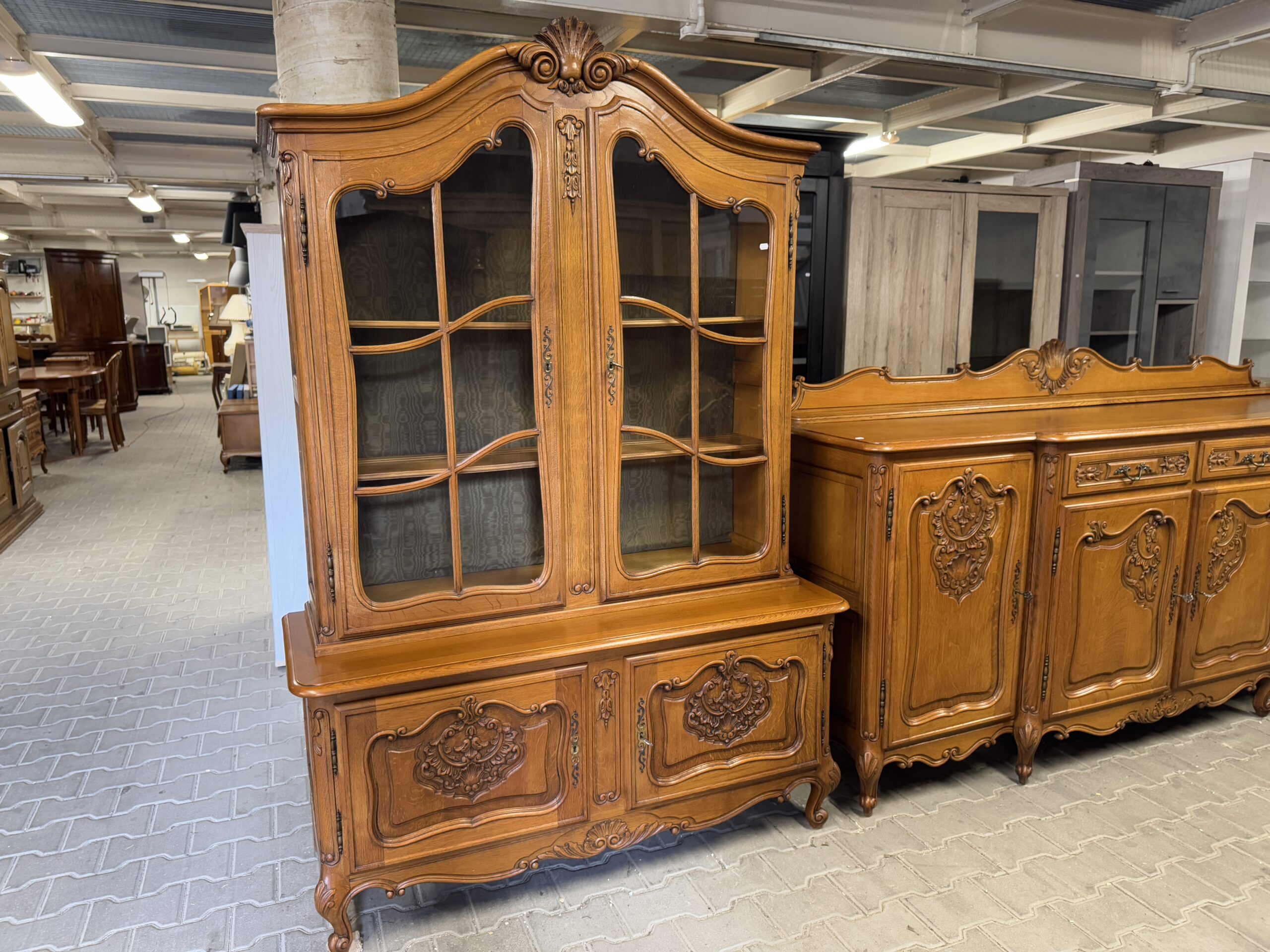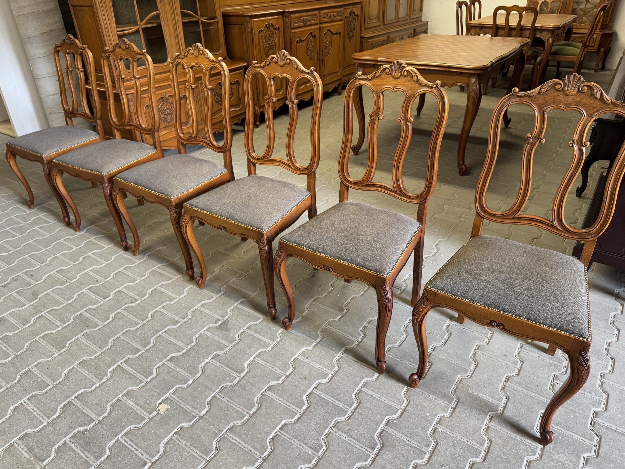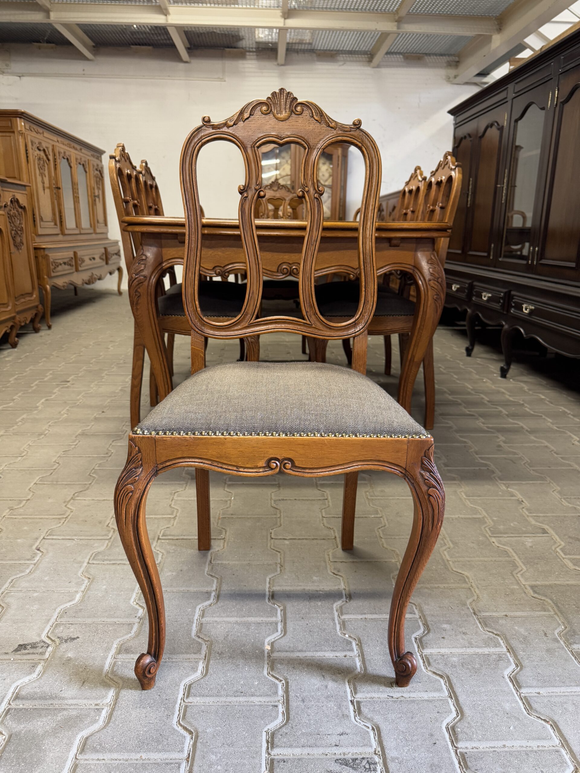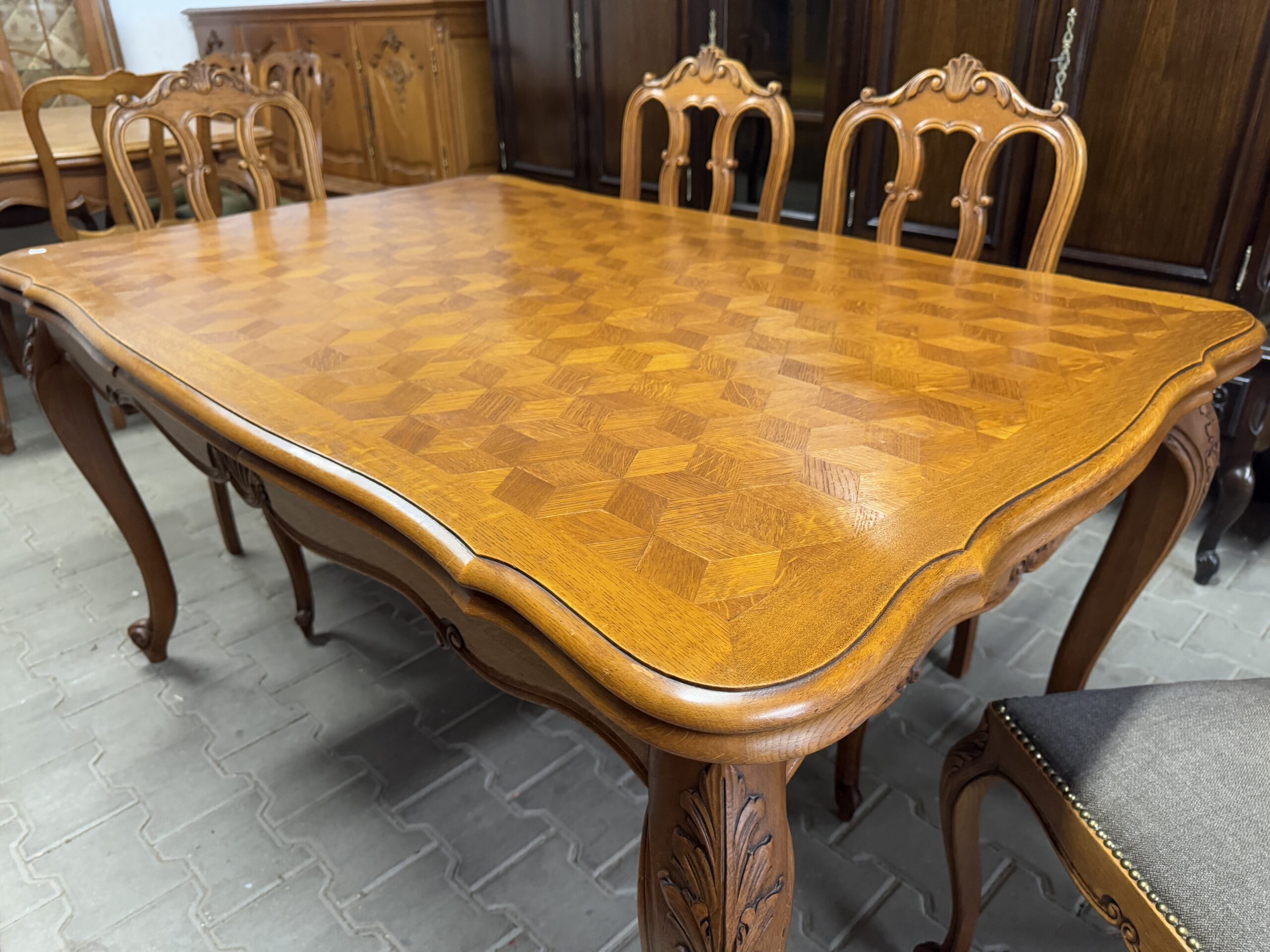 Cudowny komplet mebli do jadalni: komoda, witryna, rozkładany stół i sześć krzeseł.