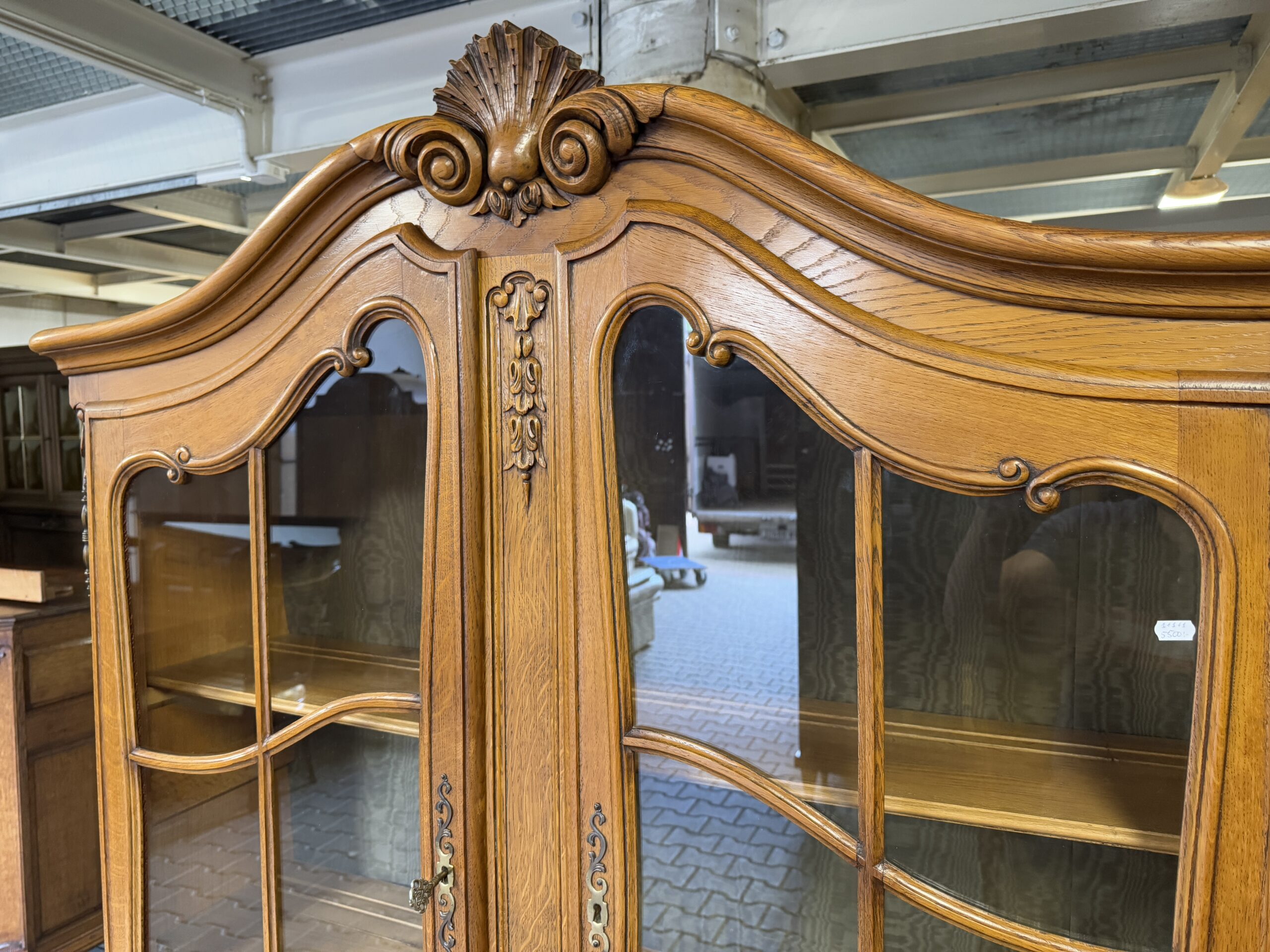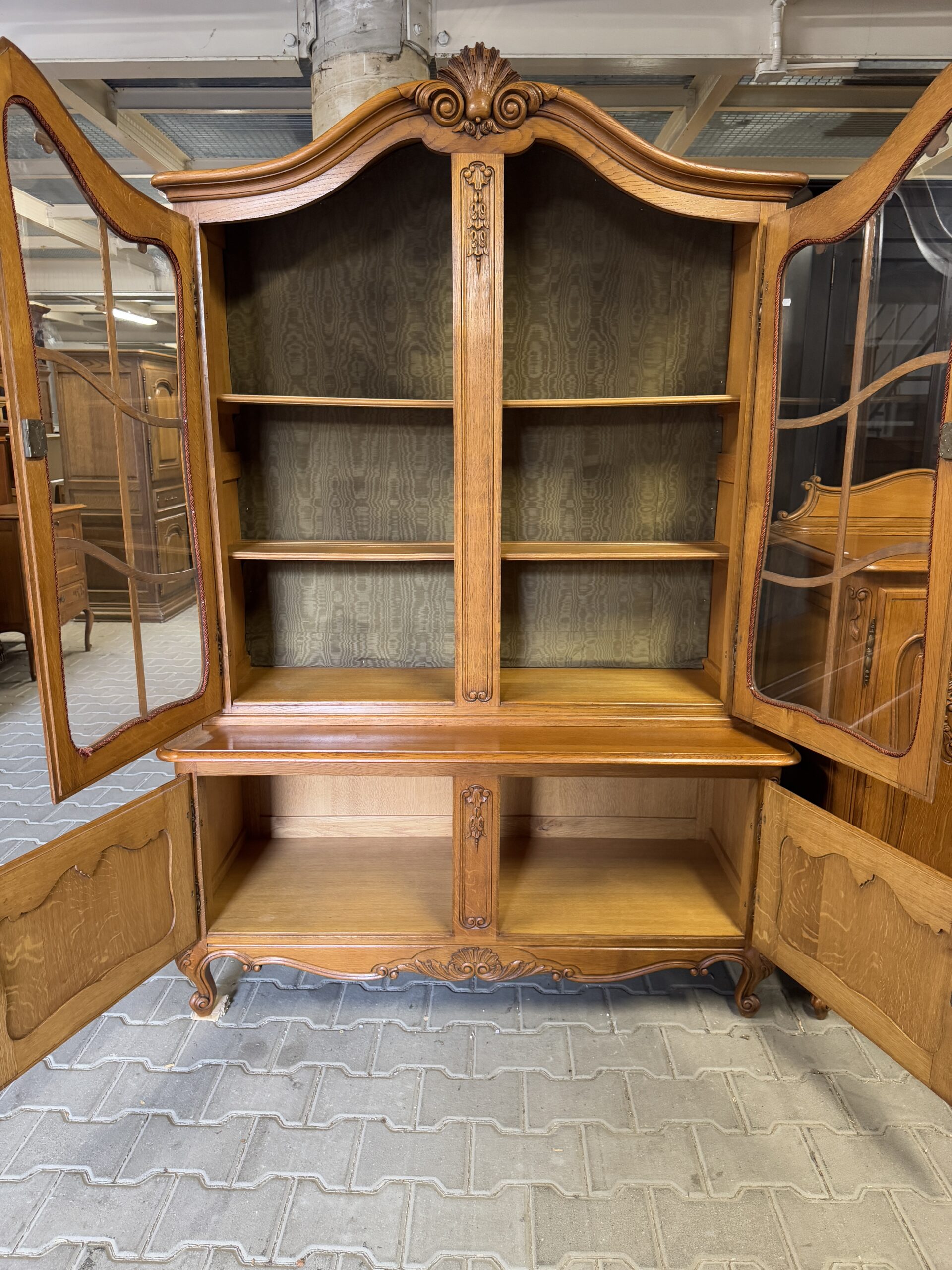 Górna część witryny przeszklona, wyposażona w drewniane półki.