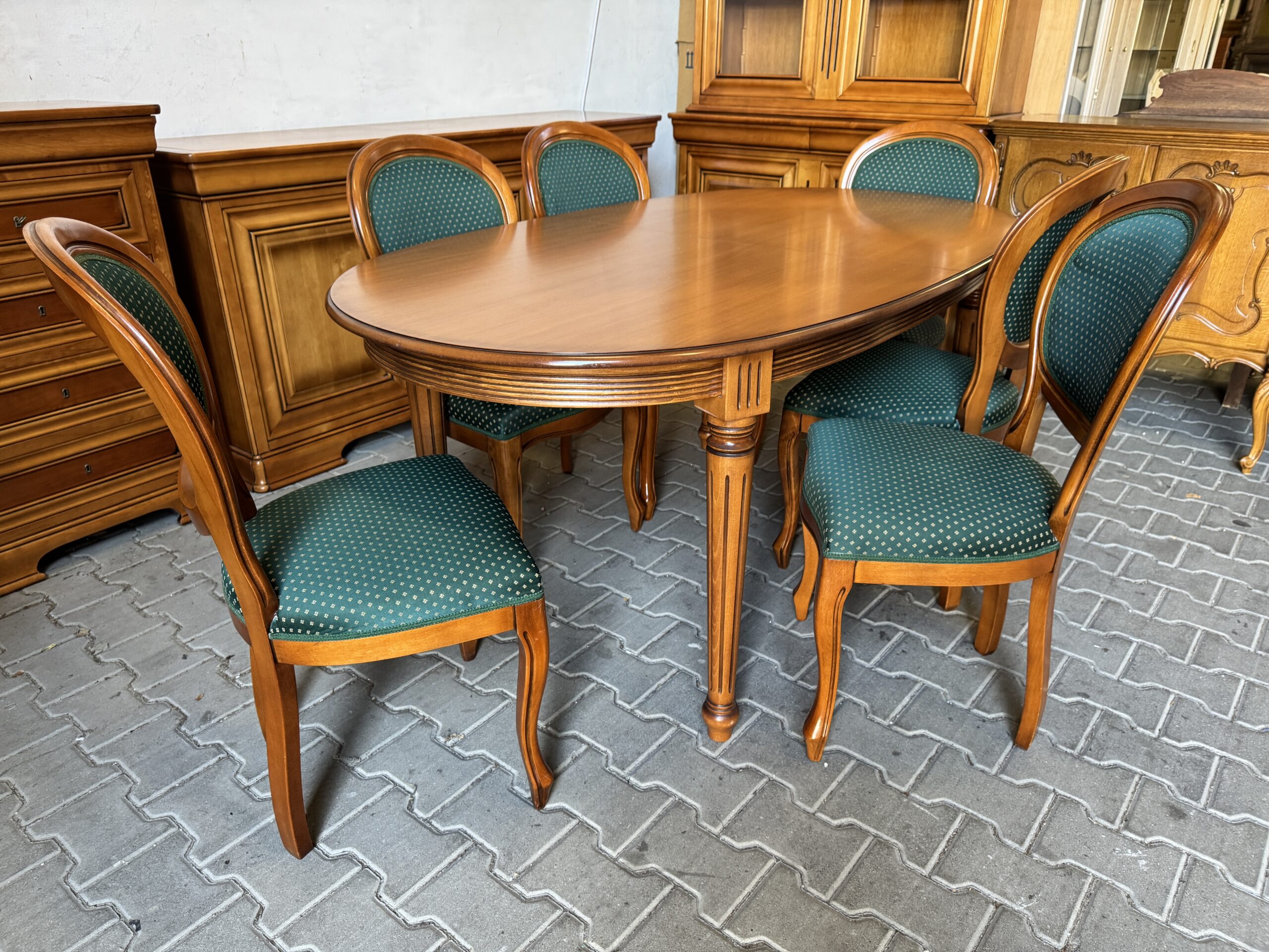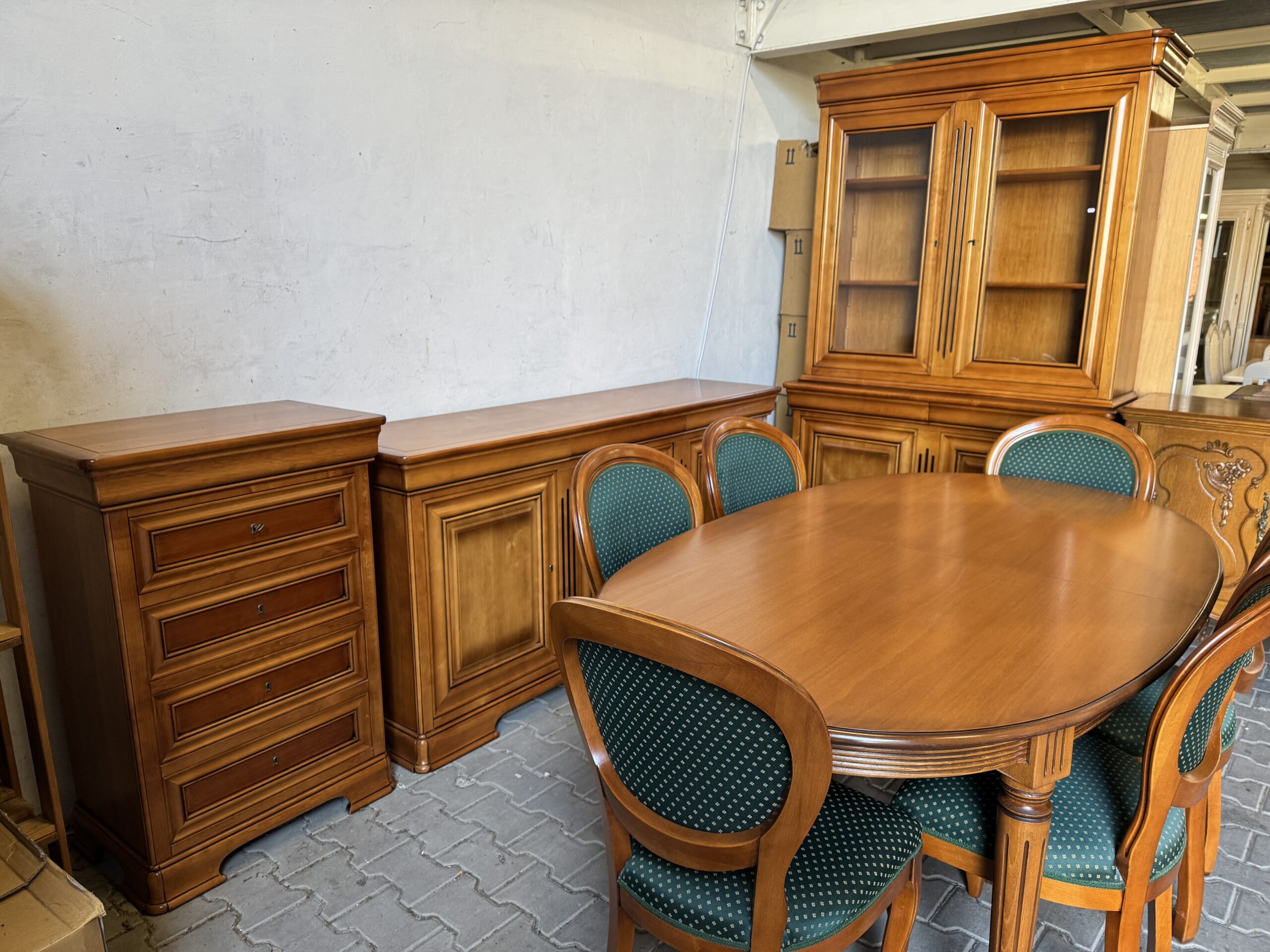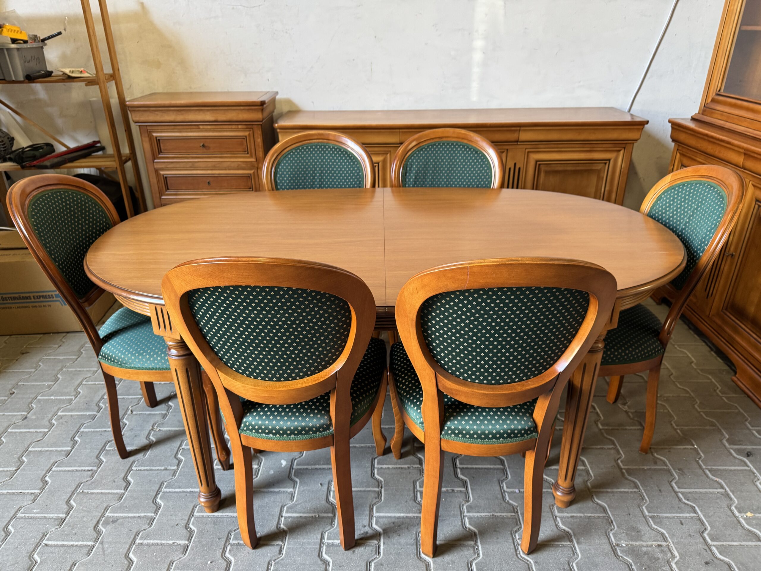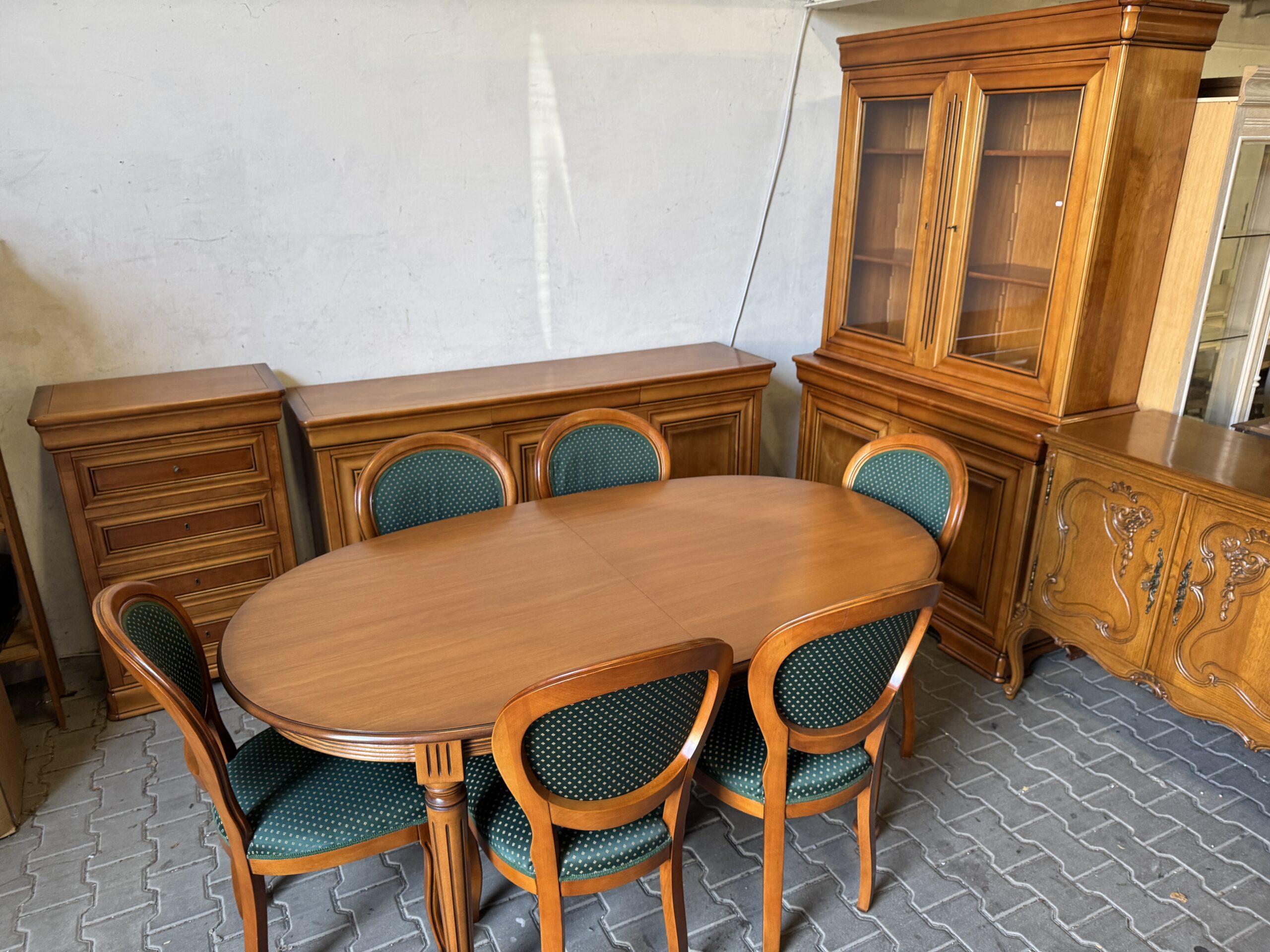 Cena za komplet: komoda, witryna, szafka, stół, sześć krzeseł.