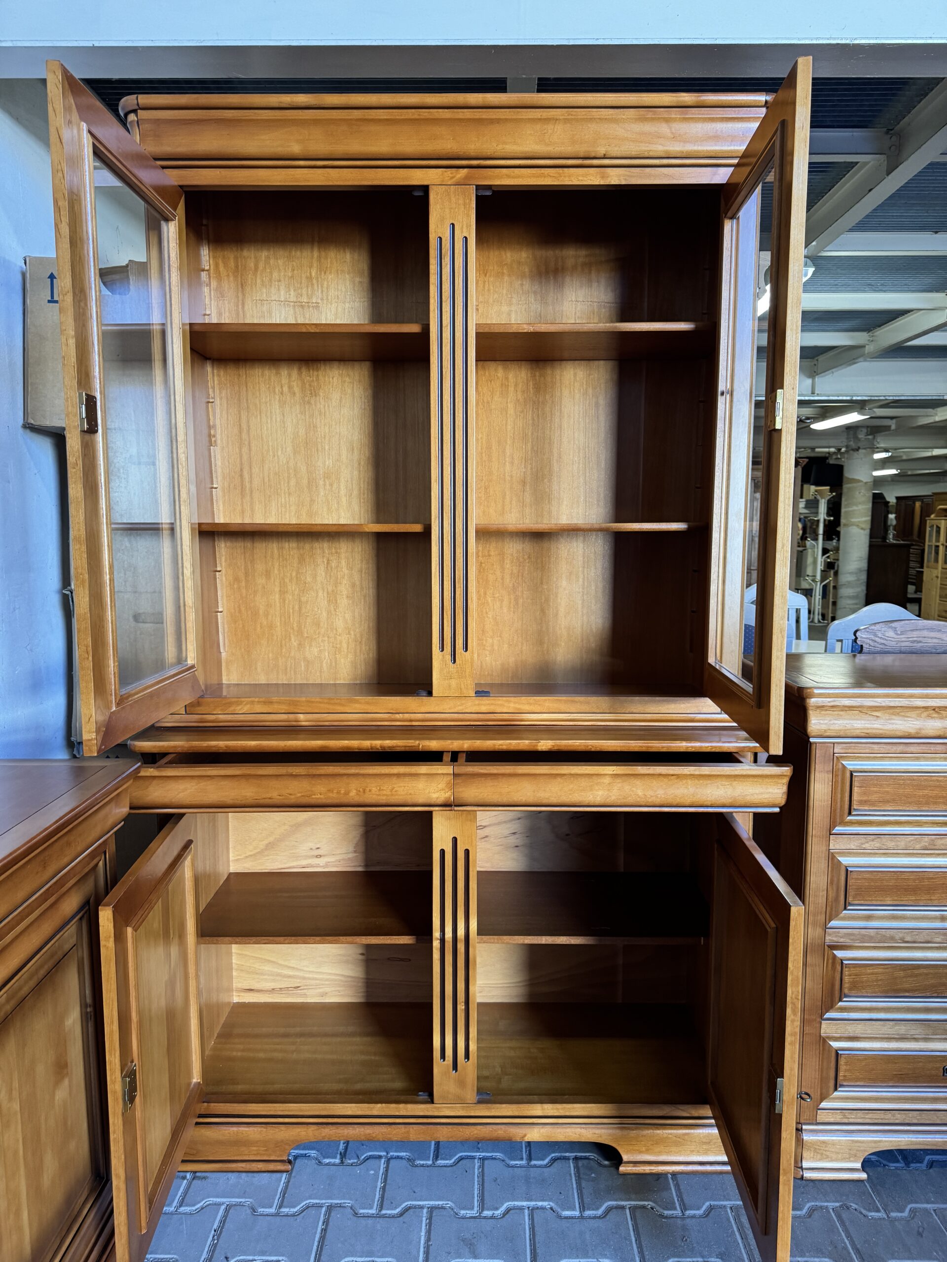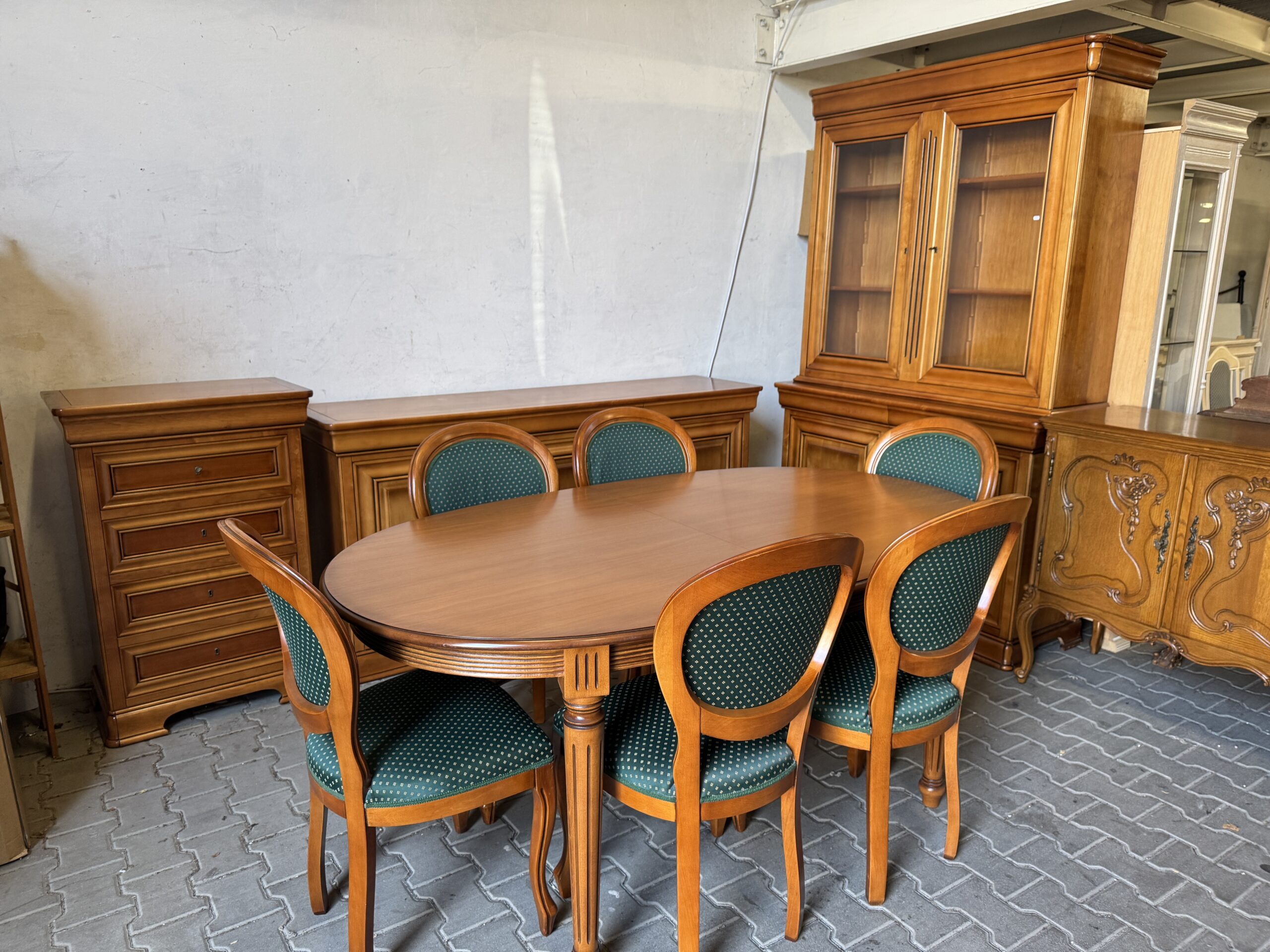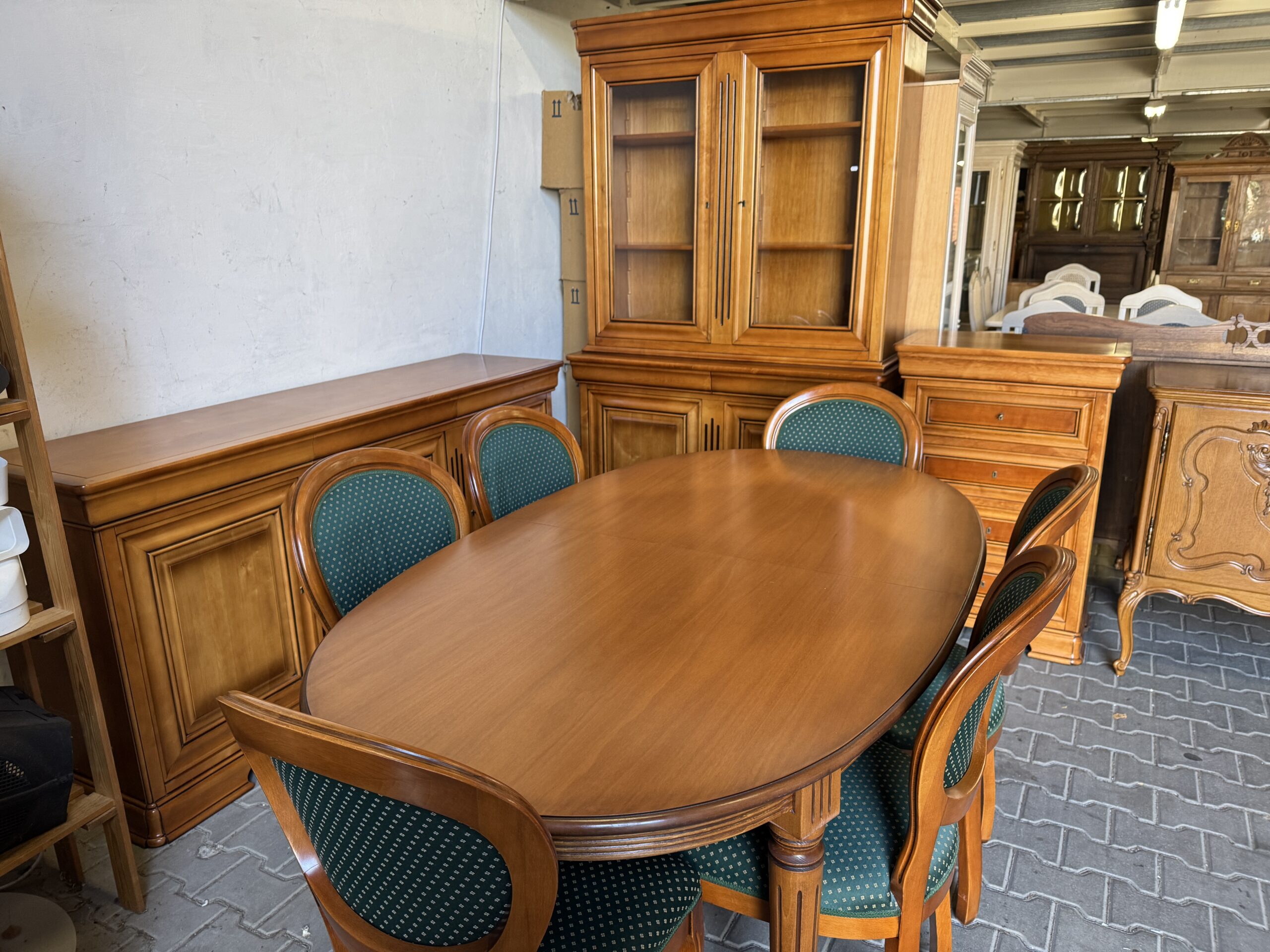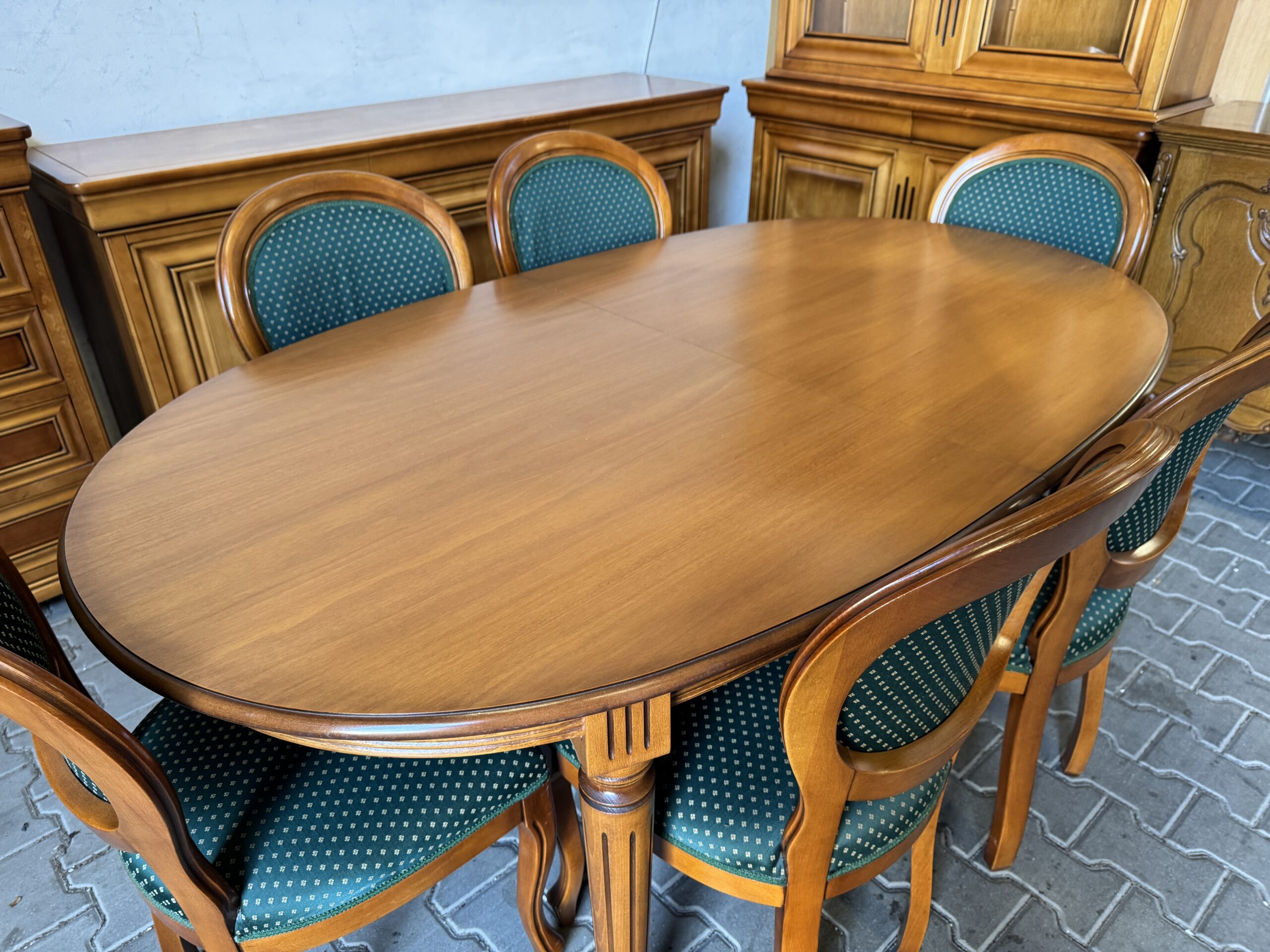 Zestaw mebli do jadalni: komoda, witryna, szafka, rozkładany stół (dwie wkładki) i sześć krzeseł.