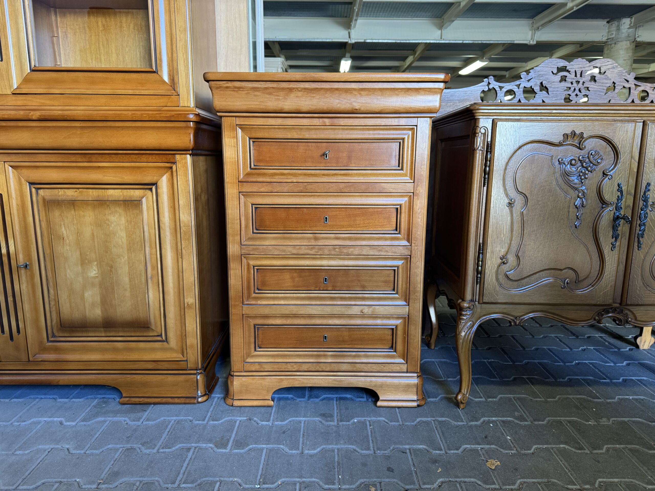 Komoda wyposażona w trzy szuflady oraz zamykane półki.