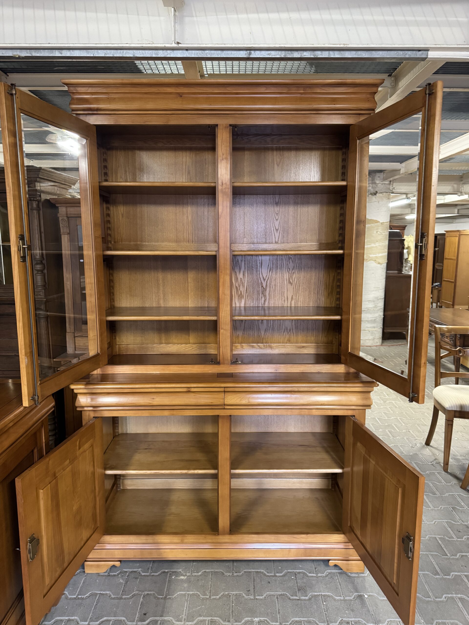 Witryna posiada dwie duże szuflady oraz półki w górnej (trzy półki) i dolnej (jedna półka) przestrzeniach.