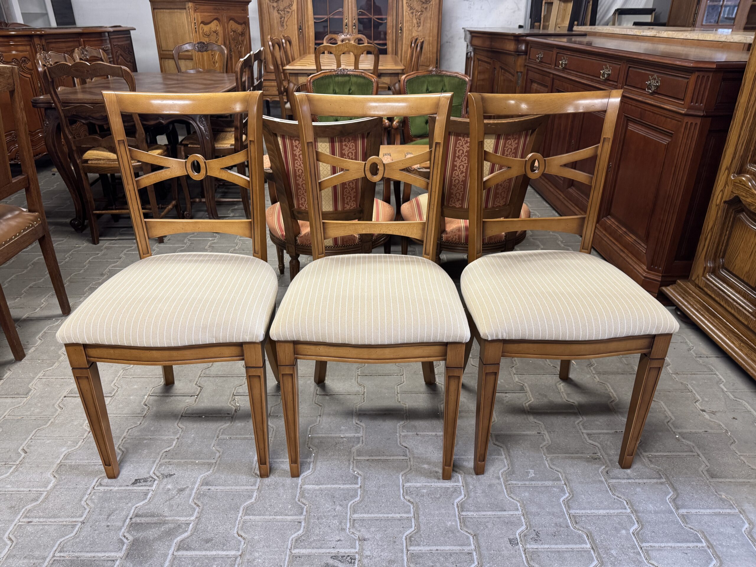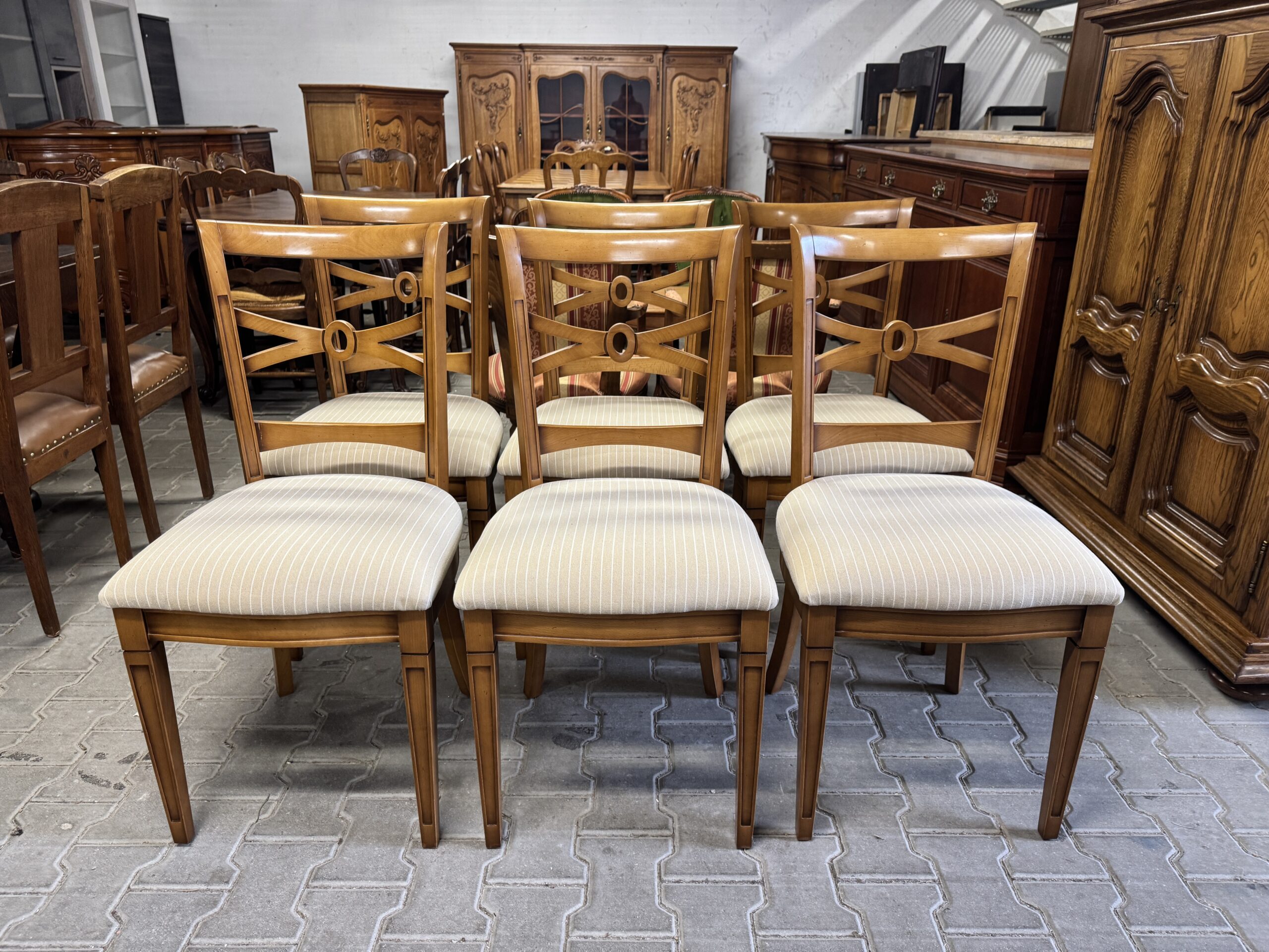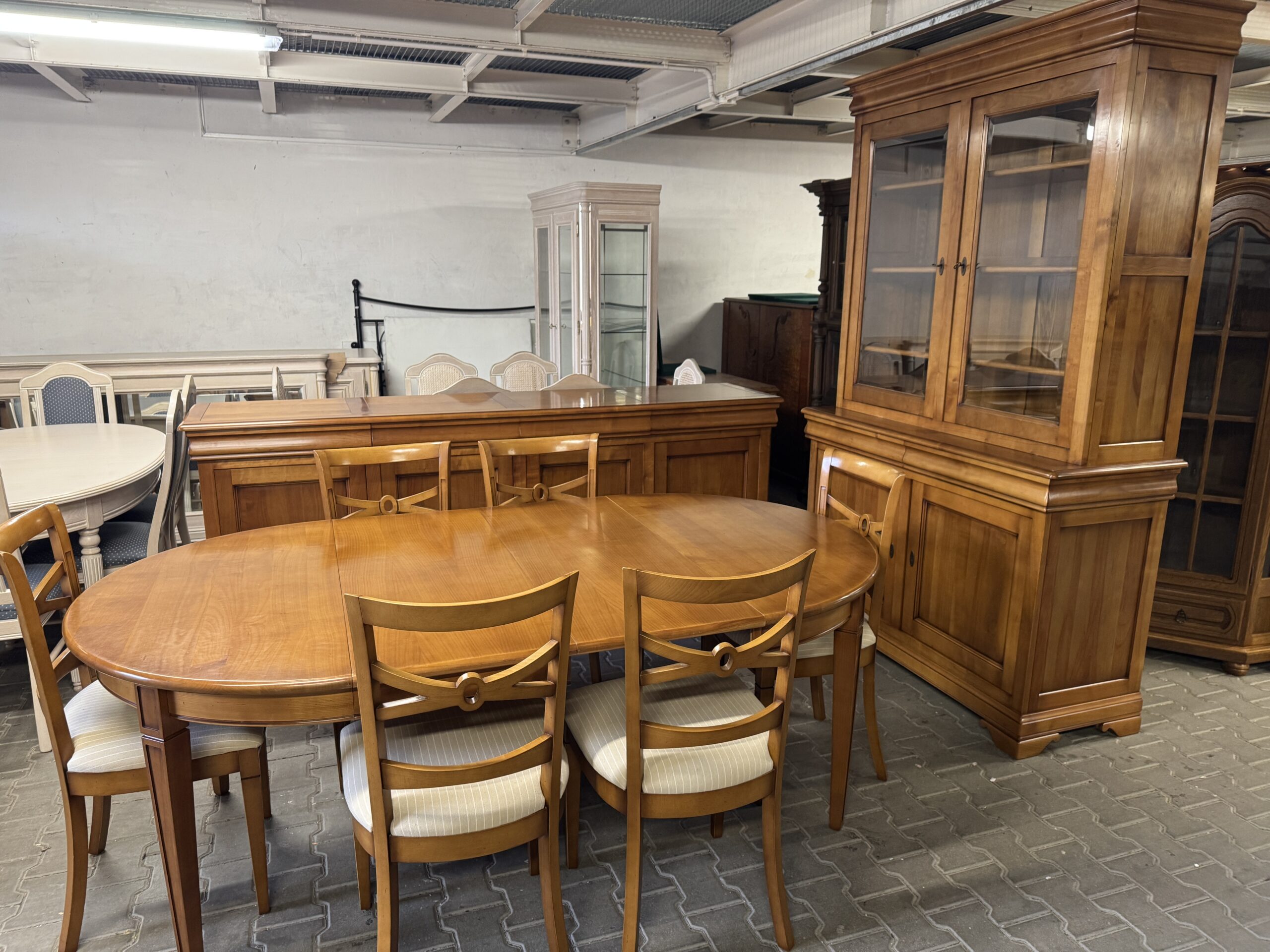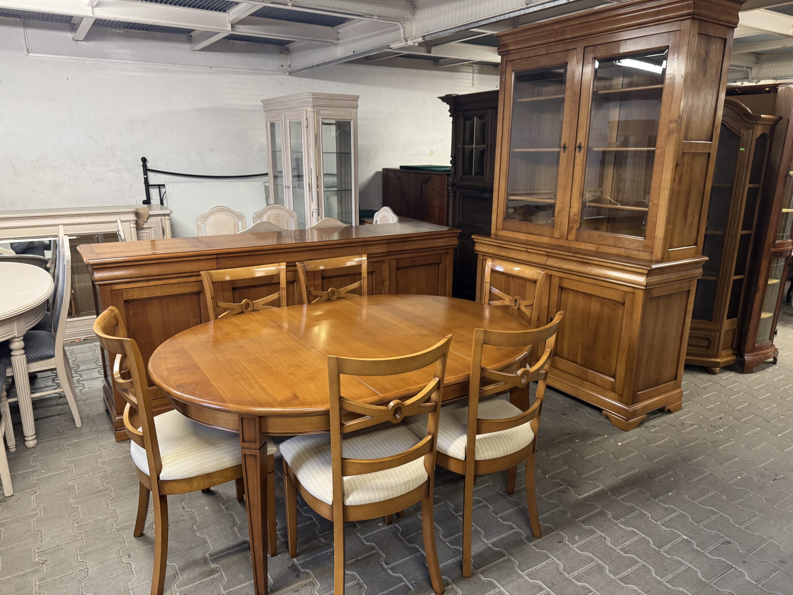 Cena za komplet: komoda, witryna, stół, sześć krzeseł.