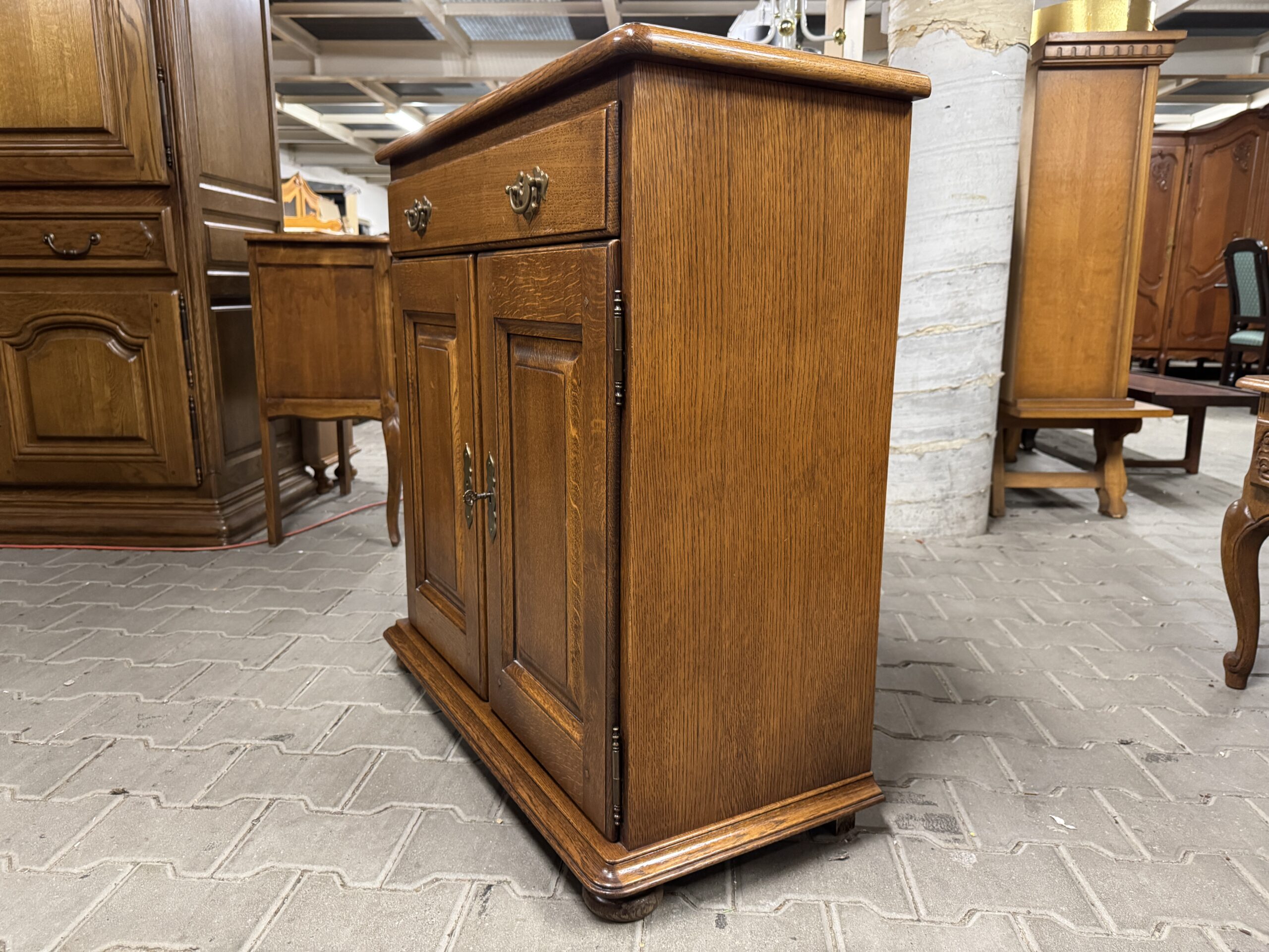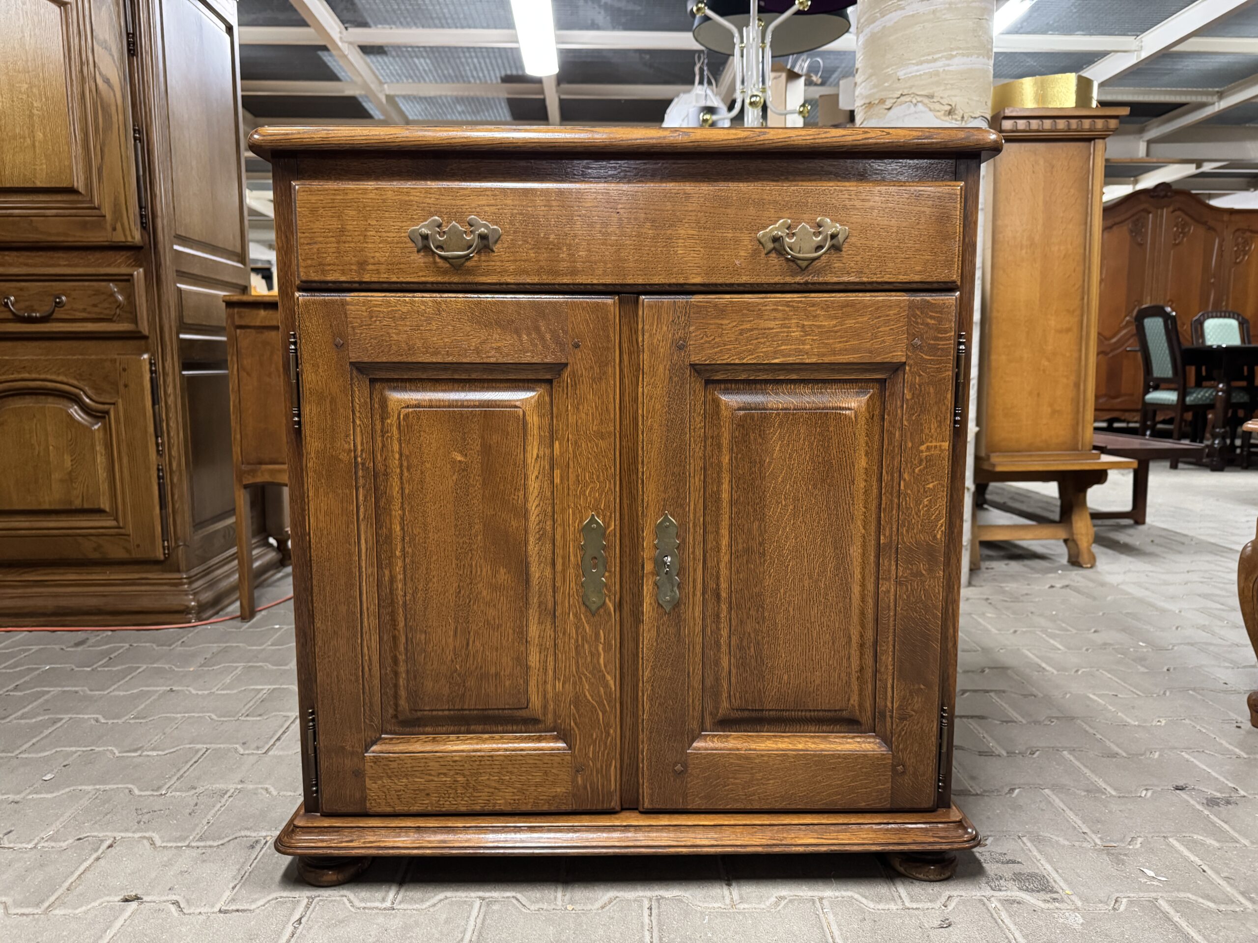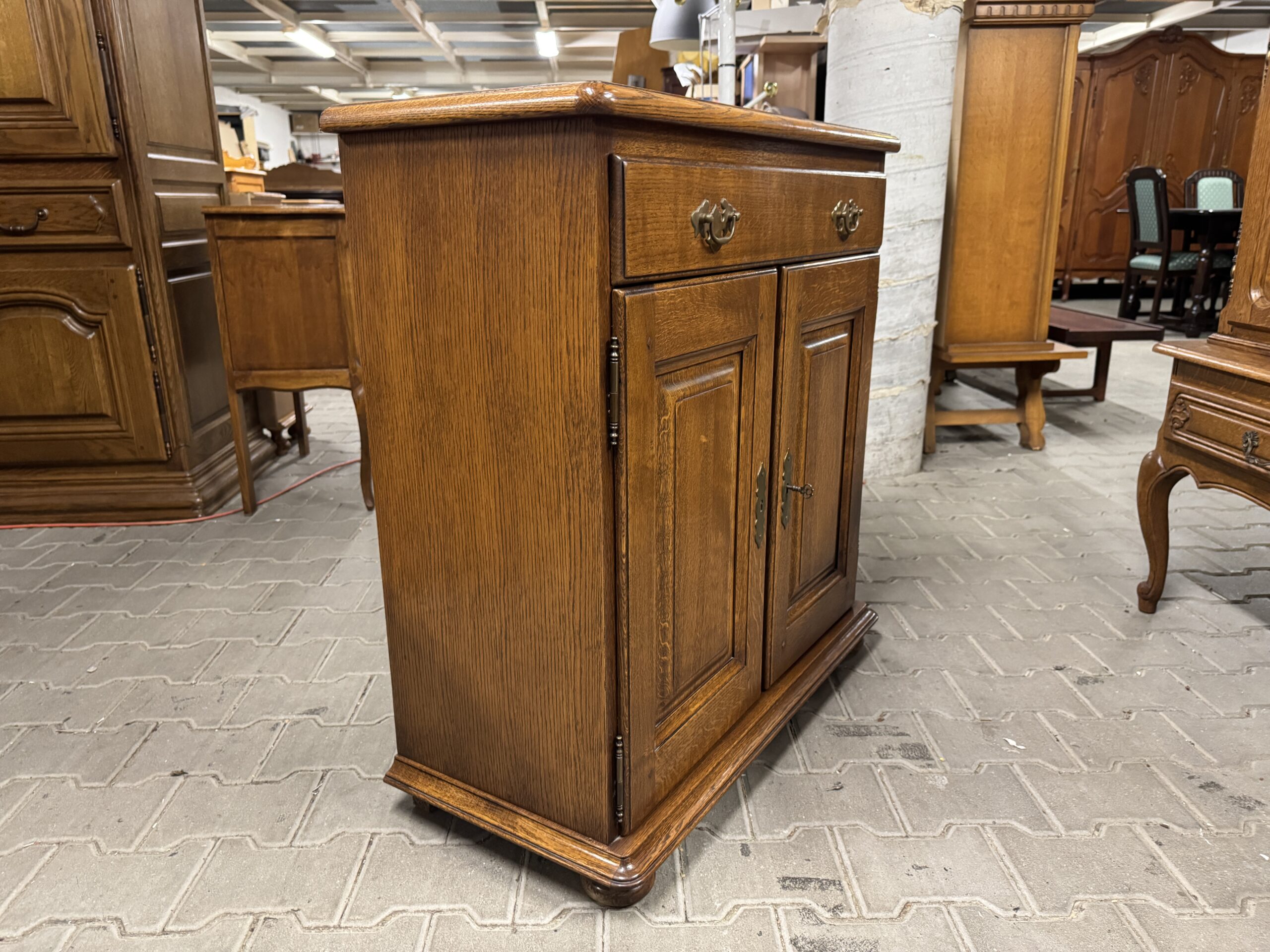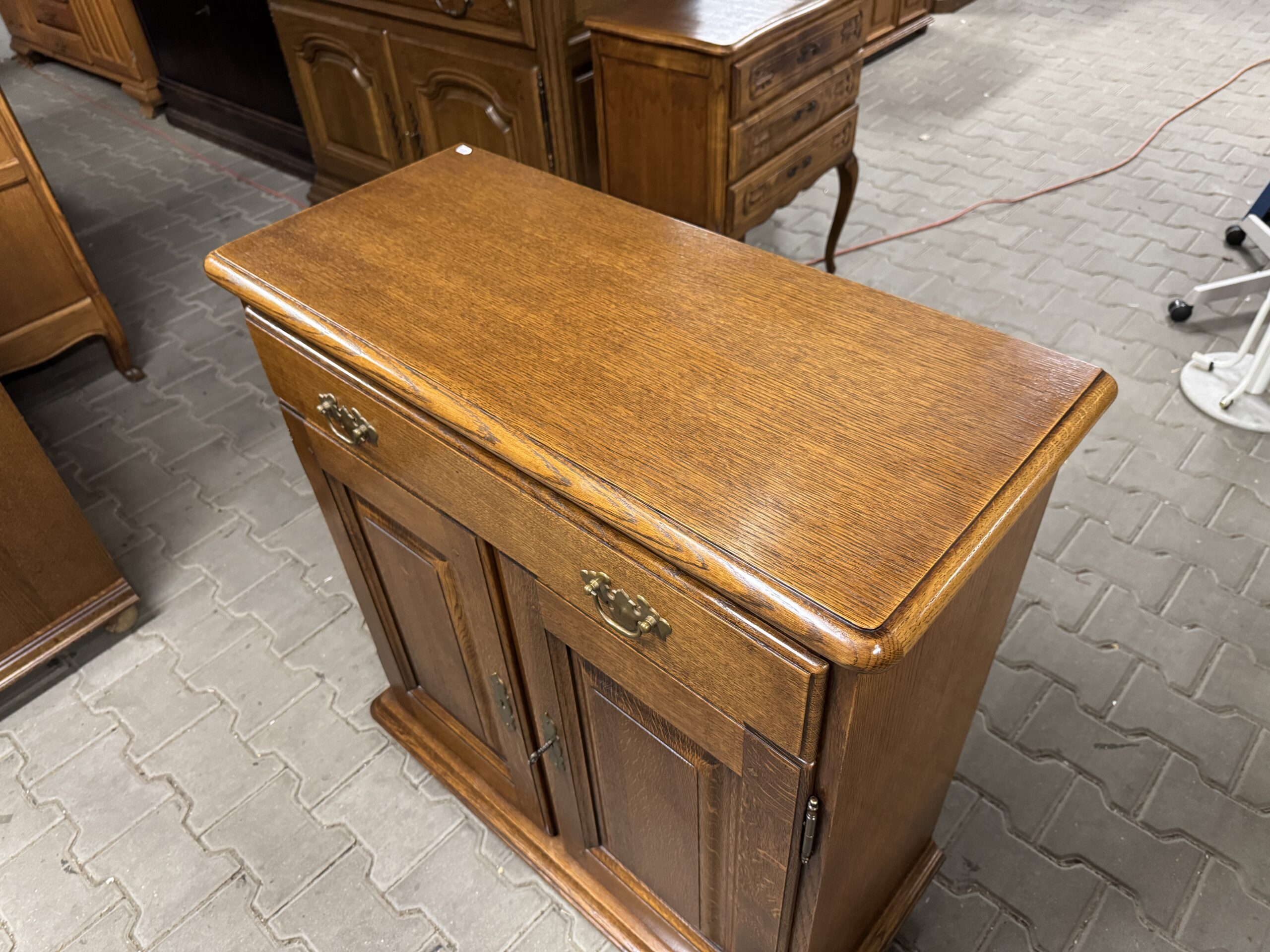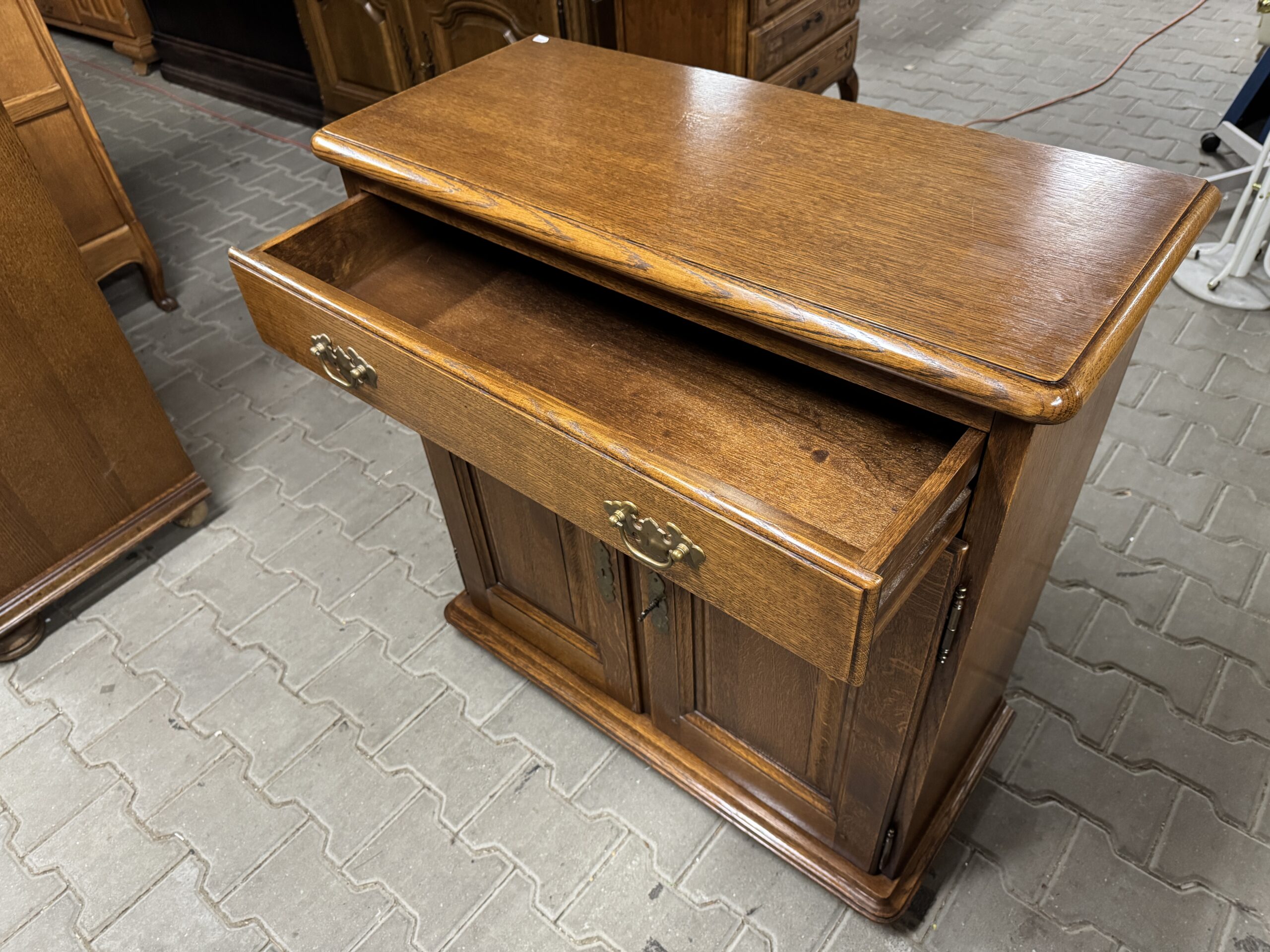 Komoda robiona z drewna dębowego w ciemnym kolorze.