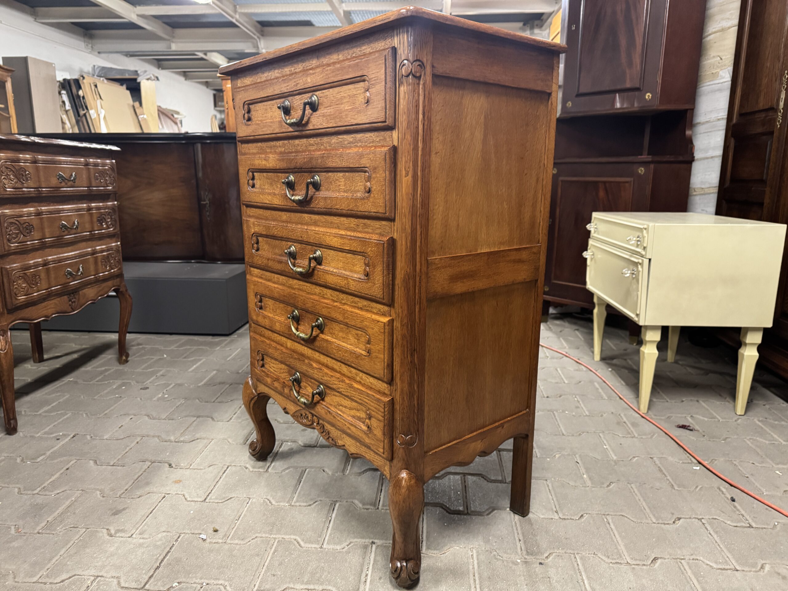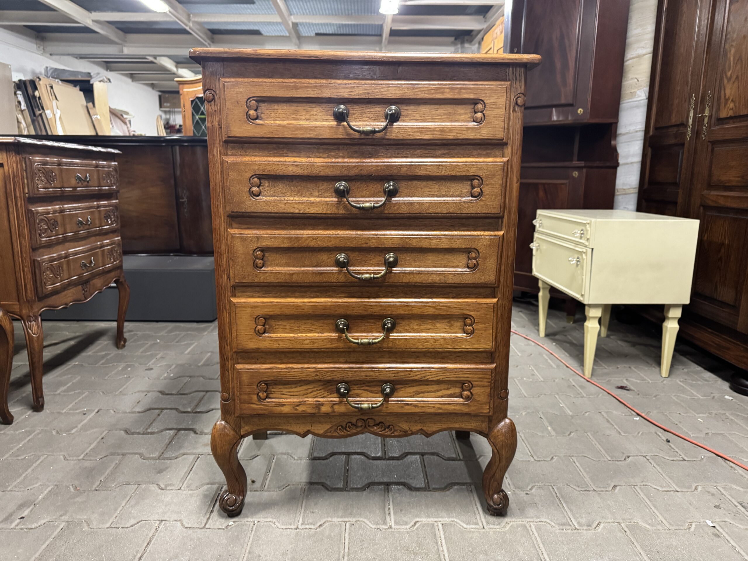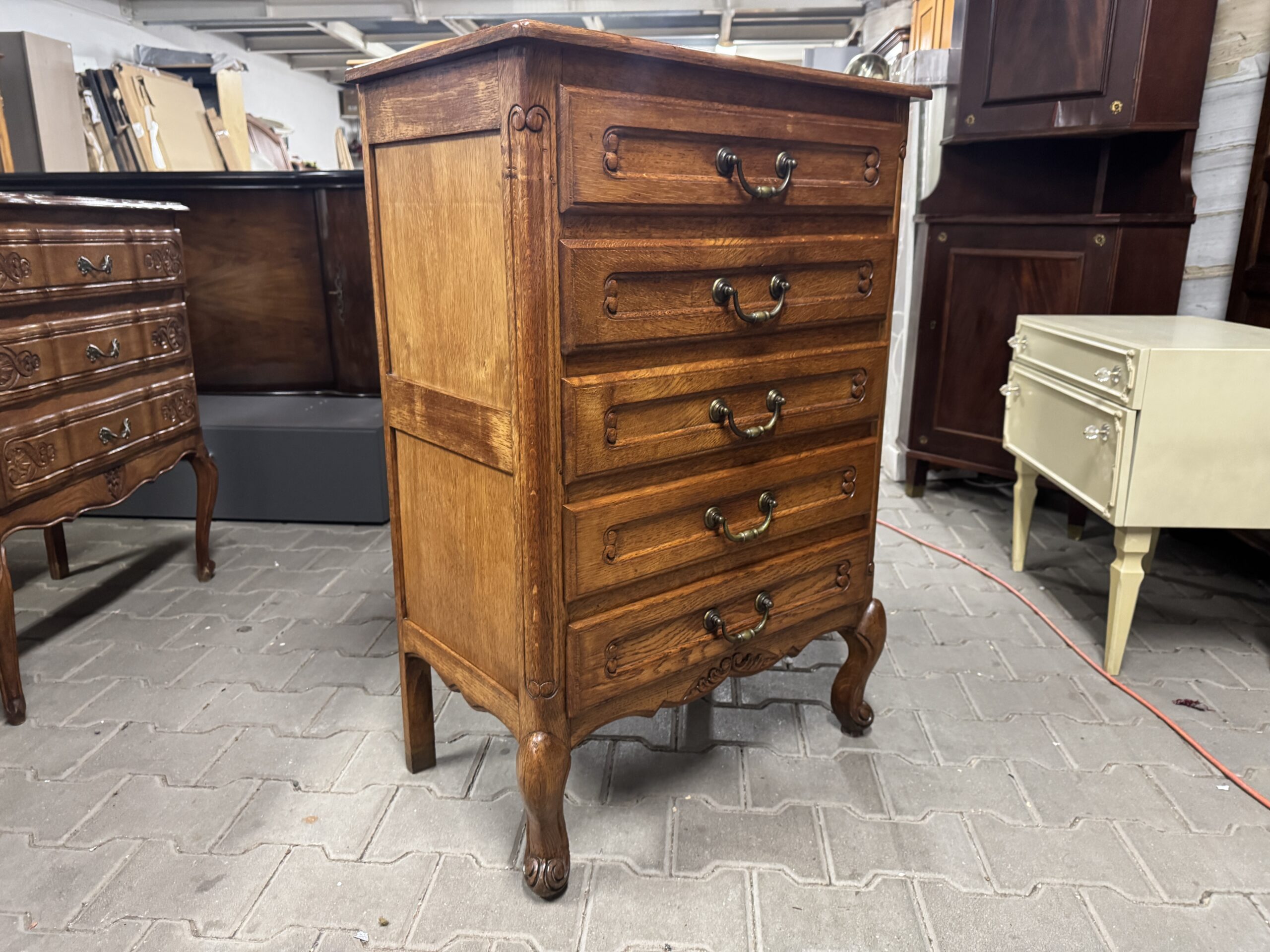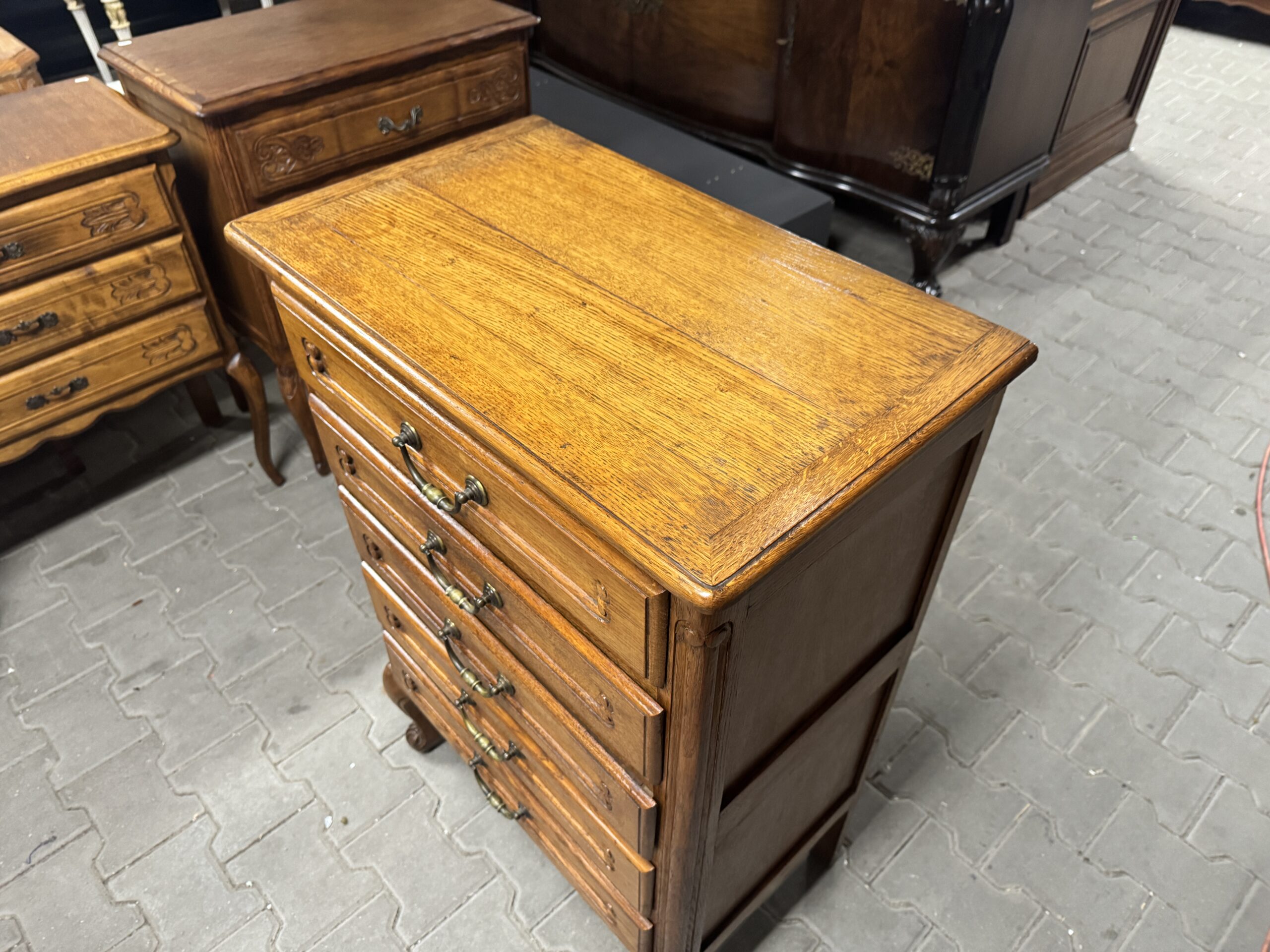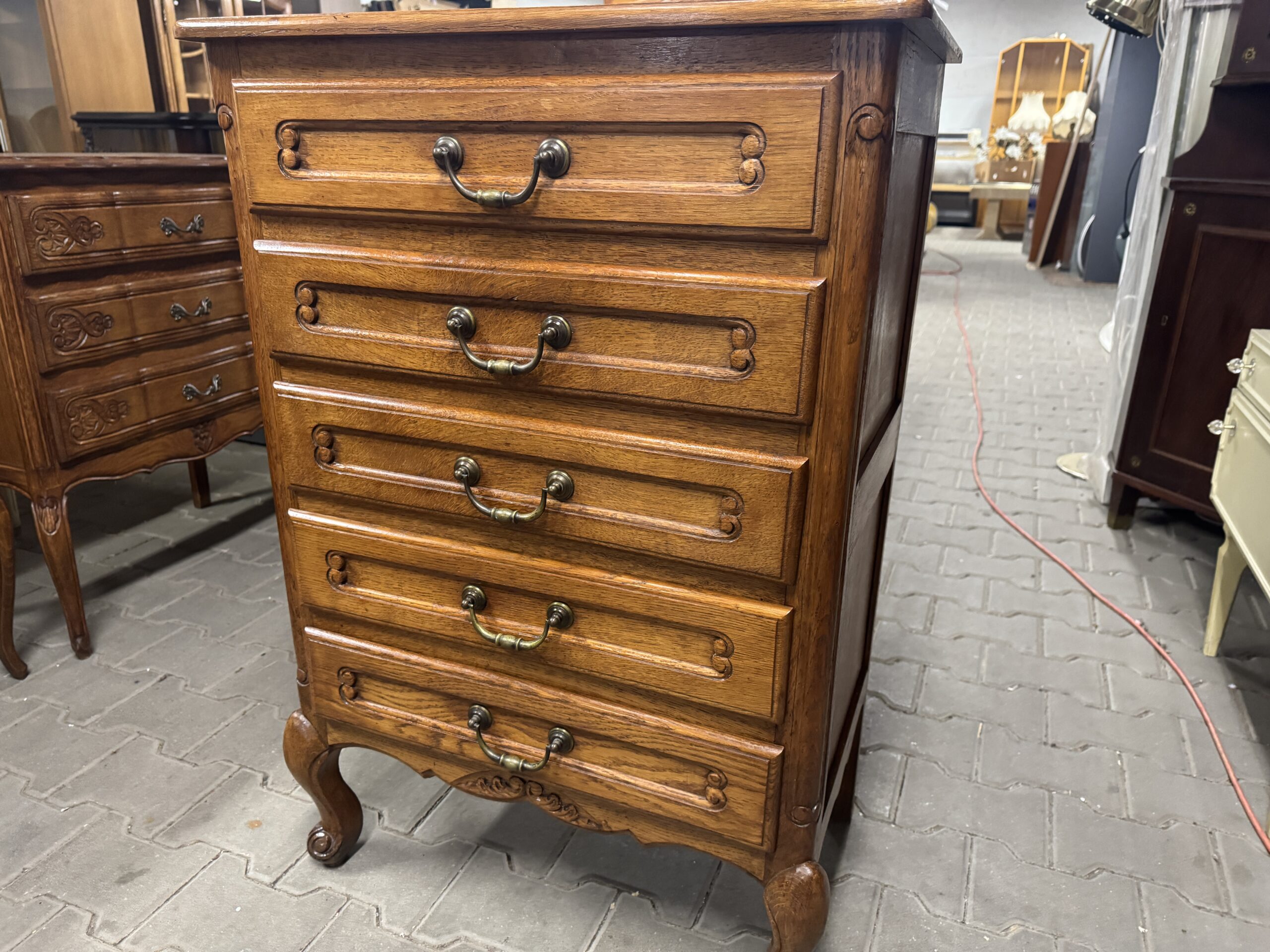 Oryginalna drewniana komoda na pięć szuflad w stylu ludwikowskim.