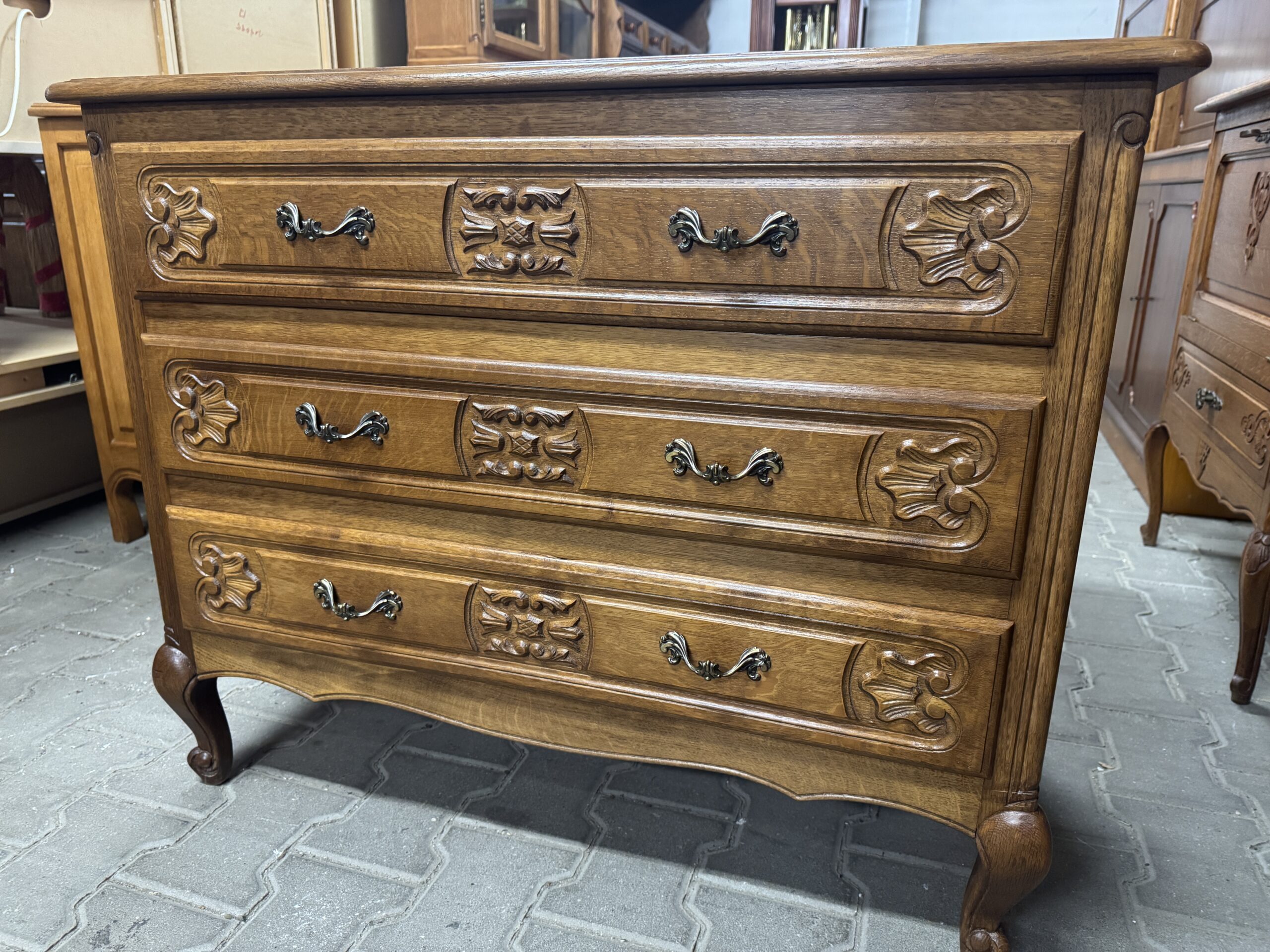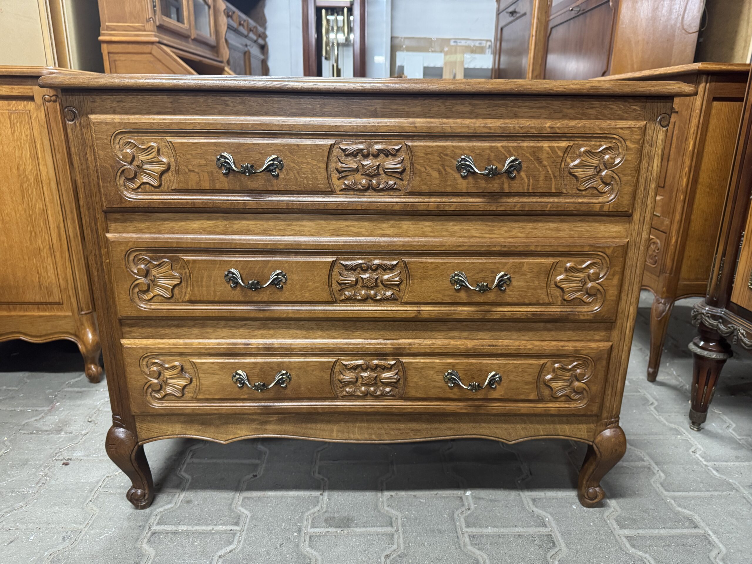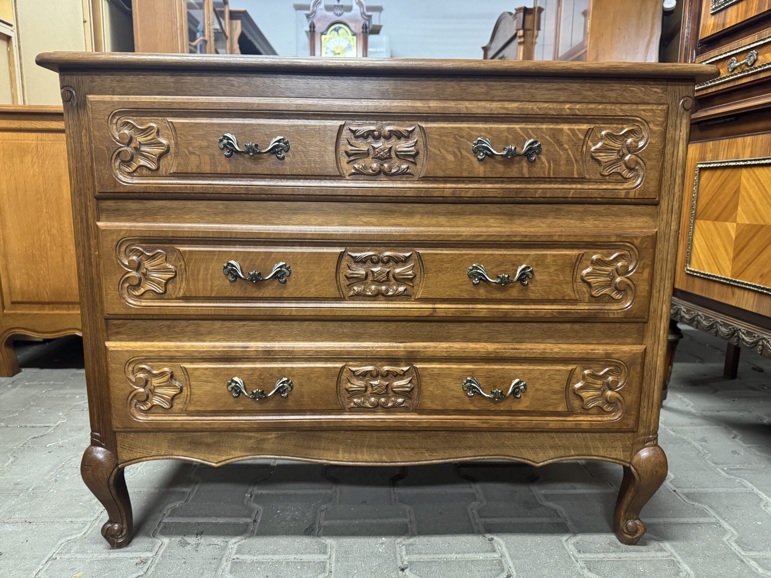 Piękne ozdobne rzeźbienia oraz mosiężne okucia tworzą wyjątkowy wystrój mebla.