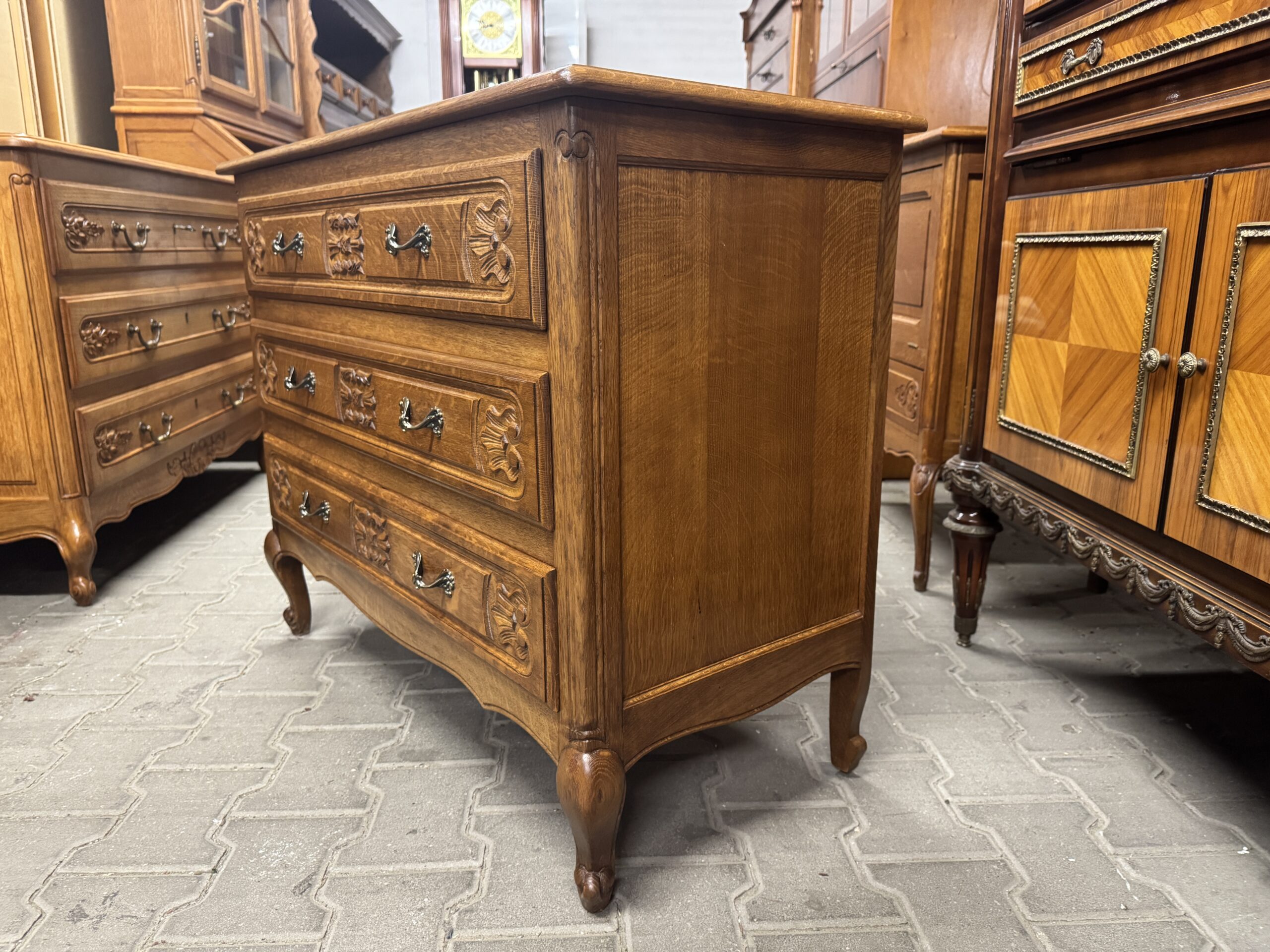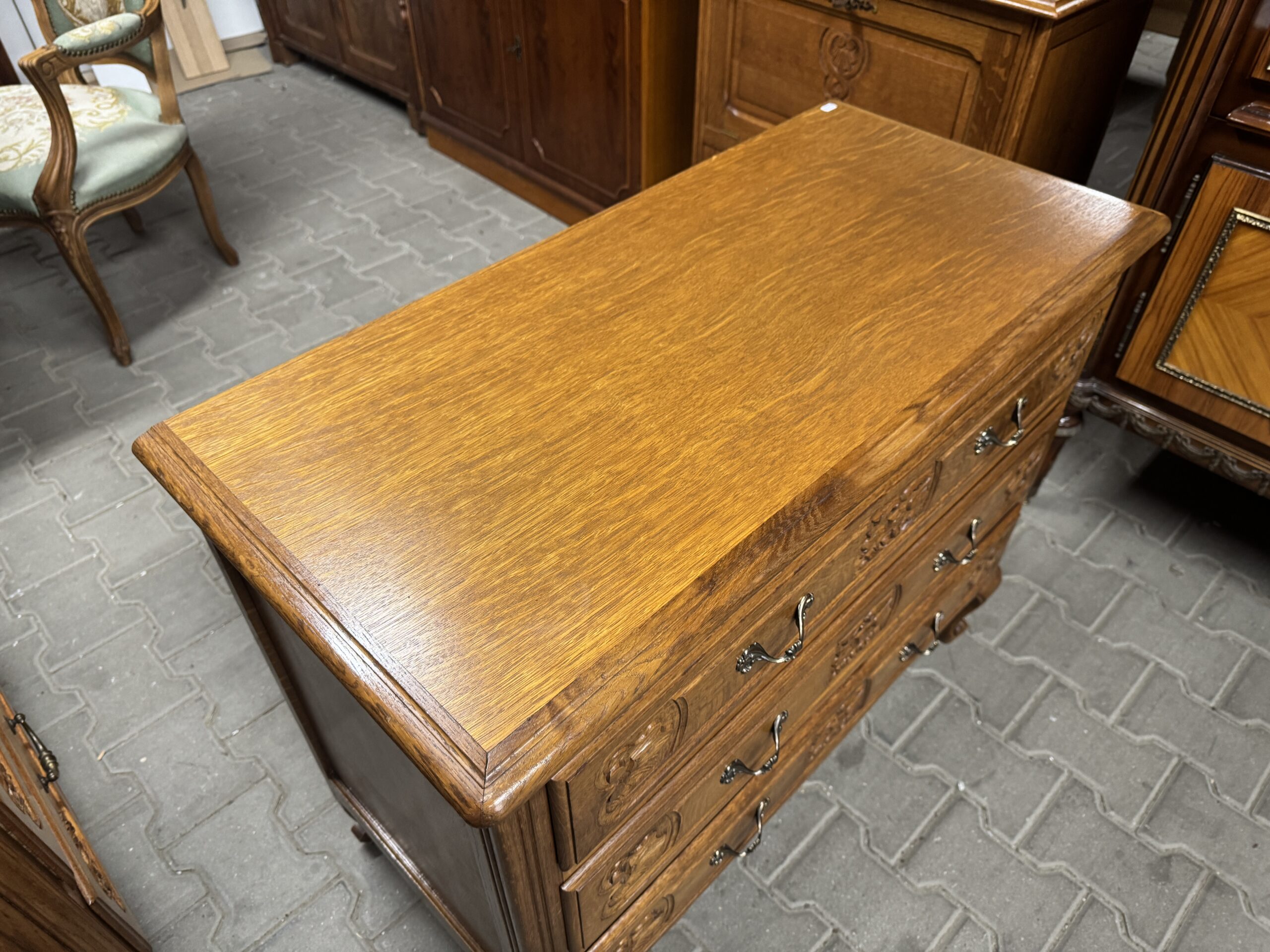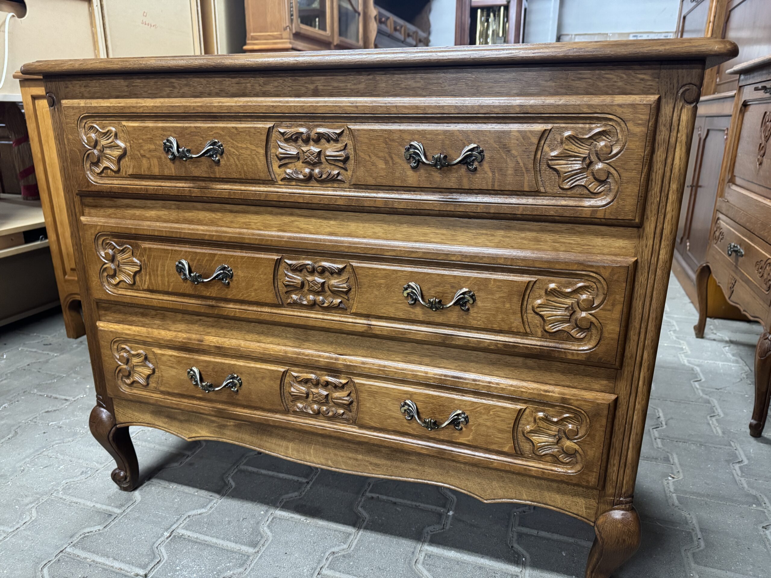 Piękne ozdobne rzeźbienia oraz mosiężne okucia tworzą wyjątkowy wystrój mebla.
