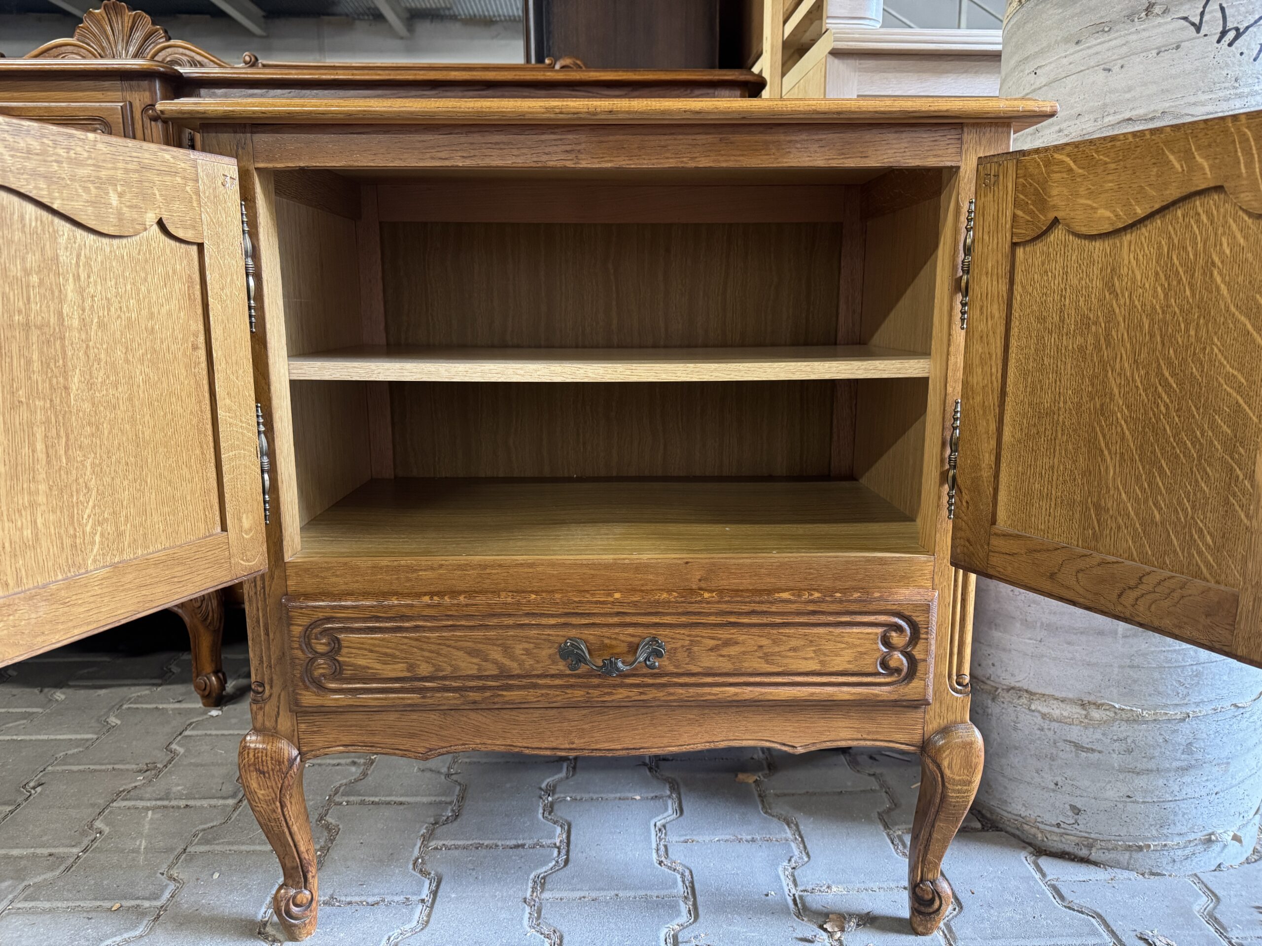 Szafka wyposażona w półki oraz szufladę na dole.