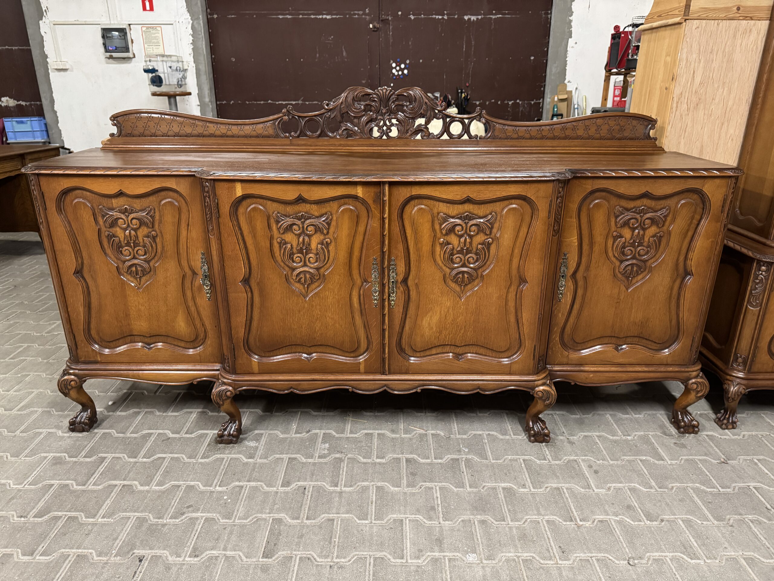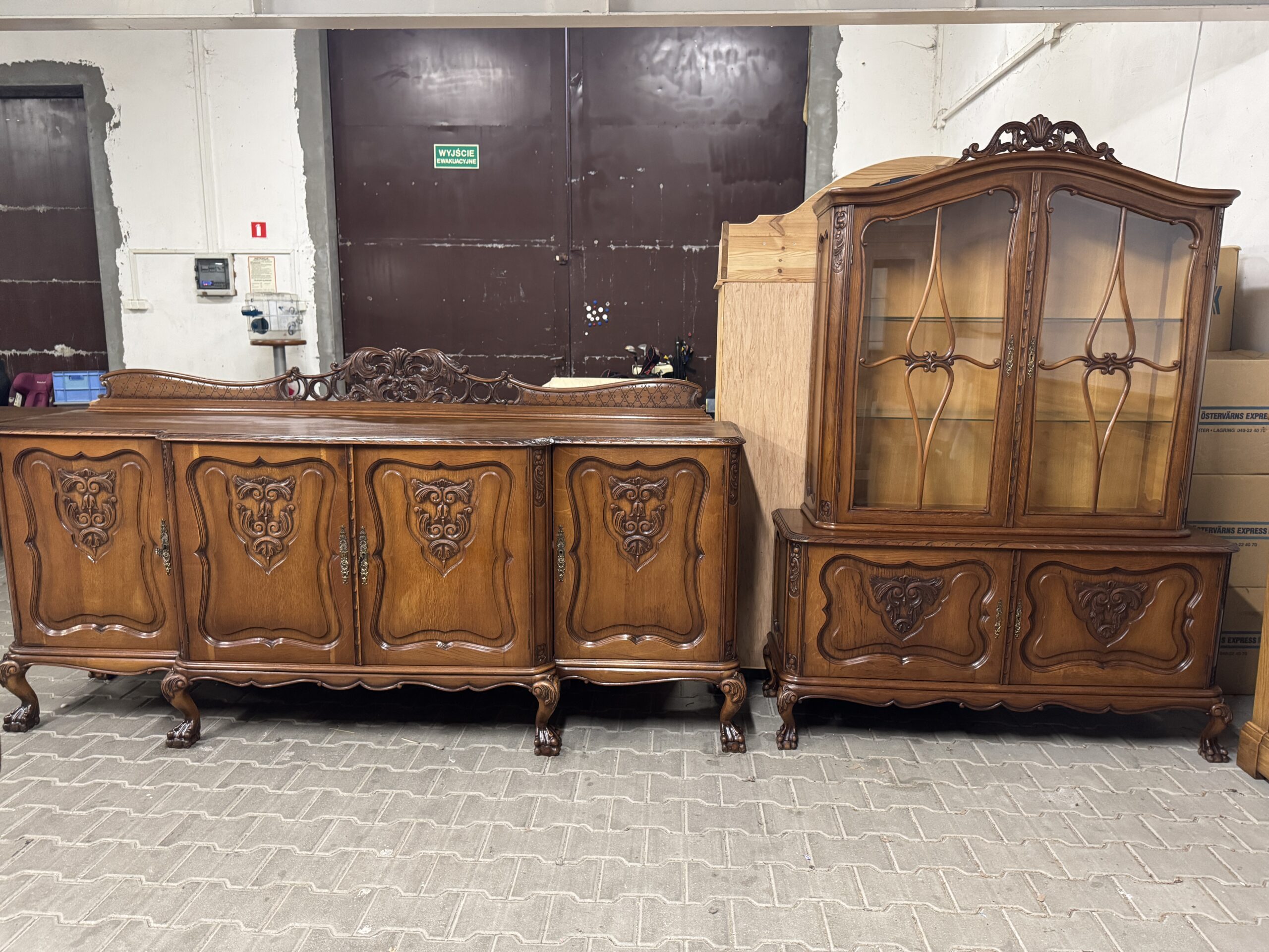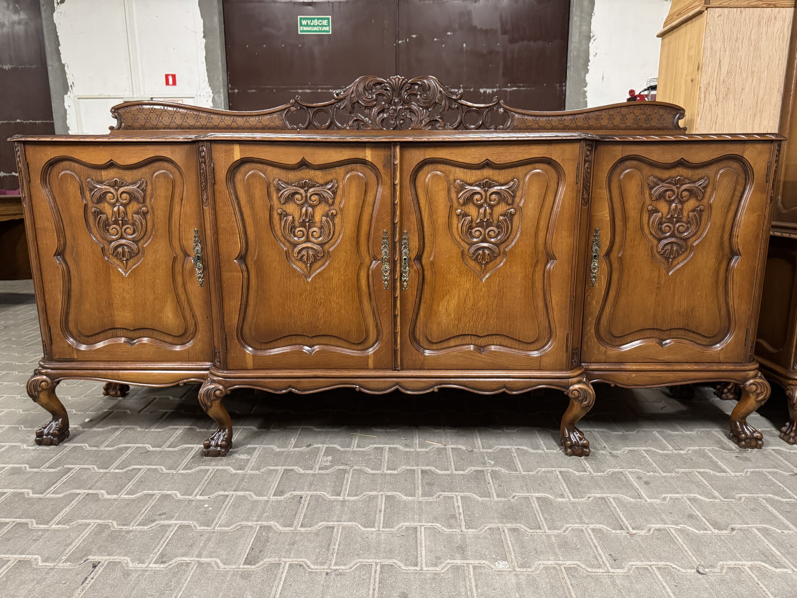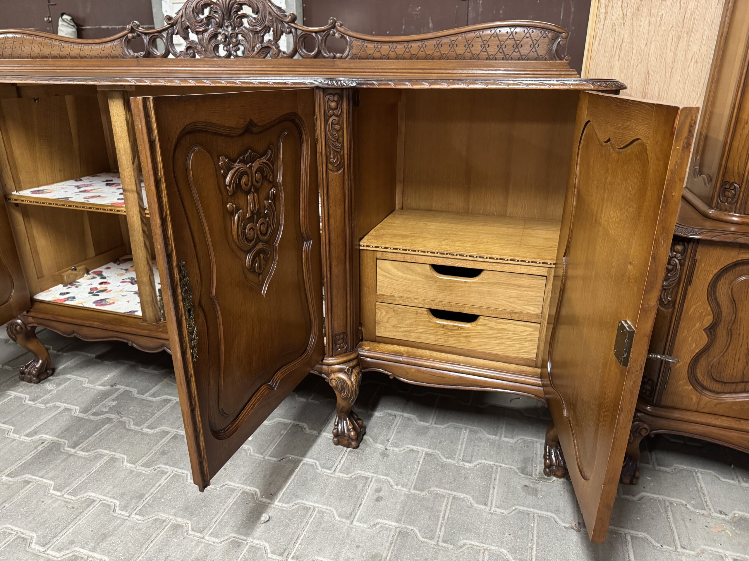 Cudowne ozdobne rzeźbienia oraz piękna korona szczegółowo wyróżniają mebel.