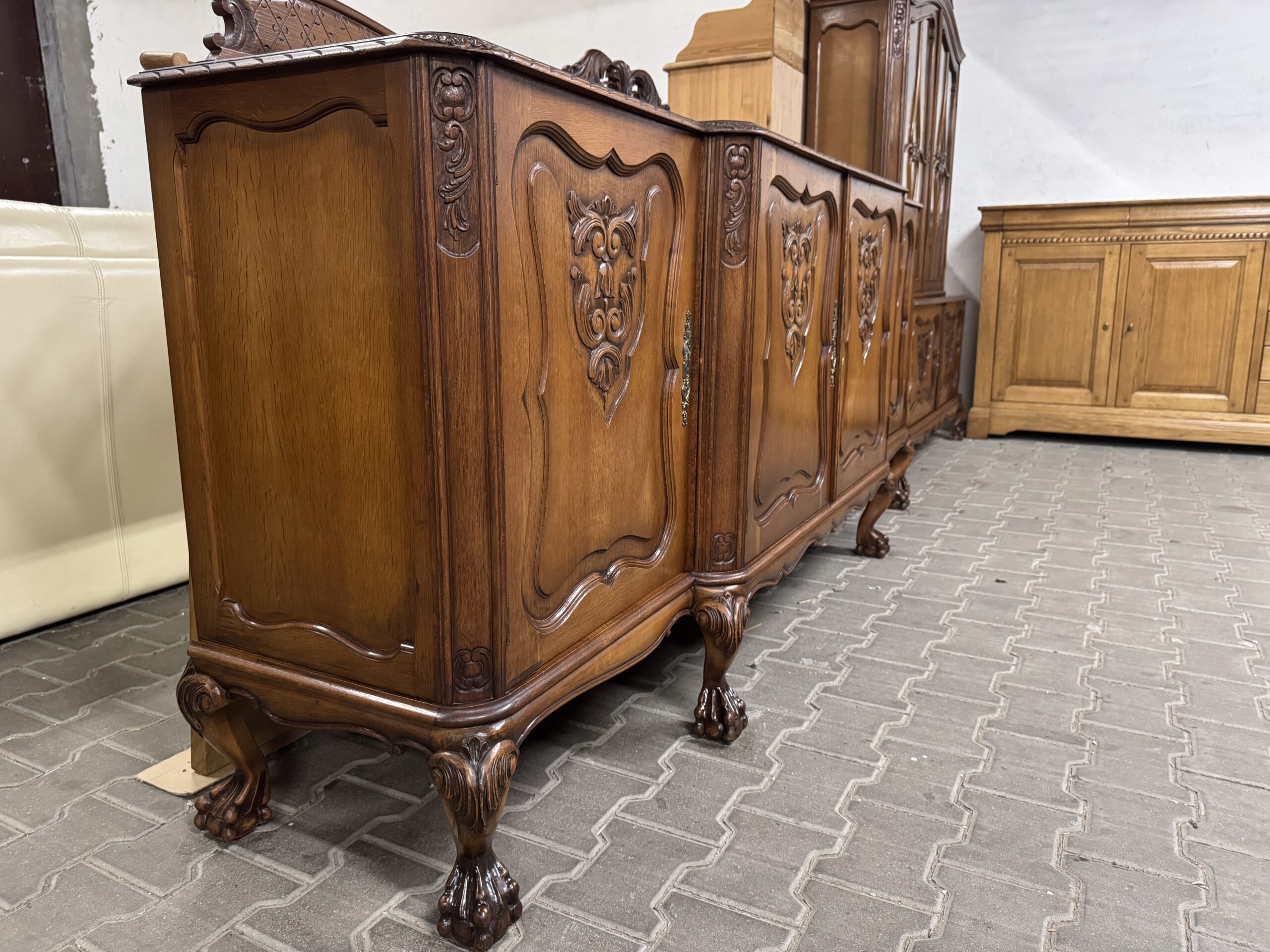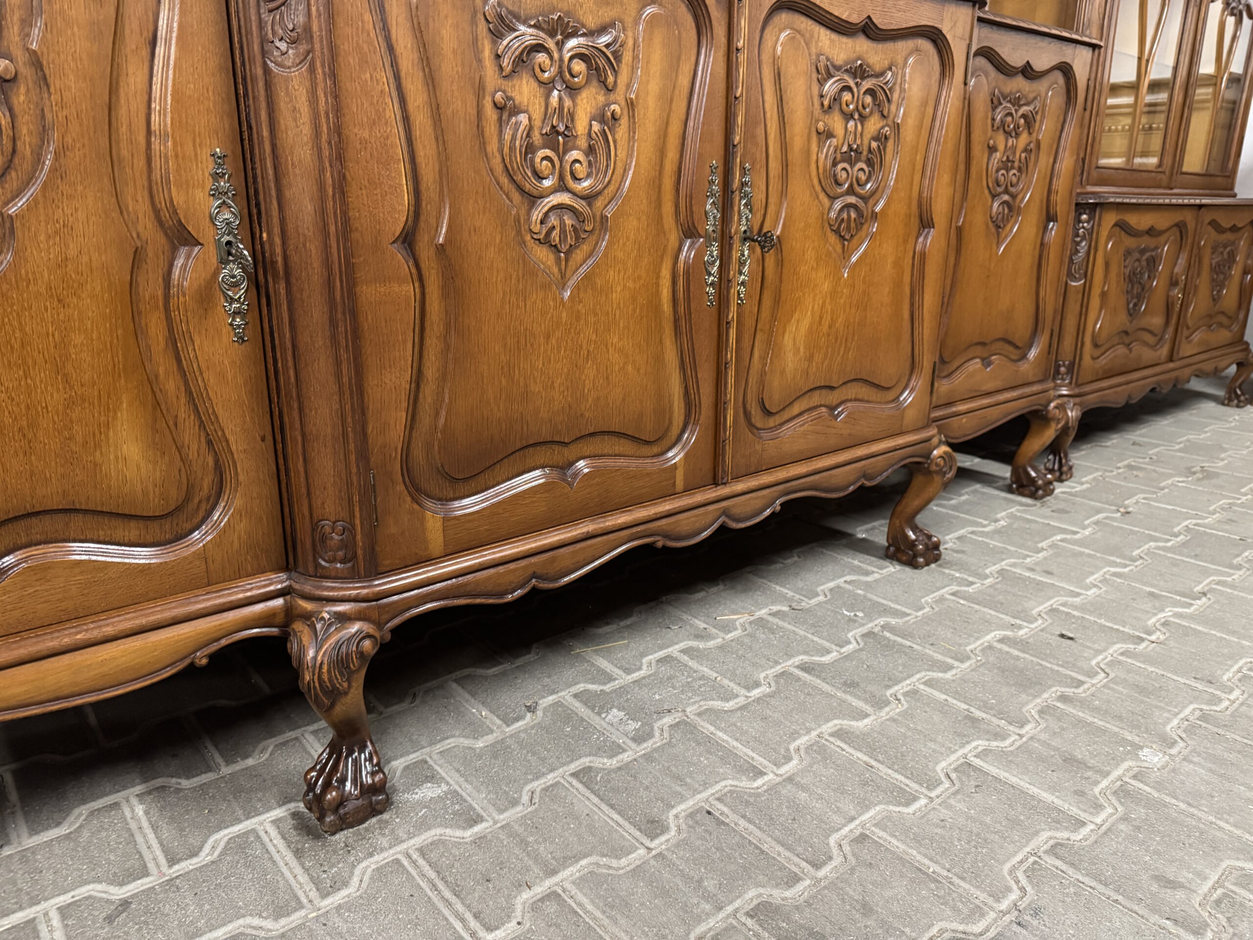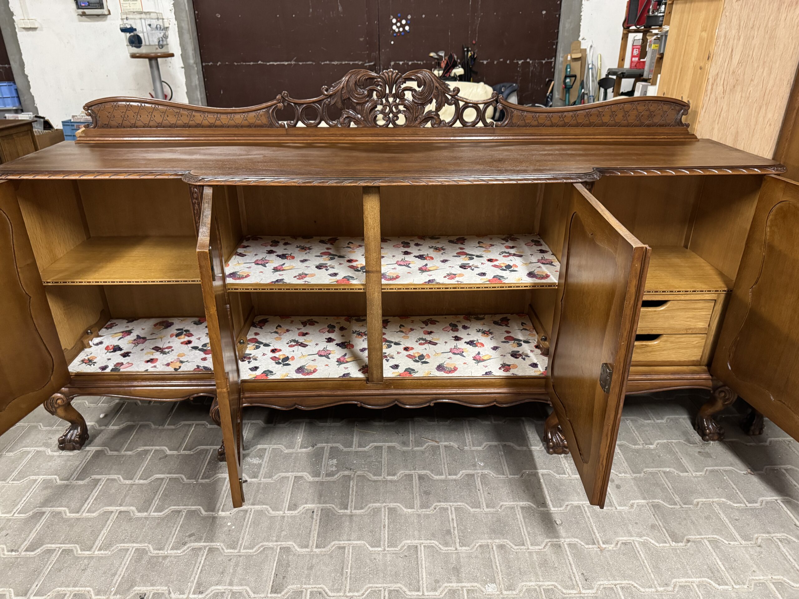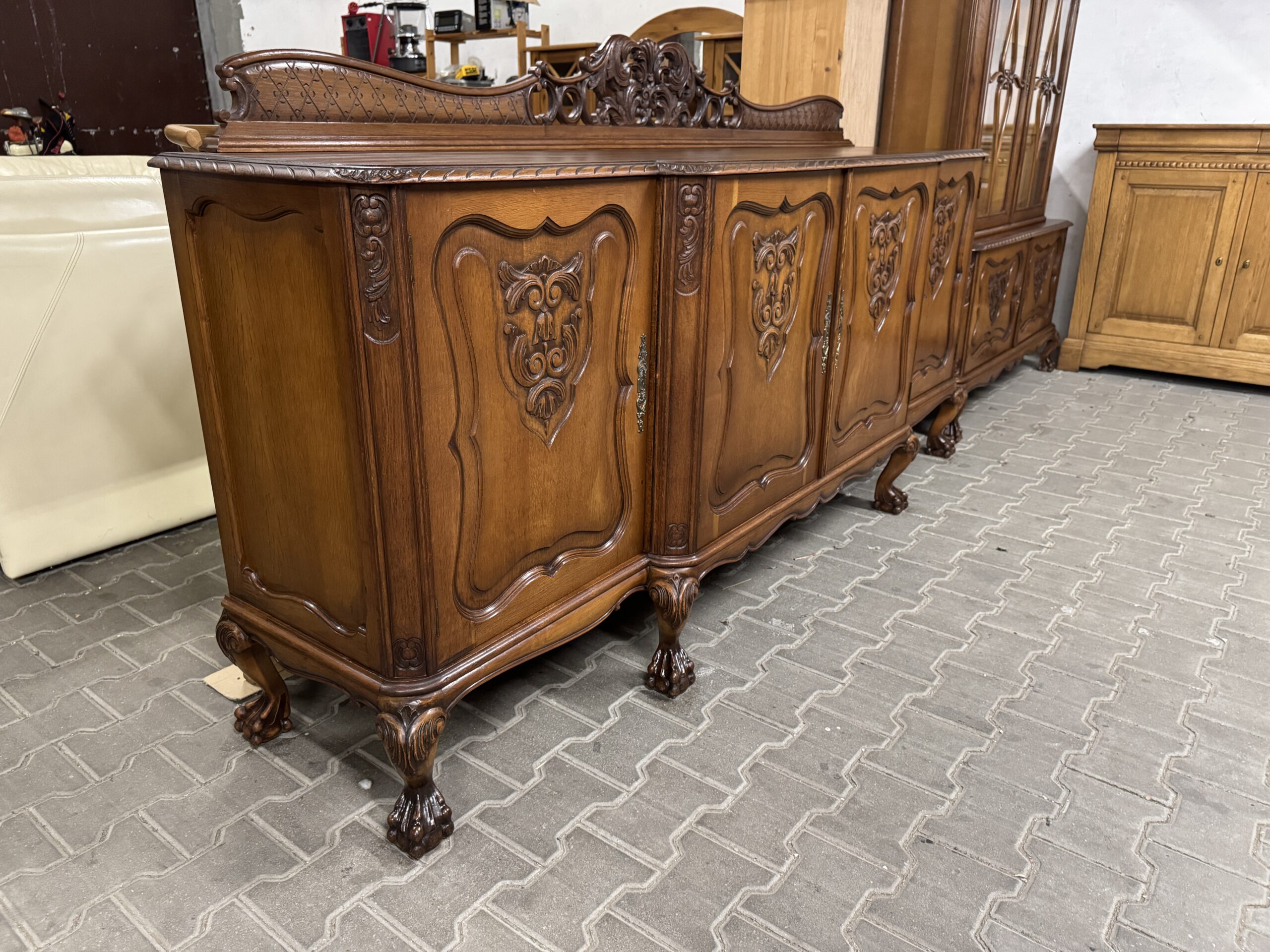 Cudowne ozdobne rzeźbienia oraz piękna korona szczegółowo wyróżniają mebel.