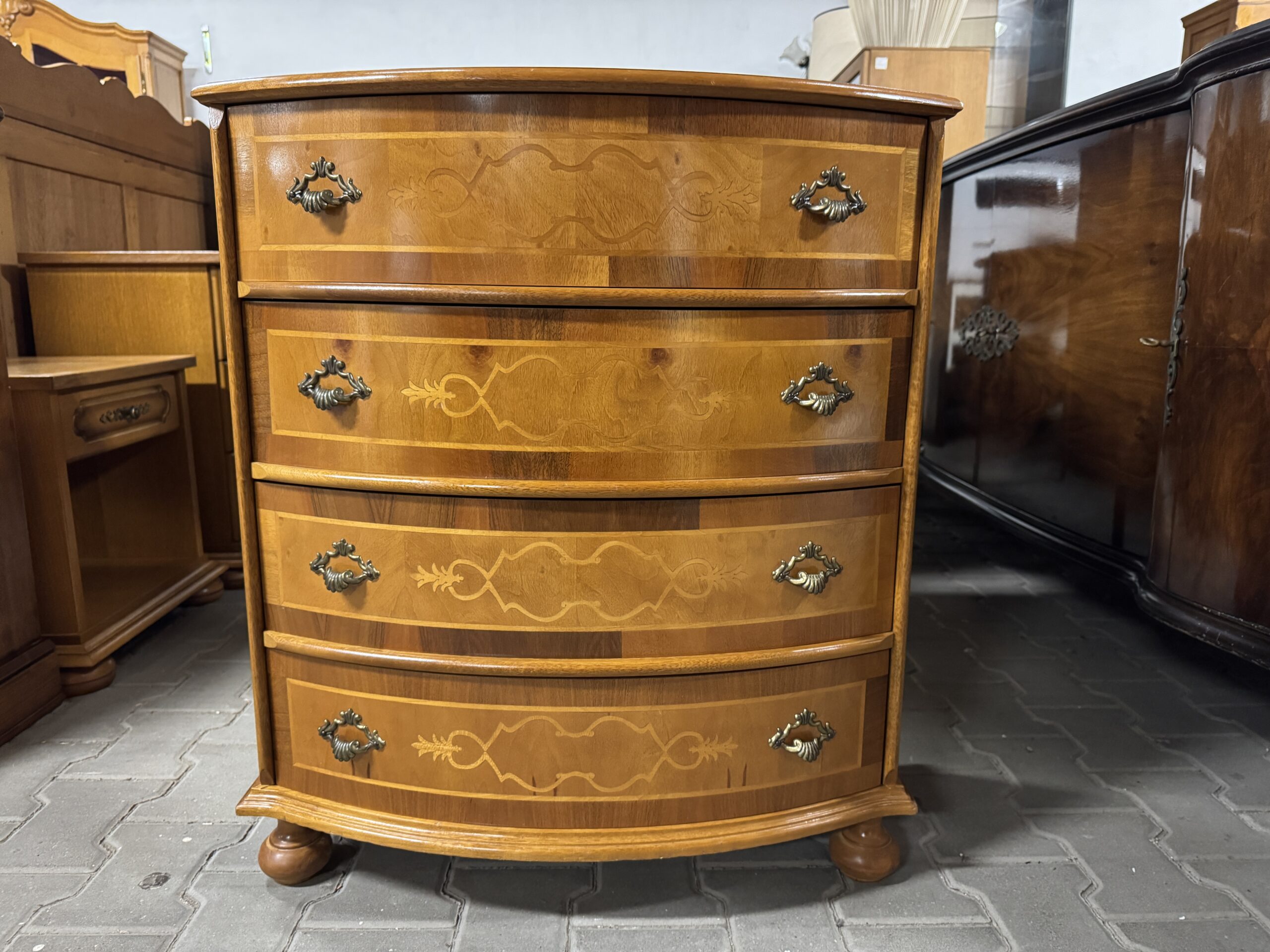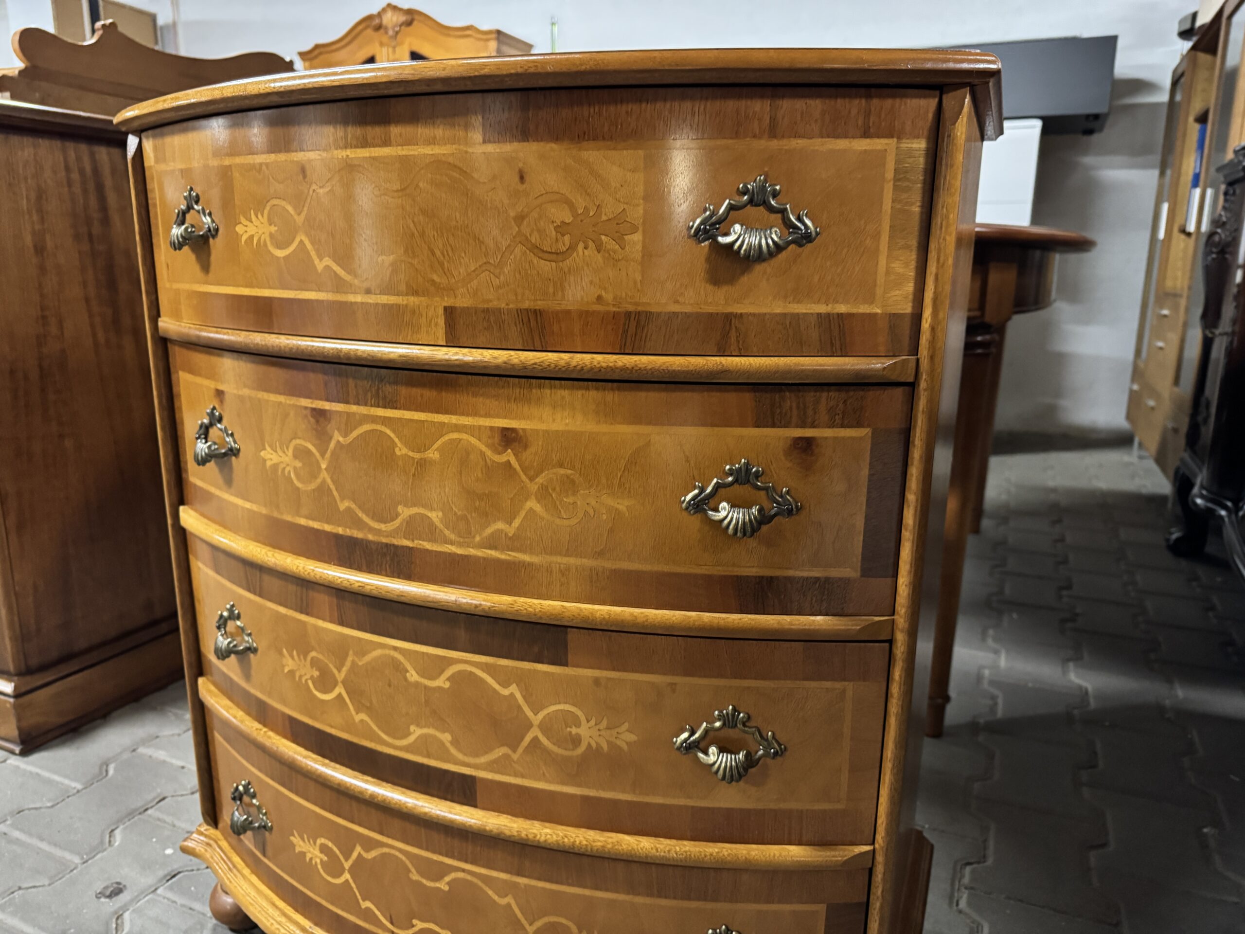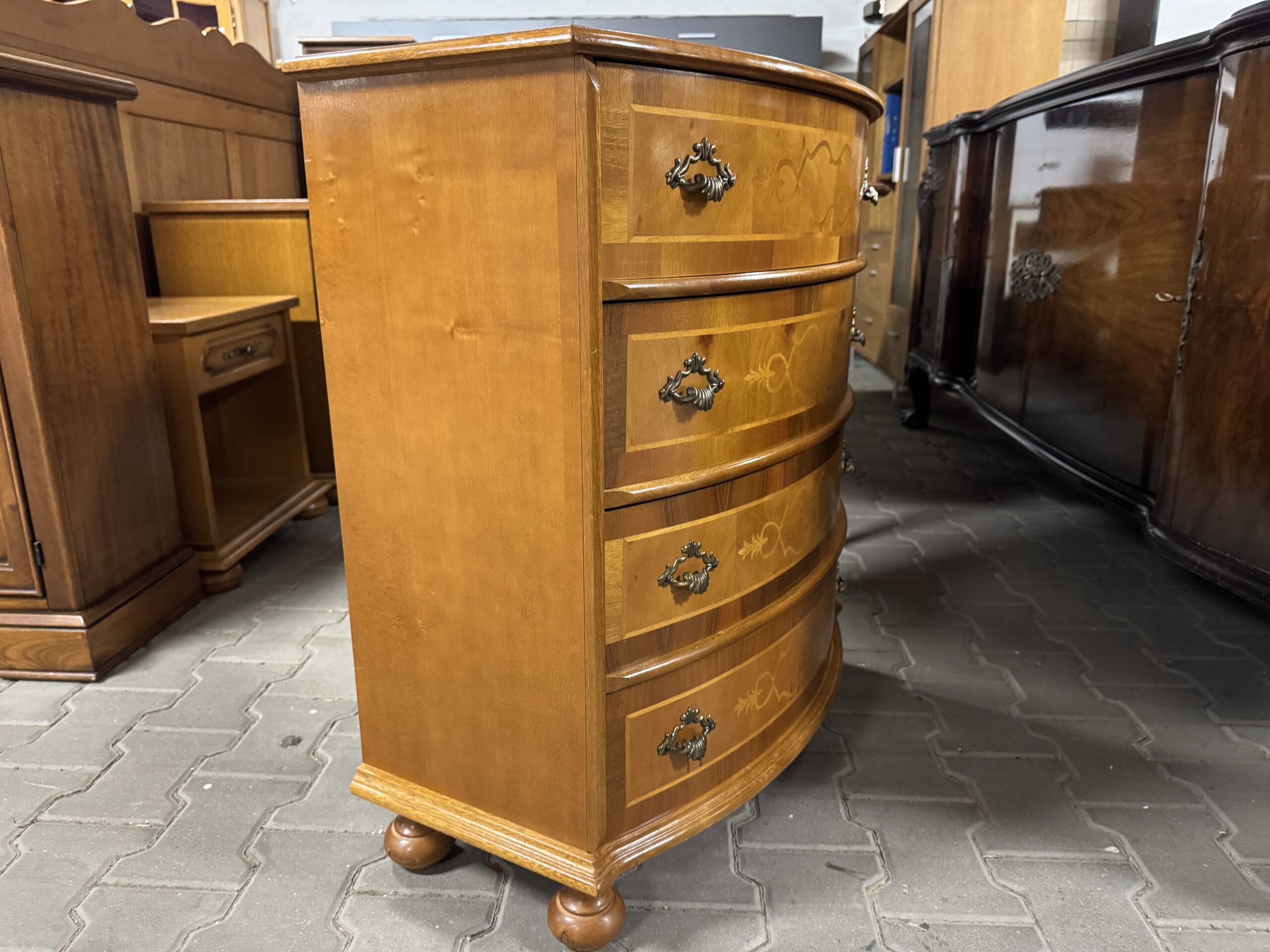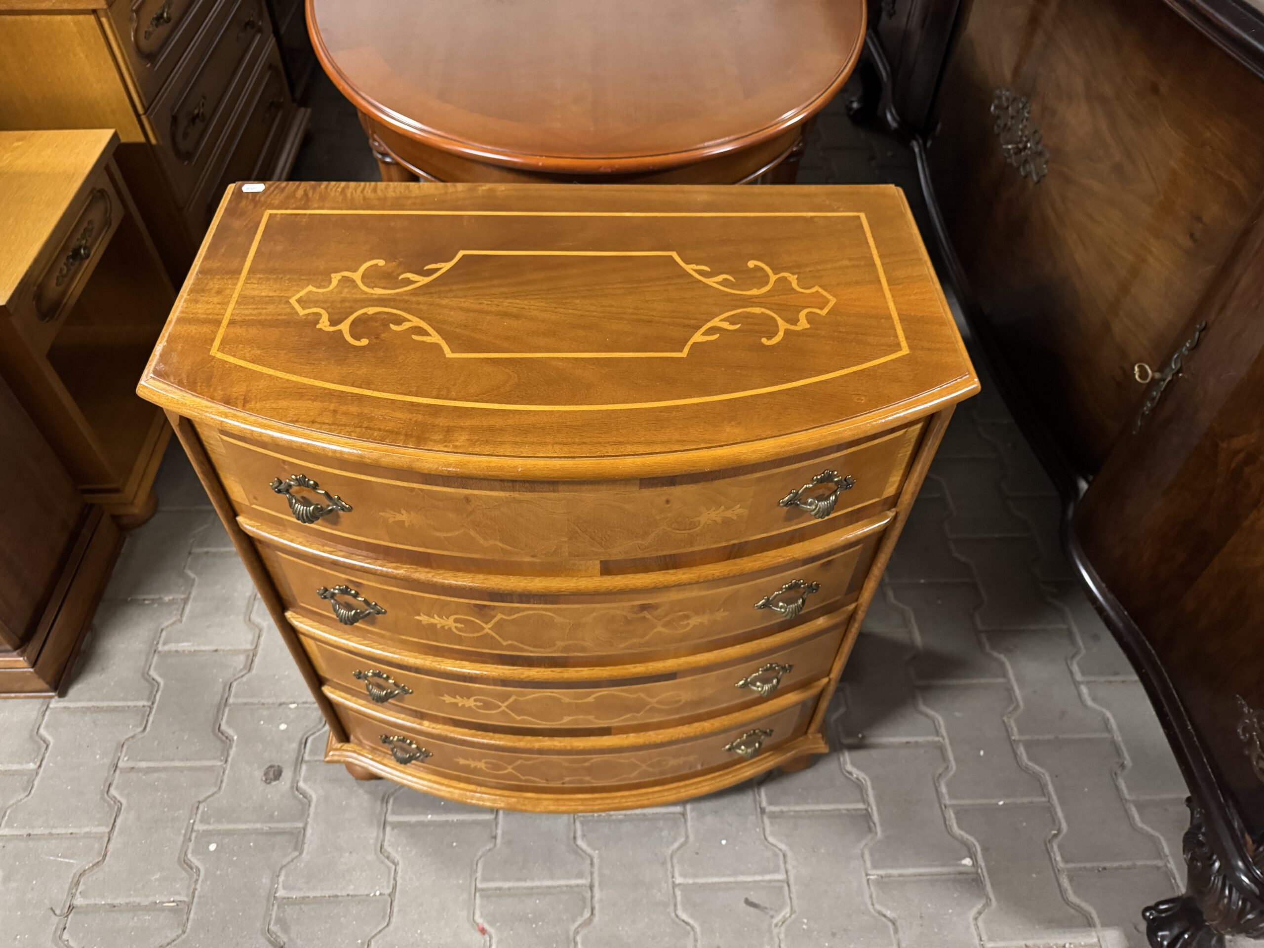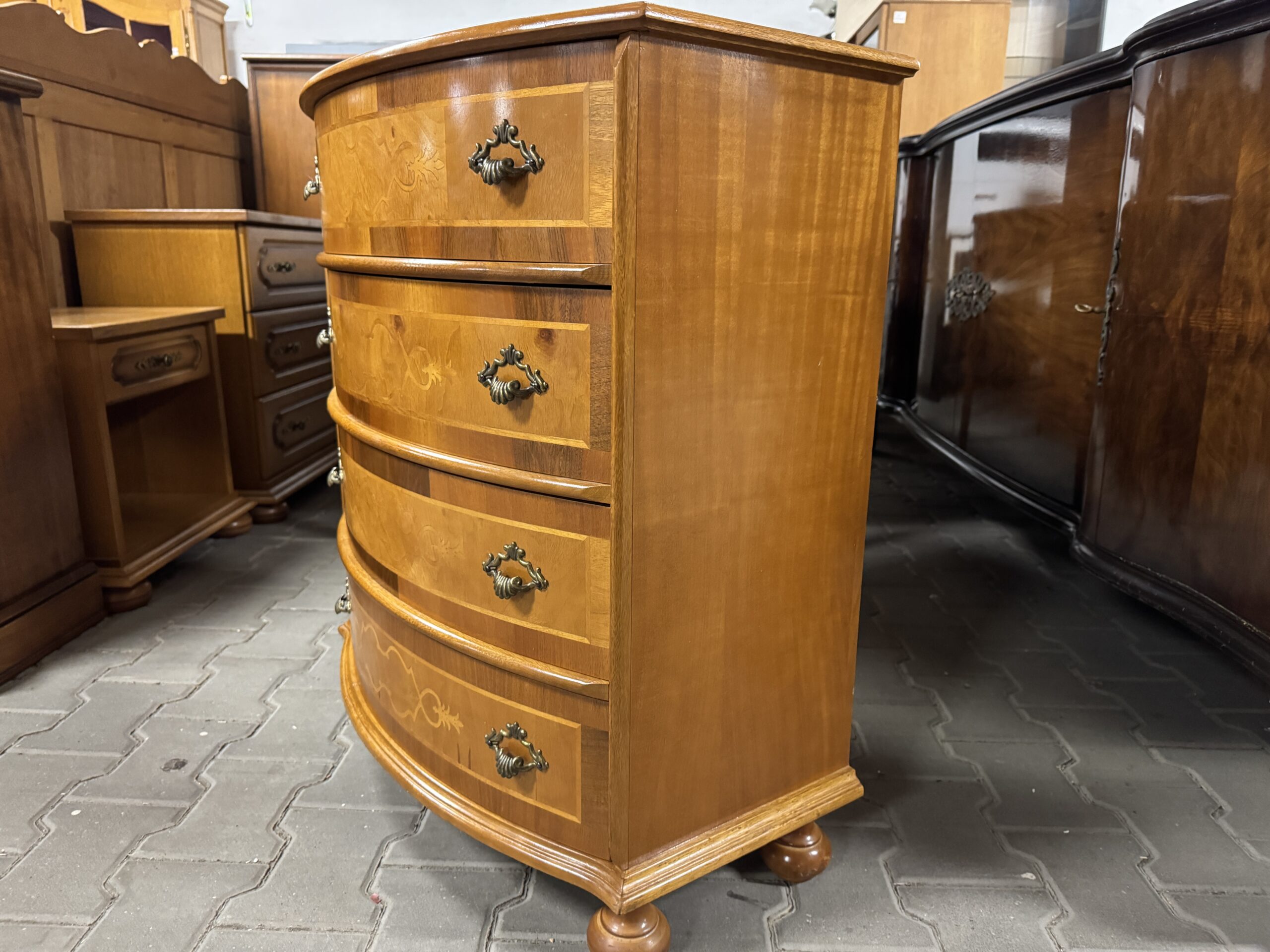 Oryginalne mosiężne okucia wraz z cudowną intarsją tworzą wyjątkowy wystrój komody.