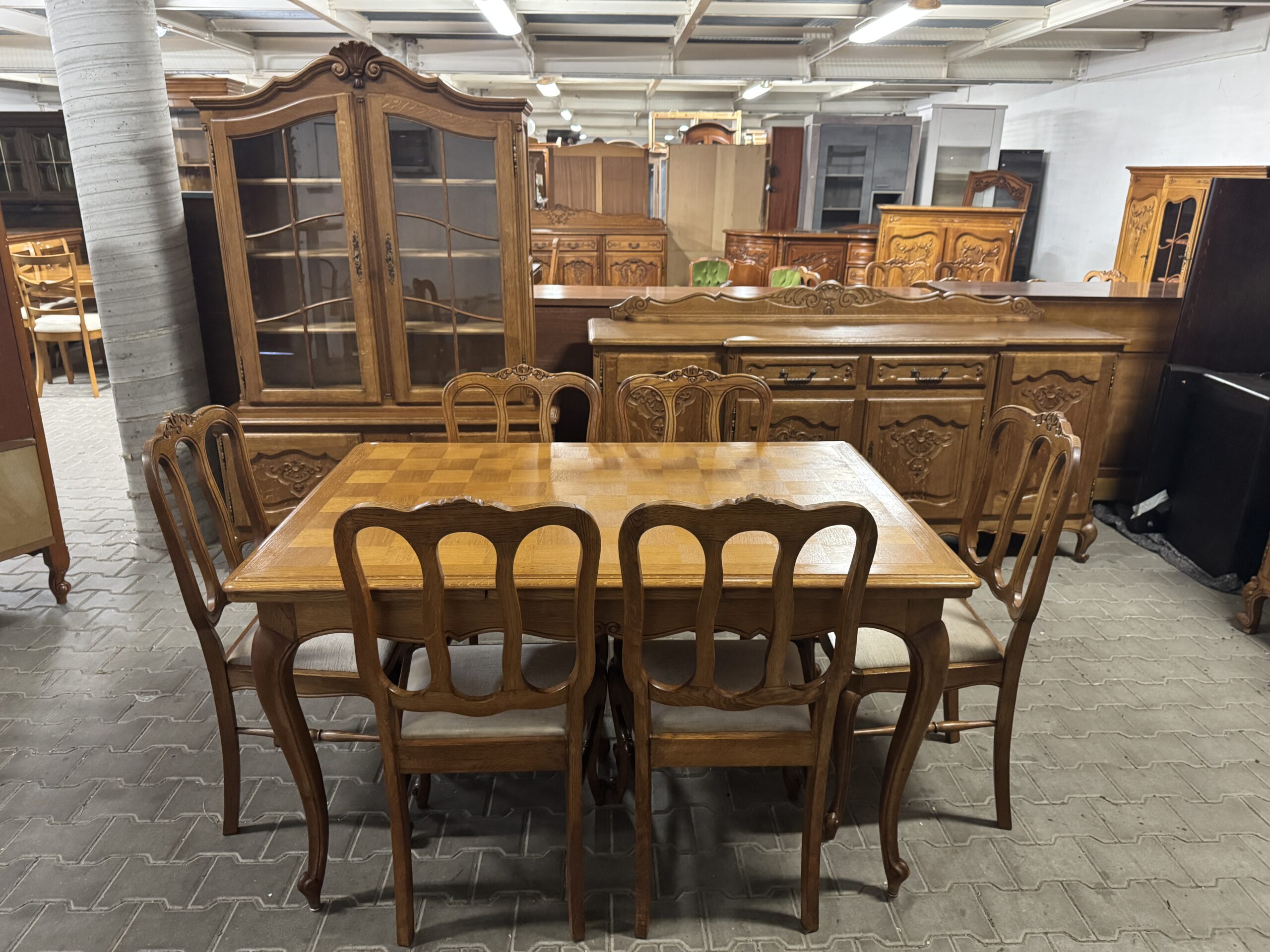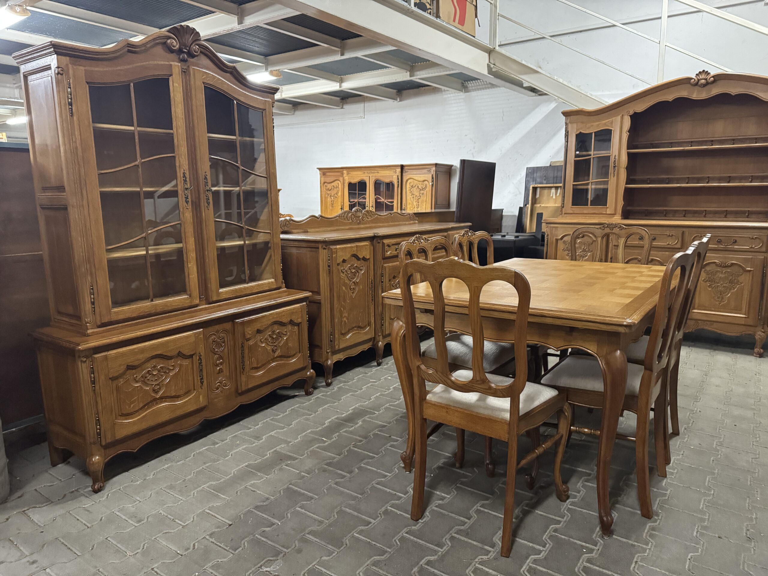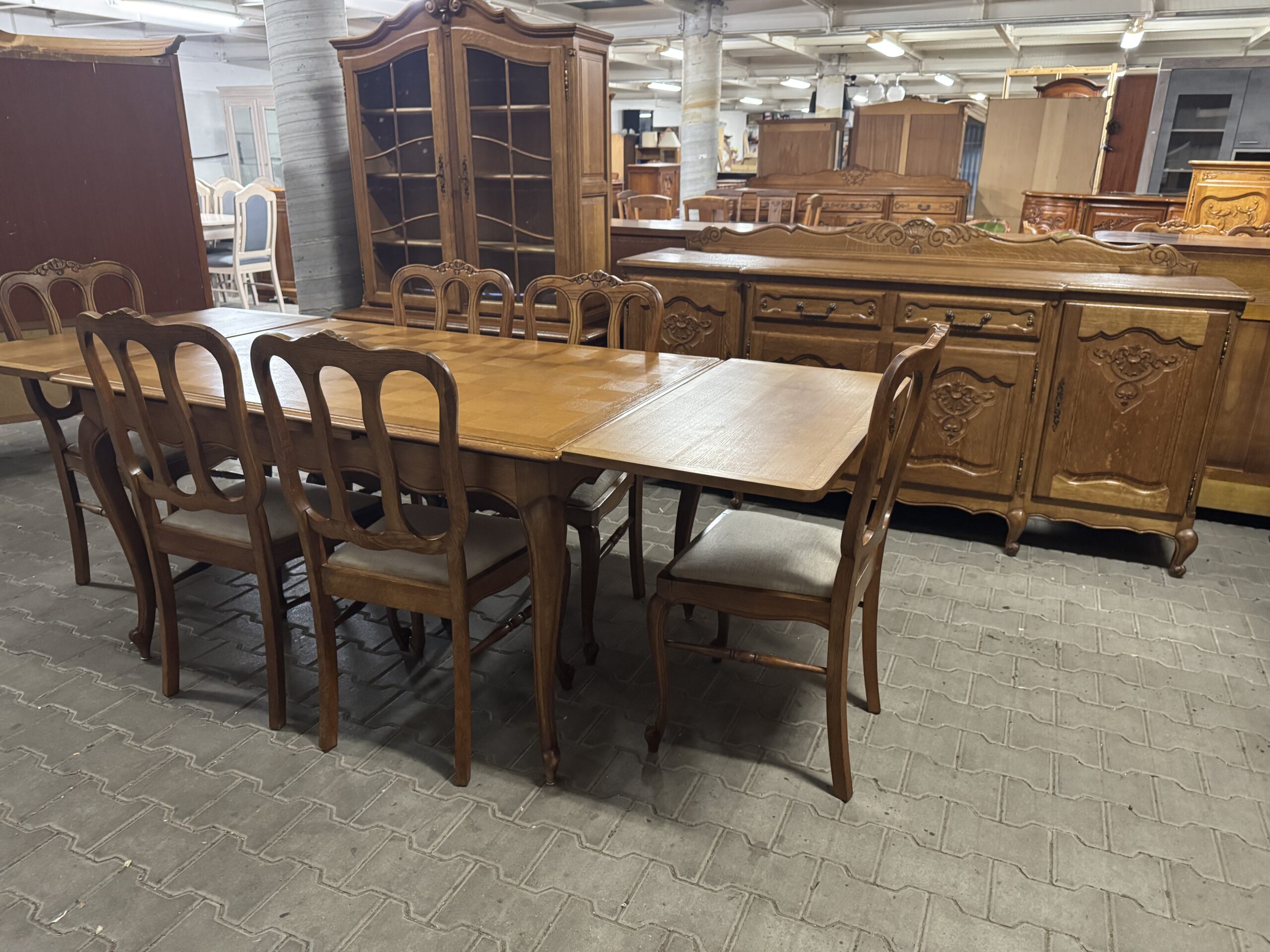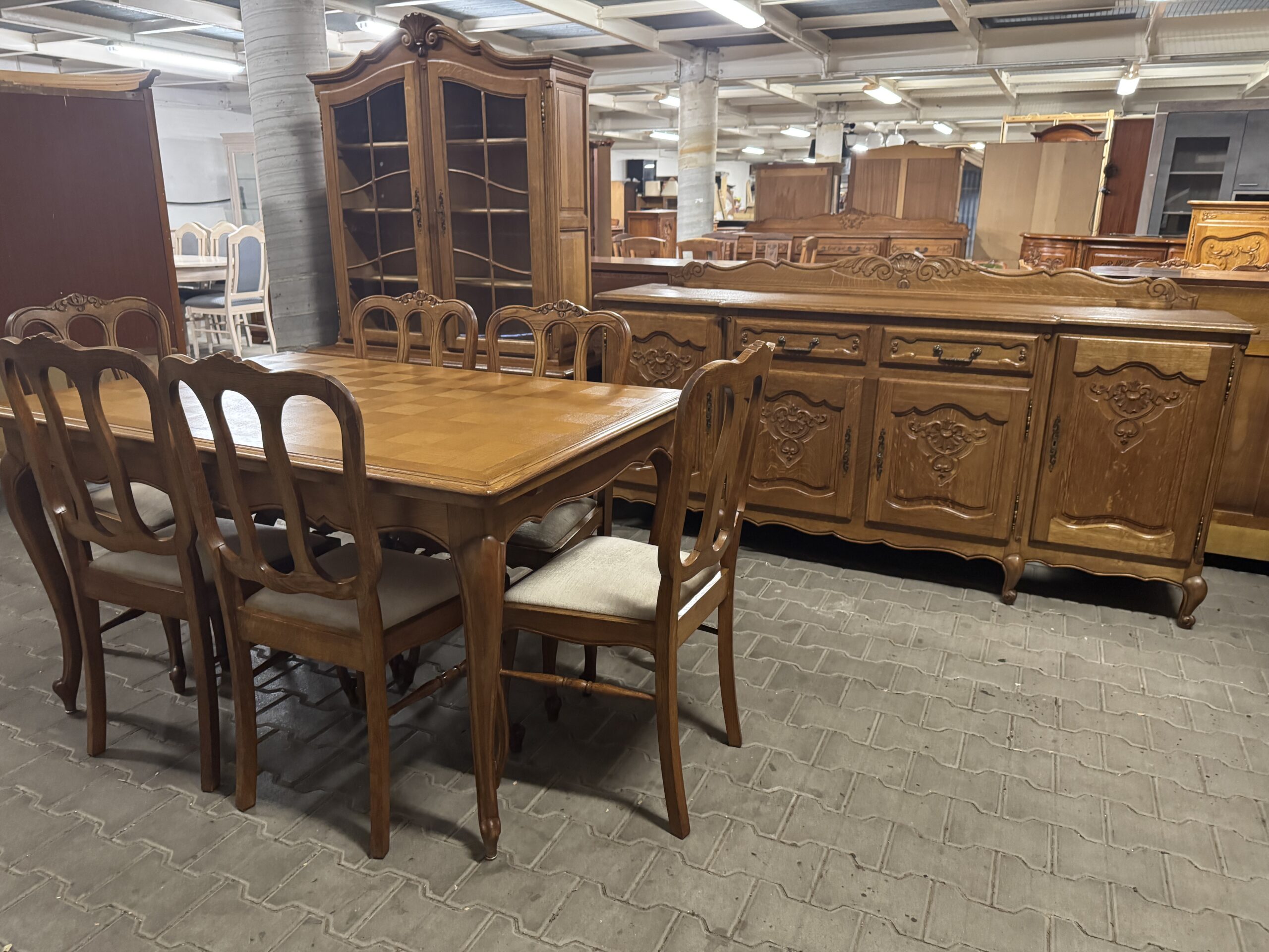 Cudowna jadalnia w stylu ludwikowskim: komoda, witryna, rozkładany stół i sześć krzeseł.