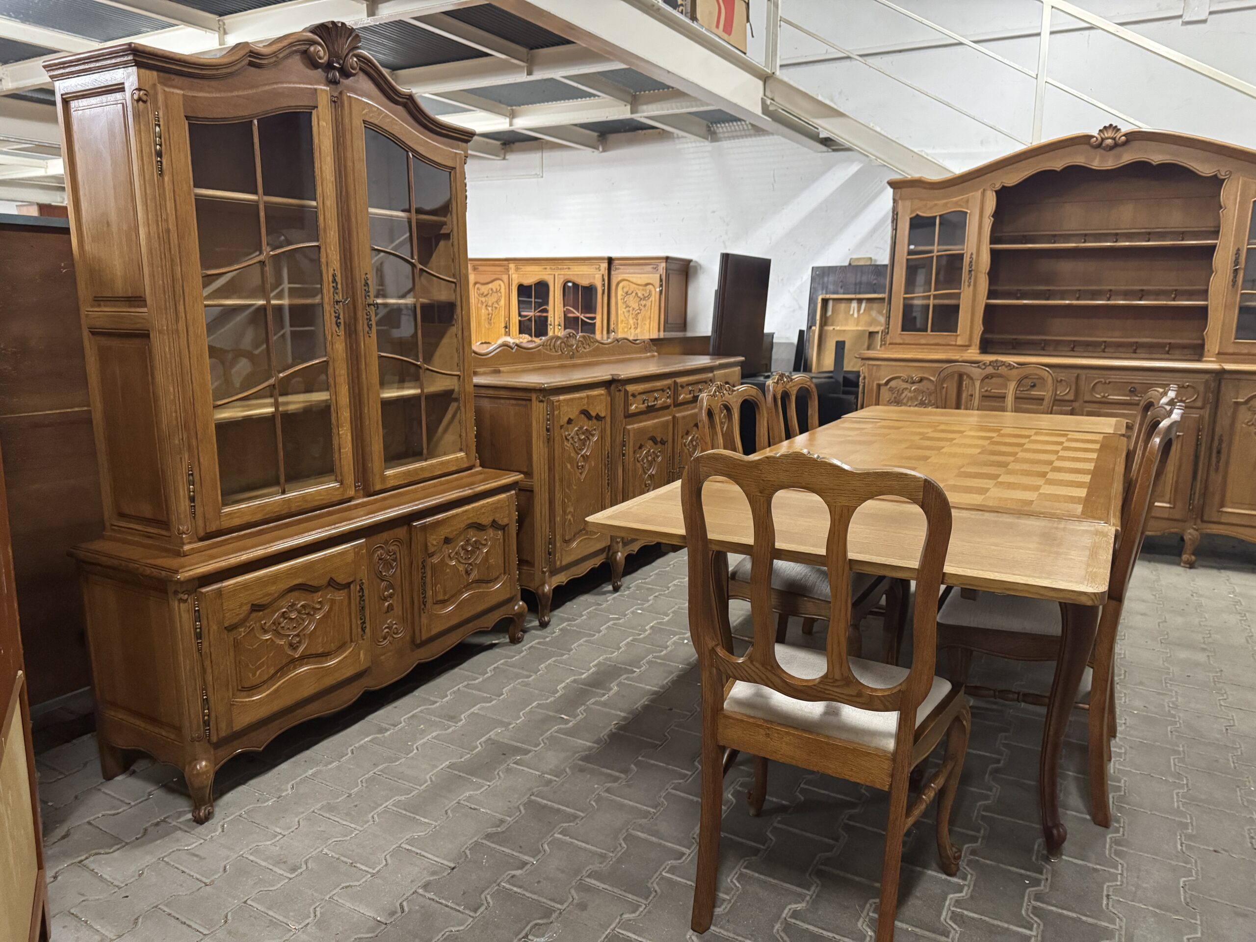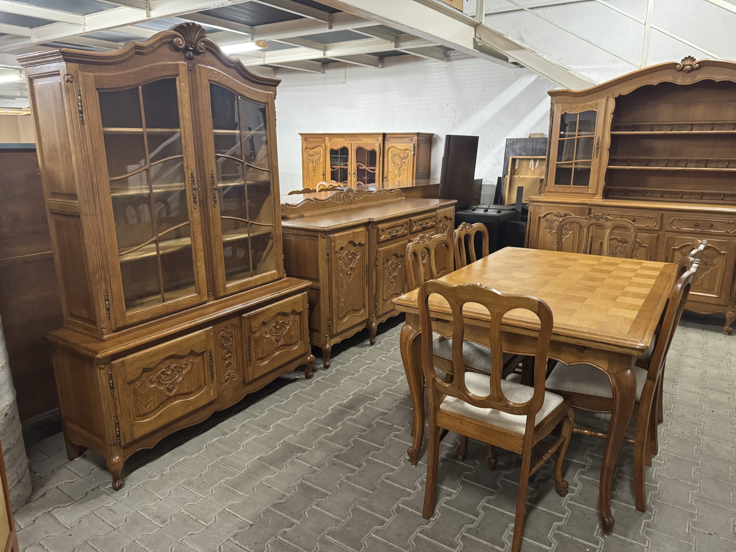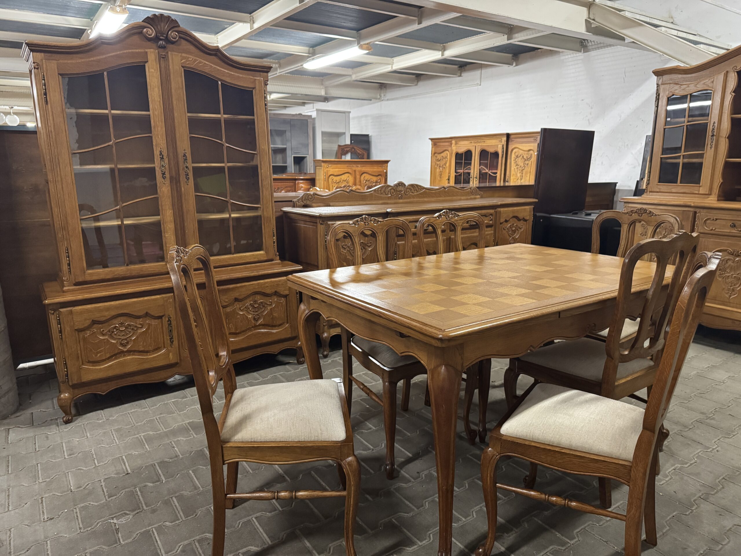 Cudowna jadalnia w stylu ludwikowskim: komoda, witryna, rozkładany stół i sześć krzeseł.