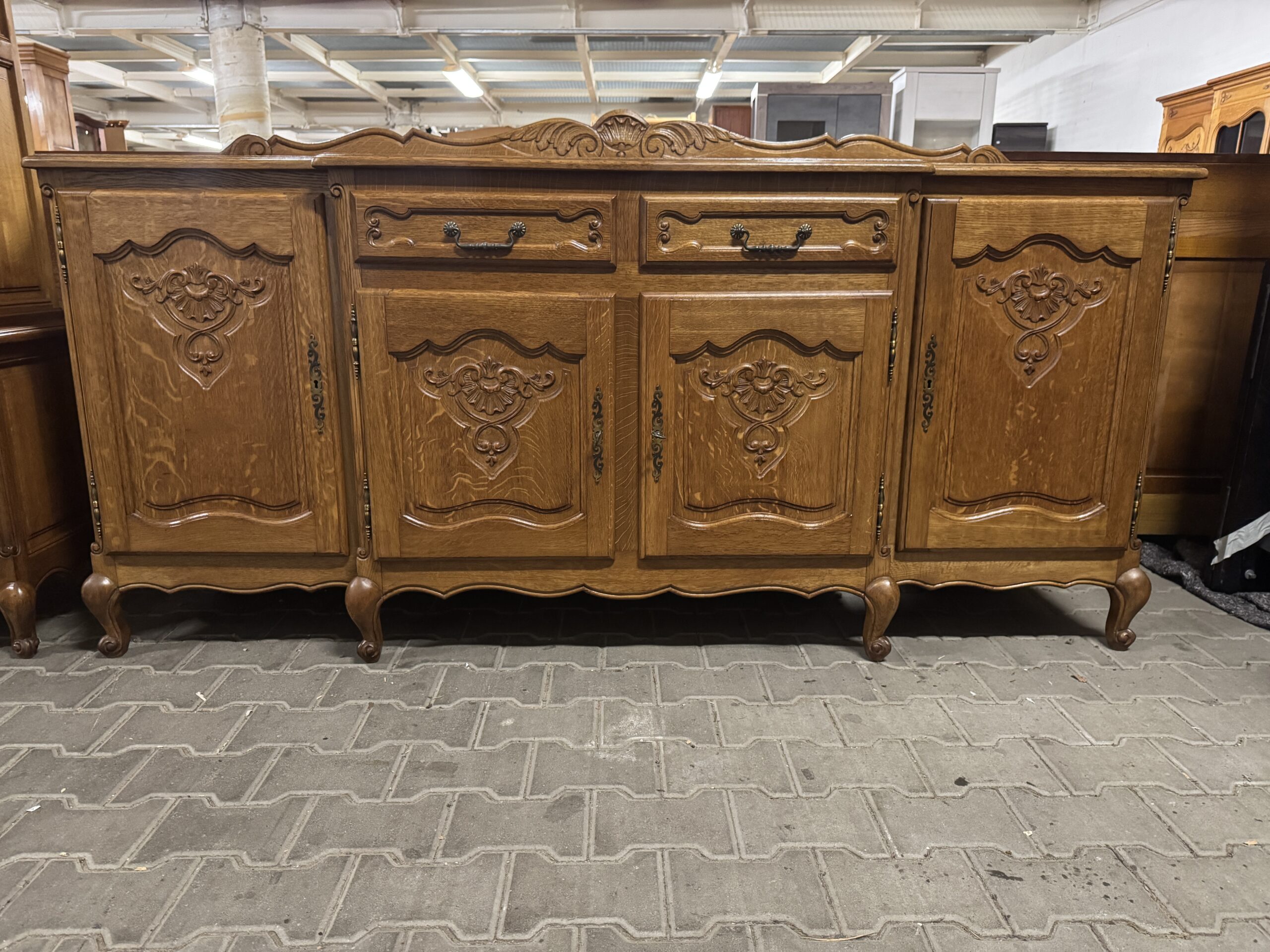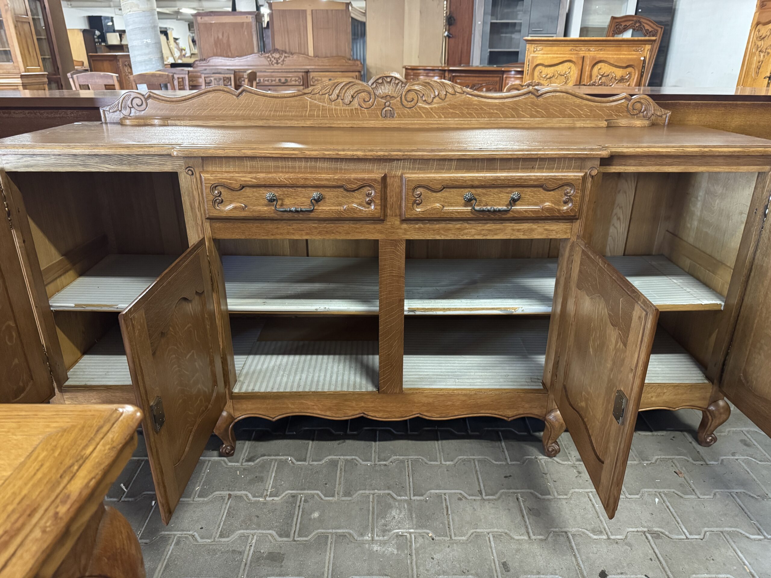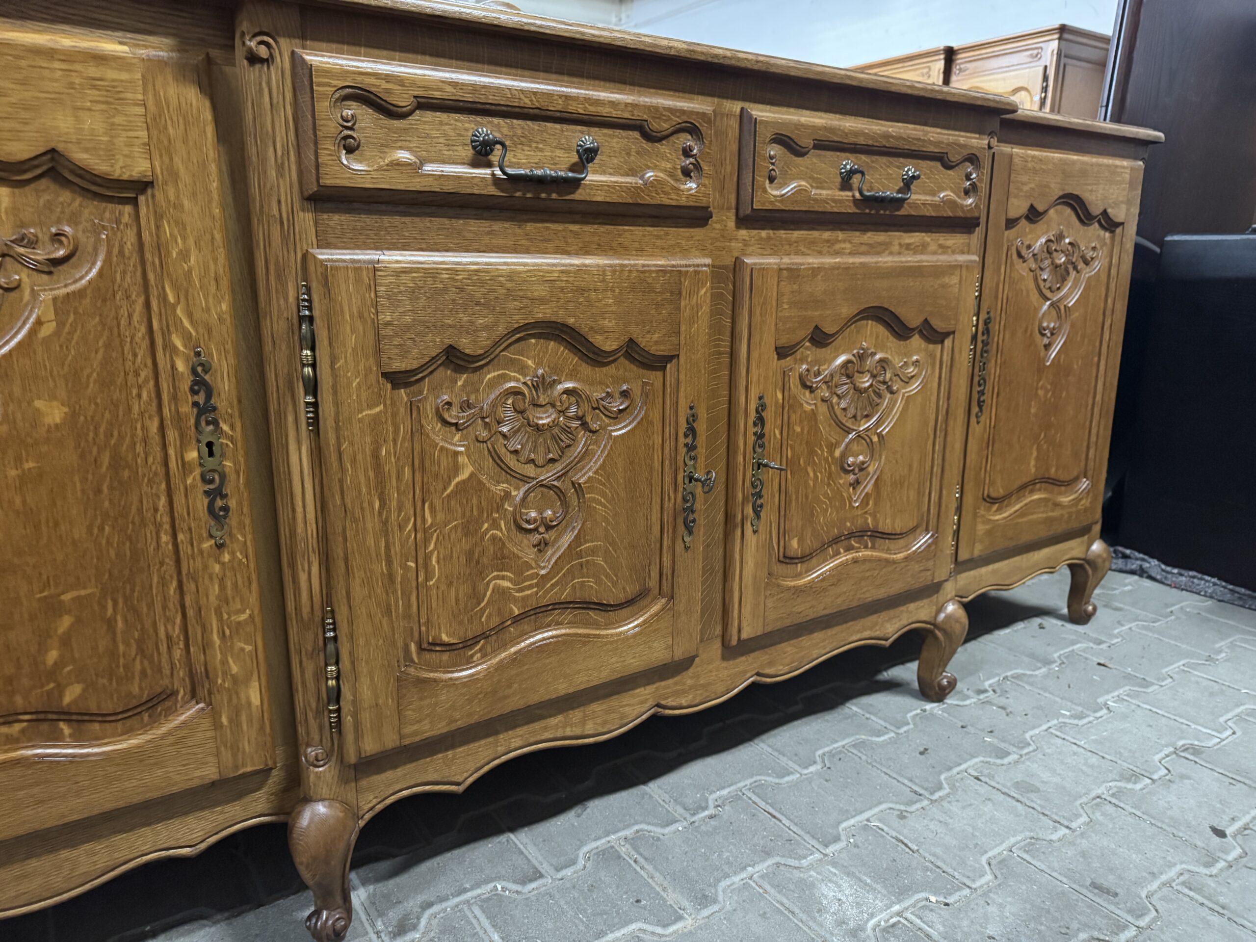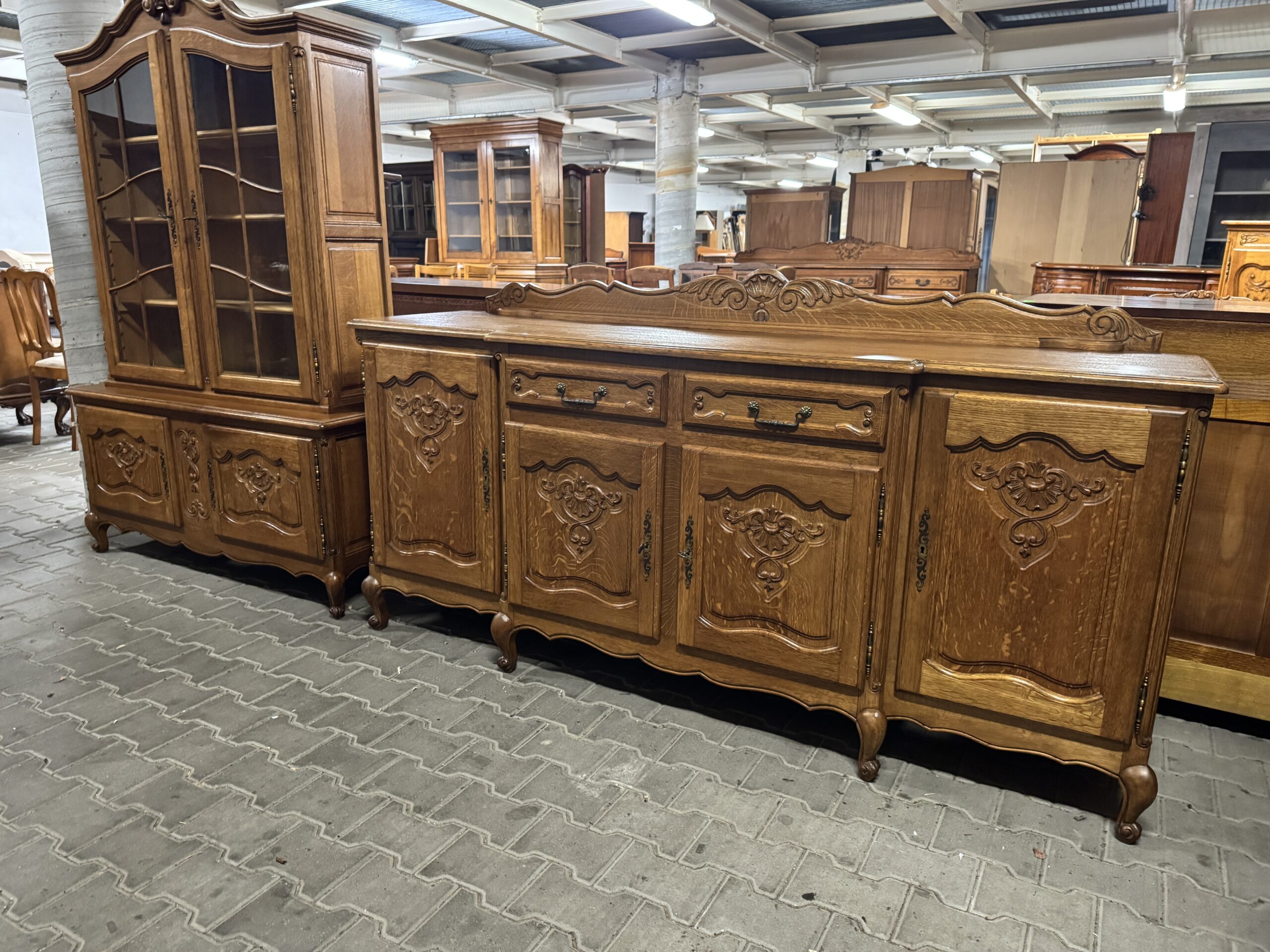 Cudowna jadalnia w stylu ludwikowskim: komoda, witryna, rozkładany stół i sześć krzeseł.
