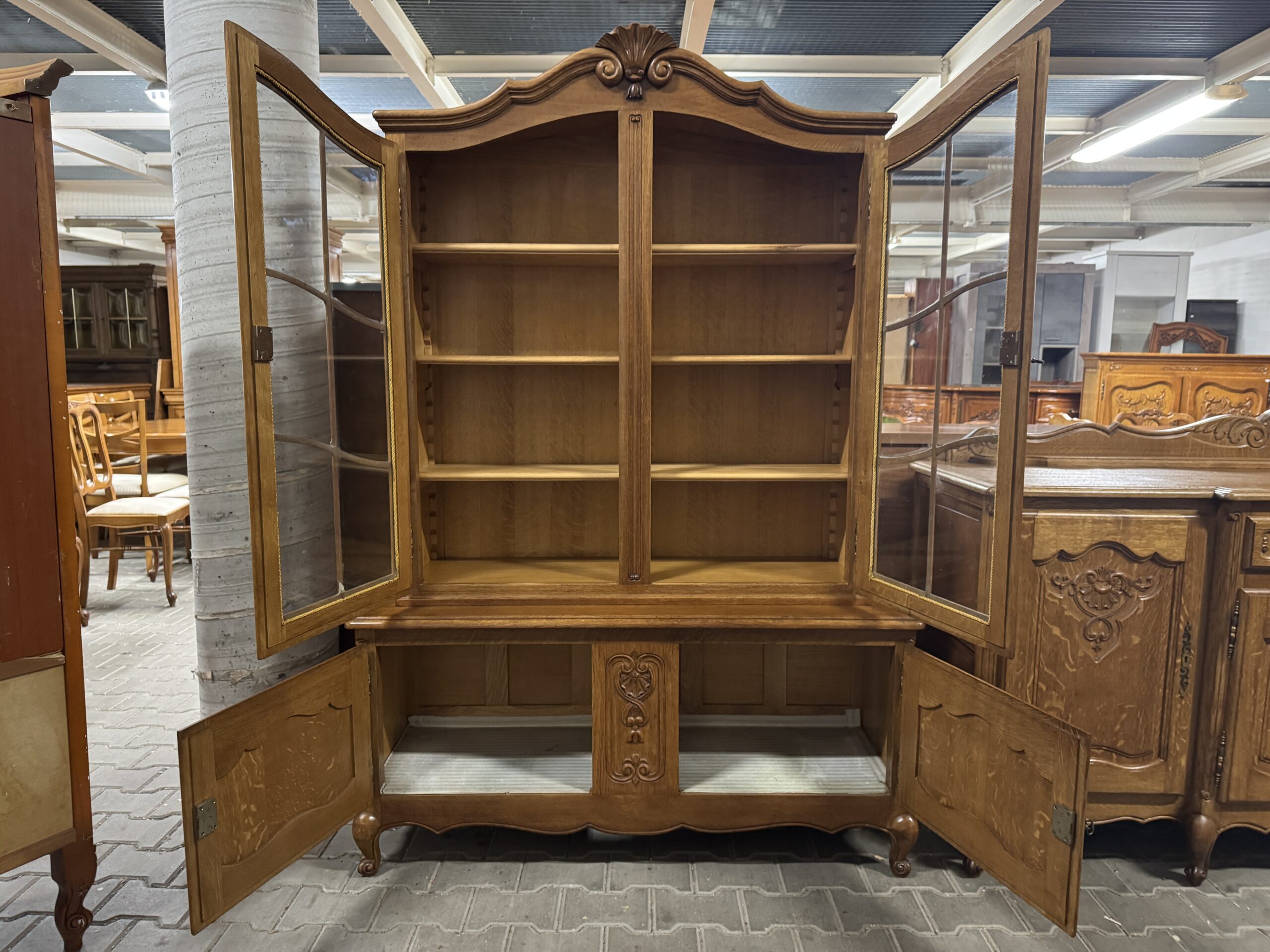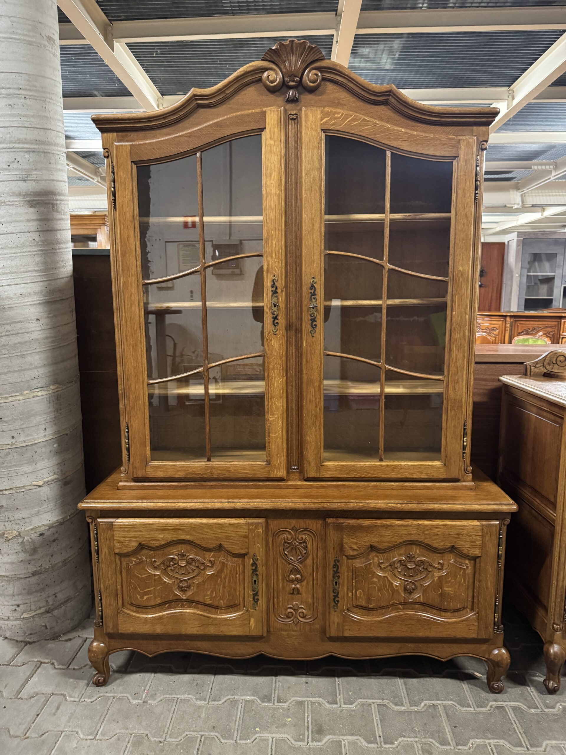 Górna część witryny przeszklona, wyposażona w trzy półki, regulowane po wysokości.