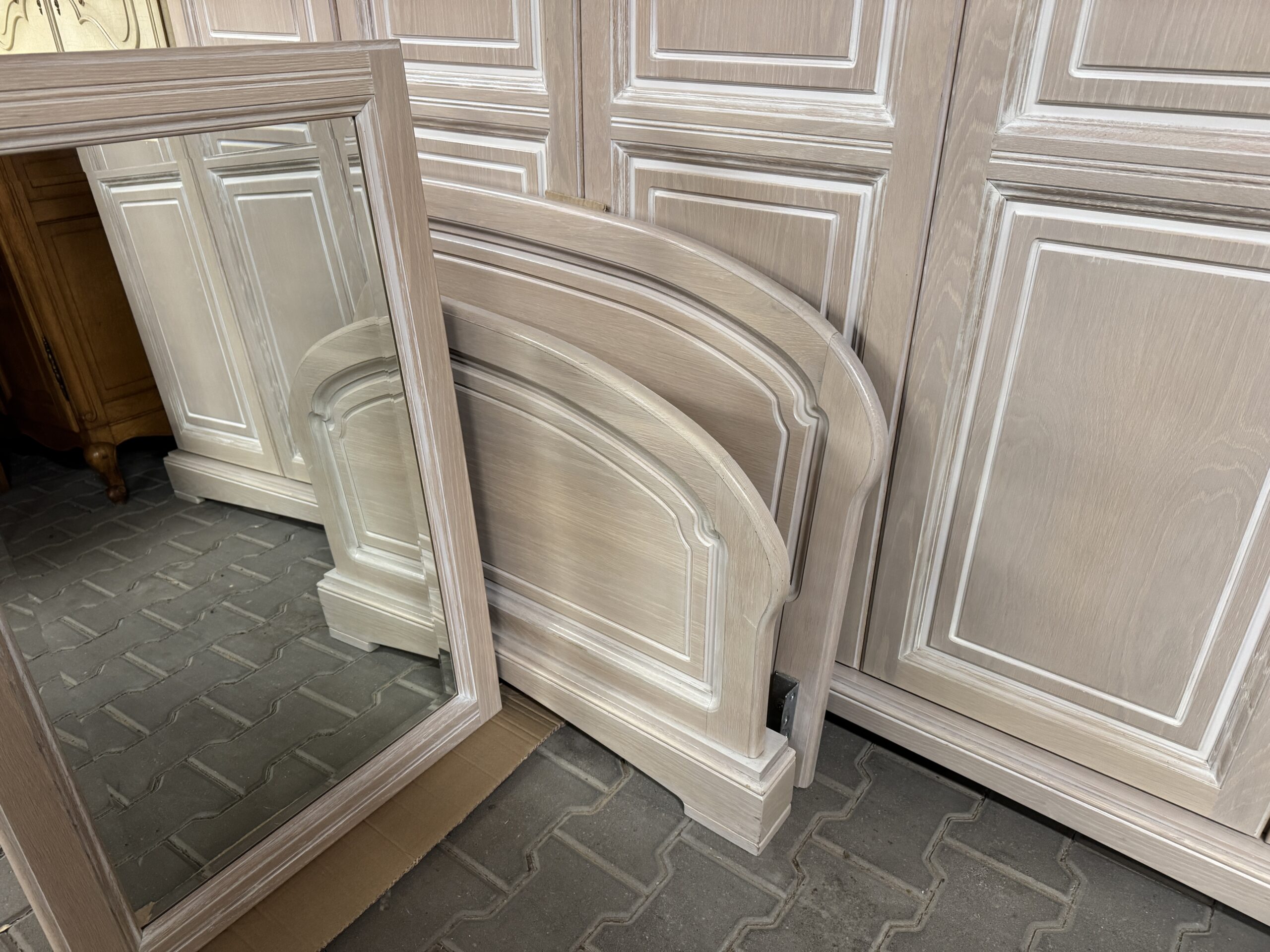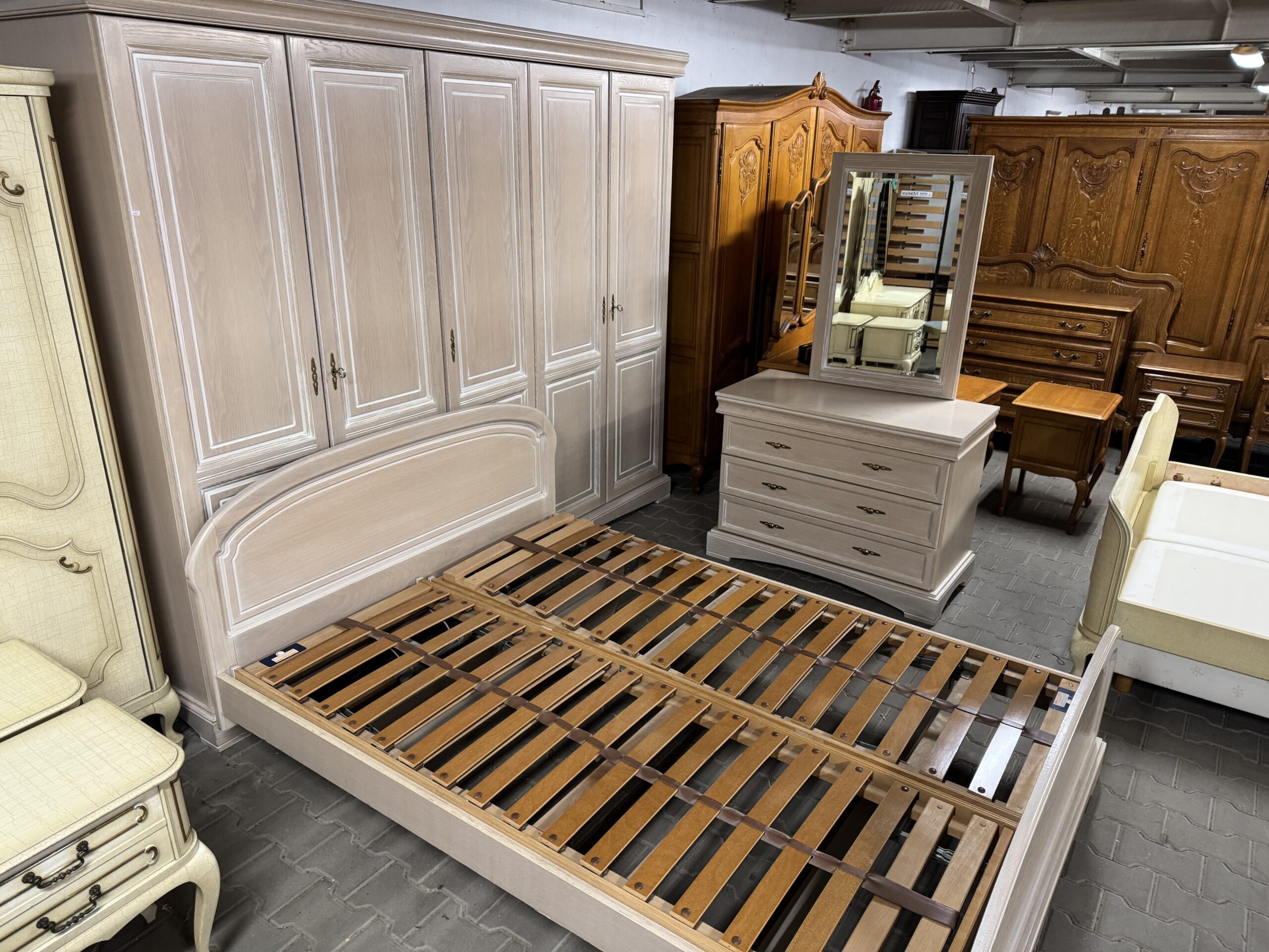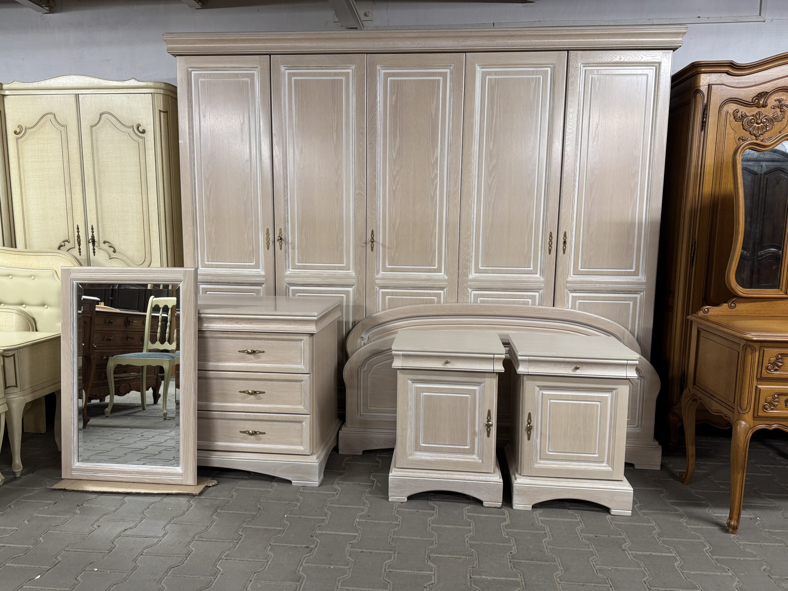 Stylowy prowansalski komplet mebli do sypialni: pięciodrzwiowa szafa, łóżko, dwie szafki nocne, komoda i lustro.