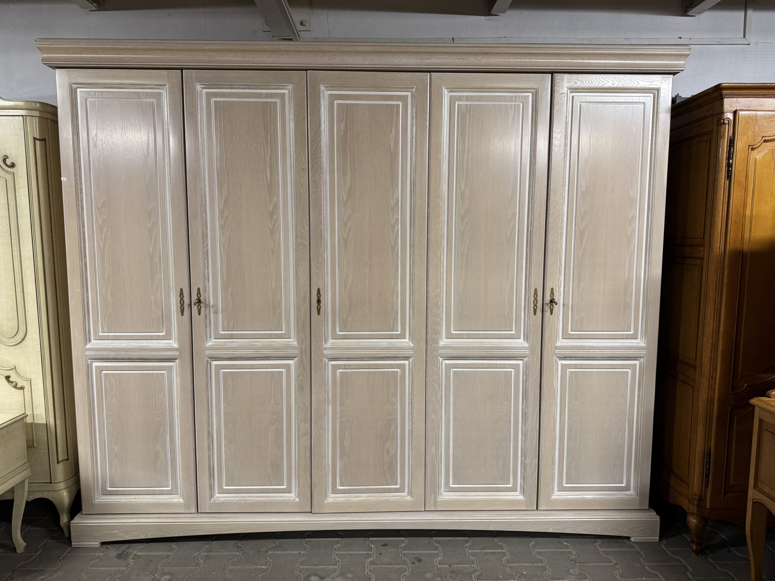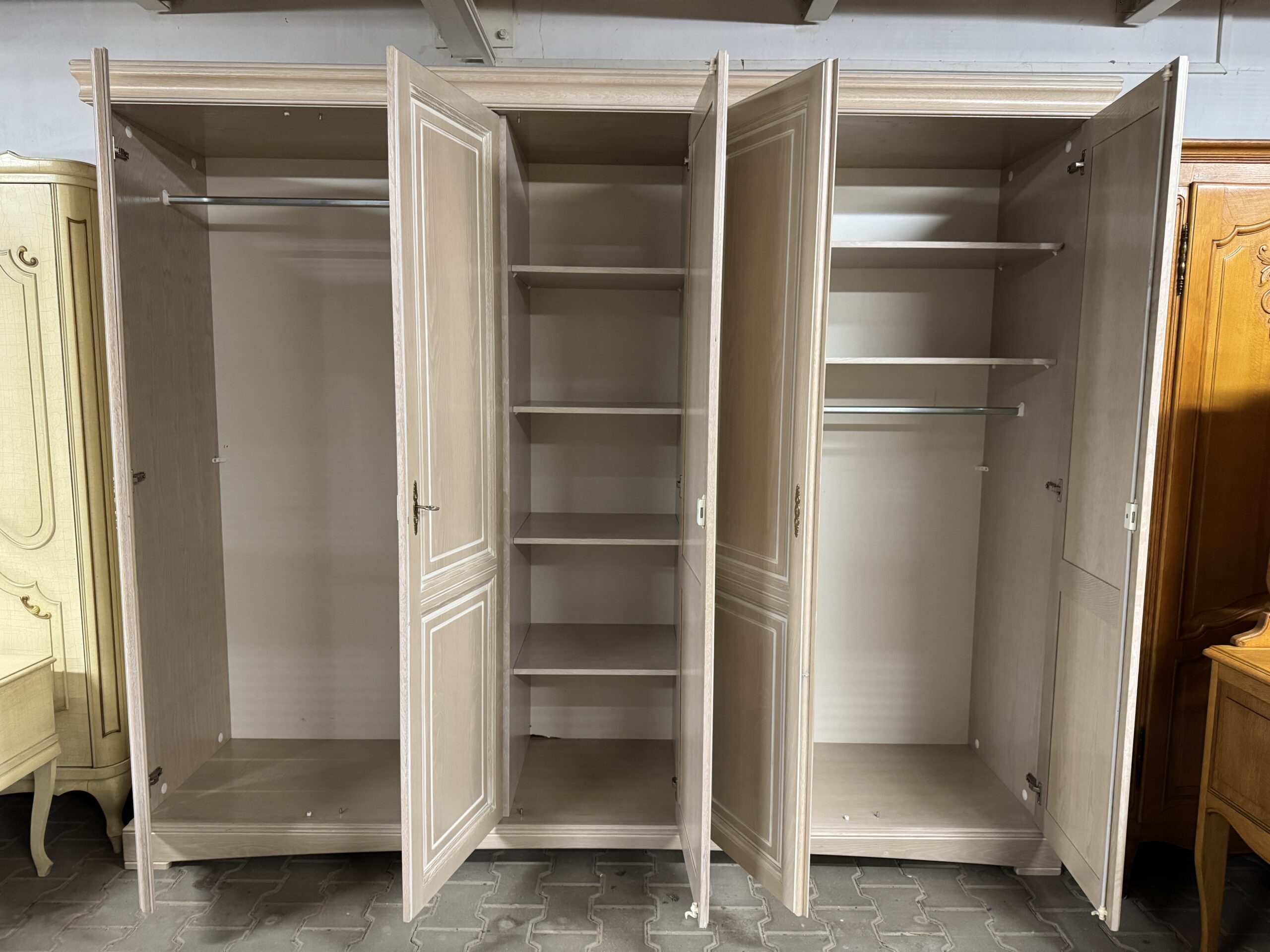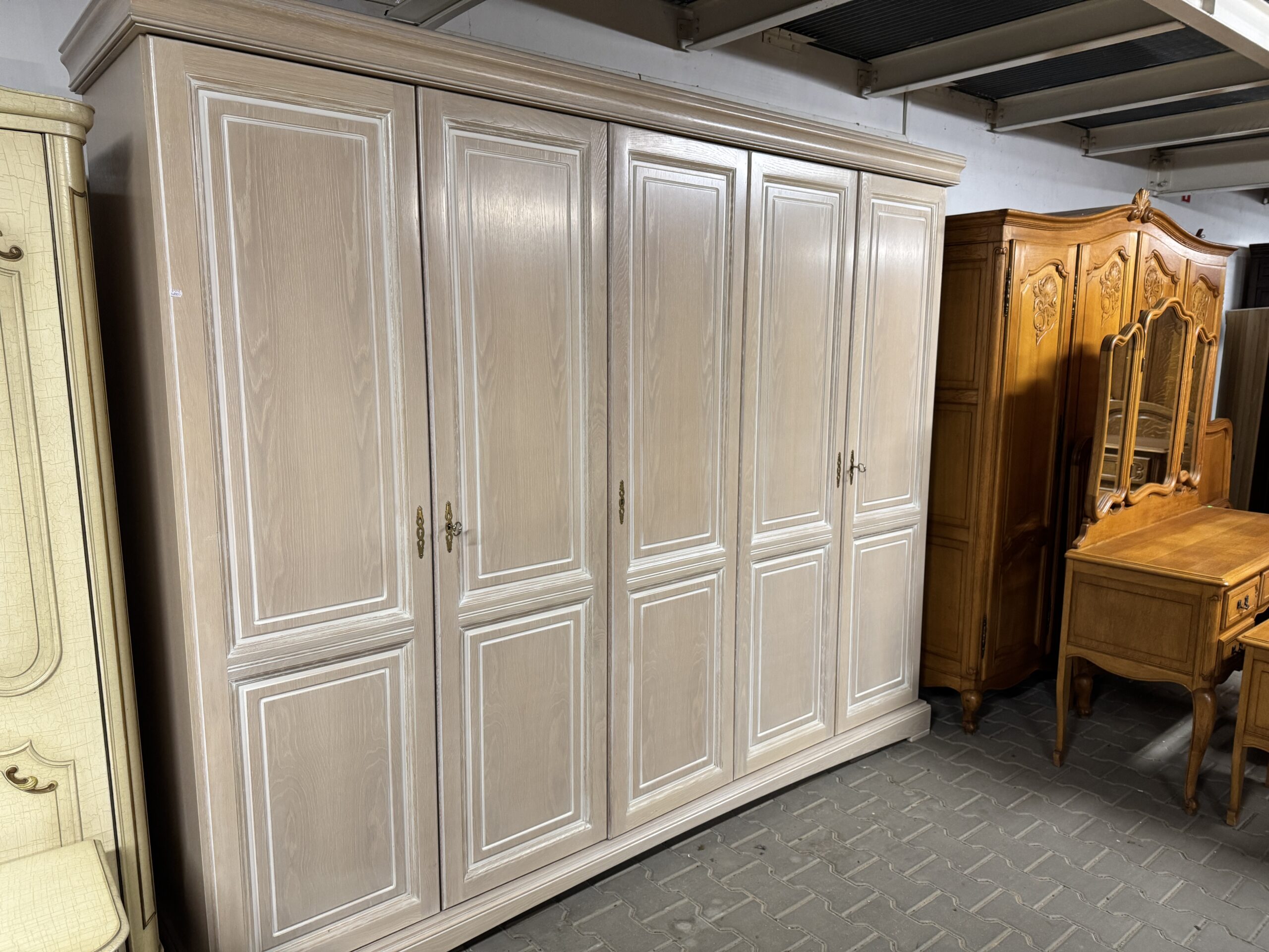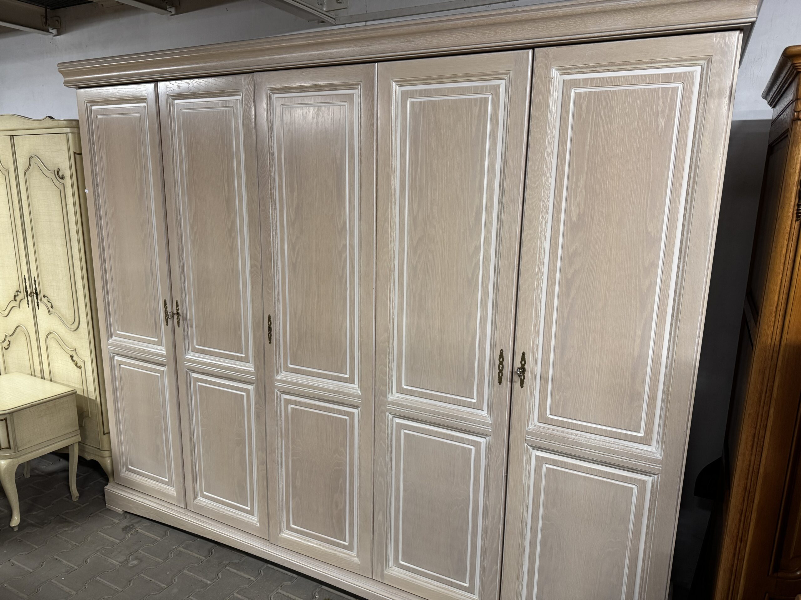 Stylowy prowansalski komplet mebli do sypialni: pięciodrzwiowa szafa, łóżko, dwie szafki nocne, komoda i lustro.