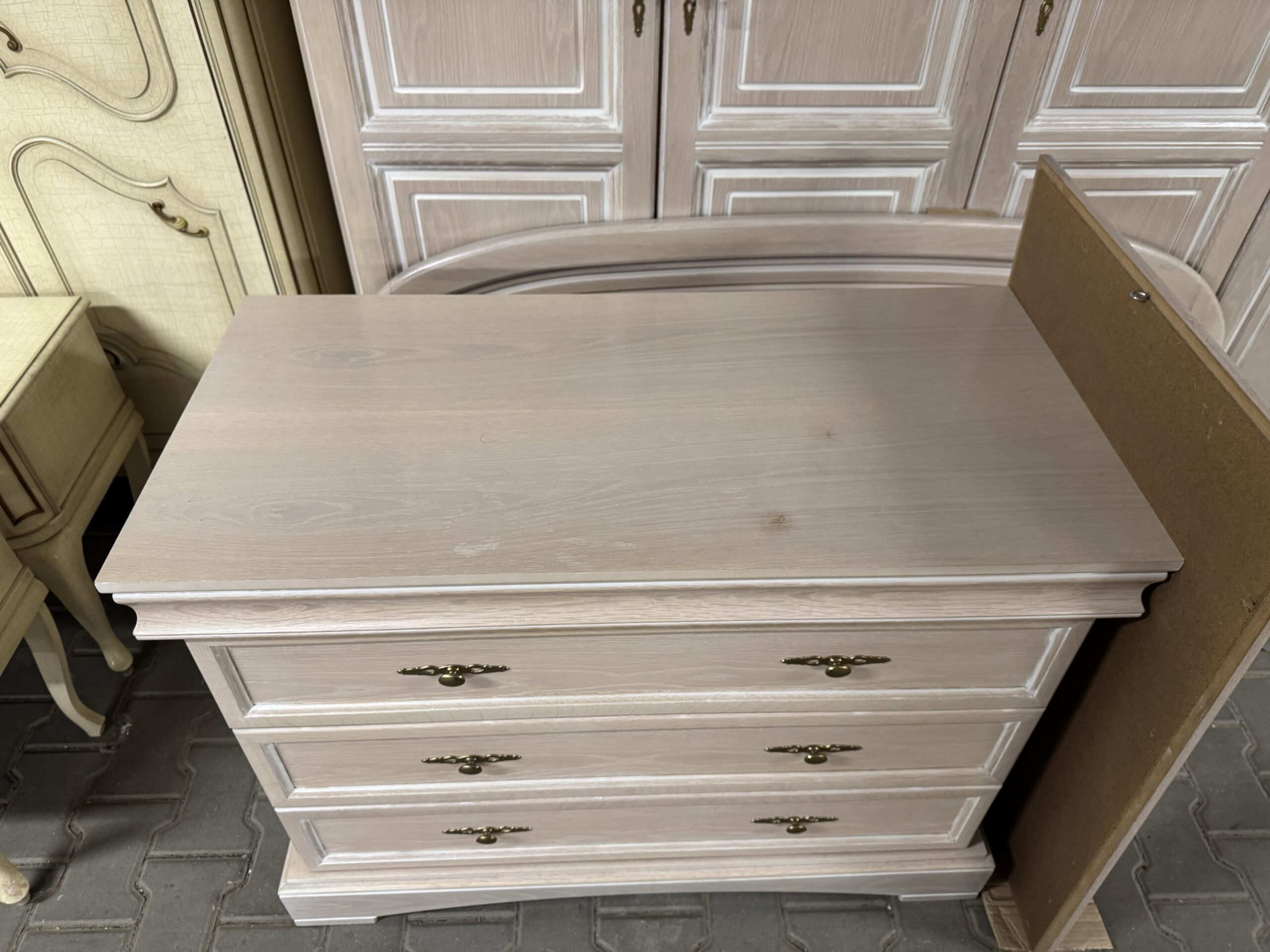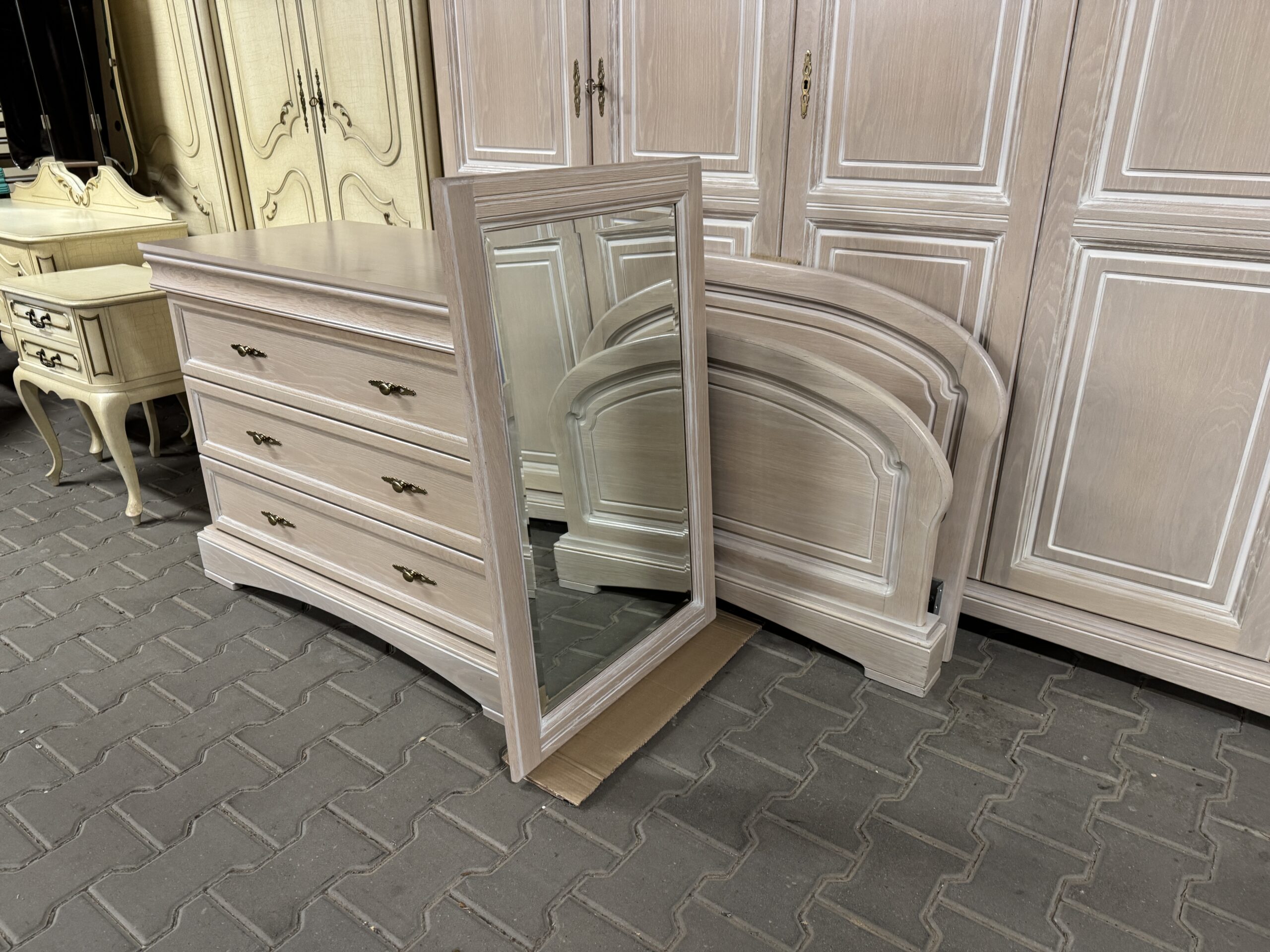 Cena za zestaw: szafa, łóżko wraz ze stelażem, dwie szafki nocne, komoda i lustro.