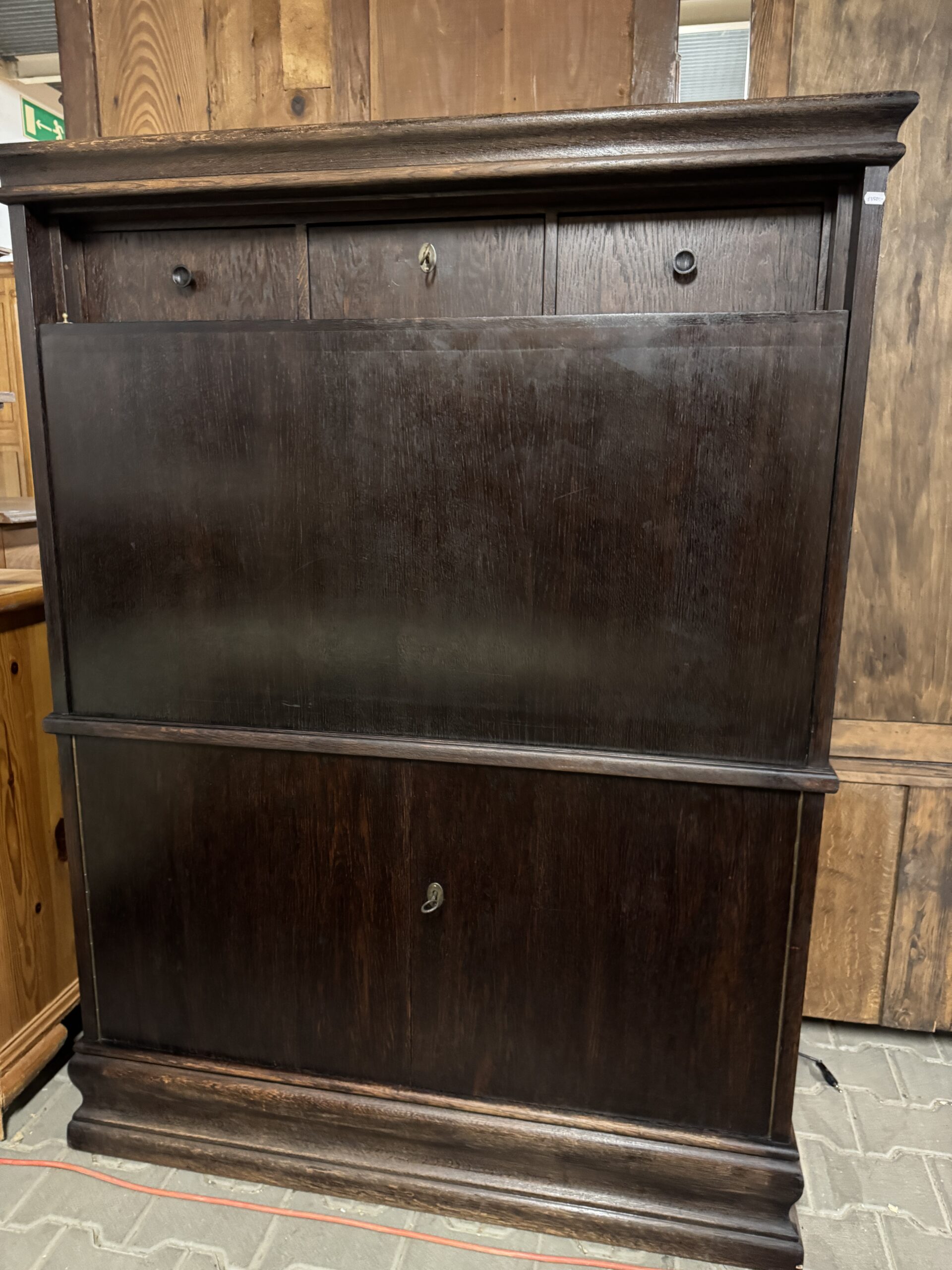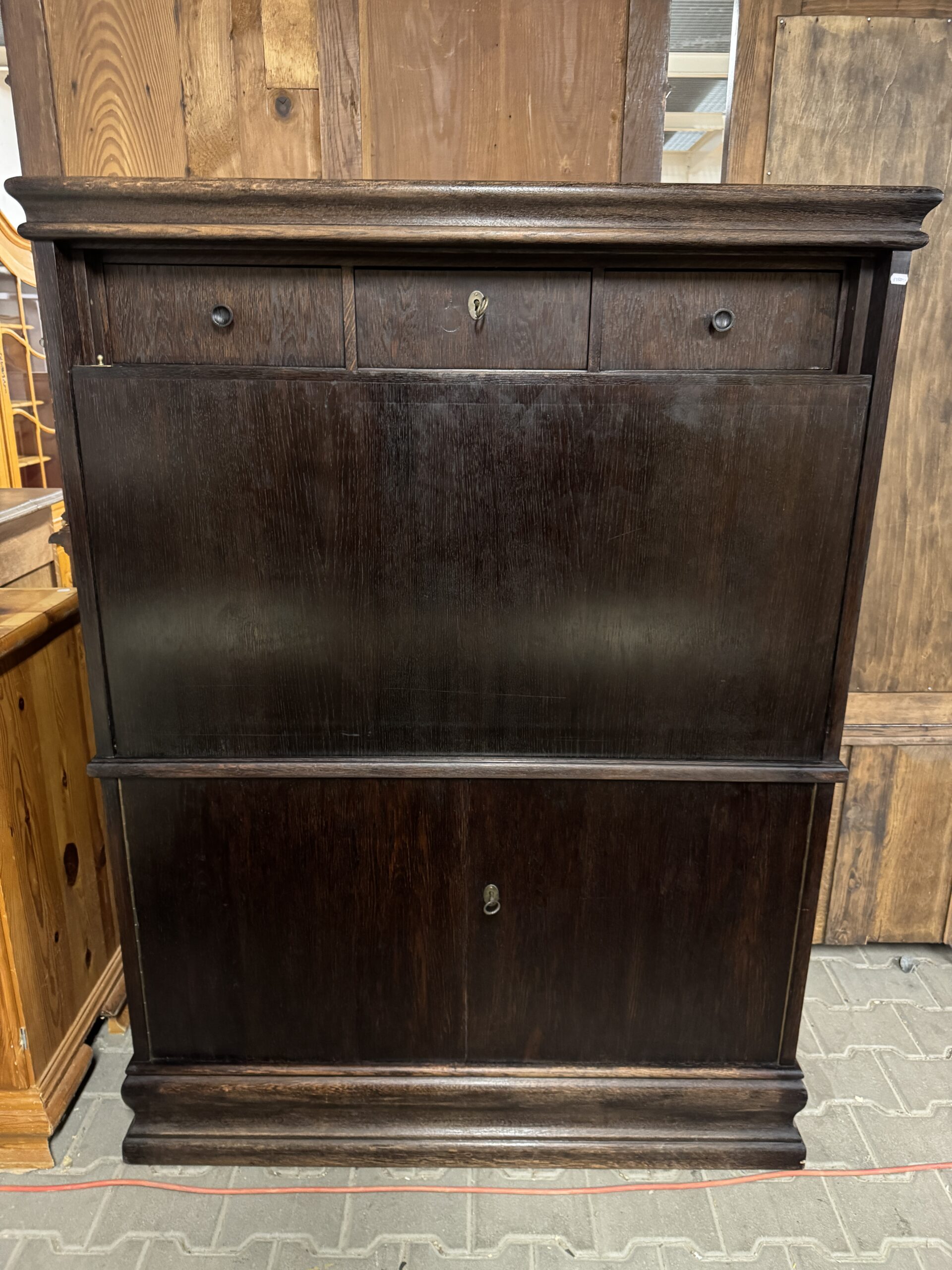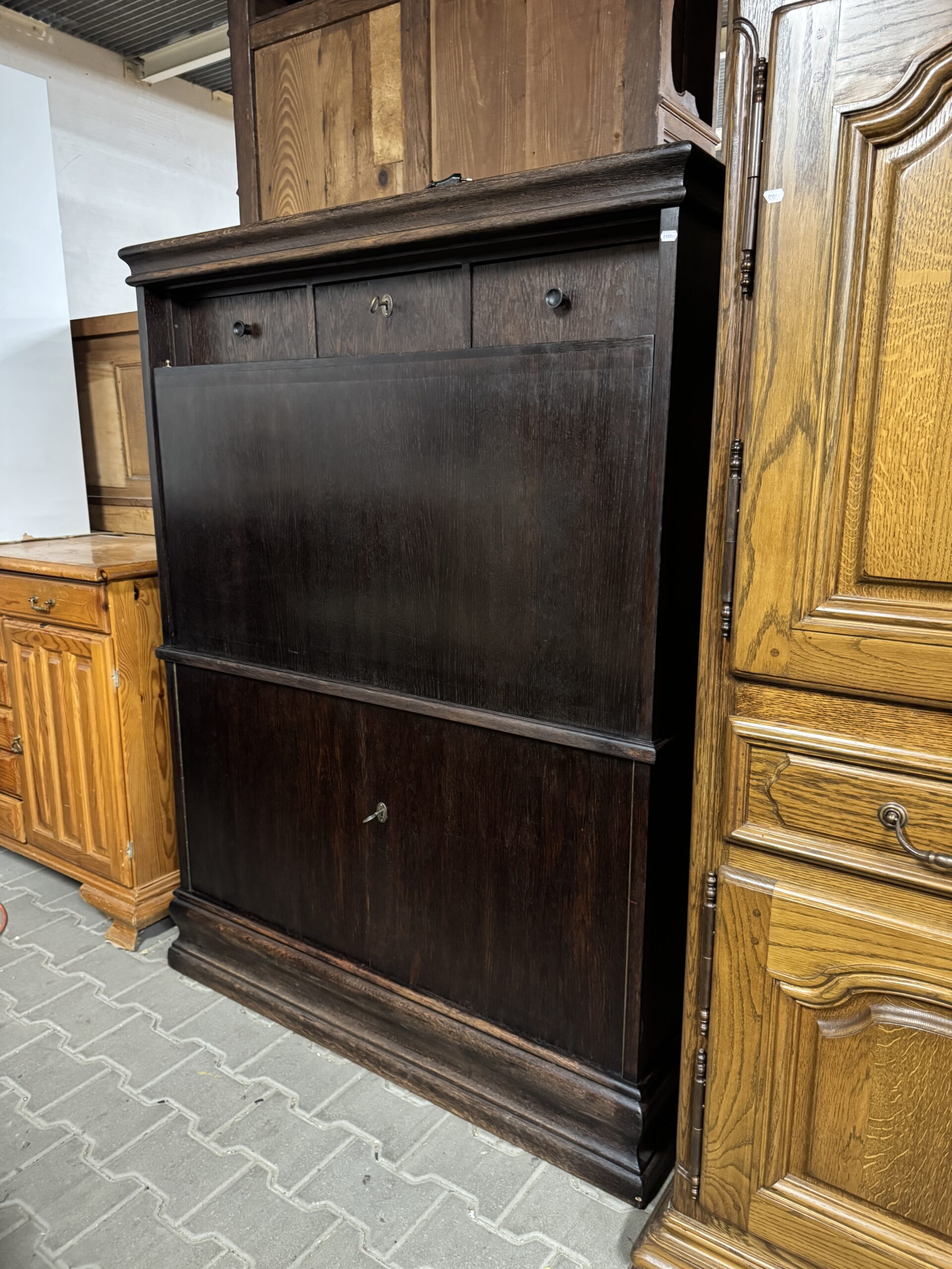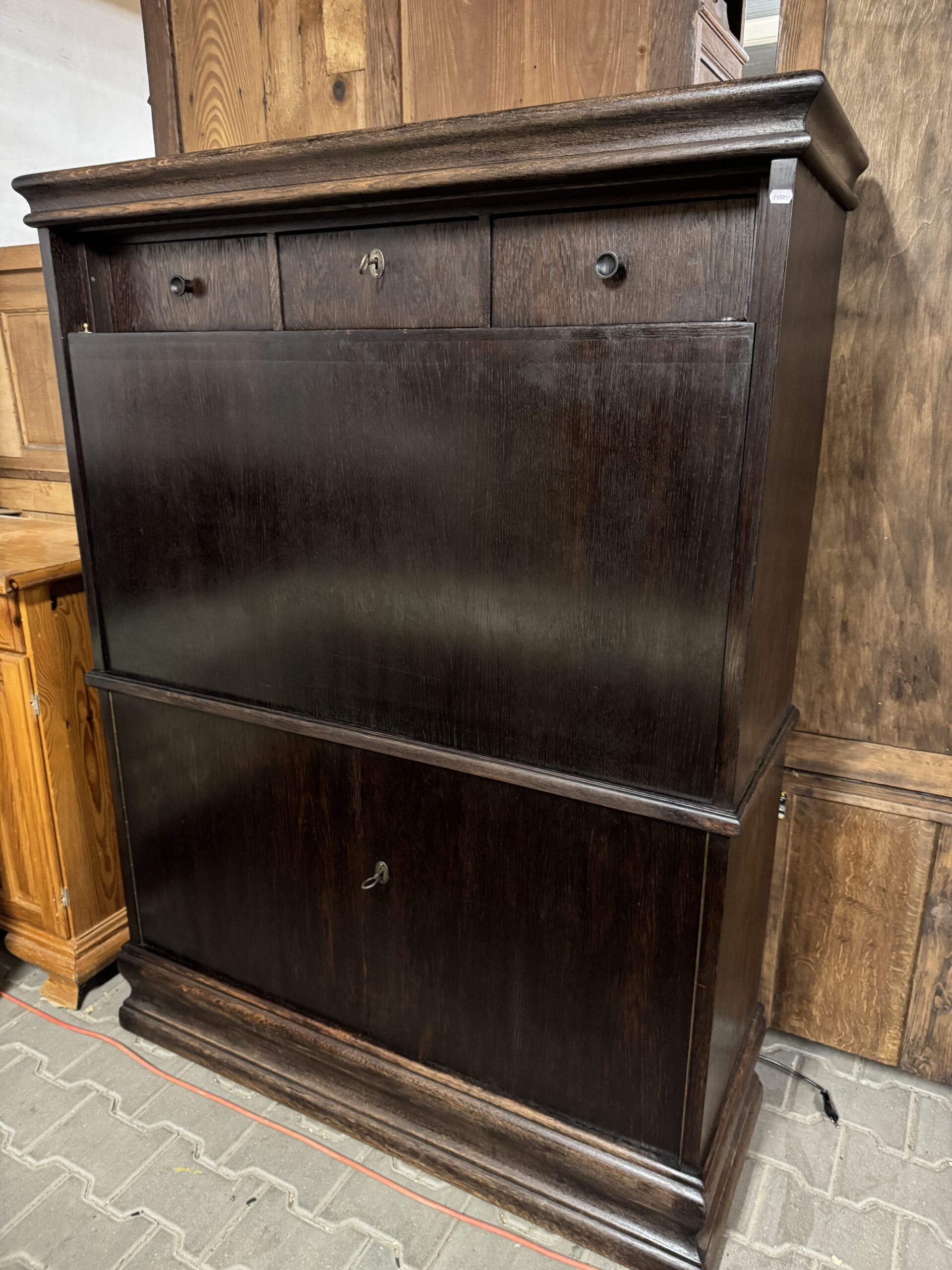 Dębowa sekretera z otwieranym blatem w ciemnym kolorze.