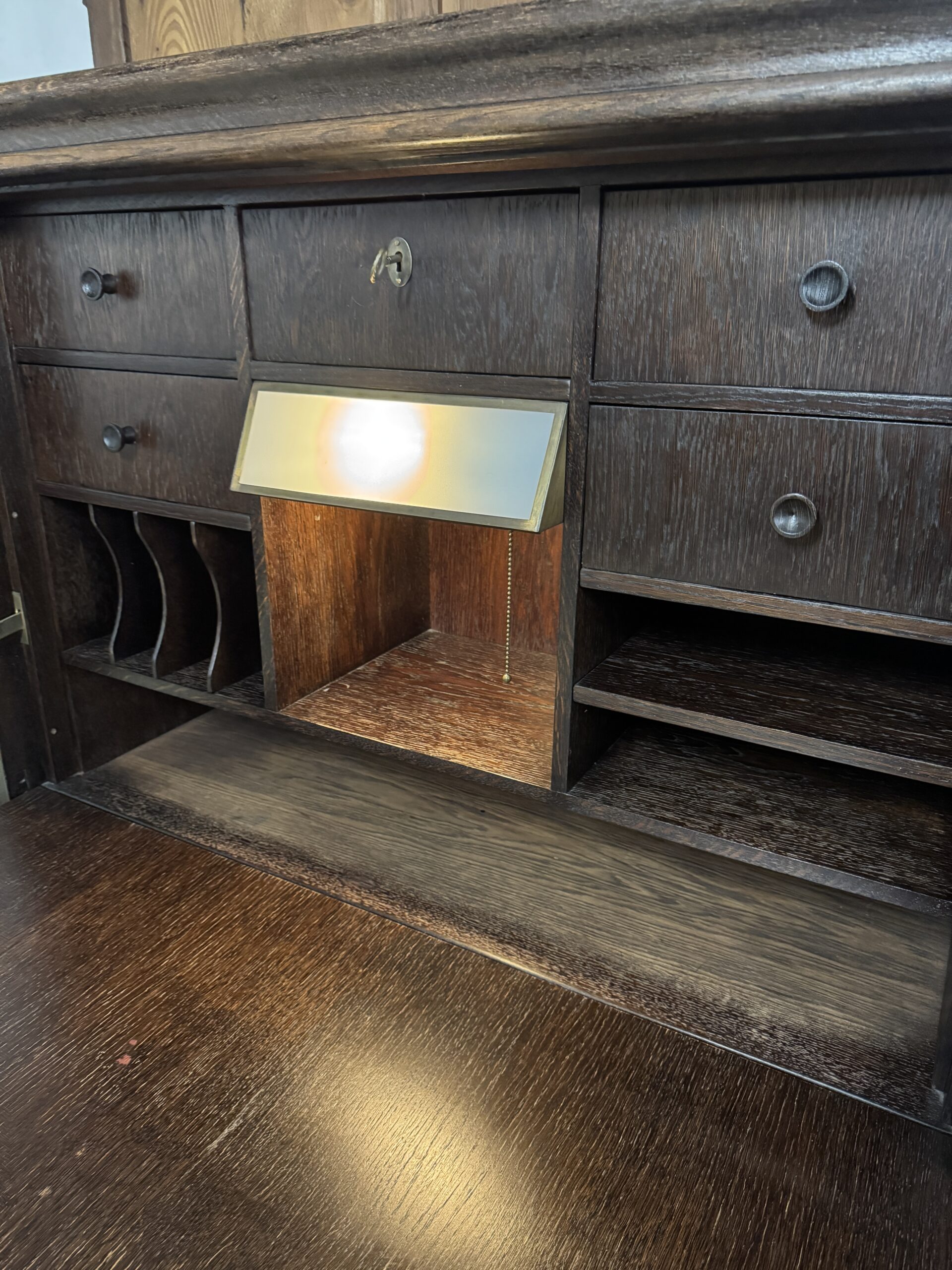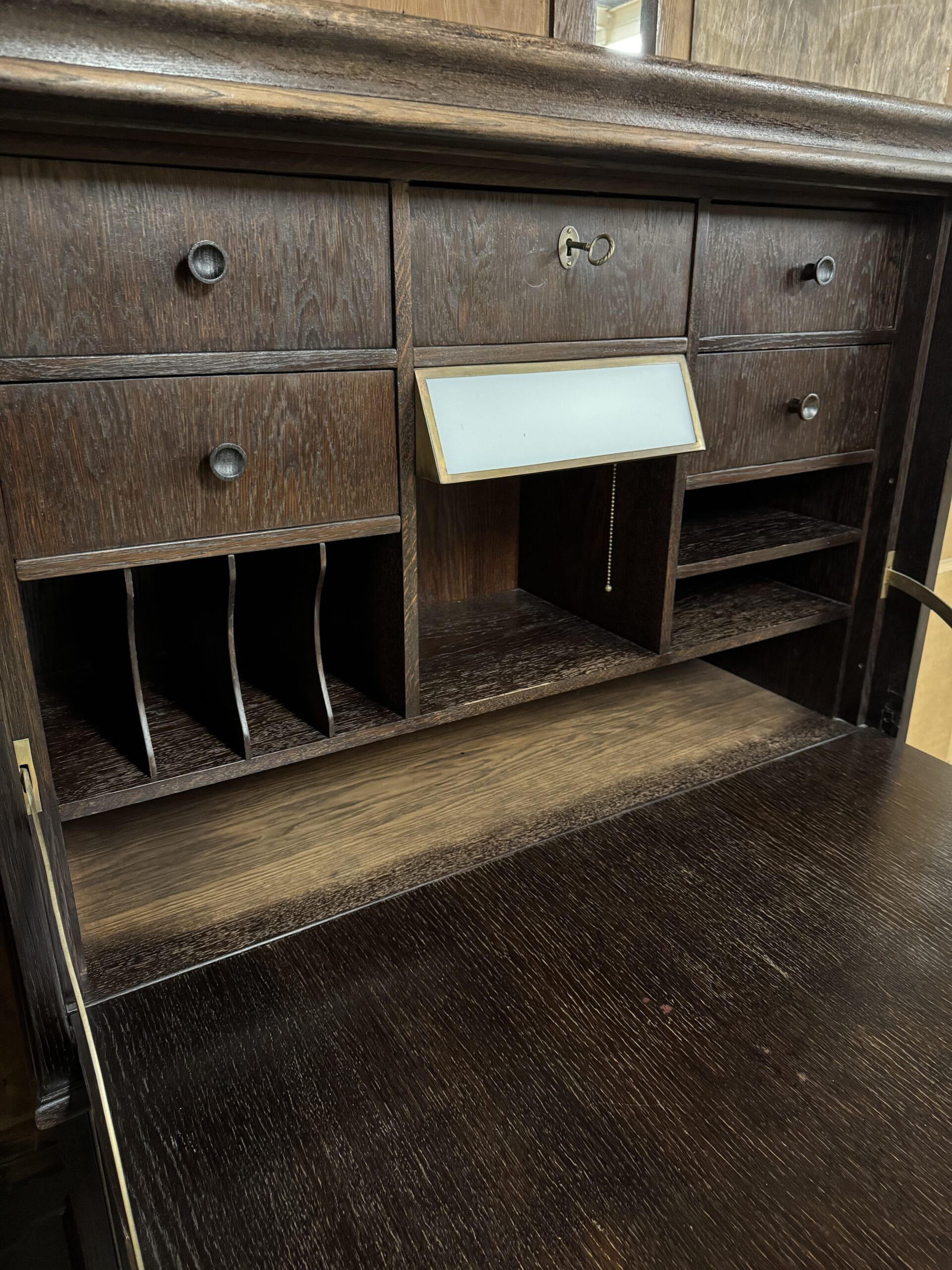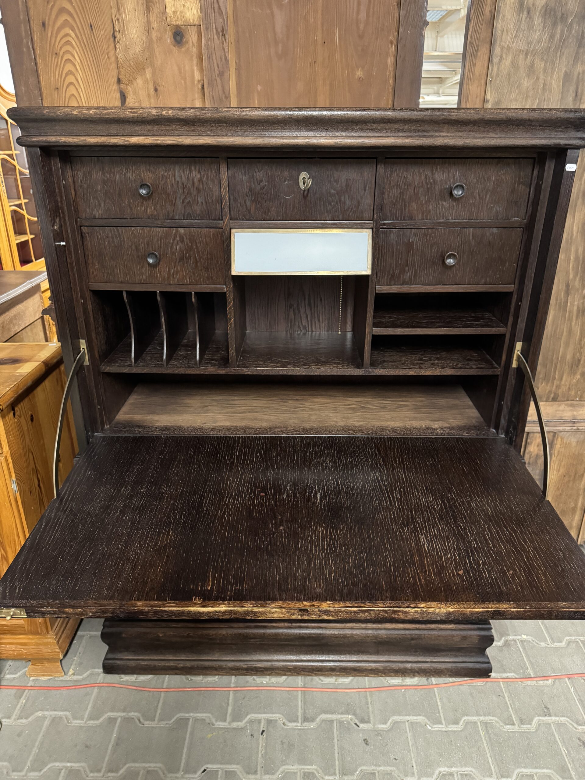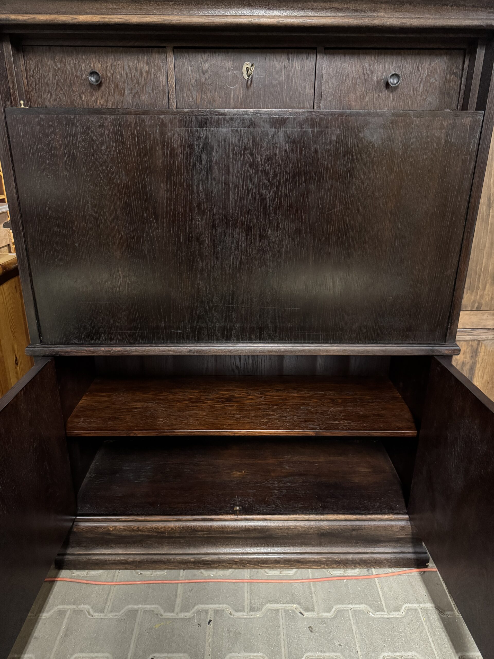 Dębowa sekretera z otwieranym blatem w ciemnym kolorze.
