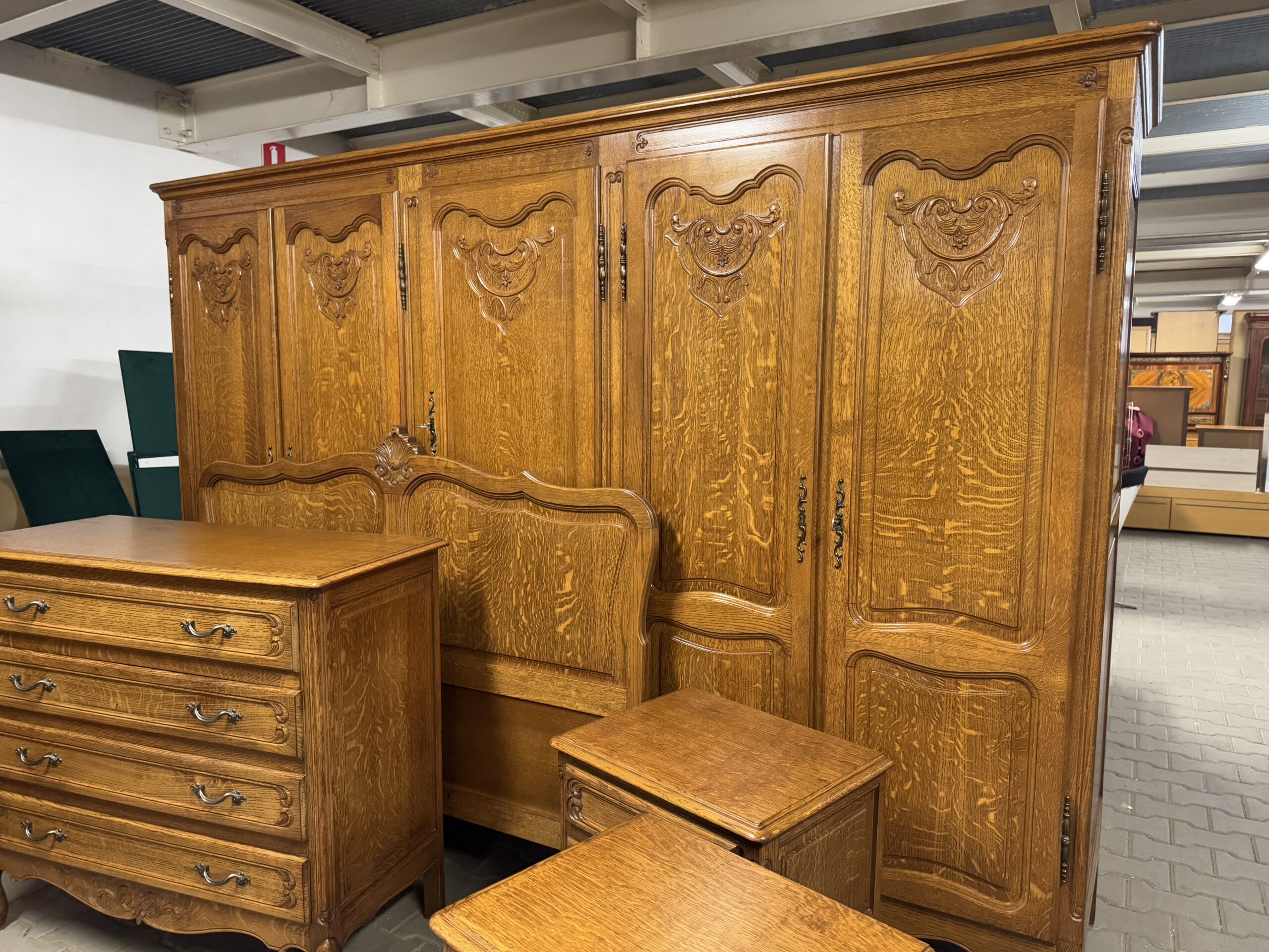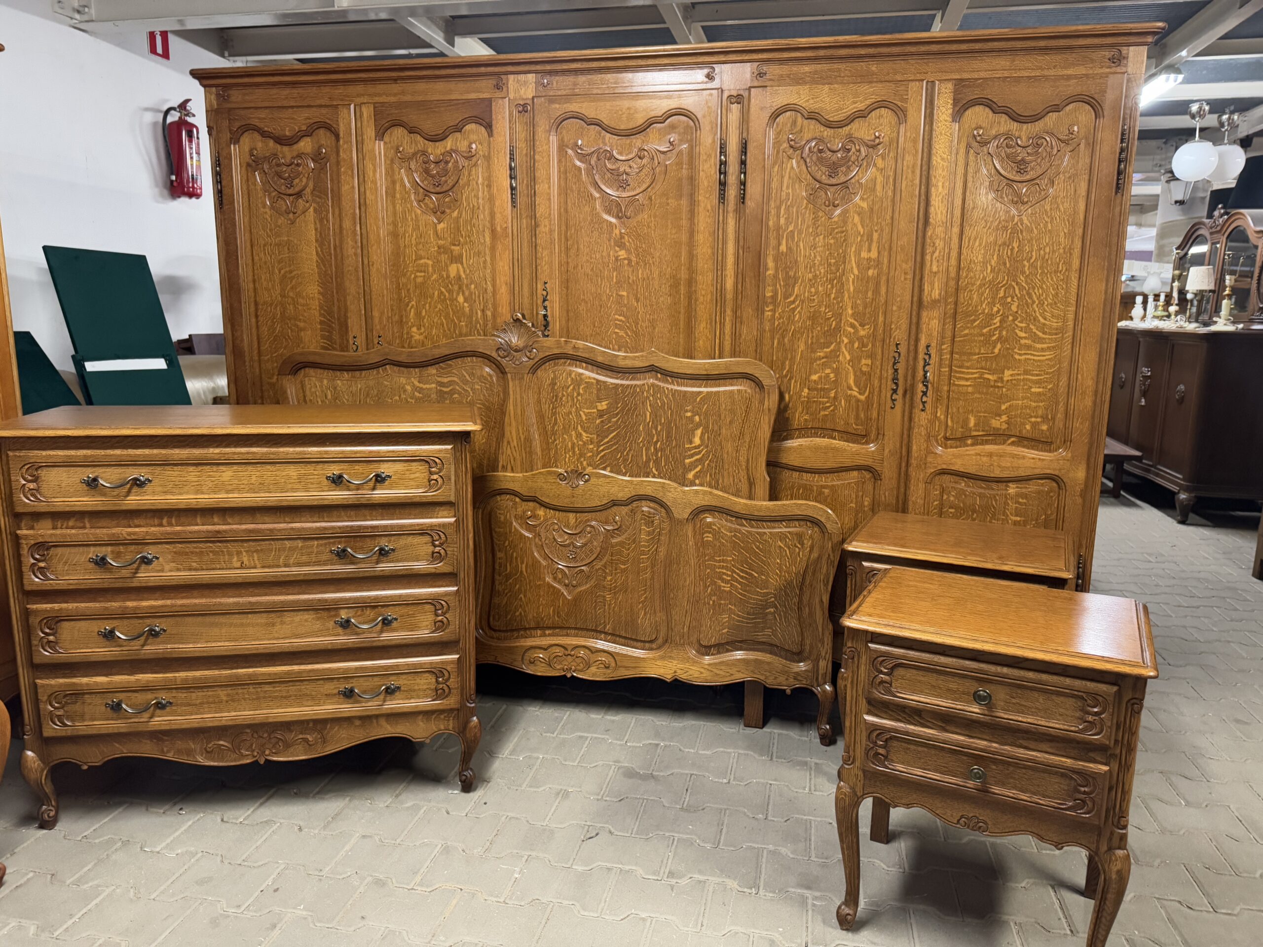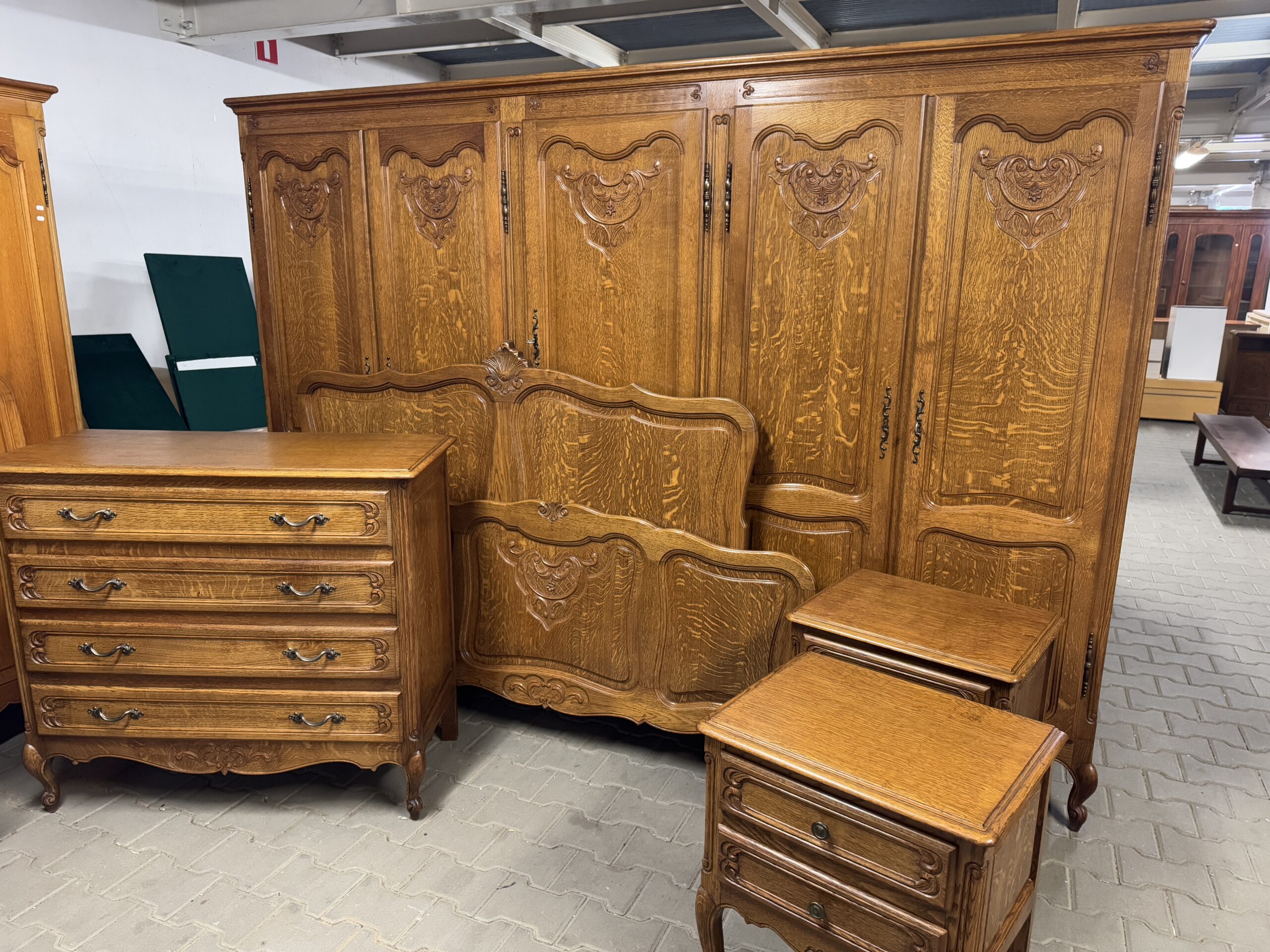 Cudowny komplet mebli do sypialni: pięciodrzwiowa szafa, komoda, rama łóżka oraz dwie szafki nocne.