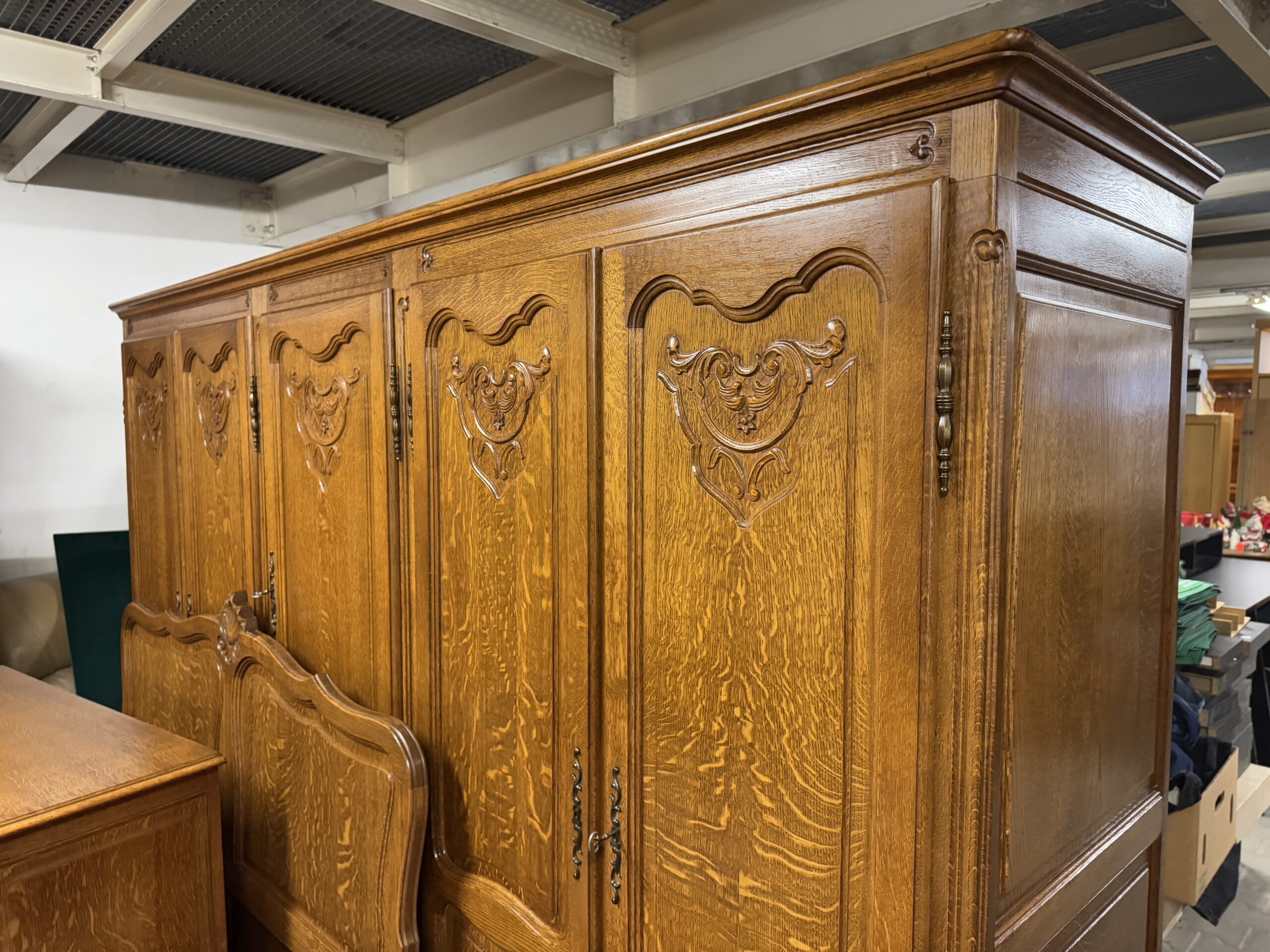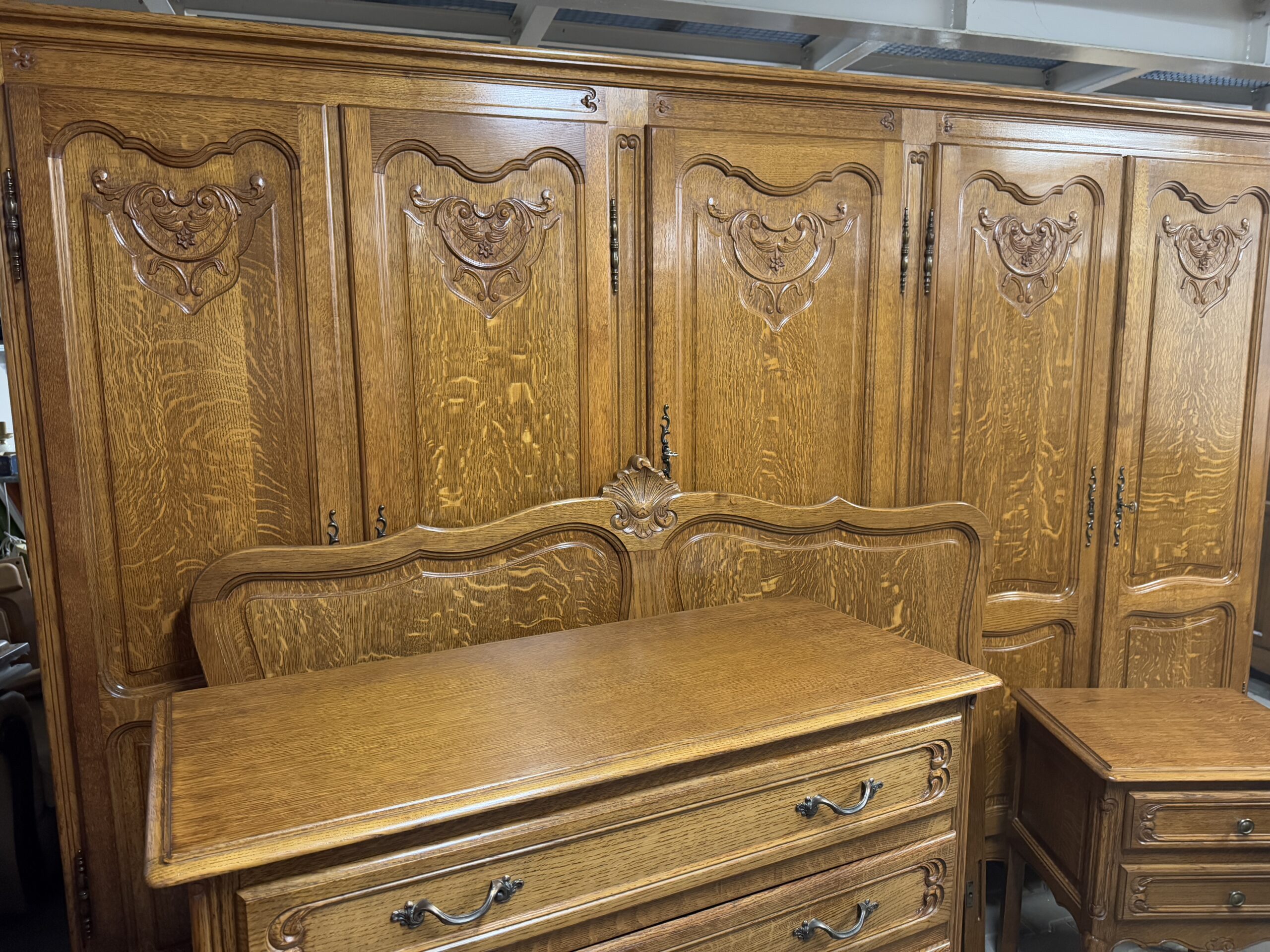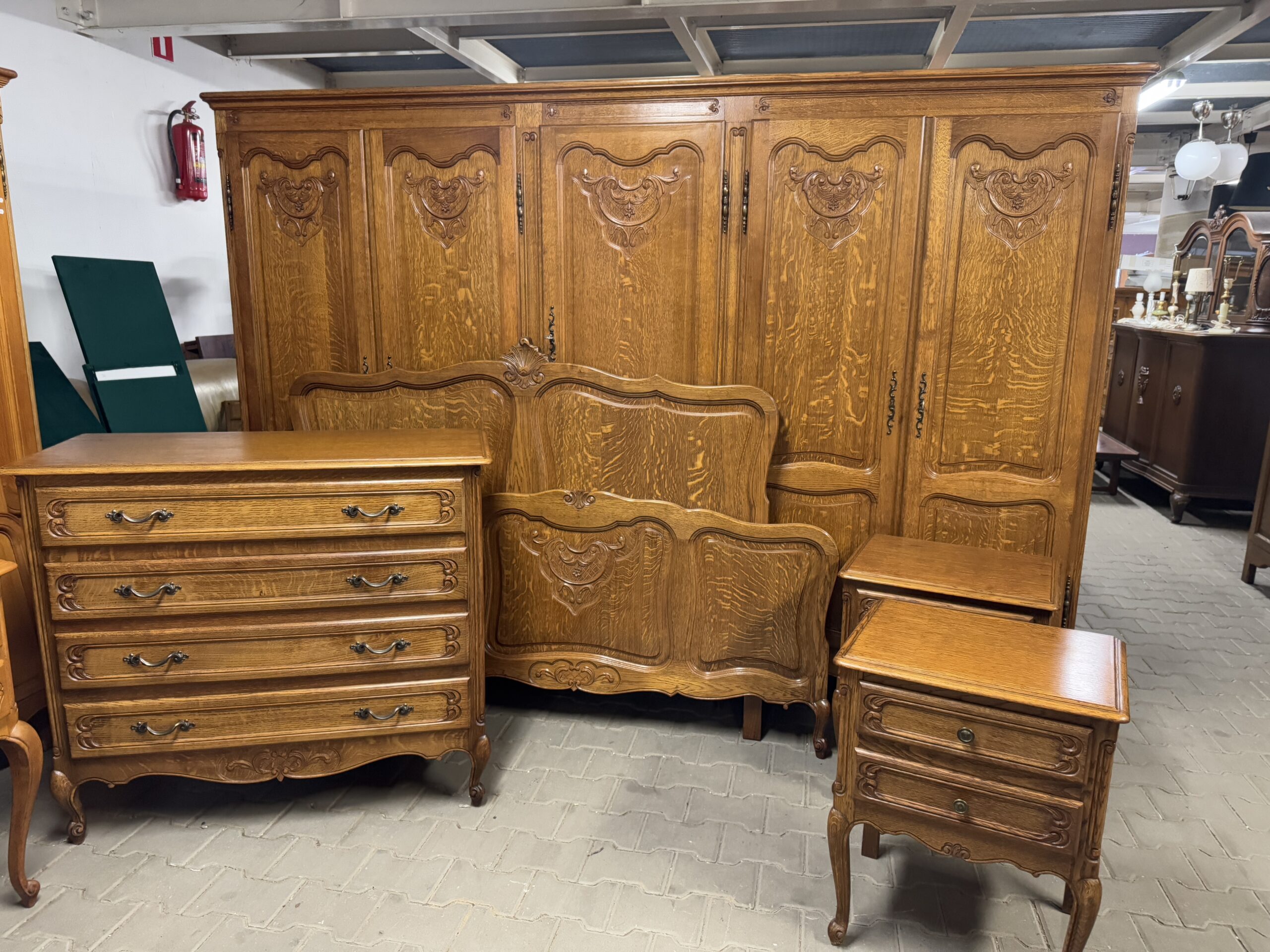 Cudowny komplet mebli do sypialni: pięciodrzwiowa szafa, komoda, rama łóżka oraz dwie szafki nocne.