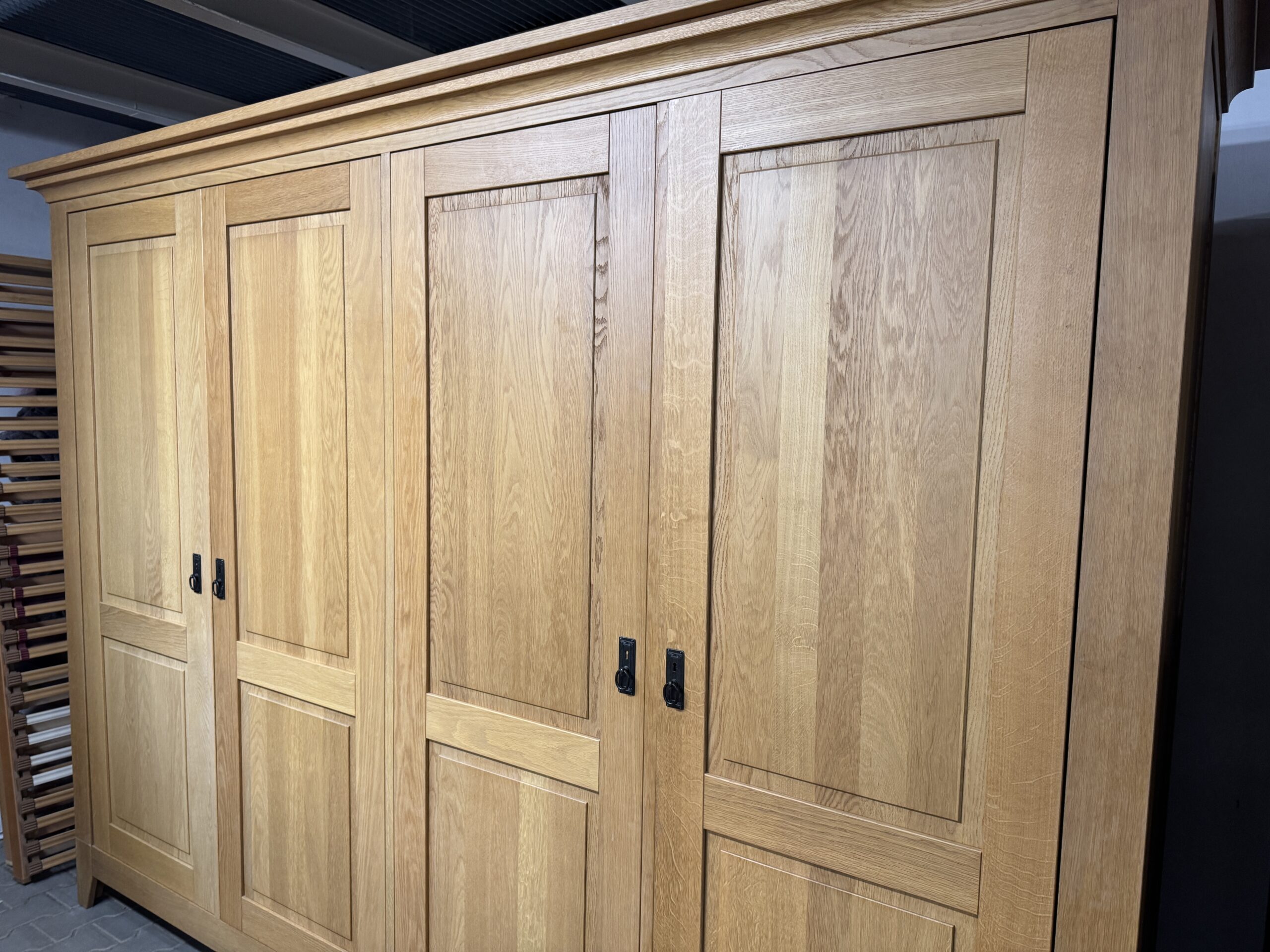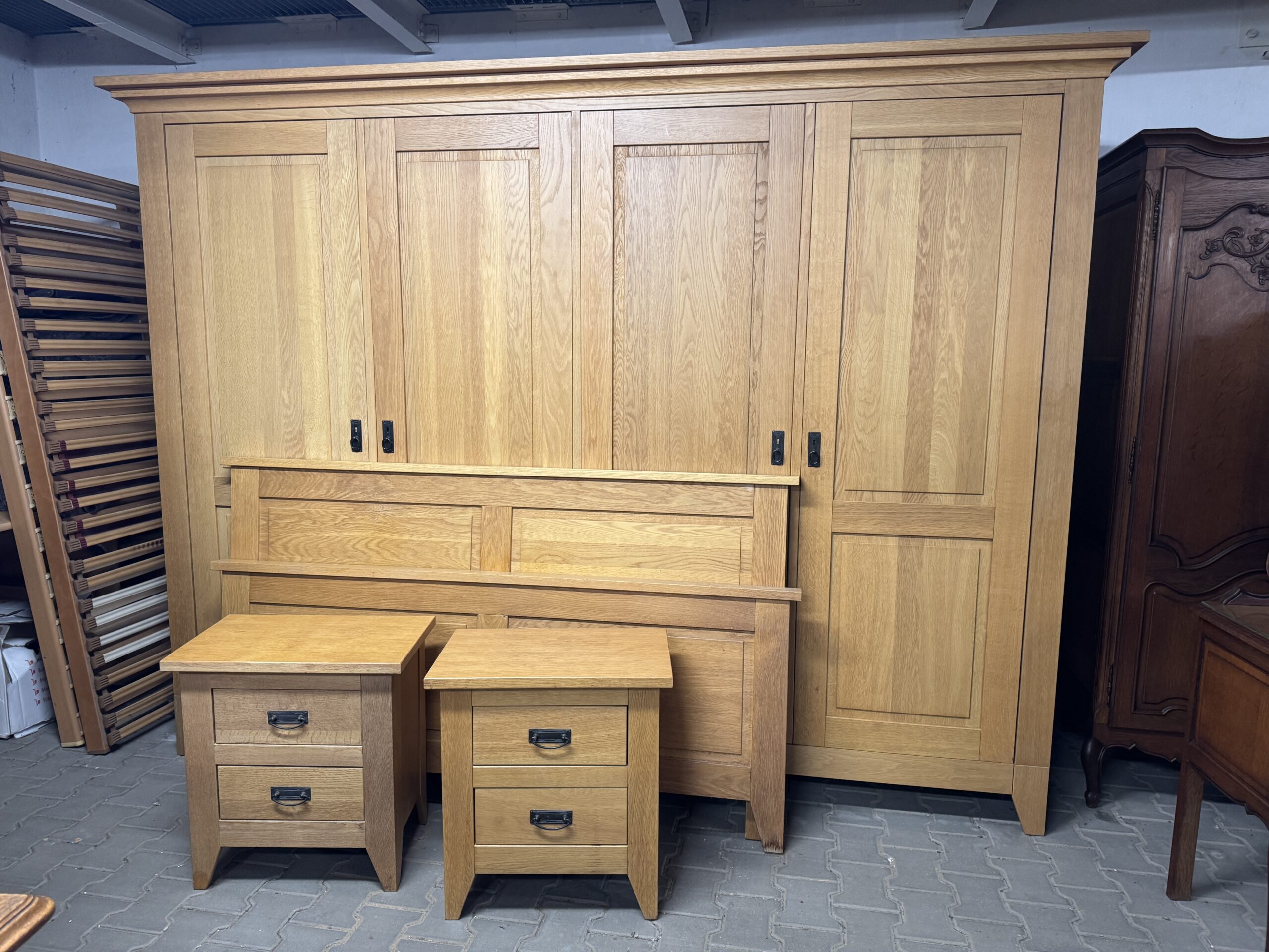 Stylowy komplet do sypialni w jasnym kolorze: czterodrzwiowa szafa, łóżko i dwie szafki nocne.