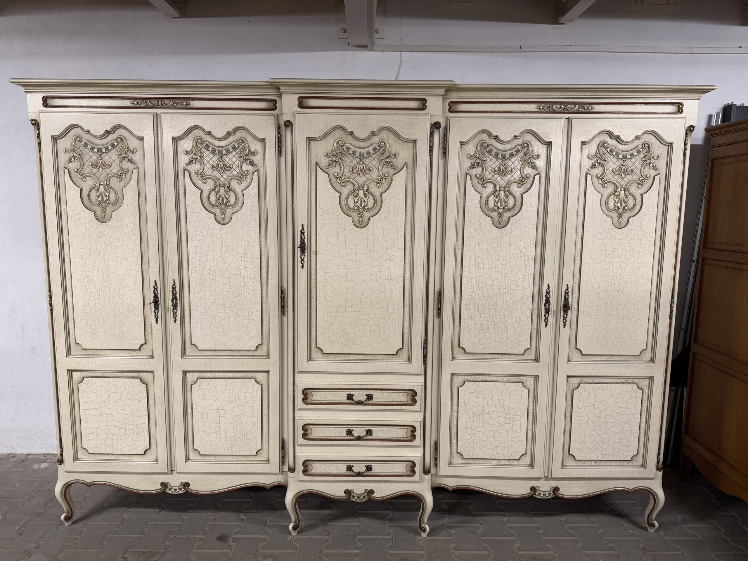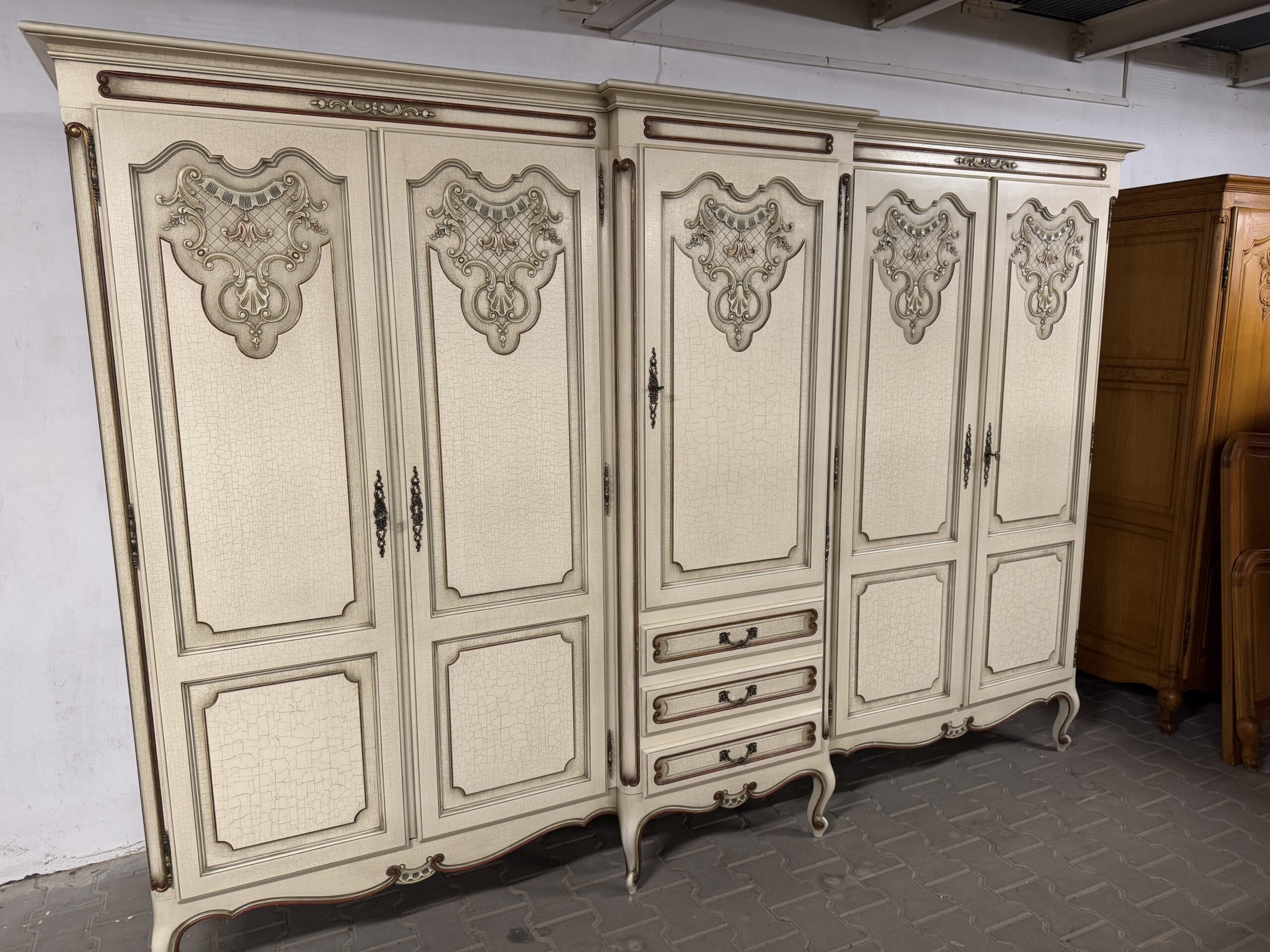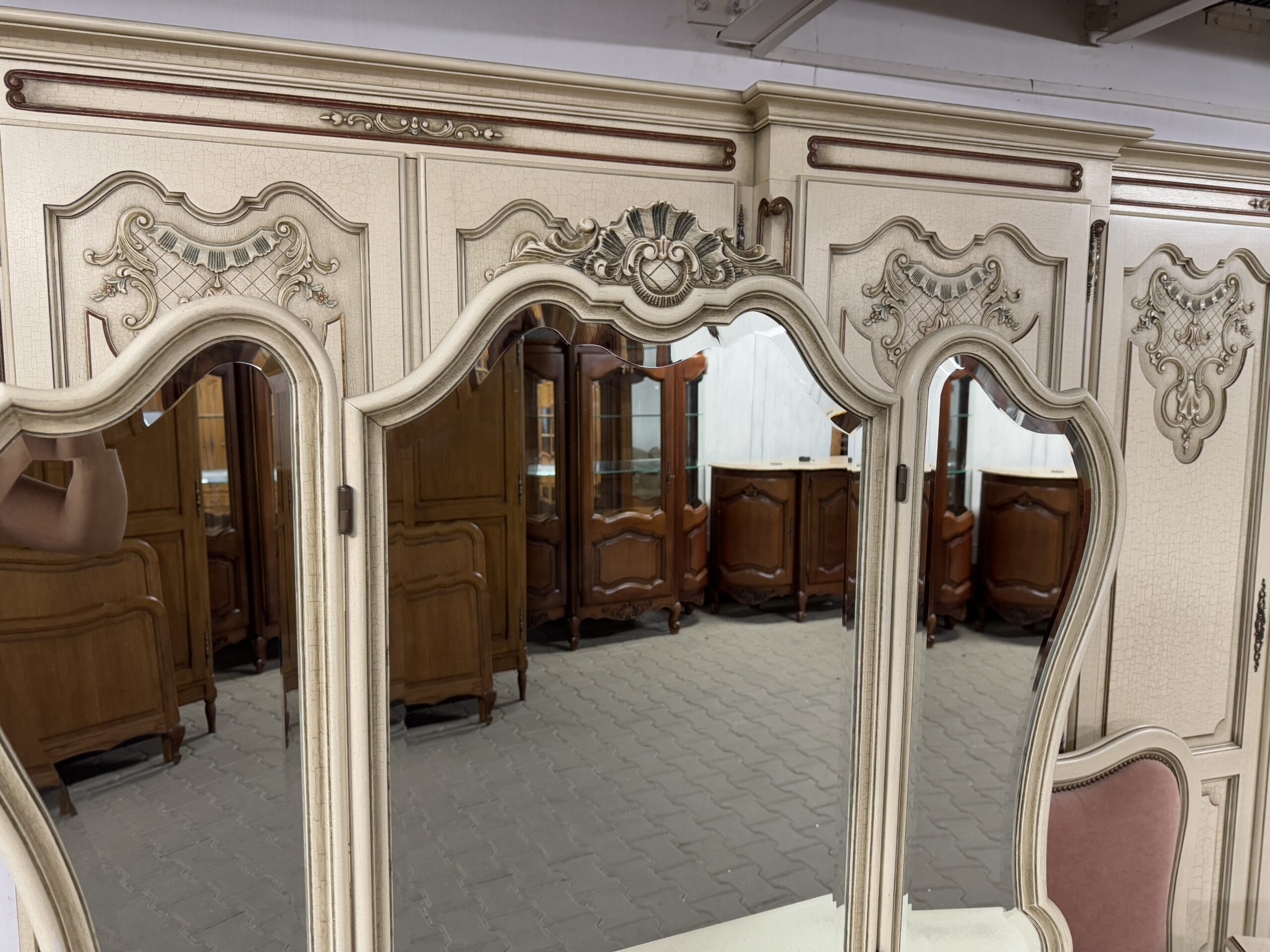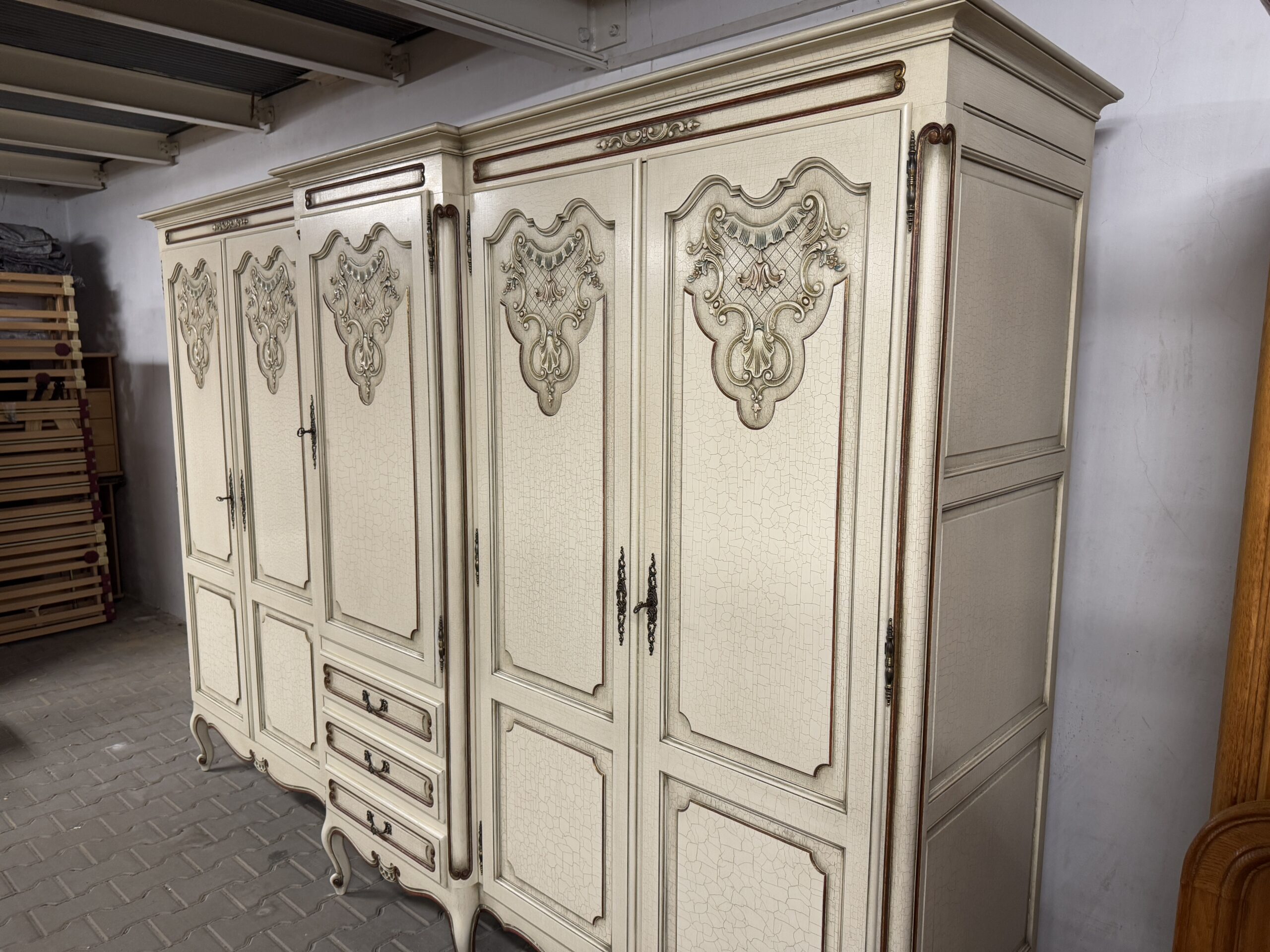 Cudowny zestaw mebli do sypialni: pięciodrzwiowa szafa, łóżko ze stelażem, dwie szafki nocne oraz toaletka.