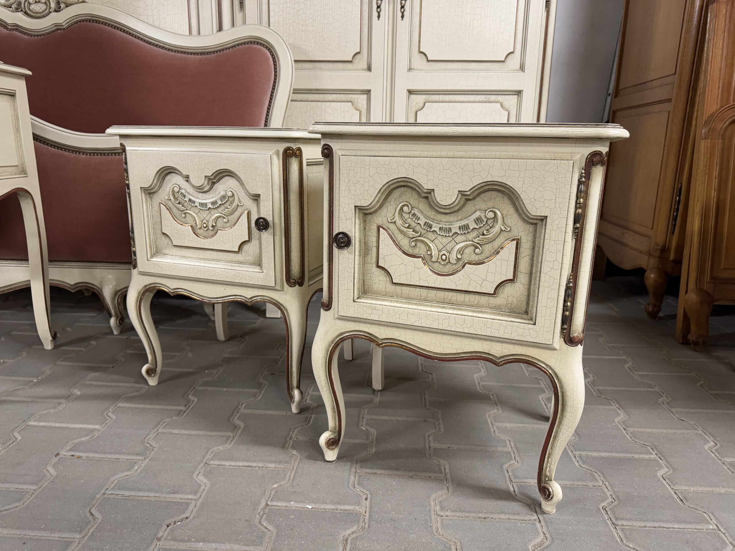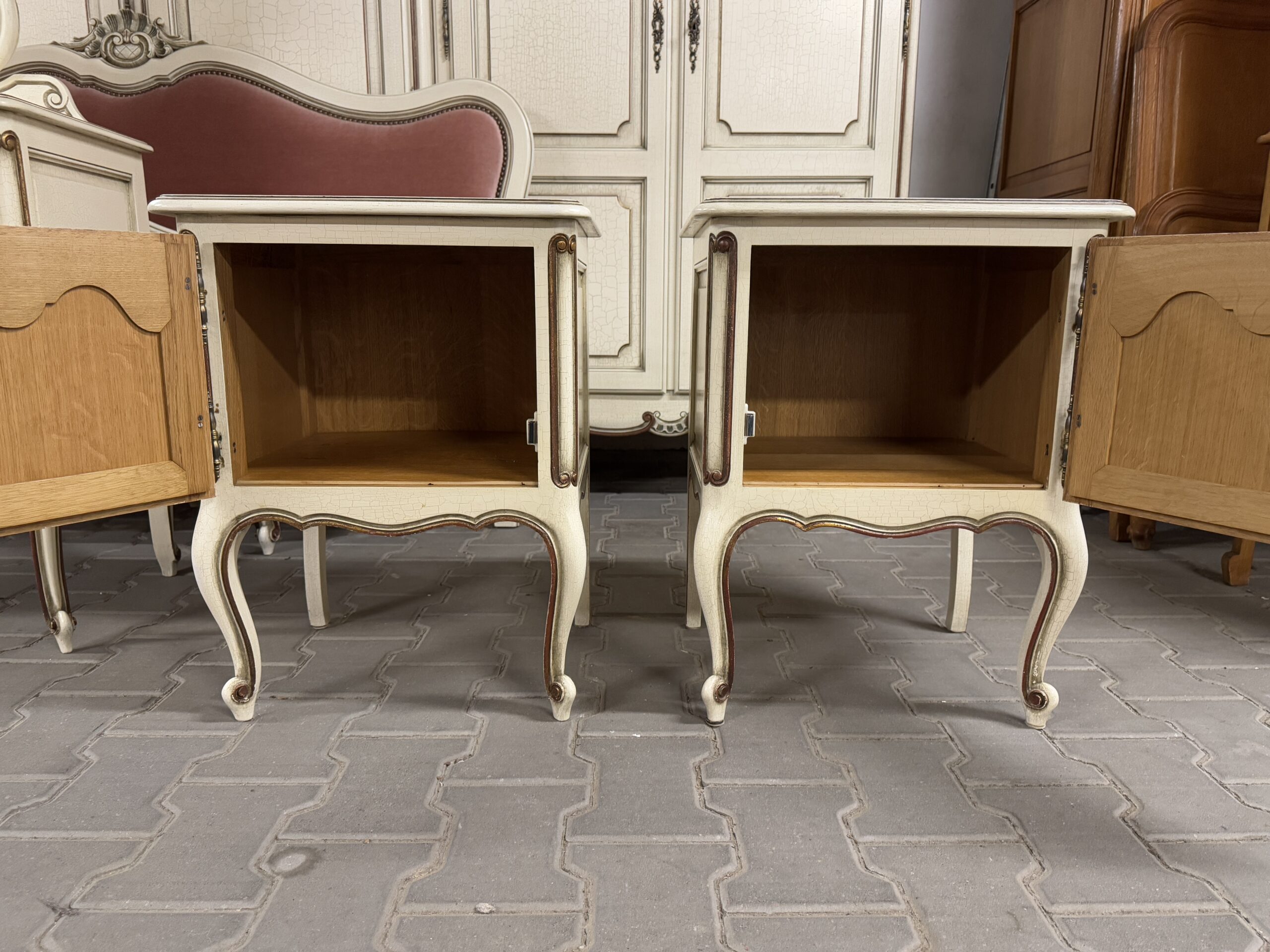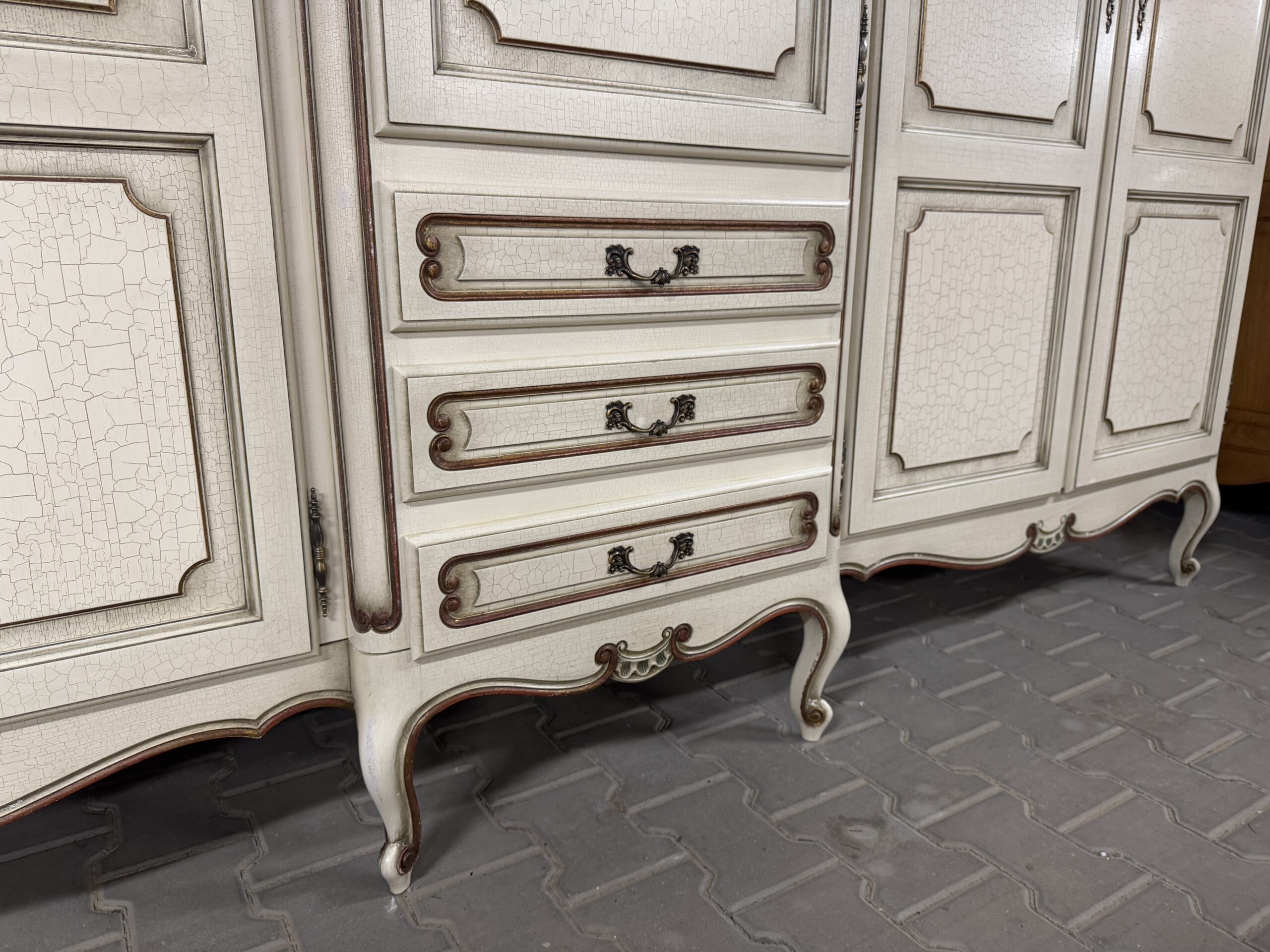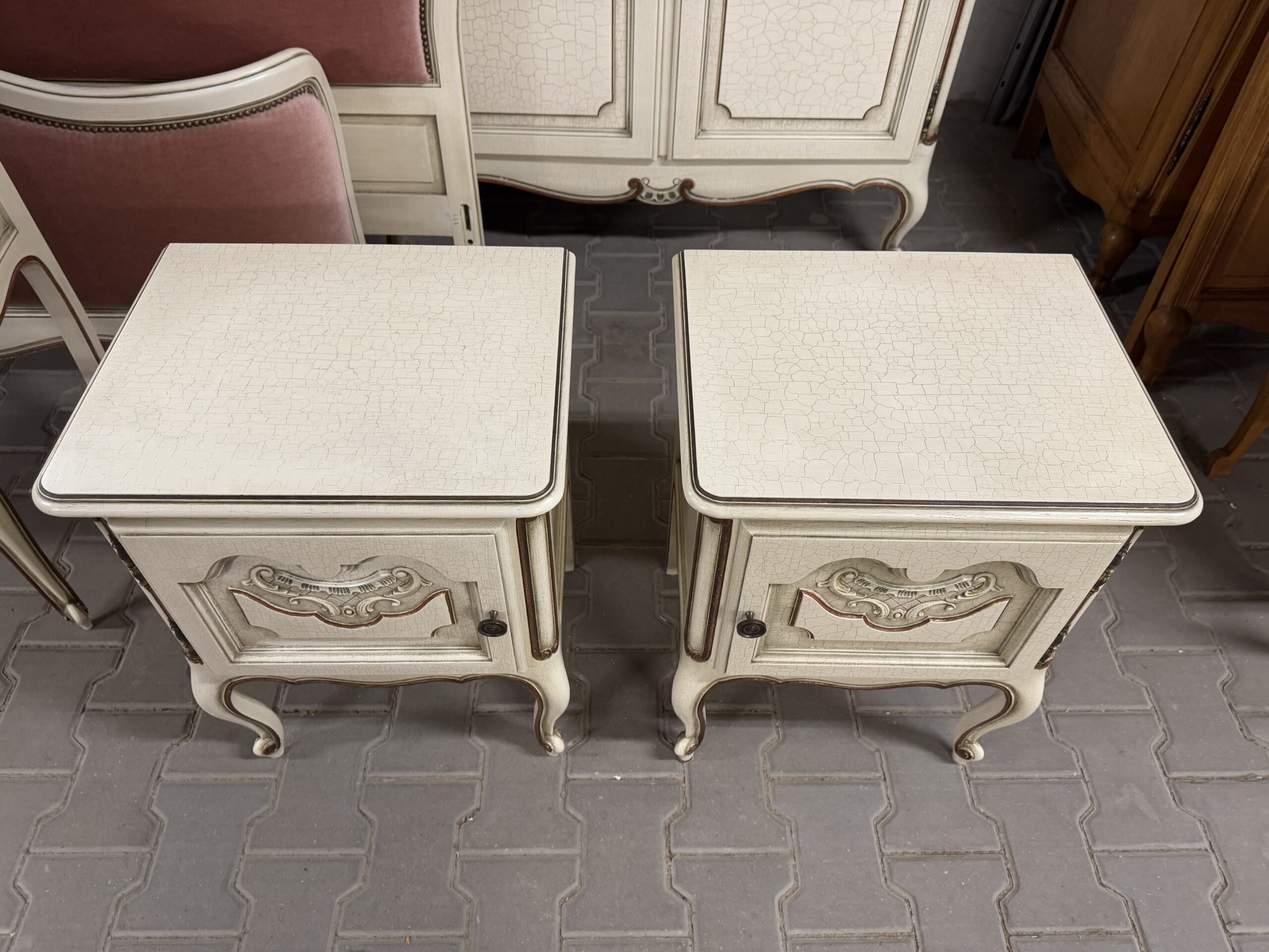 Meble robione z drewna dębowego, malowane na kolor biały postarzany.