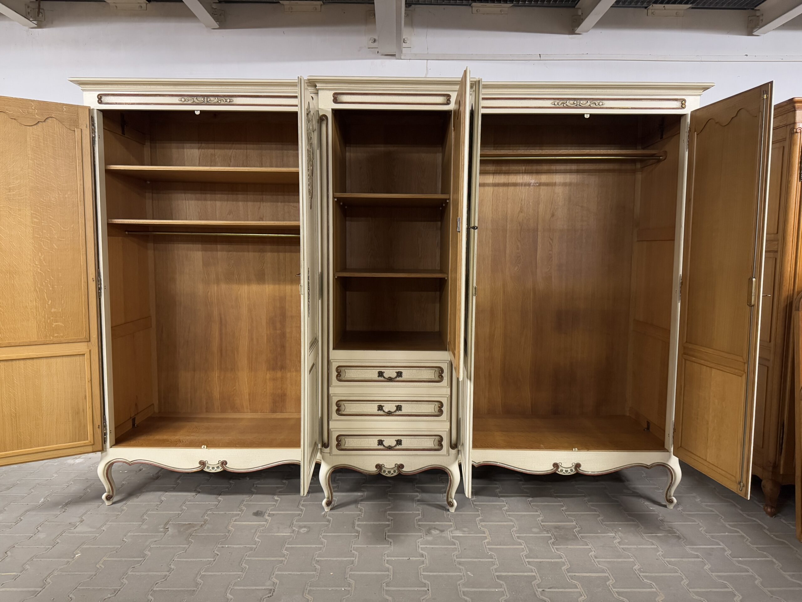 Szafa wyposażona w półki, dwa drążki na wieszaki oraz trzy szuflady.