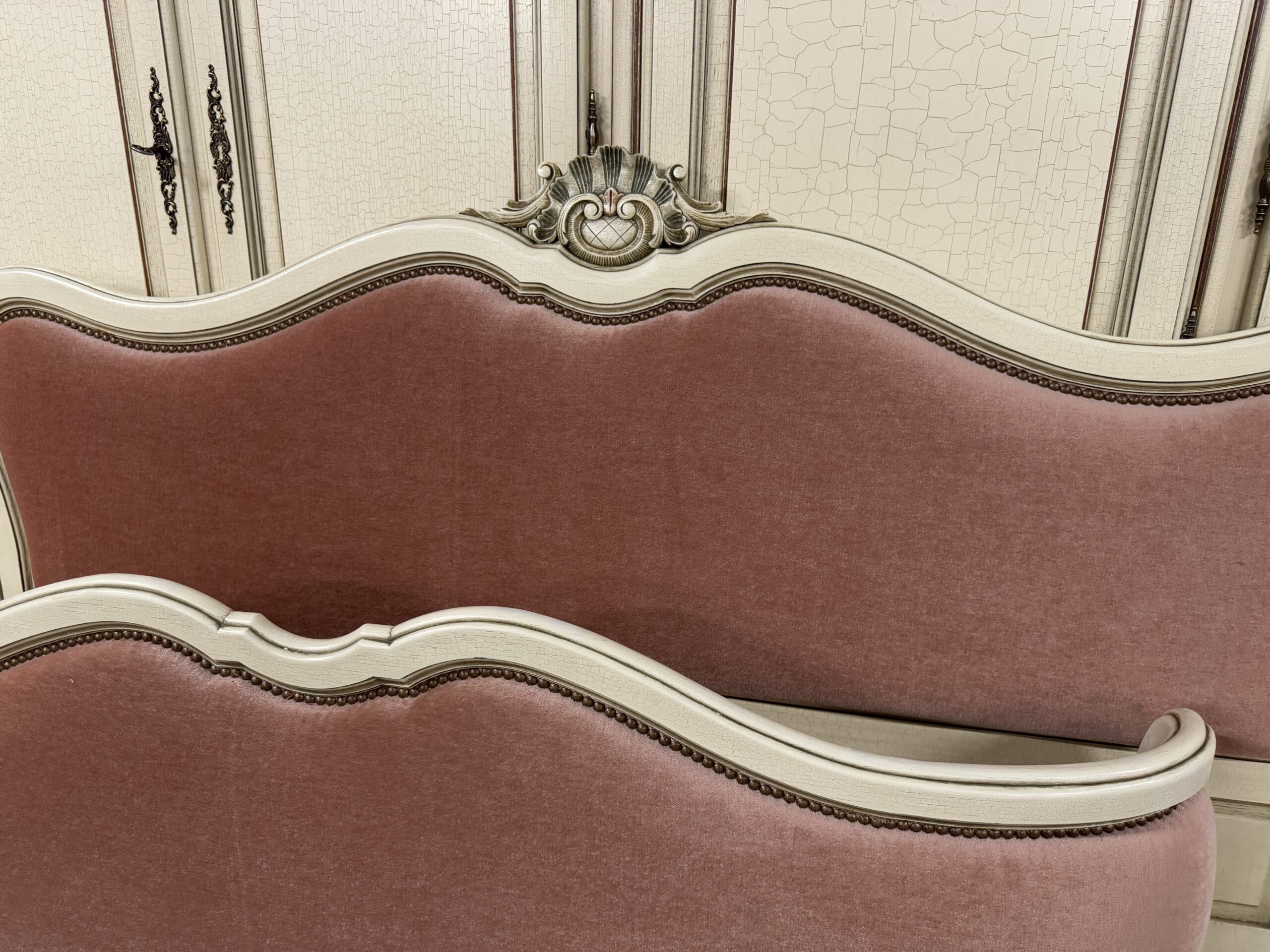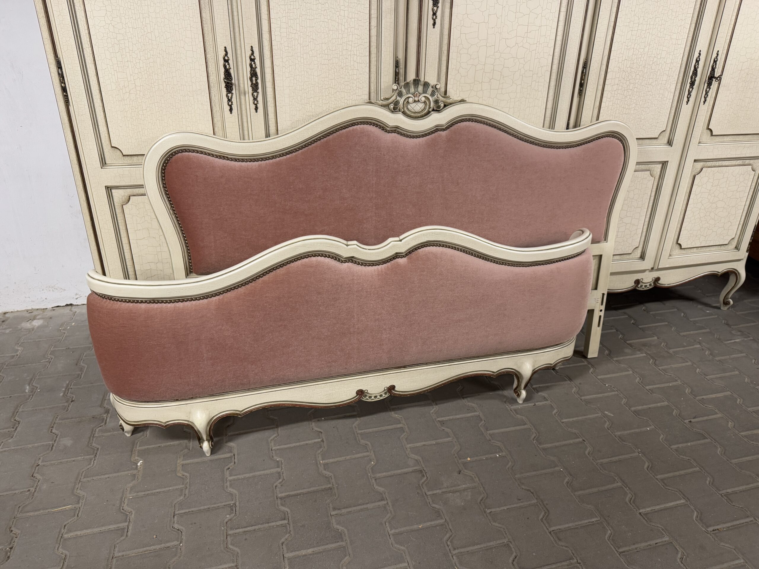 Zagłówek i zanóżek łóżka miękkie, tapicerowane stylową tkaniną w różowym kolorze.