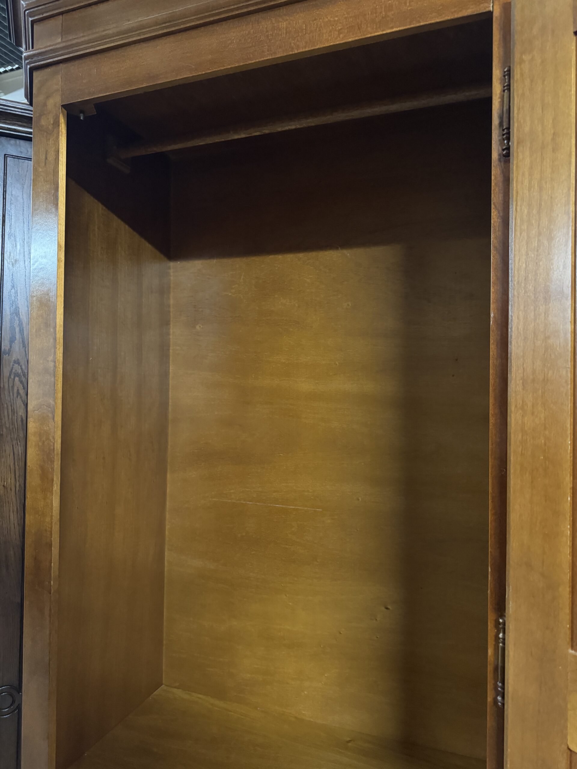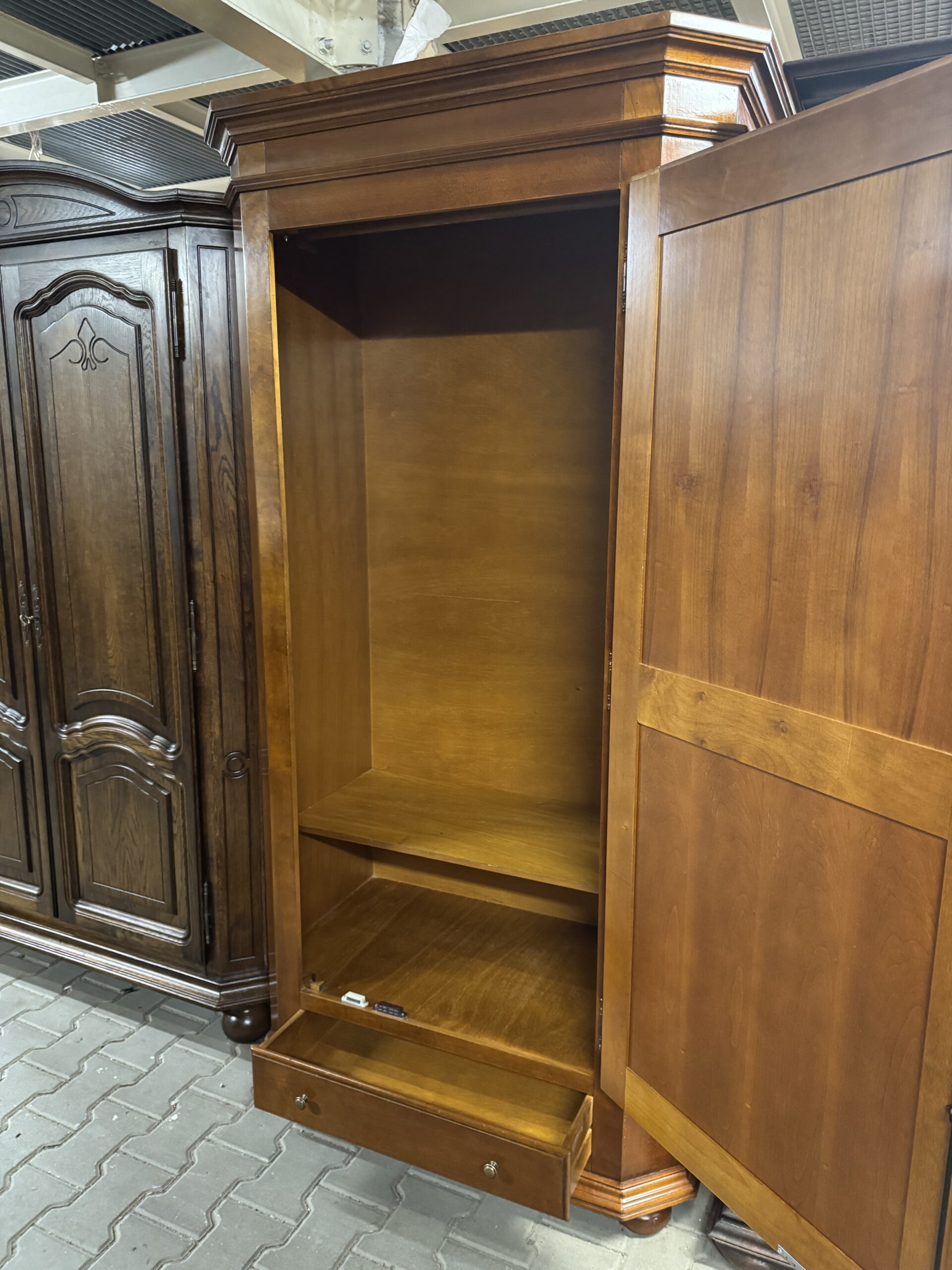 Mebel wyposażony w szufladę na dole, drążek na wieszaki oraz półki.