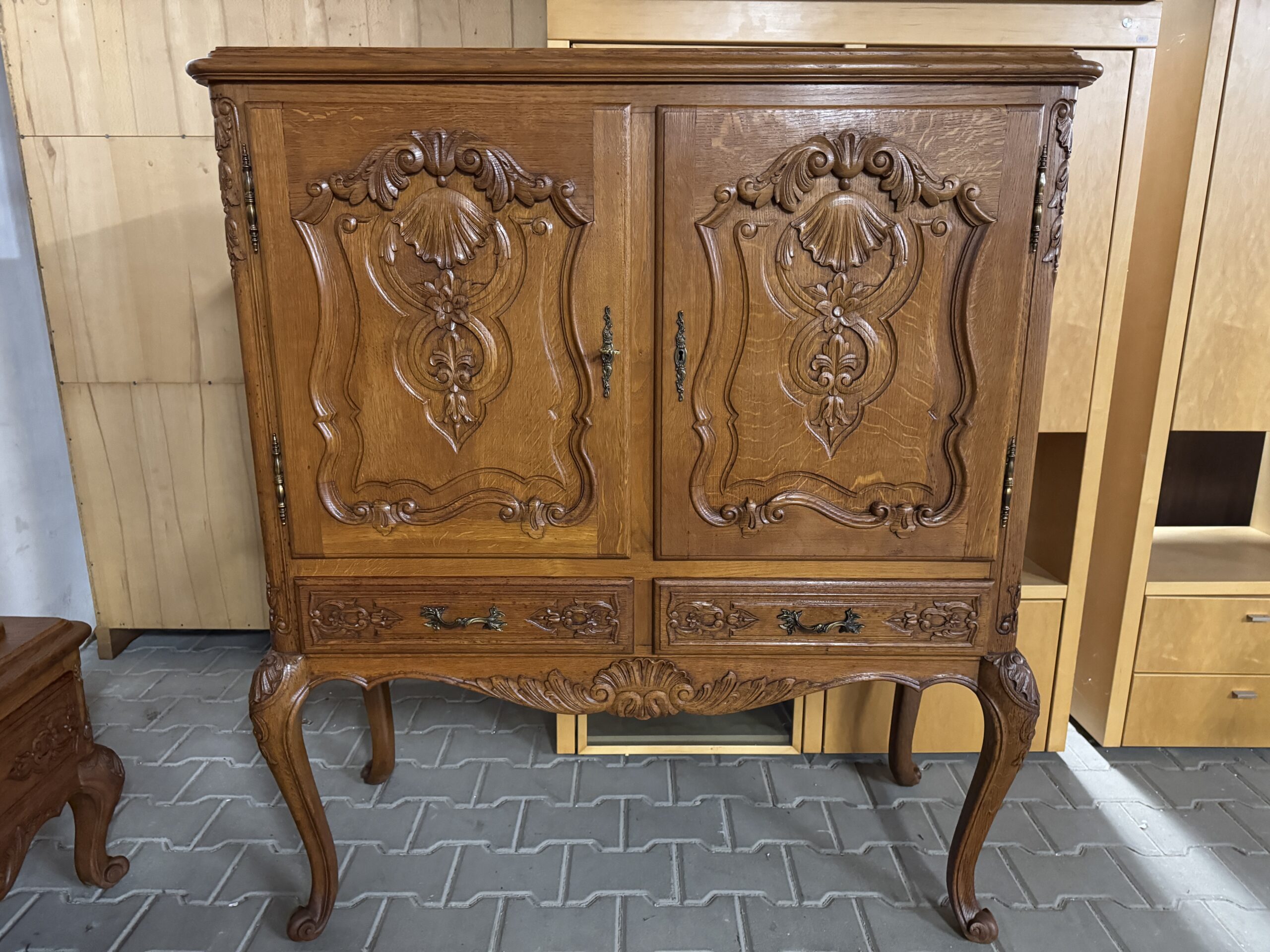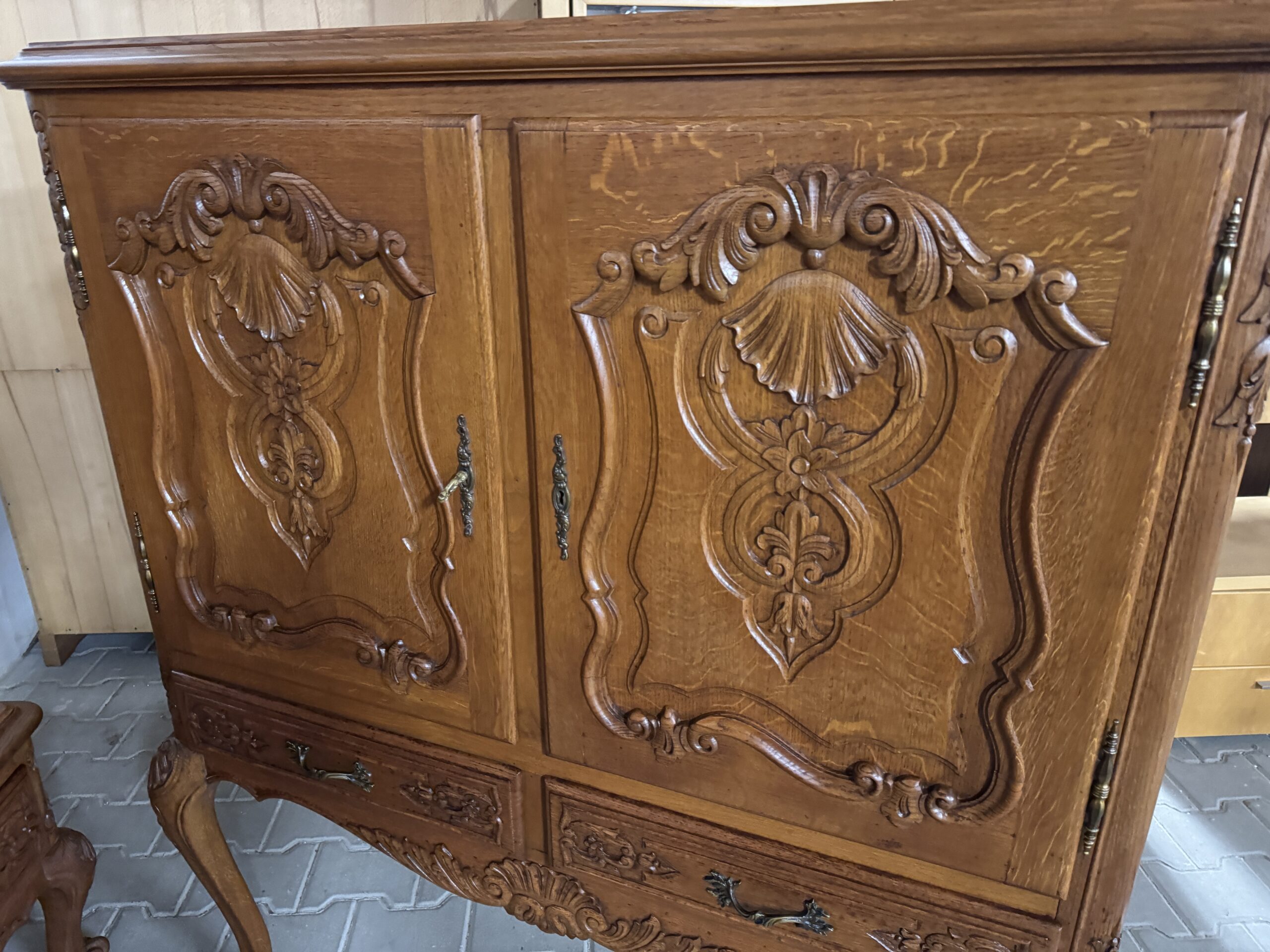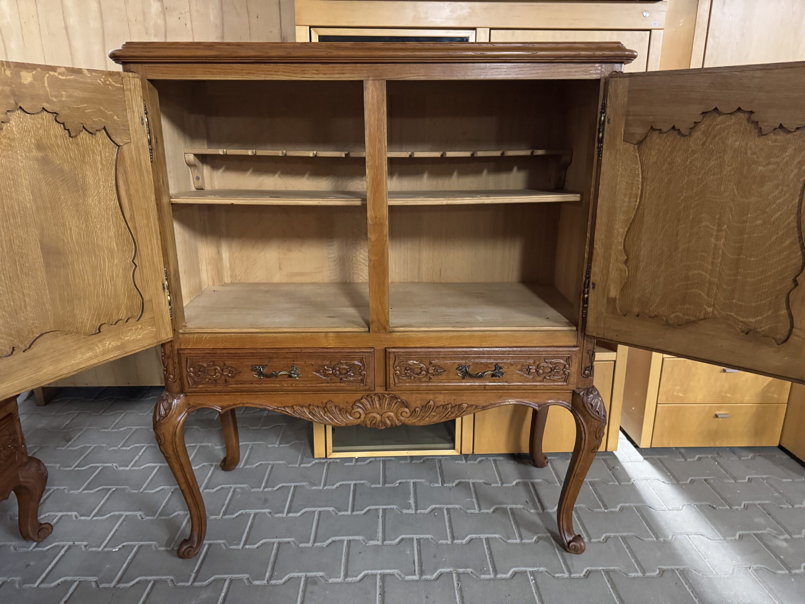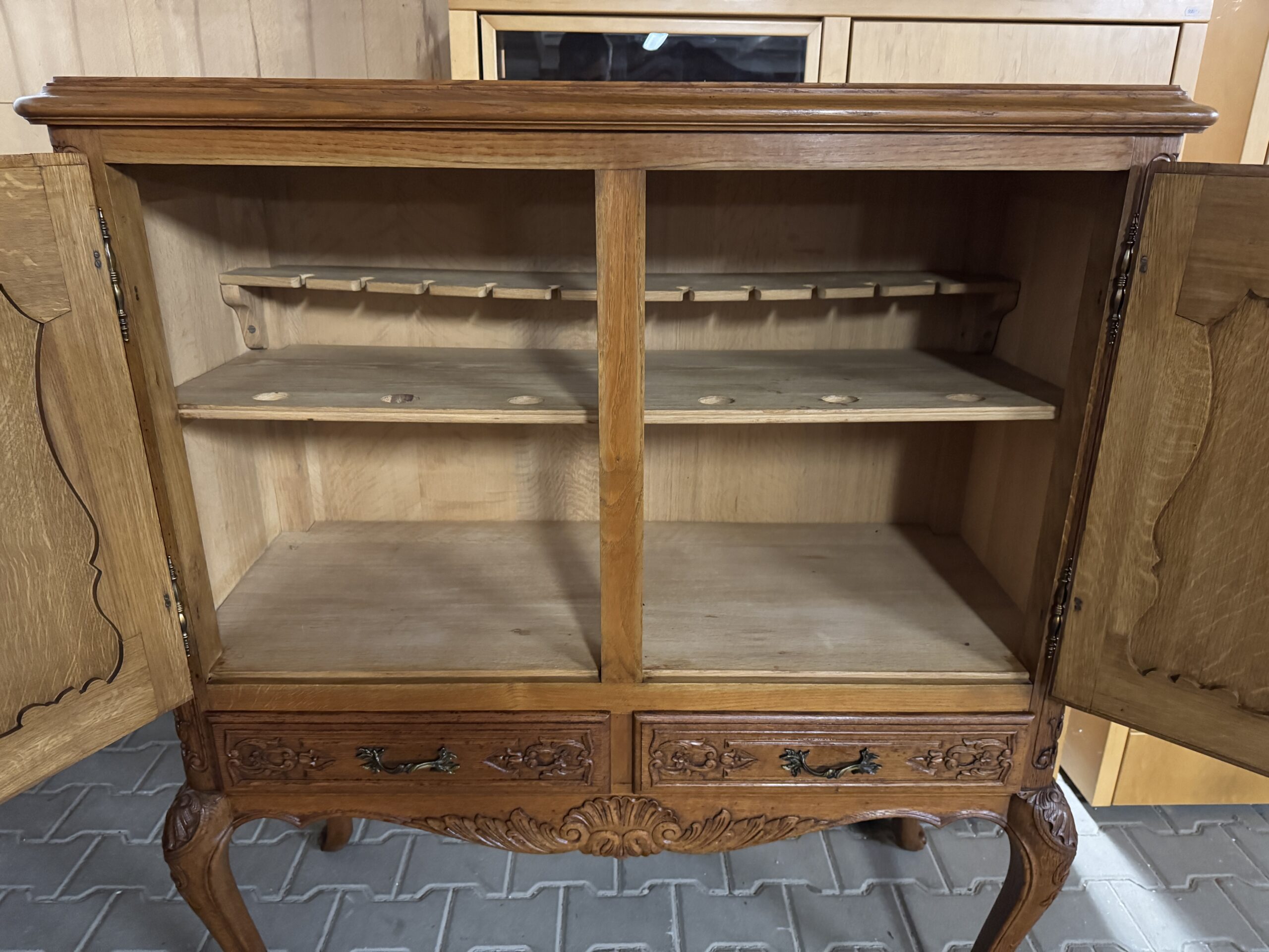 Bufet posiada dwie szuflady na dole oraz półki, w tym na kieliszki.