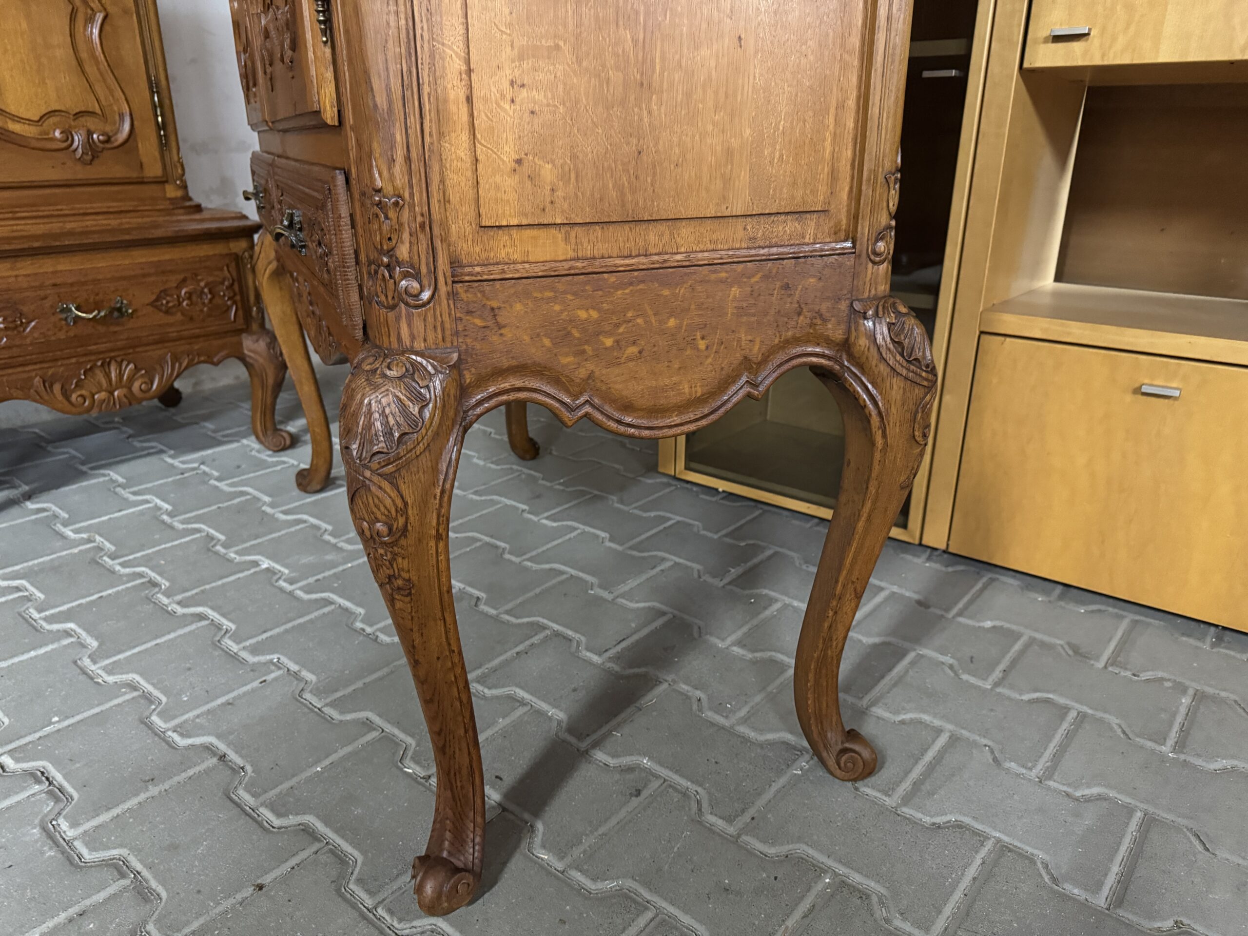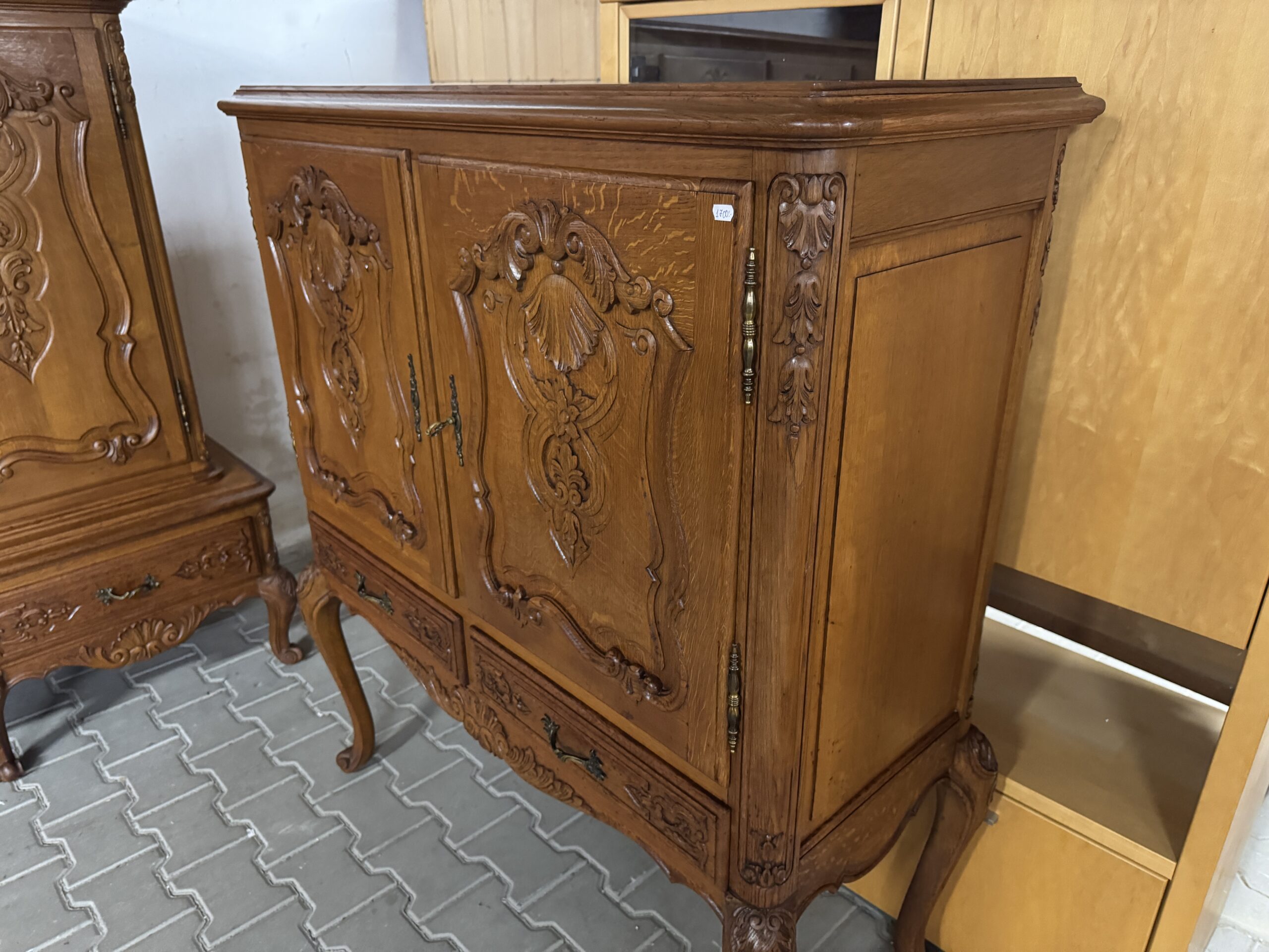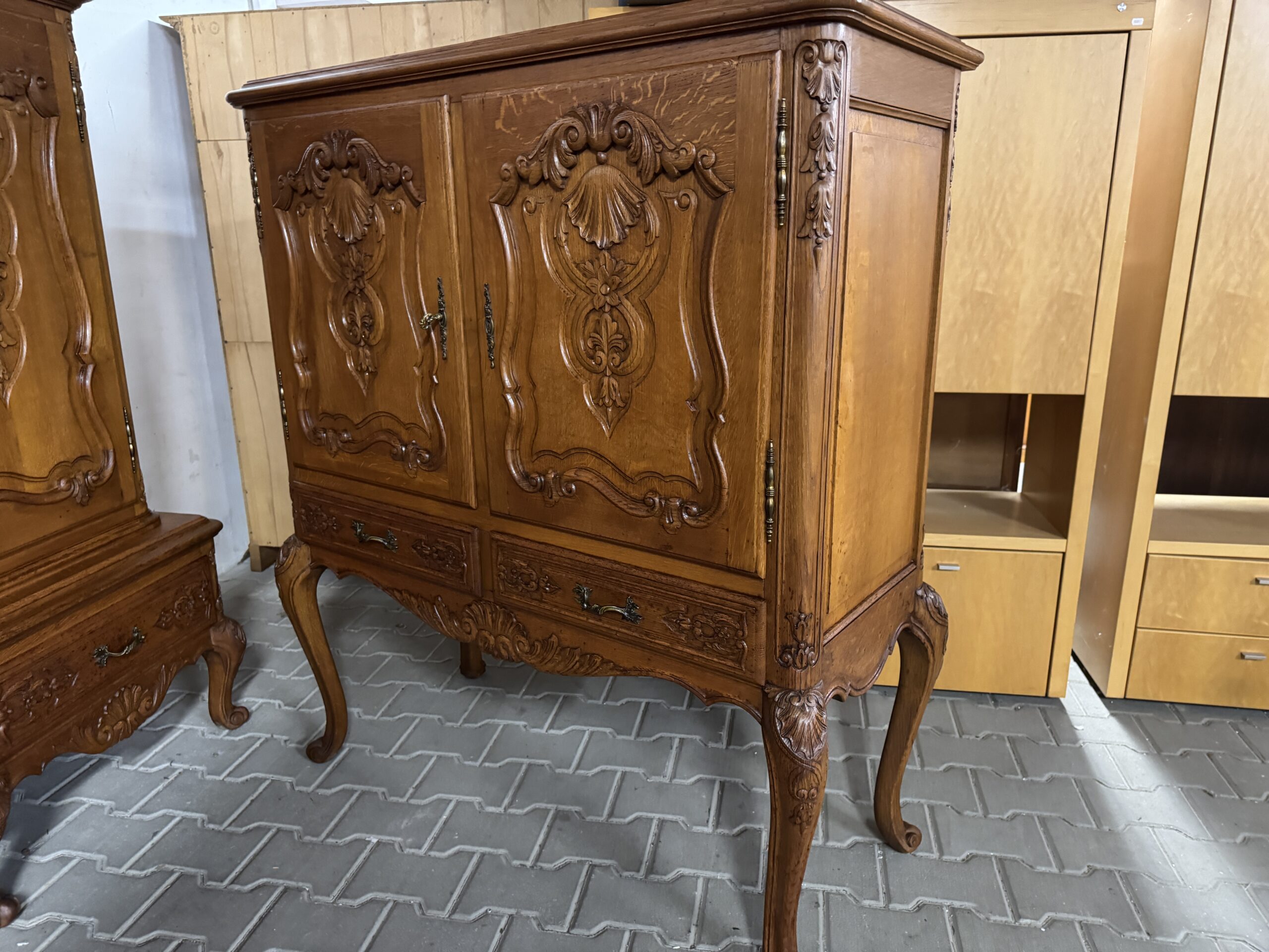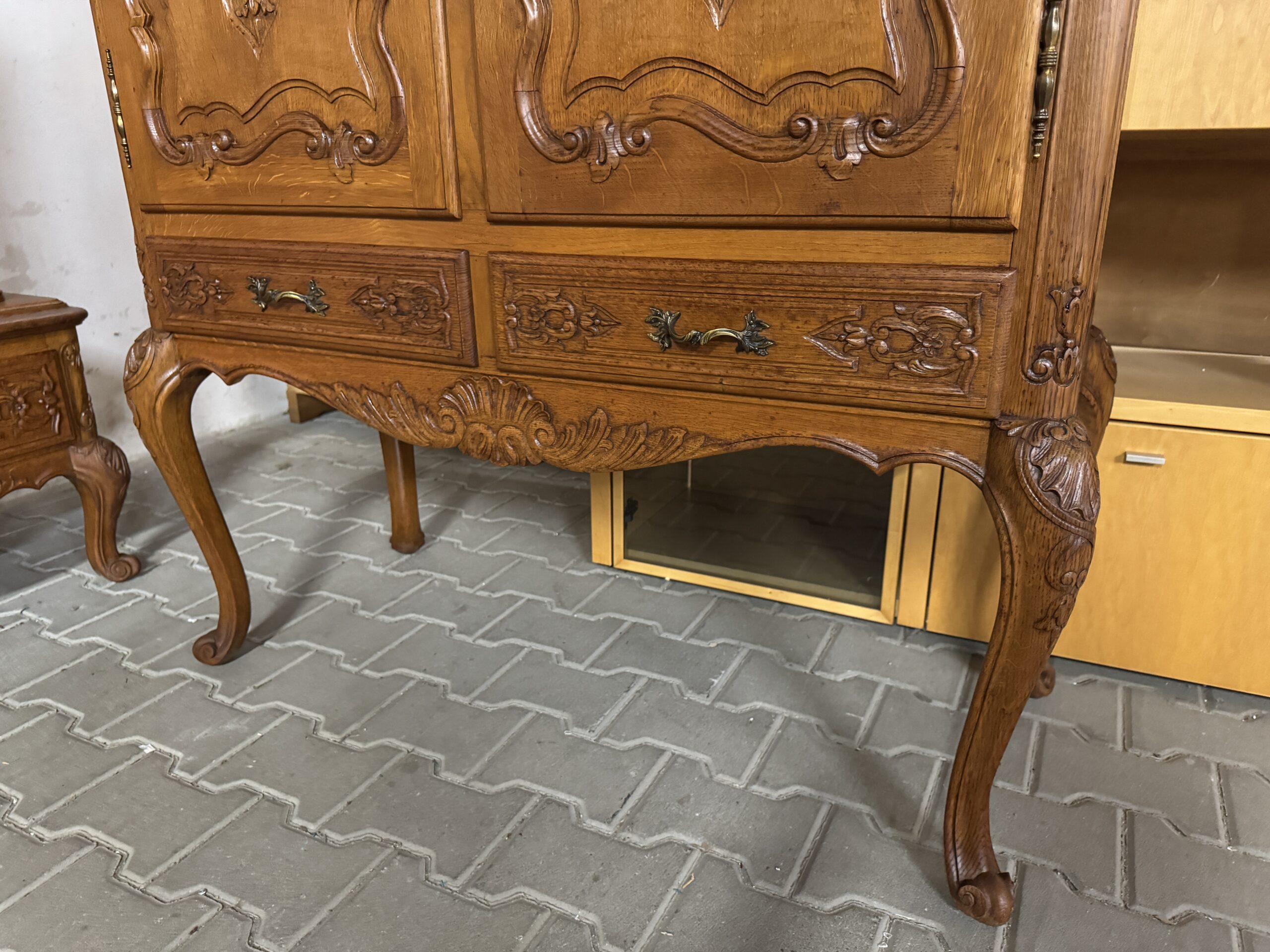 Bufet posiada dwie szuflady na dole oraz półki, w tym na kieliszki.