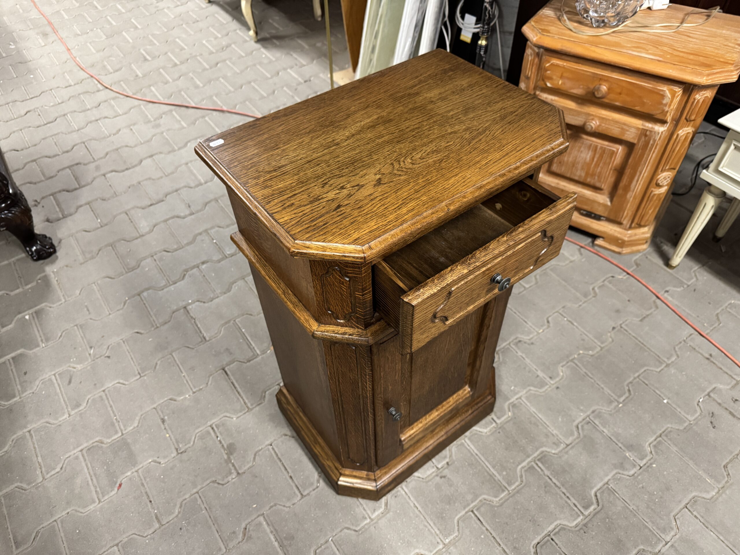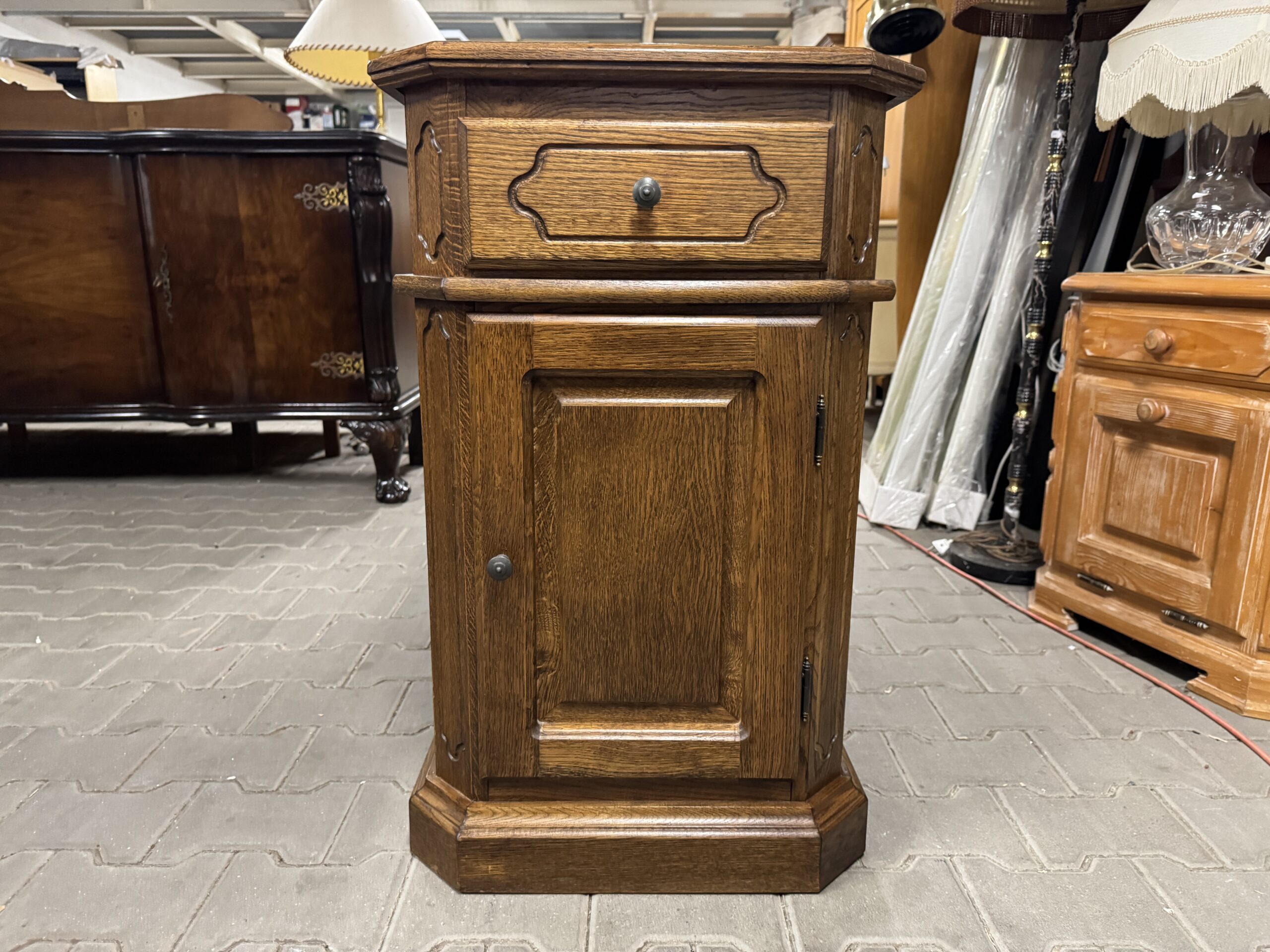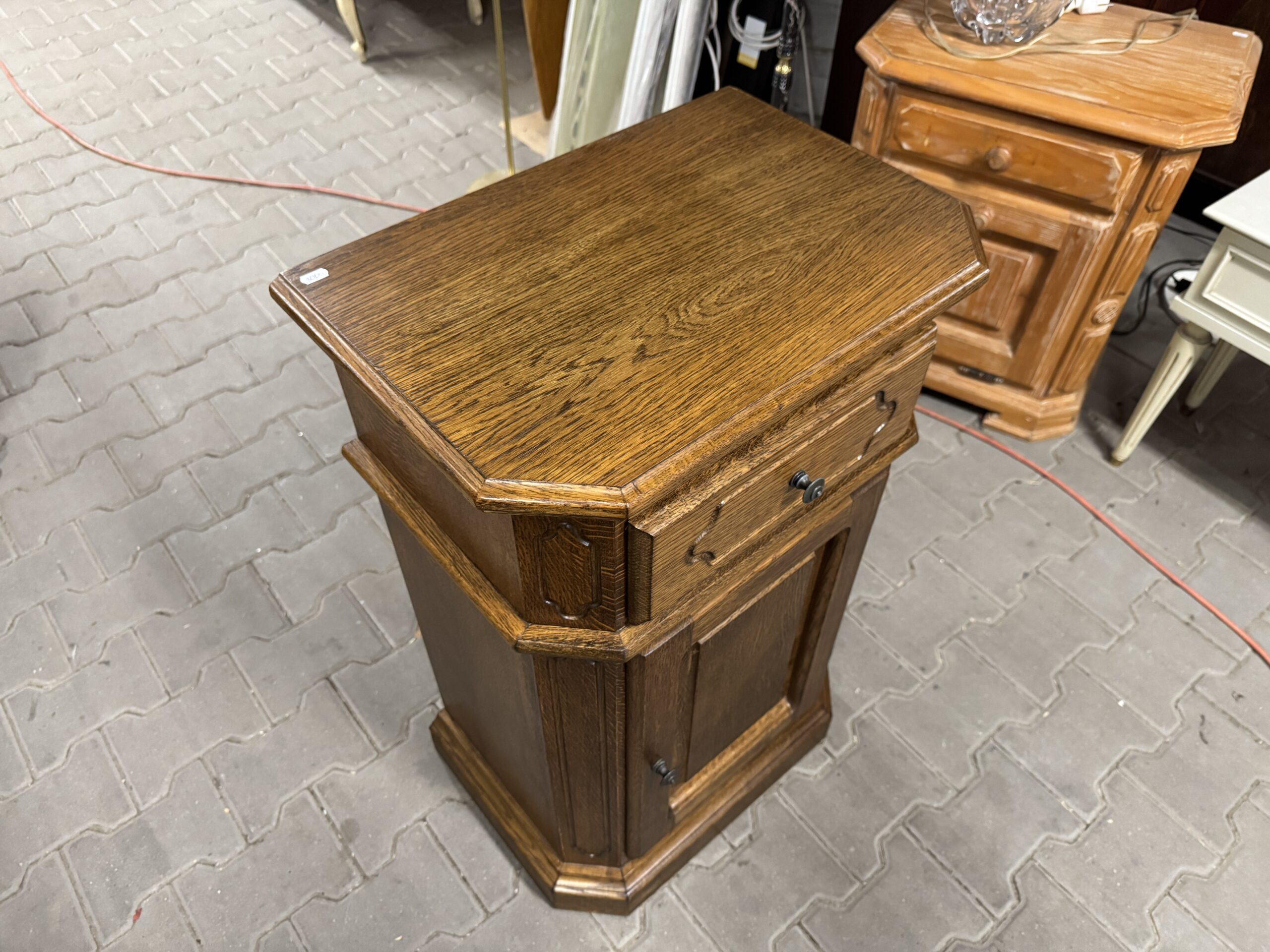 Mebel posiada jedną szufladę na górze oraz zamykane półki.