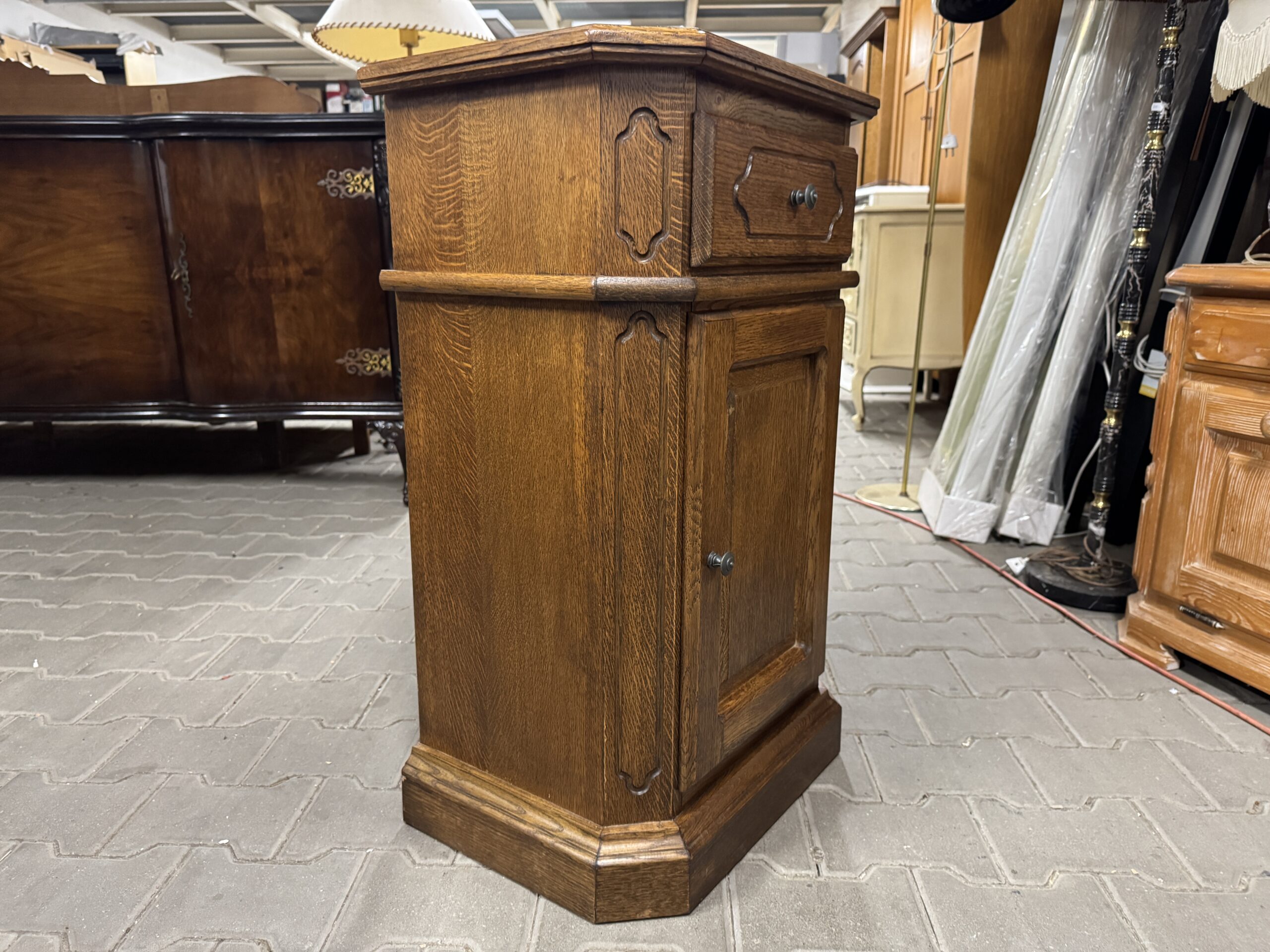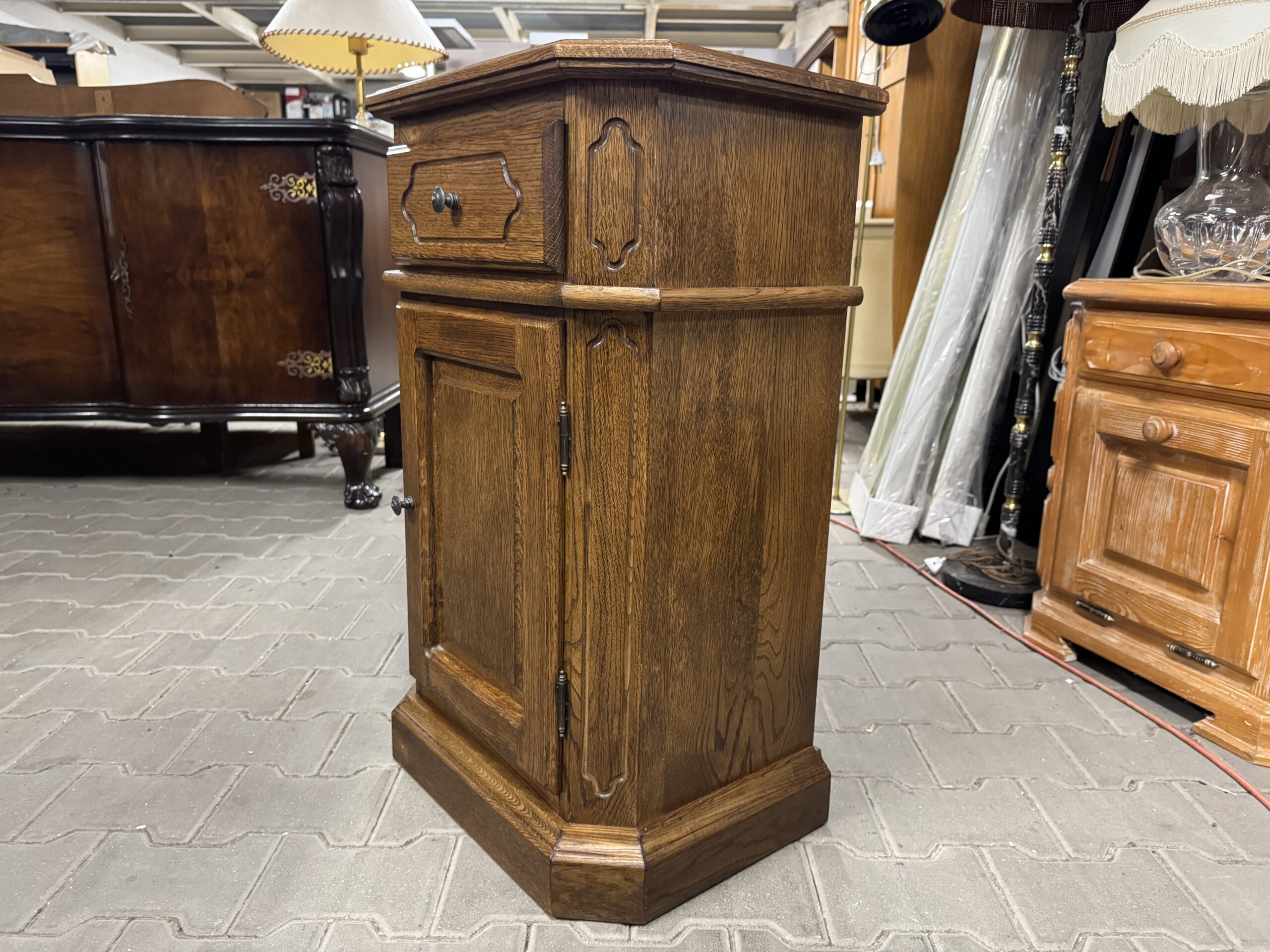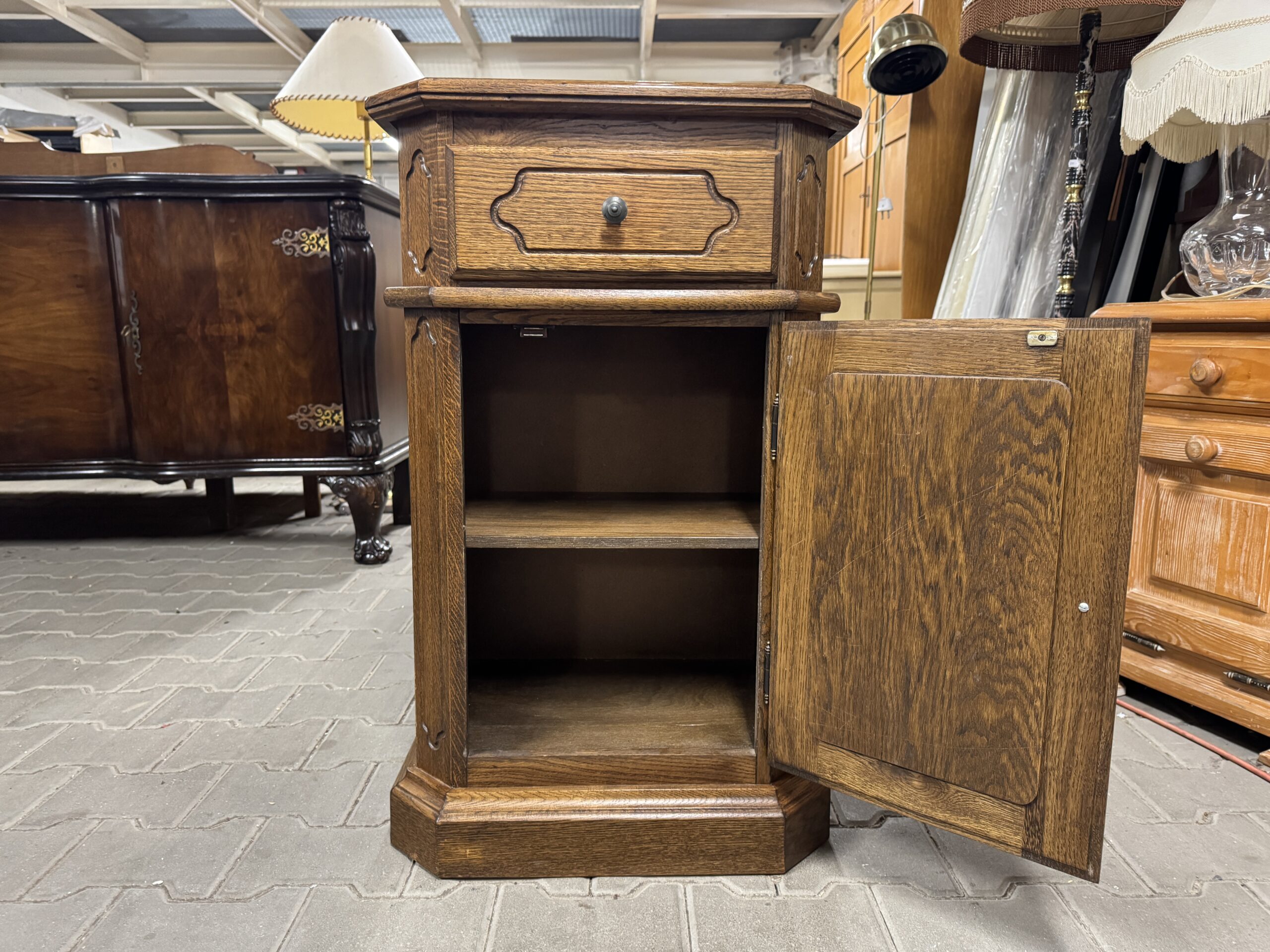 Mebel posiada jedną szufladę na górze oraz zamykane półki.