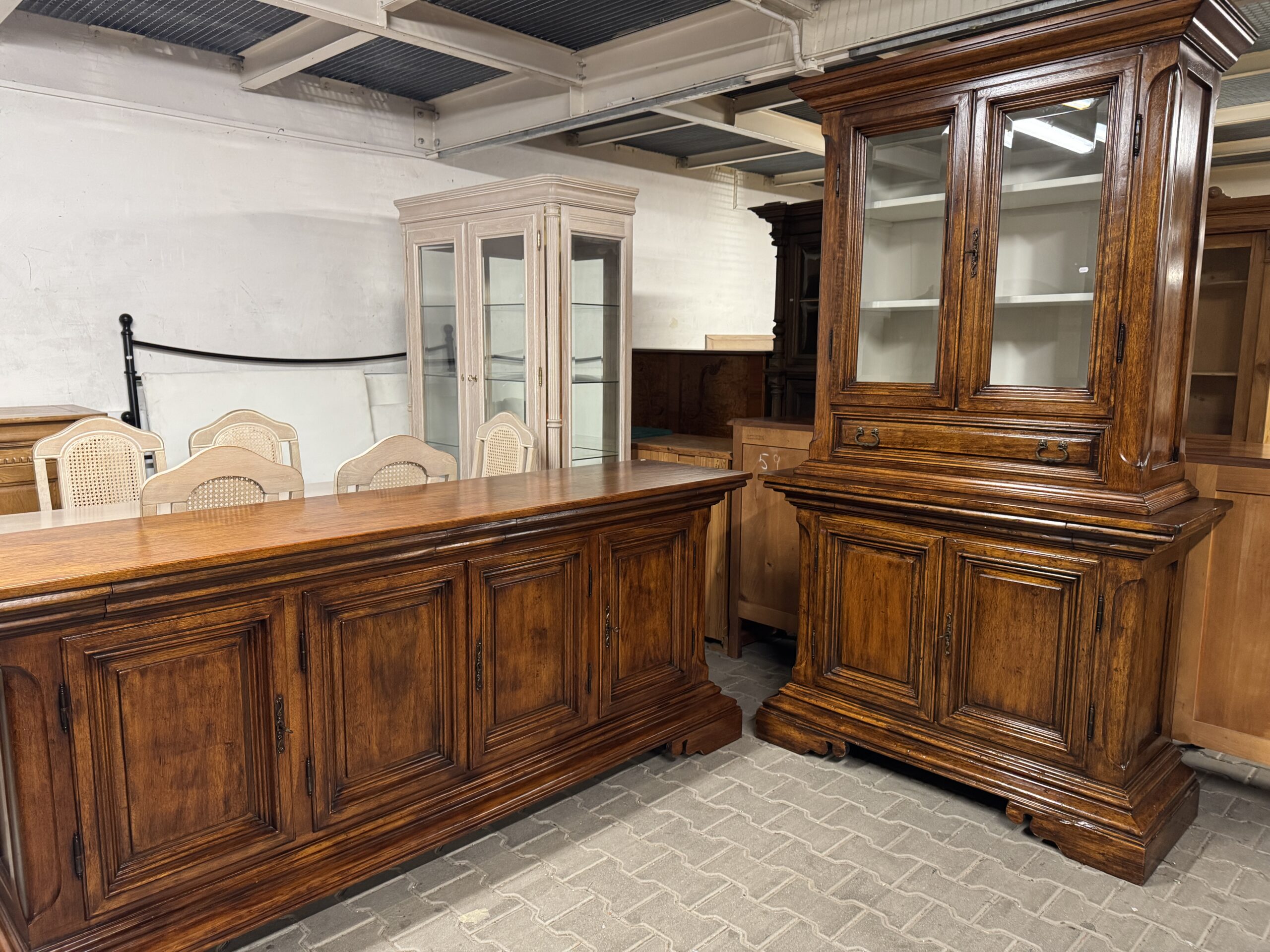 Stylowa witryna z litego drewna w ciemnym kolorze.