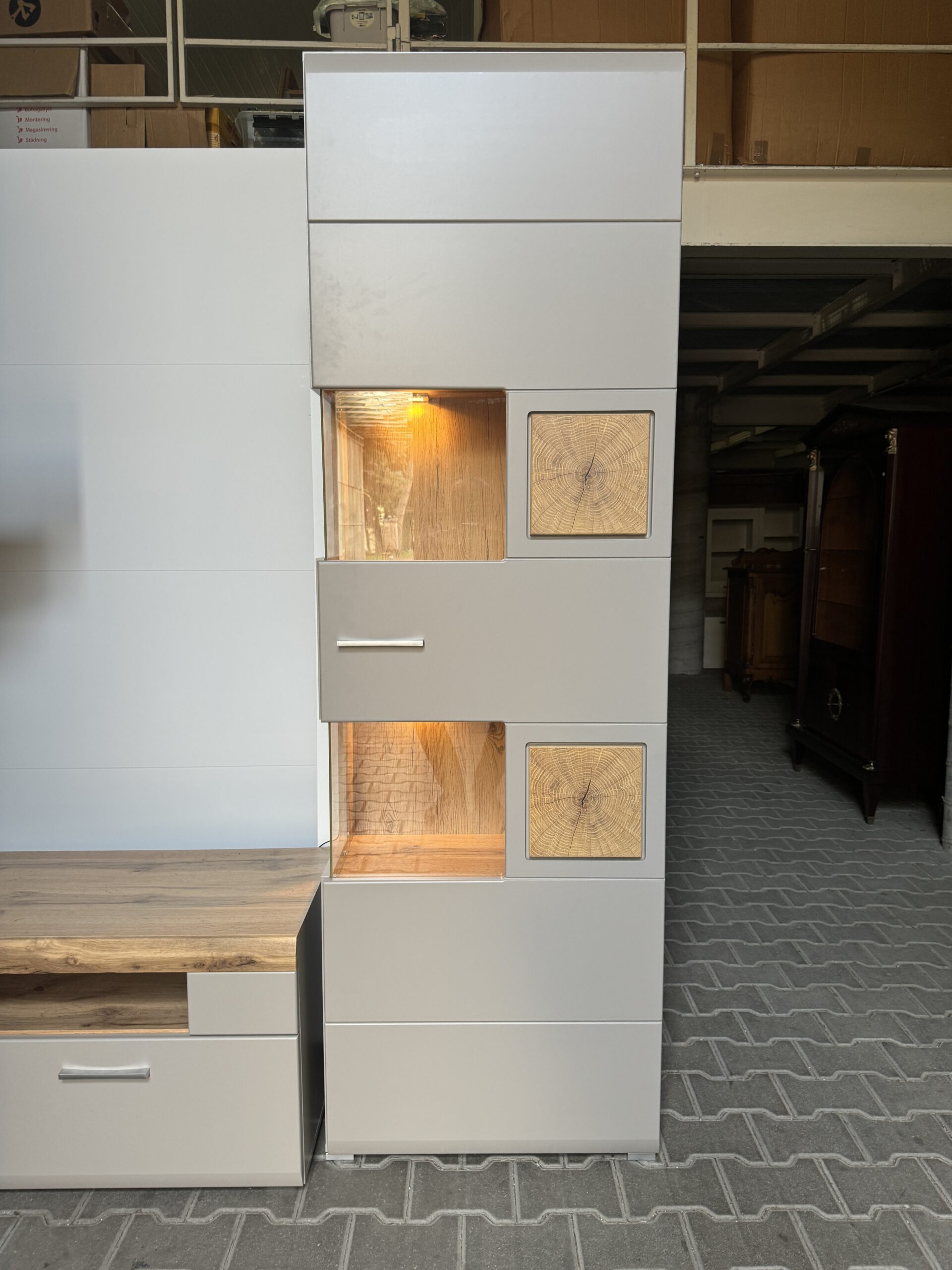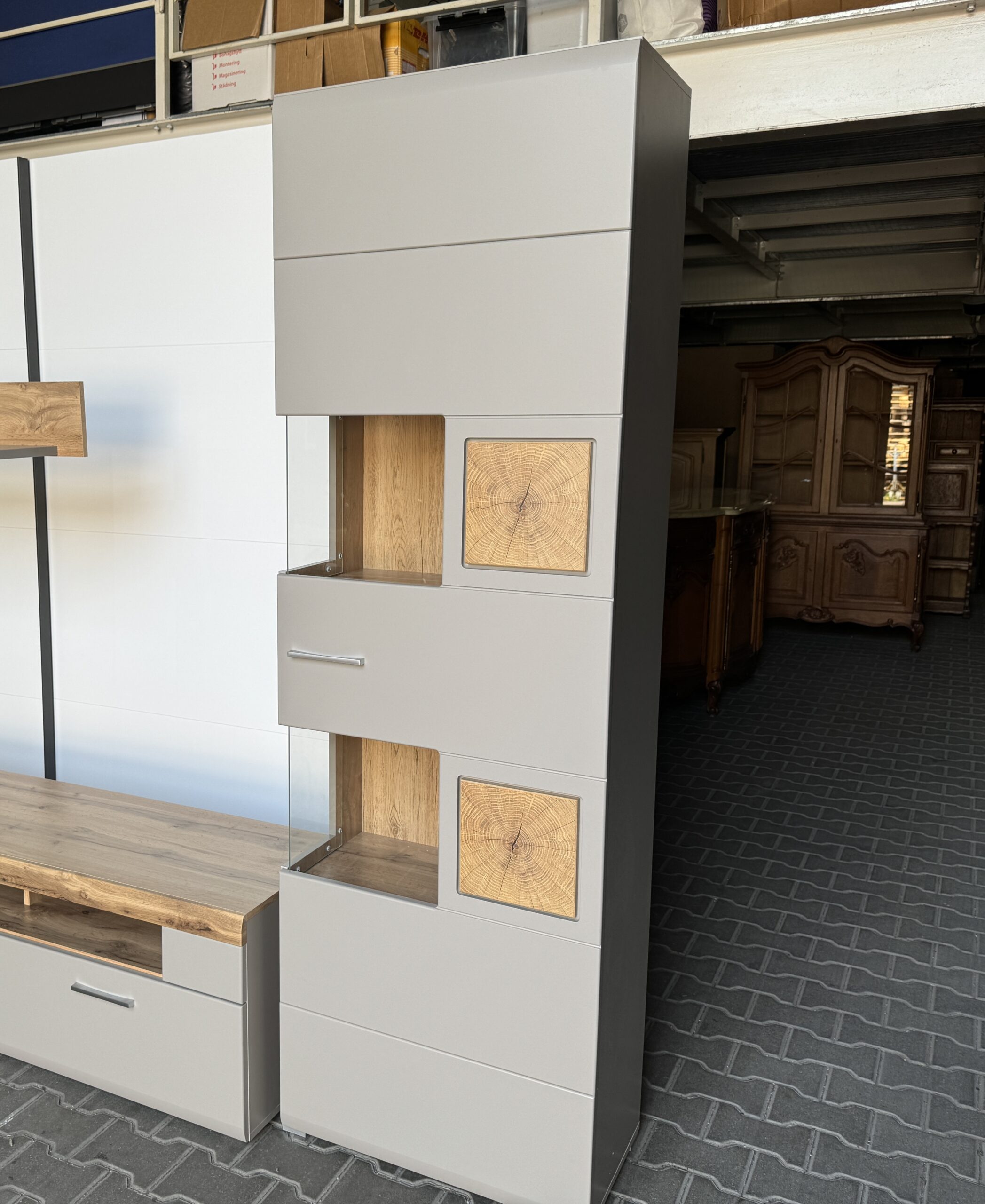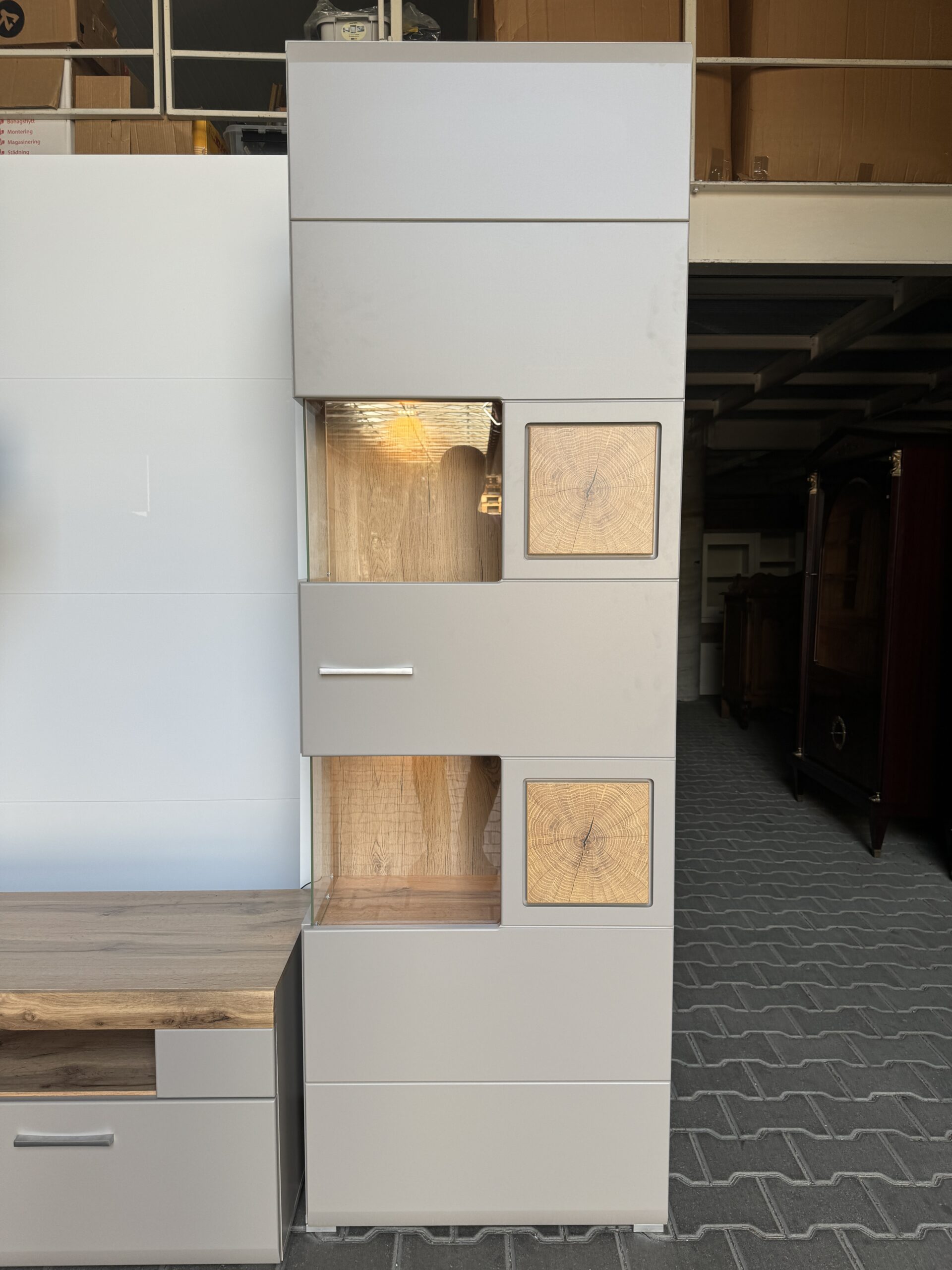 Fronty posiadają bazaltowe sekcje wykonane z imitacją drewna, co doskonale dopełnia cały wystrój mebla.