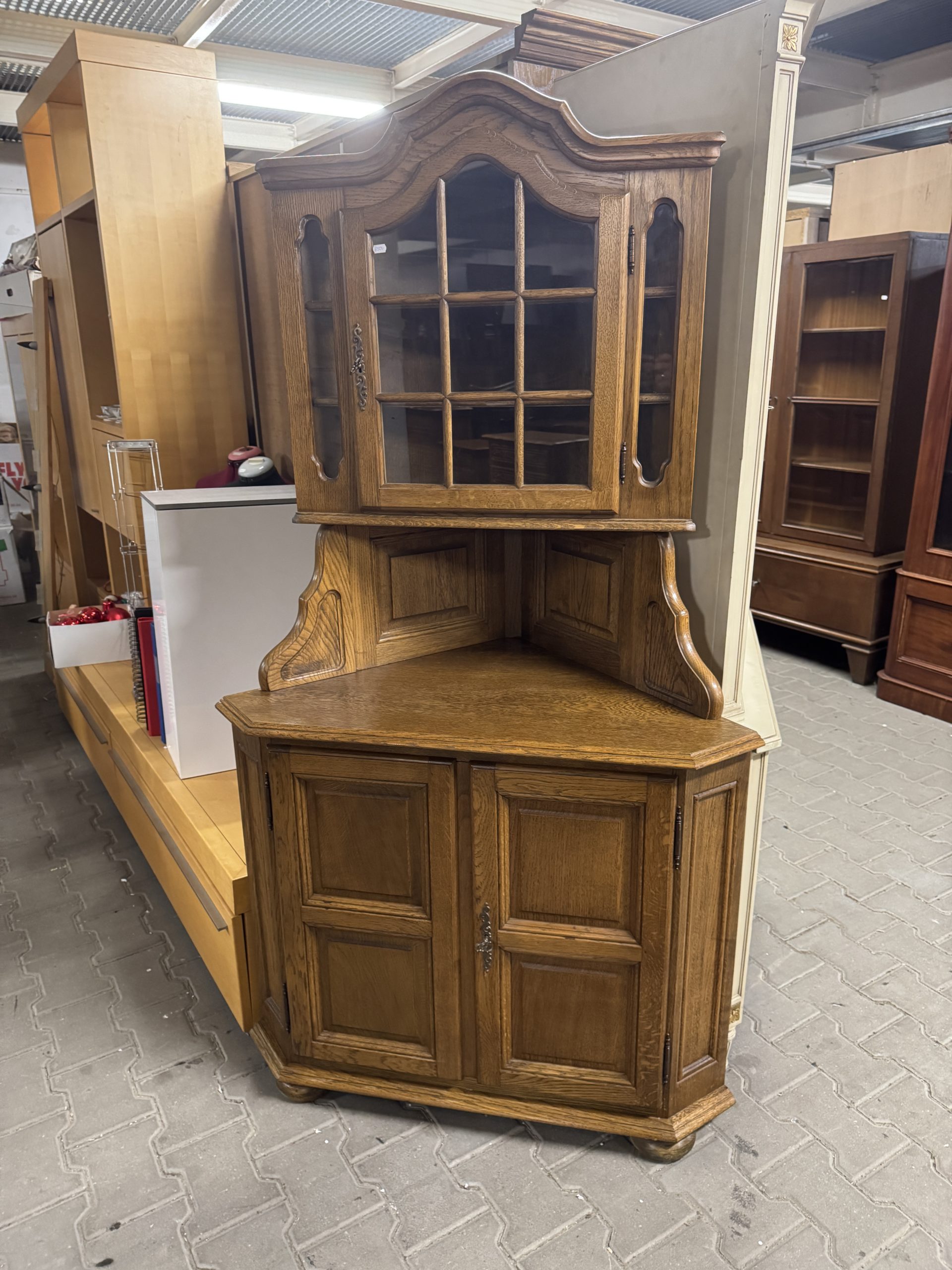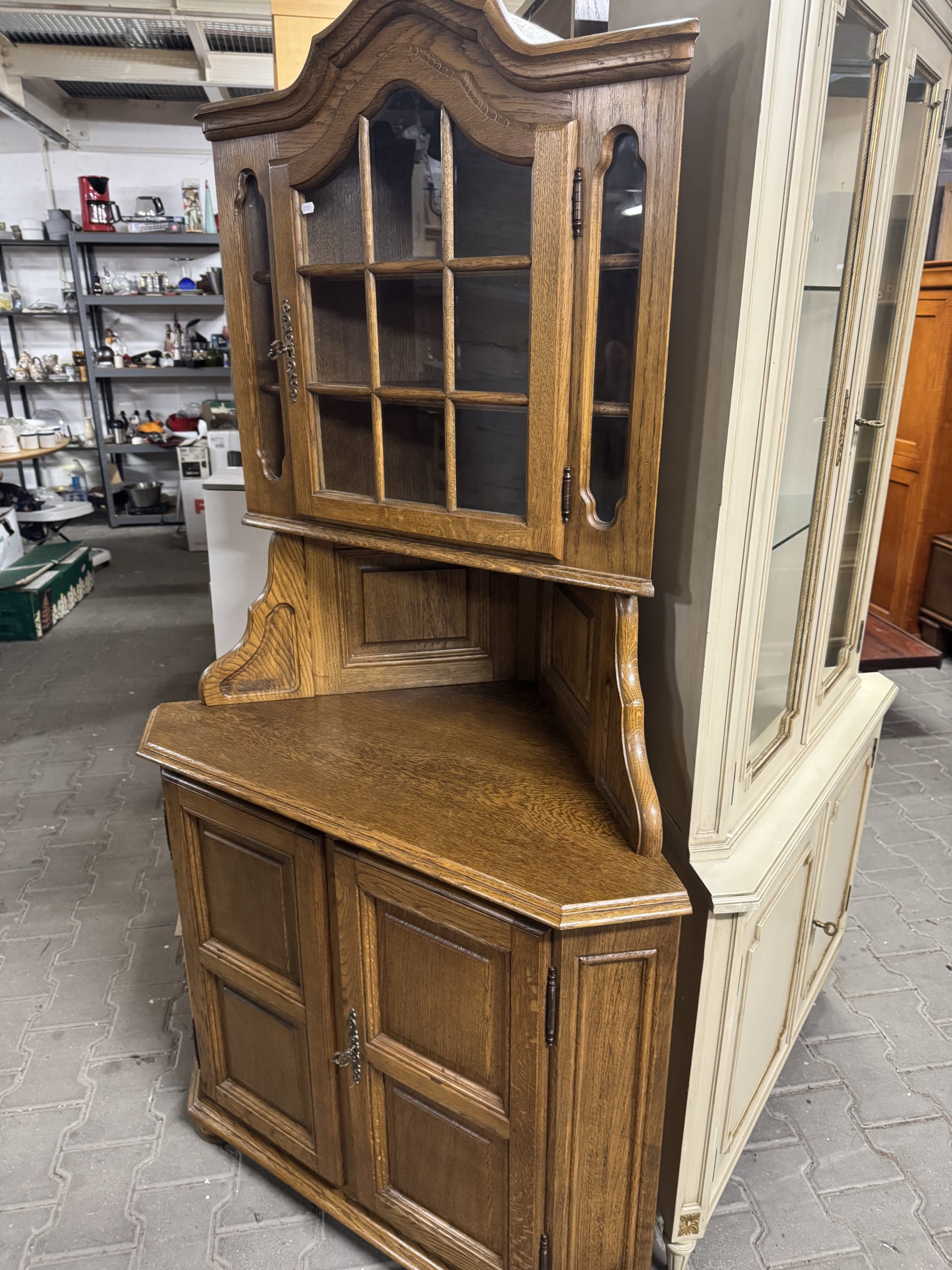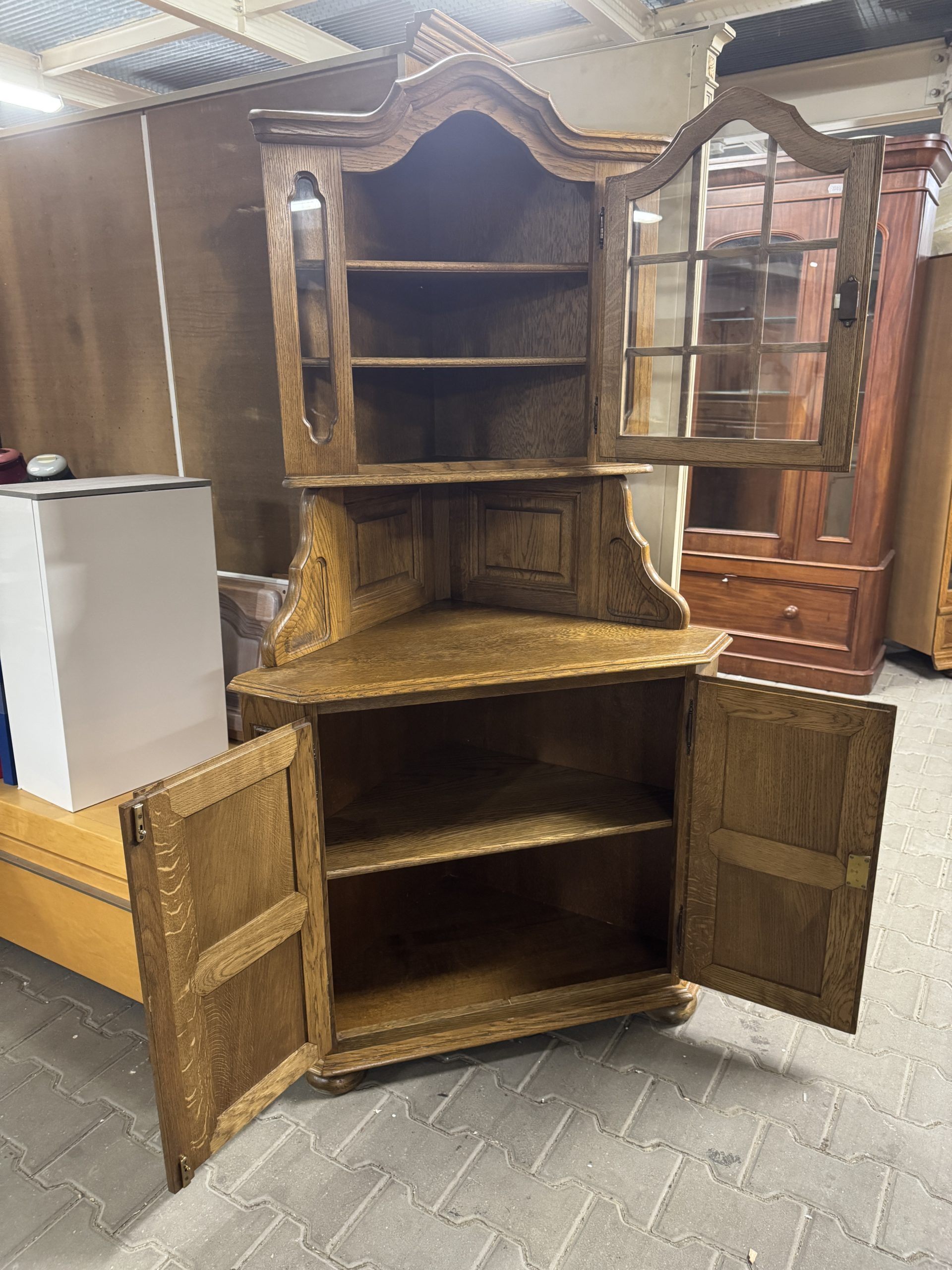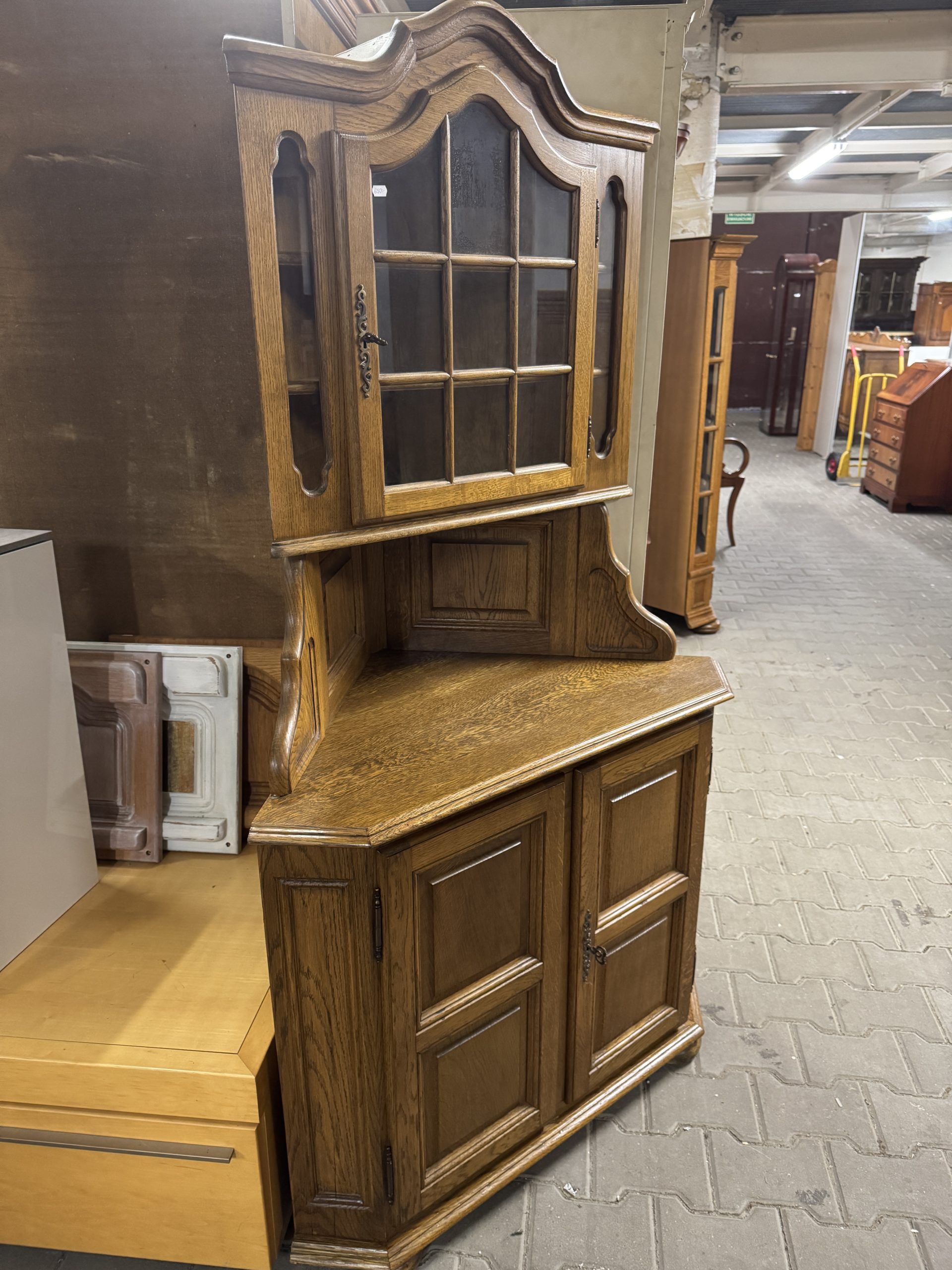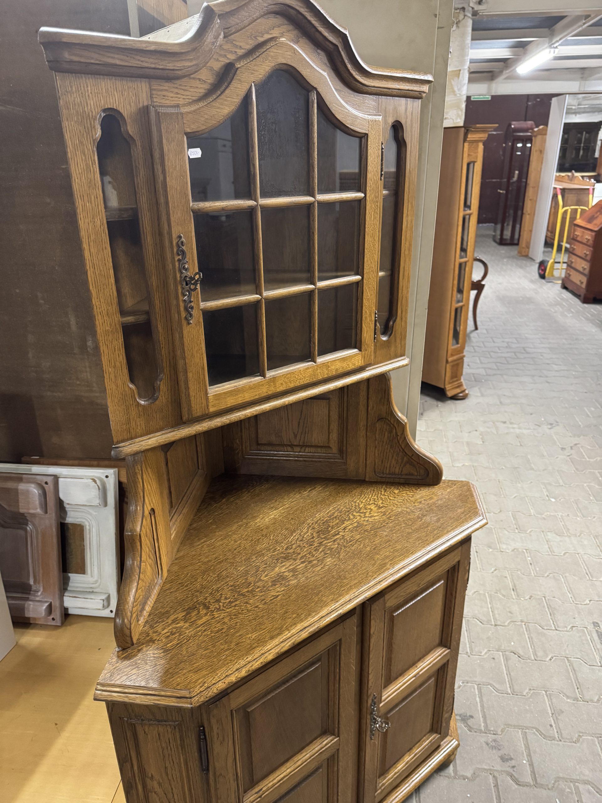 Stylowa przeszklona witryna z drewna dębowego.